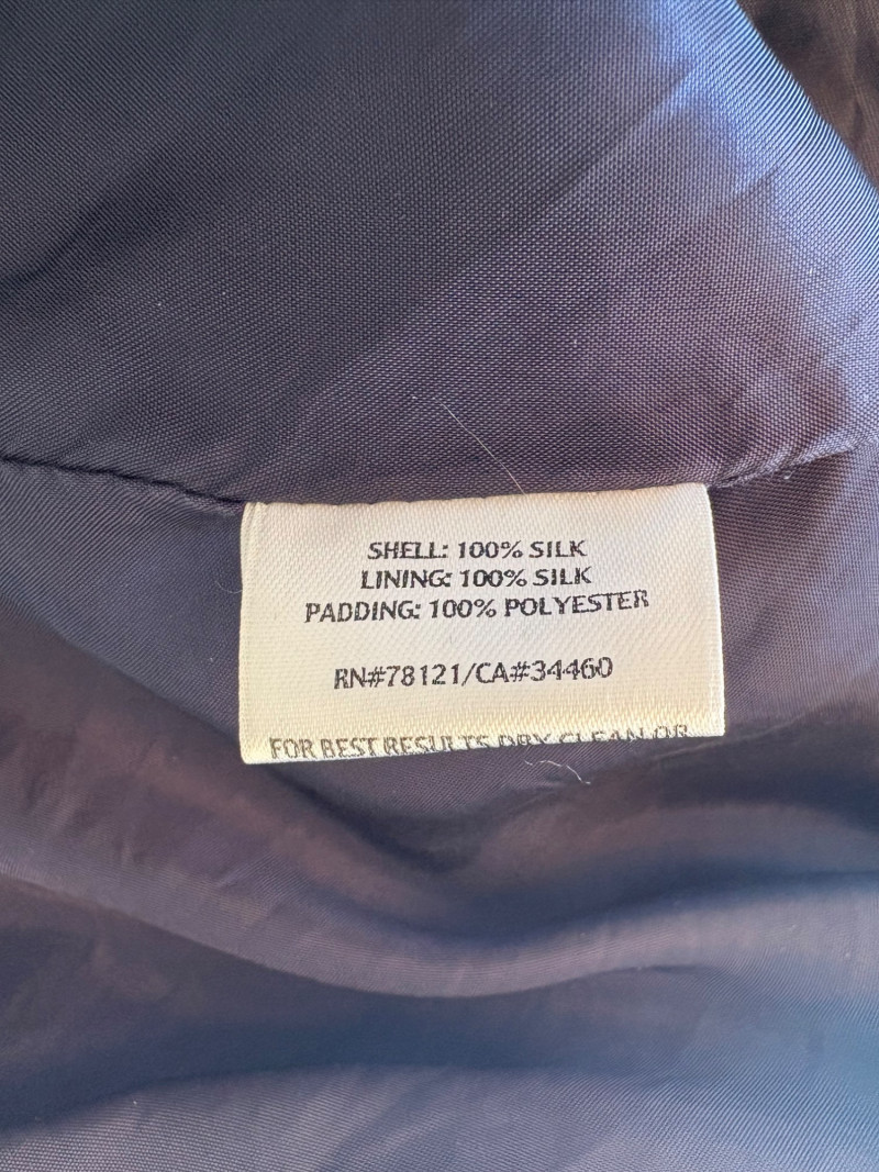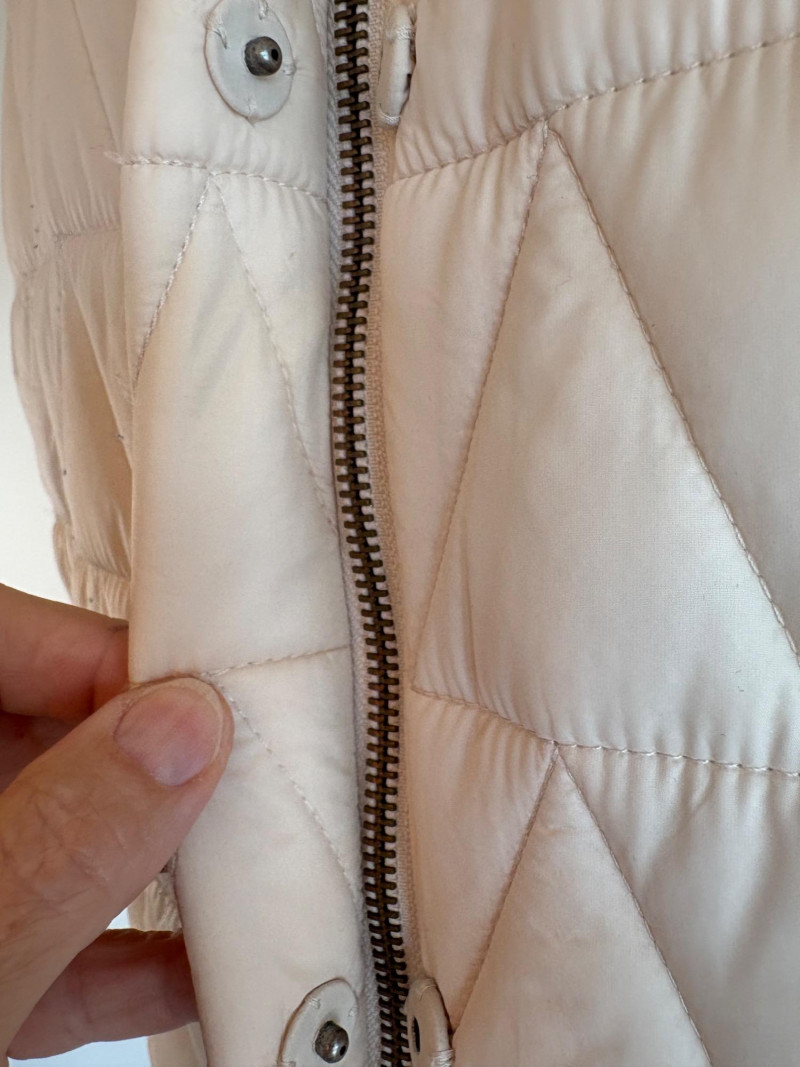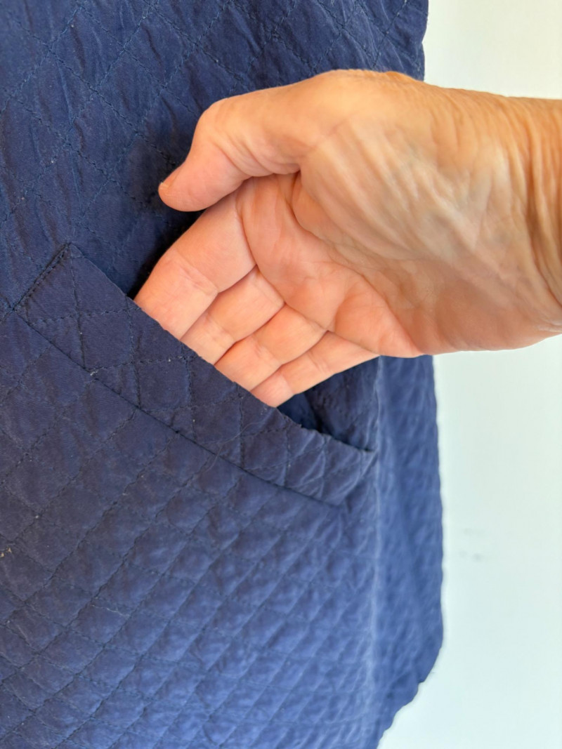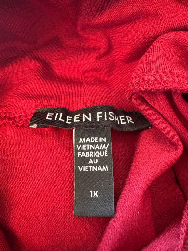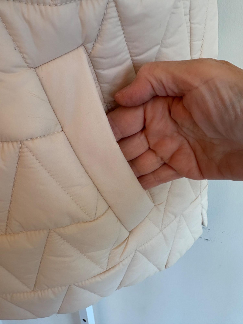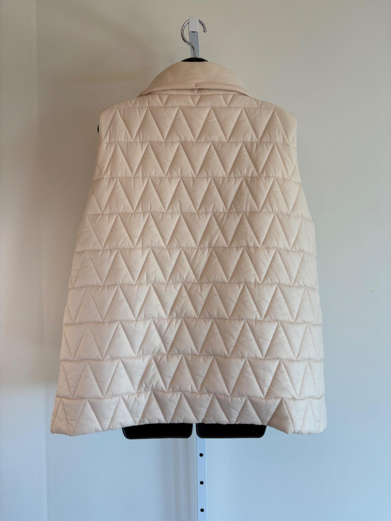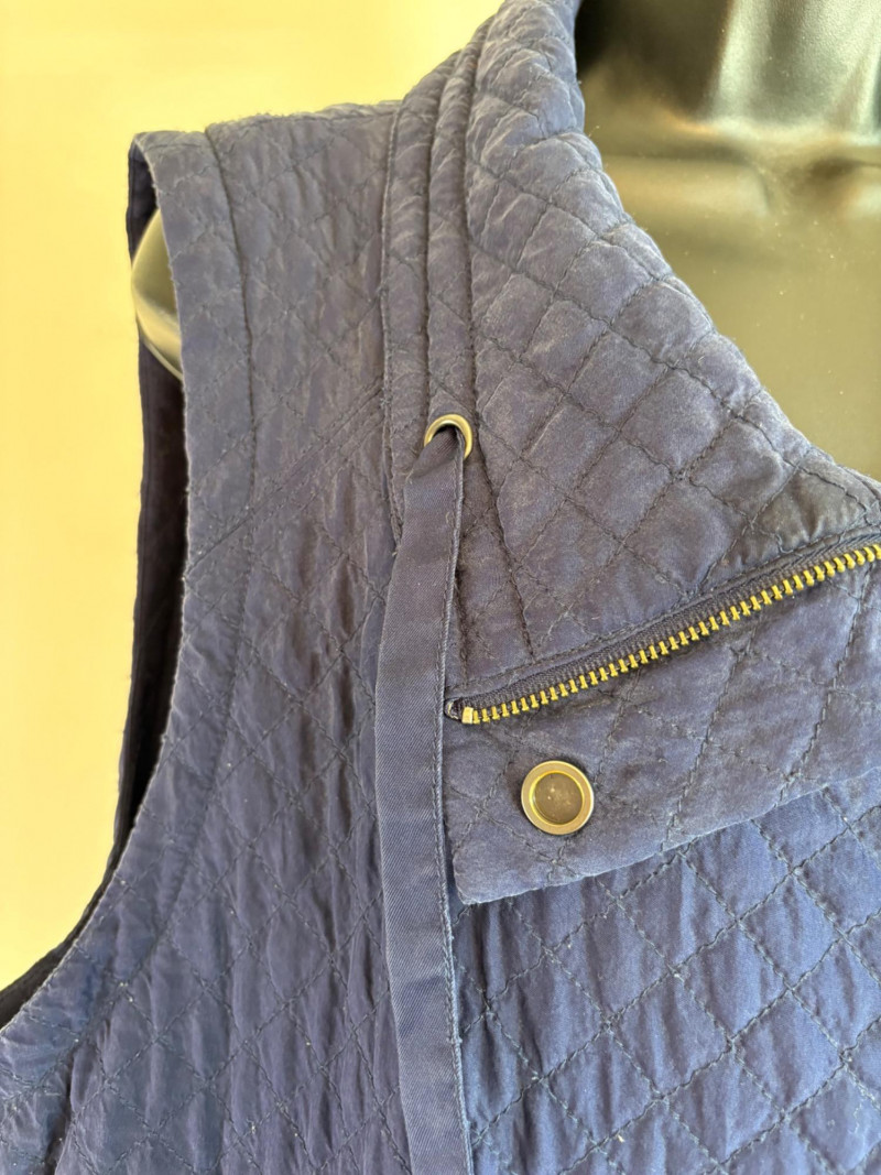 Vests for you every need from Eileen Fisher. Blue longer length vest from Eileen Fisher has funnel neckline with ties, zip front closure with snap hidden placket, and welted slash pockets in relatively thin silk fabric. Measures 24" pit to pit and 32" from back neckline to hem. Size tag says XL. Note this piece has overall wear - we waffled on including it, but believe it would be greatly improved by a date with your sweater shaver. Paired with deep red Tencel blend turtleneck from Eileen Fisher. Measures 23" pit to pit by 25" from back neckline to hem. Size tag says 1X. Off-white Eileen Fisher triangle-quilted vest has 2-way zip front, seven snap packet, welted slash pockets, and smooth interior. Made of recycled and virgin polyester. Measures 23" pit to put and 26.5" from back neckline to hem. Size tag says XL. Paired with grey Eileen Fisher lightweight turtleneck in merino wool. Measures 22" pit to pit and 24" back neckline to hem. Size tag says L.