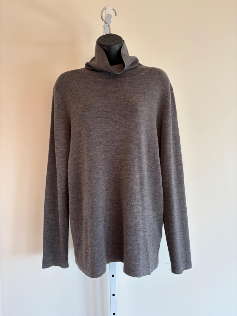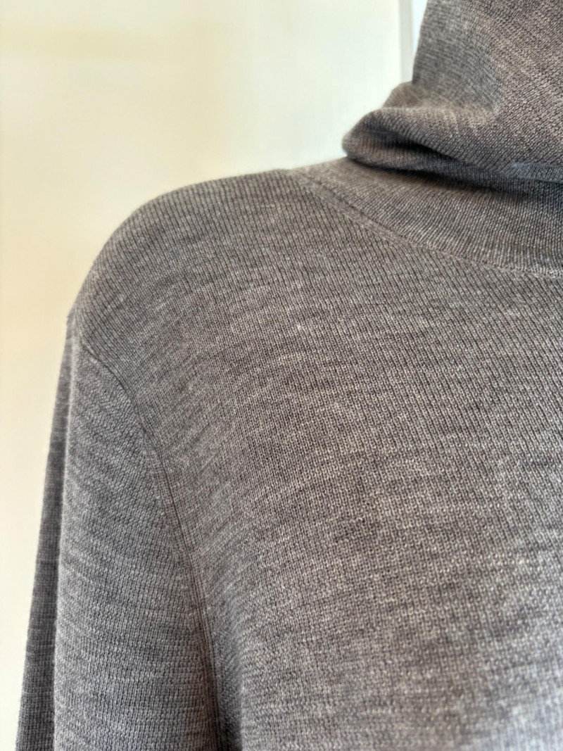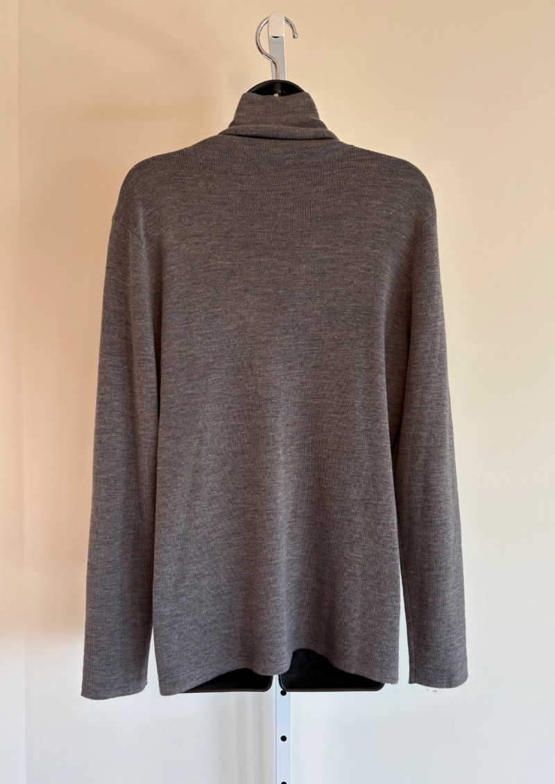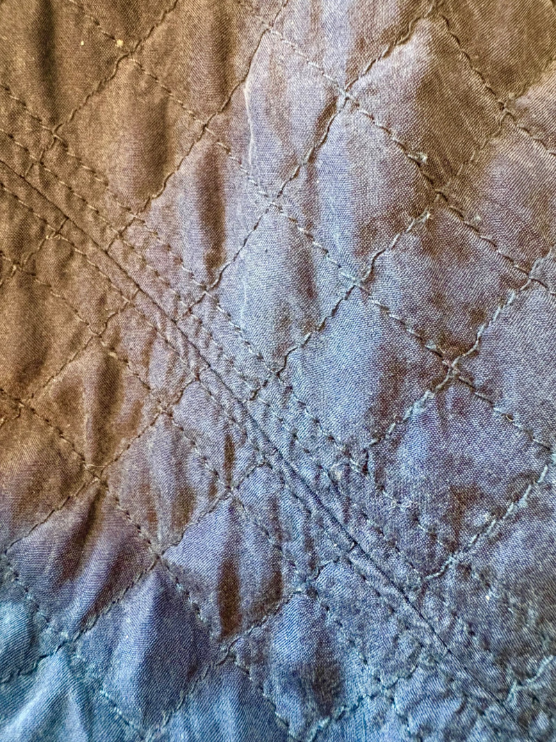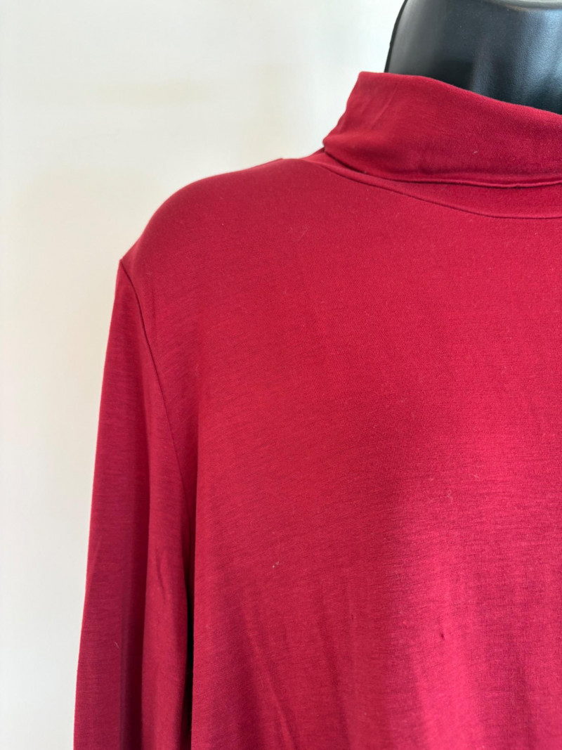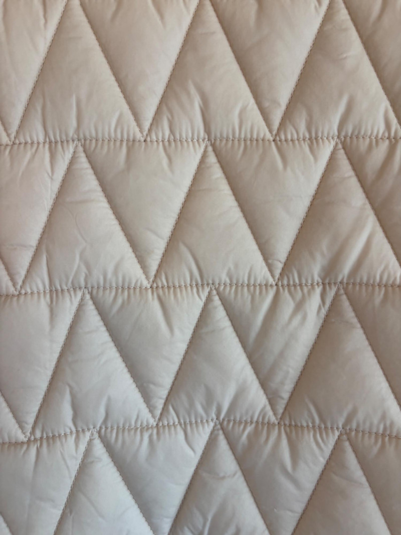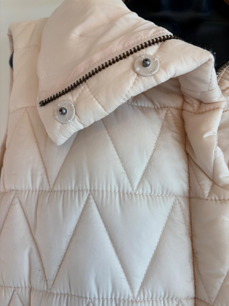 Vests for you every need from Eileen Fisher. Blue longer length vest from Eileen Fisher has funnel neckline with ties, zip front closure with snap hidden placket, and welted slash pockets in relatively thin silk fabric. Measures 24" pit to pit and 32" from back neckline to hem. Size tag says XL. Note this piece has overall wear - we waffled on including it, but believe it would be greatly improved by a date with your sweater shaver. Paired with deep red Tencel blend turtleneck from Eileen Fisher. Measures 23" pit to pit by 25" from back neckline to hem. Size tag says 1X. Off-white Eileen Fisher triangle-quilted vest has 2-way zip front, seven snap packet, welted slash pockets, and smooth interior. Made of recycled and virgin polyester. Measures 23" pit to put and 26.5" from back neckline to hem. Size tag says XL. Paired with grey Eileen Fisher lightweight turtleneck in merino wool. Measures 22" pit to pit and 24" back neckline to hem. Size tag says L.