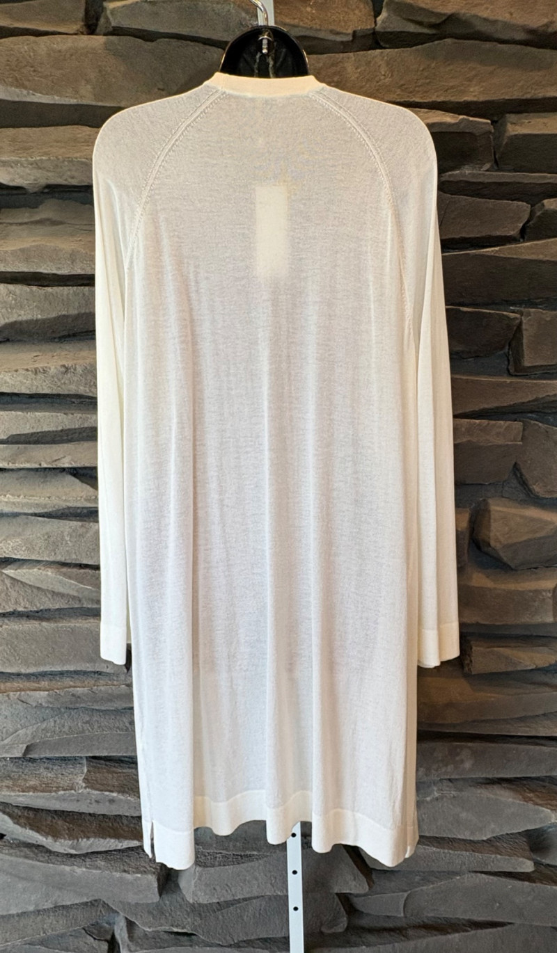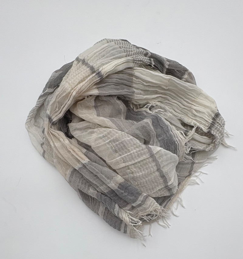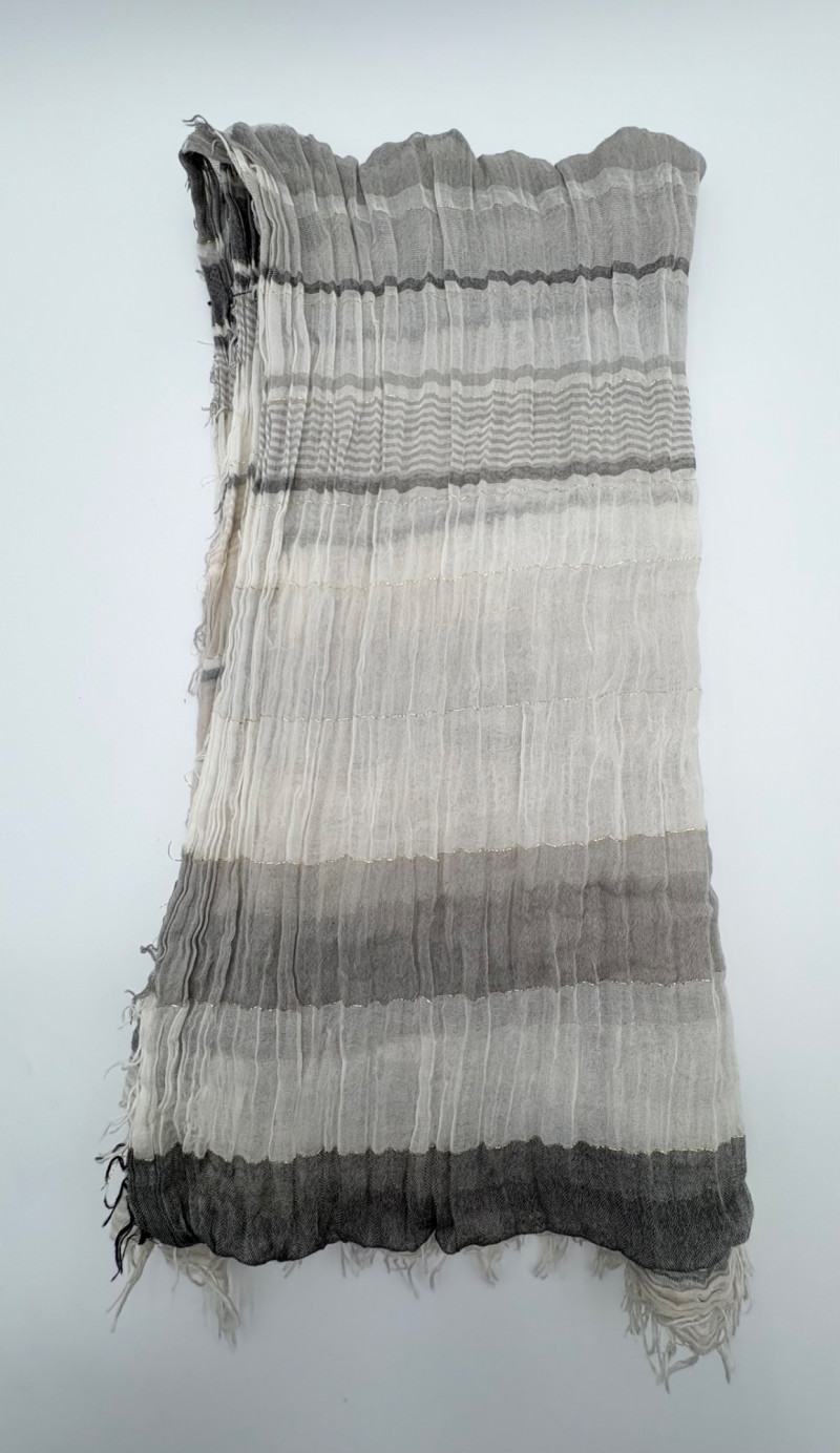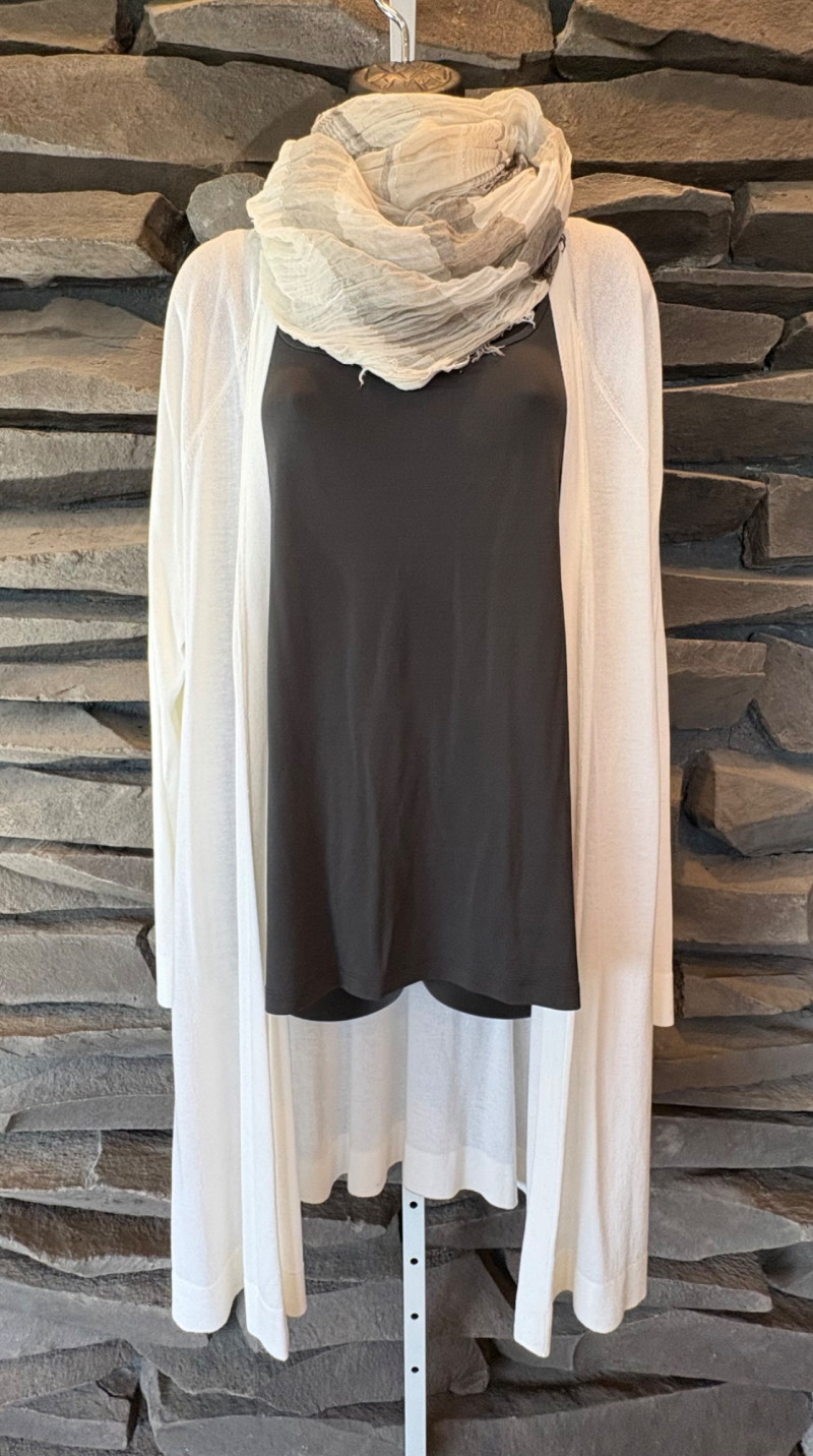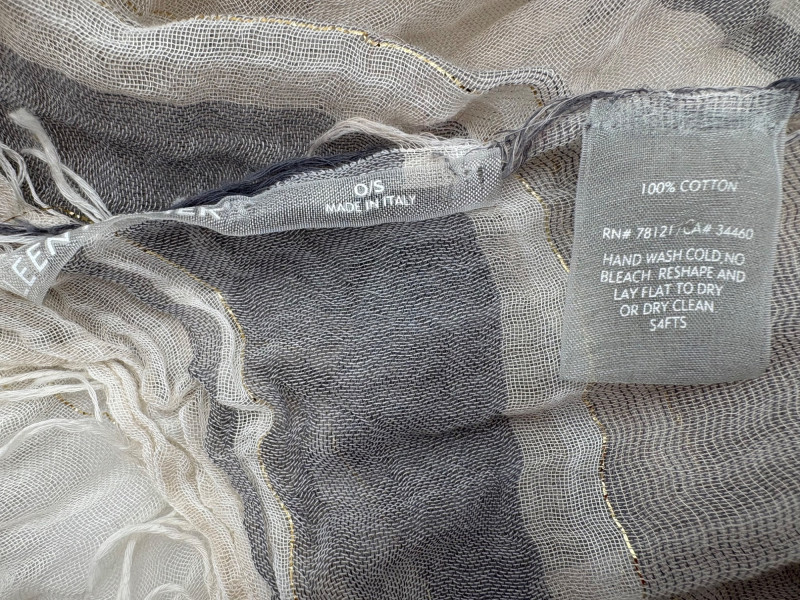 Two terrific neutrals in super lightweight fabric/weave from Eileen Fisher; perfect for those remaining hot days of summer. Grey silk tank has banded armholes and neckline. 100% silk. Measures 20.5" pit to pit. Size tag says XL. Pure white thin sweater duster has raglan sleeves. open front, ribbing at cuffs and hem, and small split hem. New with tag. Tencel Lyocell/nylon blend. Measures 22" pit to pit and 36" from back neckline to hem. Size tags says L. Paired with a white and grey striped scarf with a running thread of gold and fringe on all sides.100% cotton. Measures approx. 25" x 78".