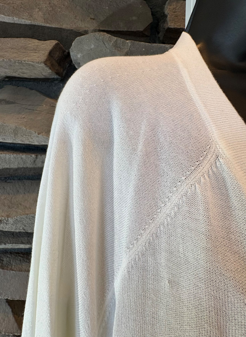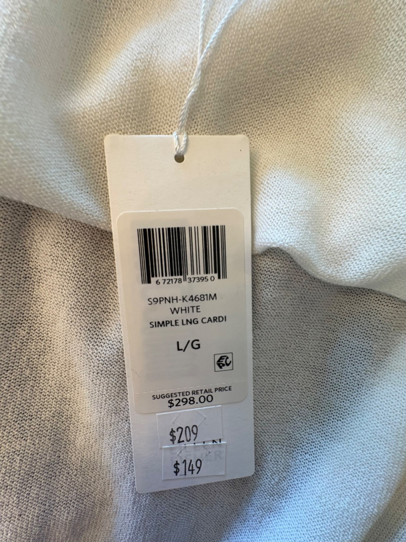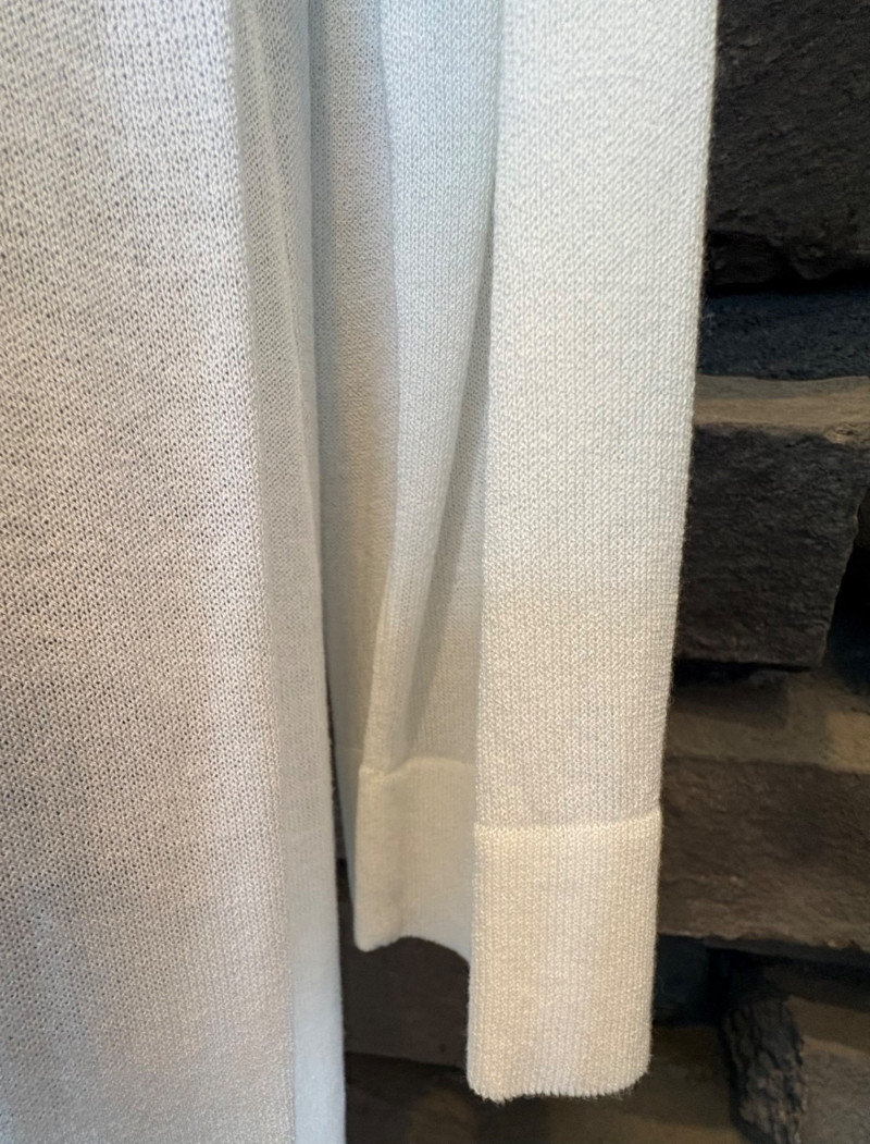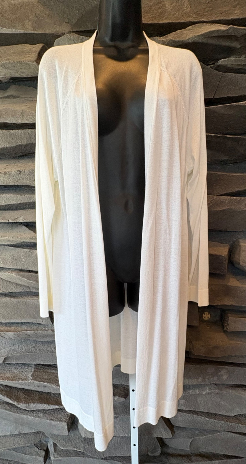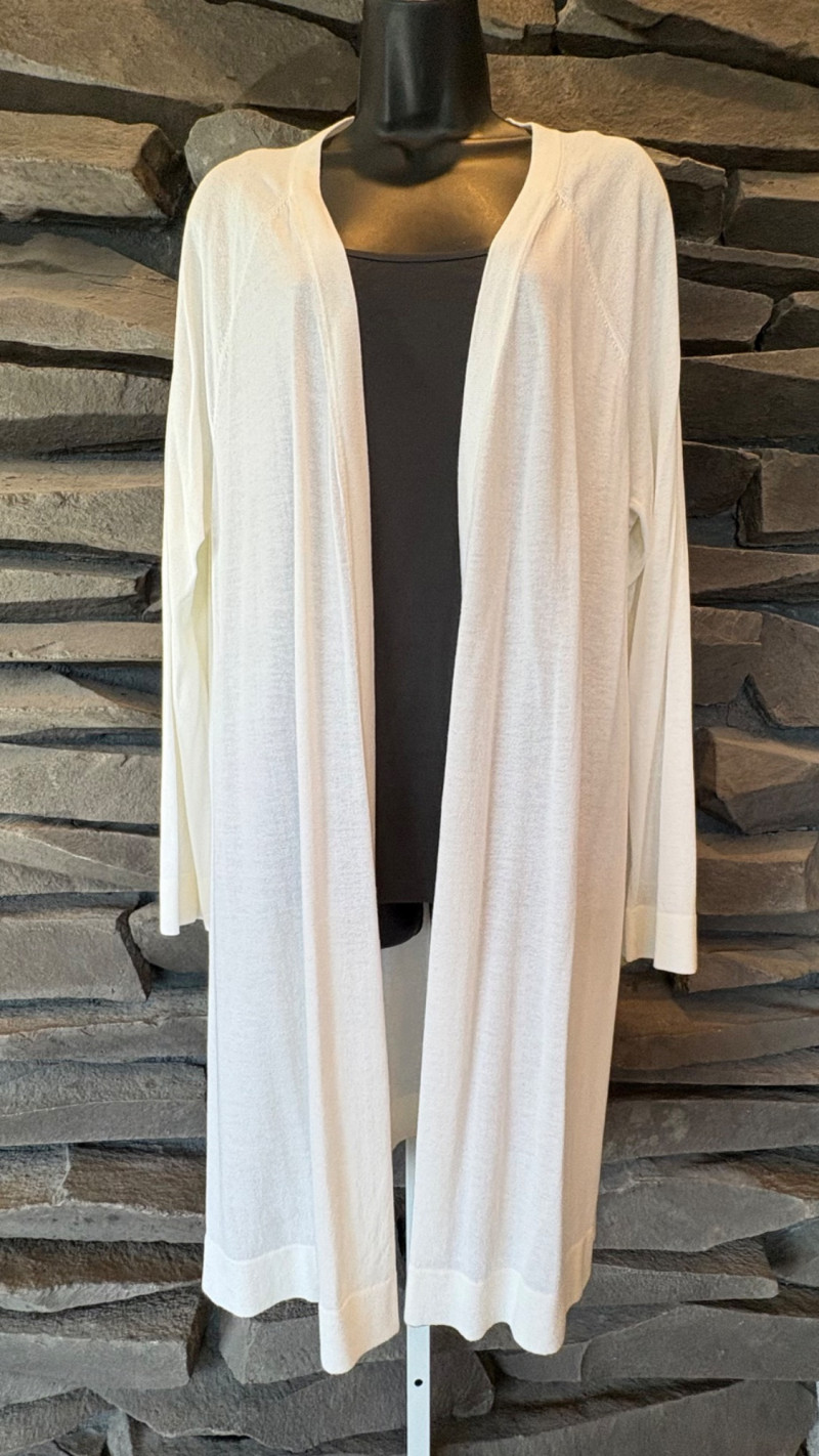 Two terrific neutrals in super lightweight fabric/weave from Eileen Fisher; perfect for those remaining hot days of summer. Grey silk tank has banded armholes and neckline. 100% silk. Measures 20.5" pit to pit. Size tag says XL. Pure white thin sweater duster has raglan sleeves. open front, ribbing at cuffs and hem, and small split hem. New with tag. Tencel Lyocell/nylon blend. Measures 22" pit to pit and 36" from back neckline to hem. Size tags says L. Paired with a white and grey striped scarf with a running thread of gold and fringe on all sides.100% cotton. Measures approx. 25" x 78".