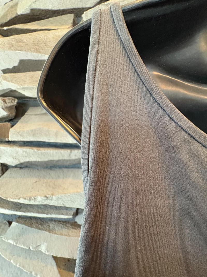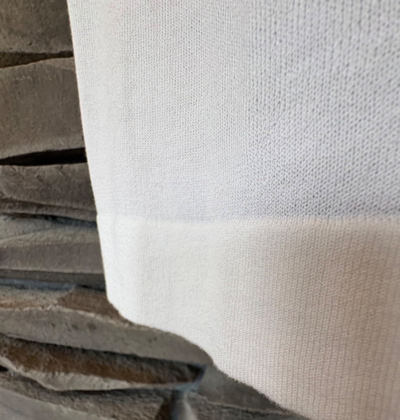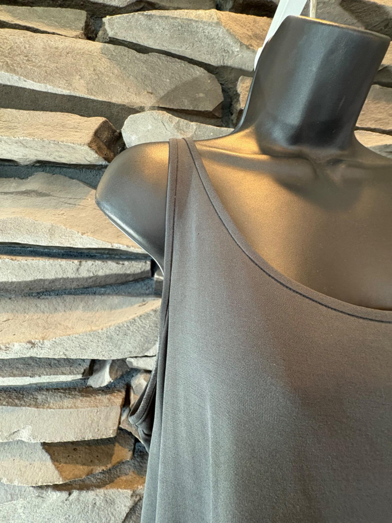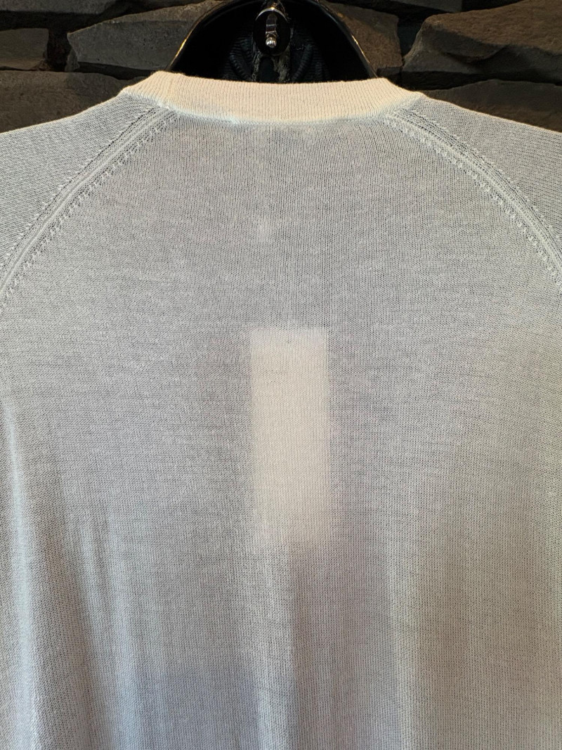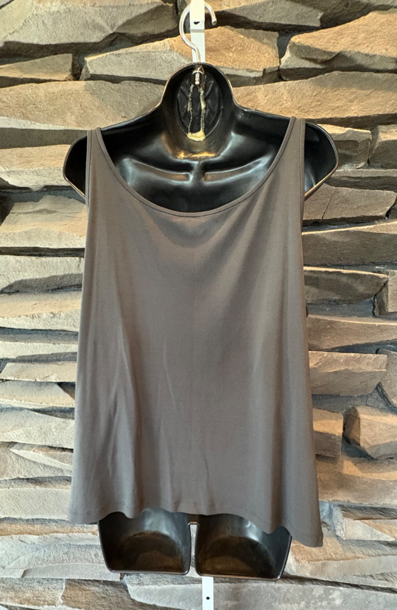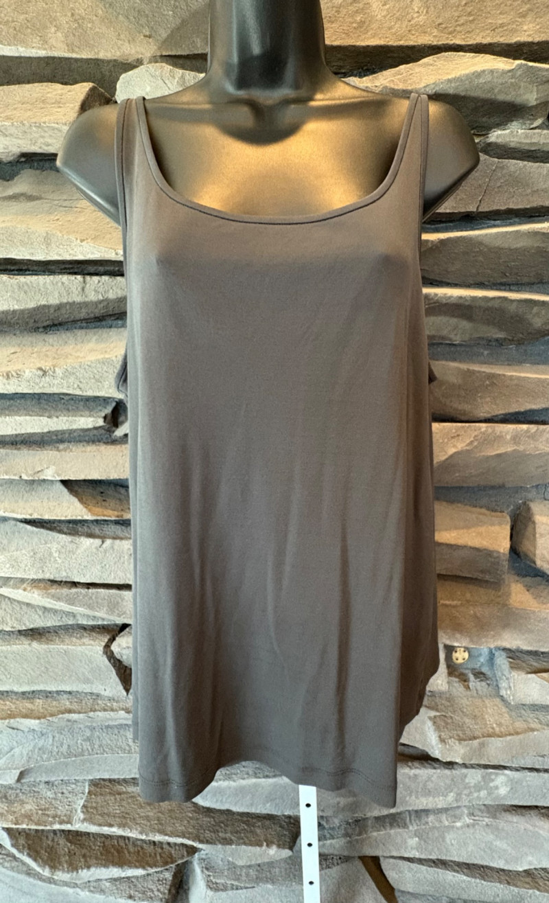 Two terrific neutrals in super lightweight fabric/weave from Eileen Fisher; perfect for those remaining hot days of summer. Grey silk tank has banded armholes and neckline. 100% silk. Measures 20.5" pit to pit. Size tag says XL. Pure white thin sweater duster has raglan sleeves. open front, ribbing at cuffs and hem, and small split hem. New with tag. Tencel Lyocell/nylon blend. Measures 22" pit to pit and 36" from back neckline to hem. Size tags says L. Paired with a white and grey striped scarf with a running thread of gold and fringe on all sides.100% cotton. Measures approx. 25" x 78".