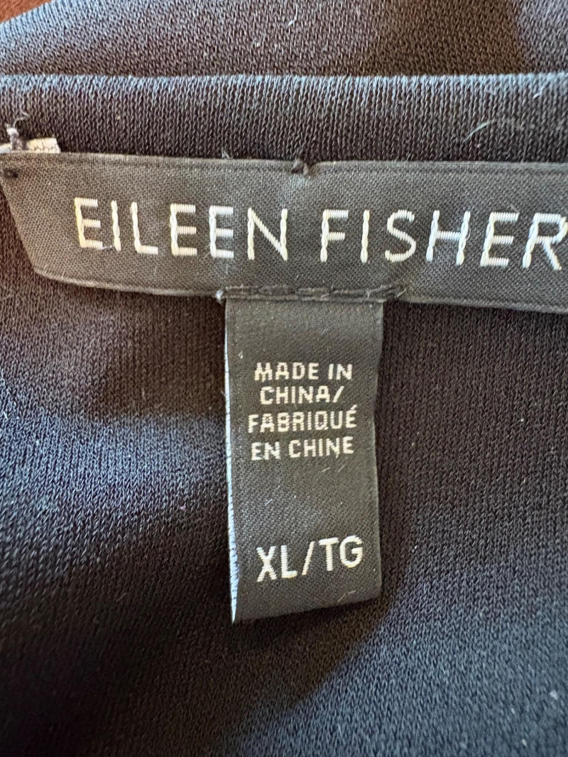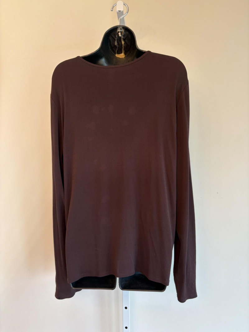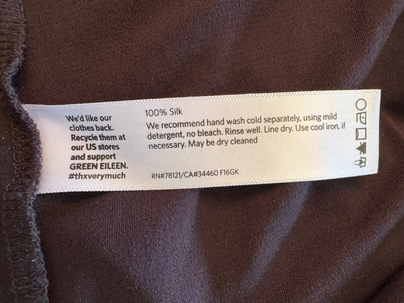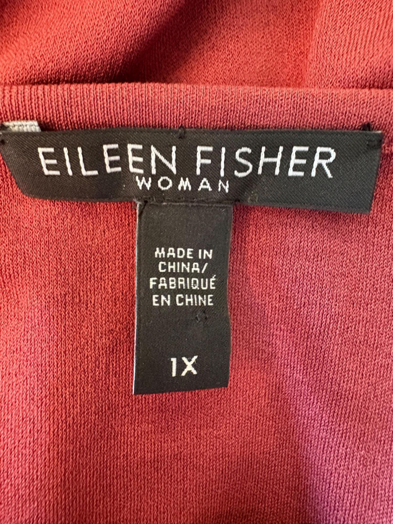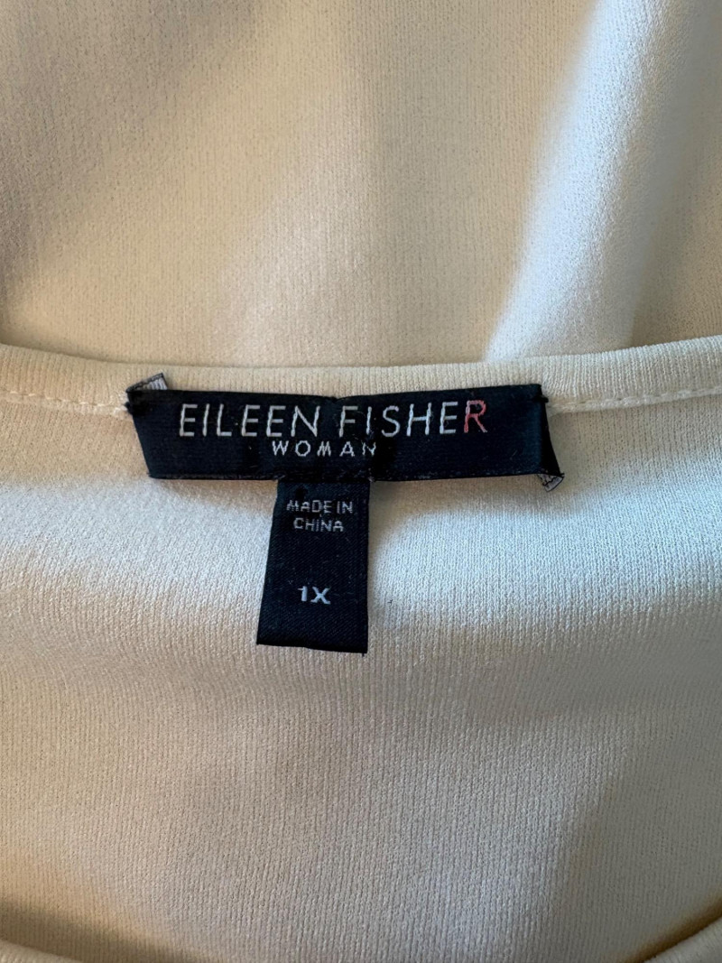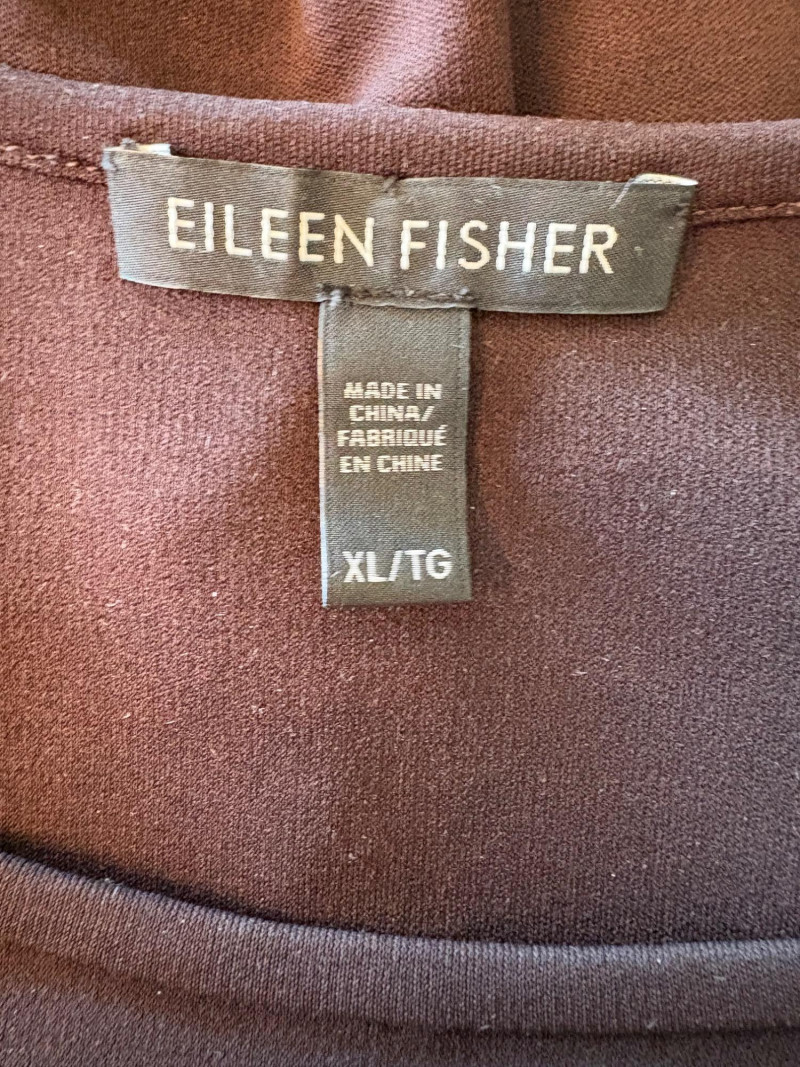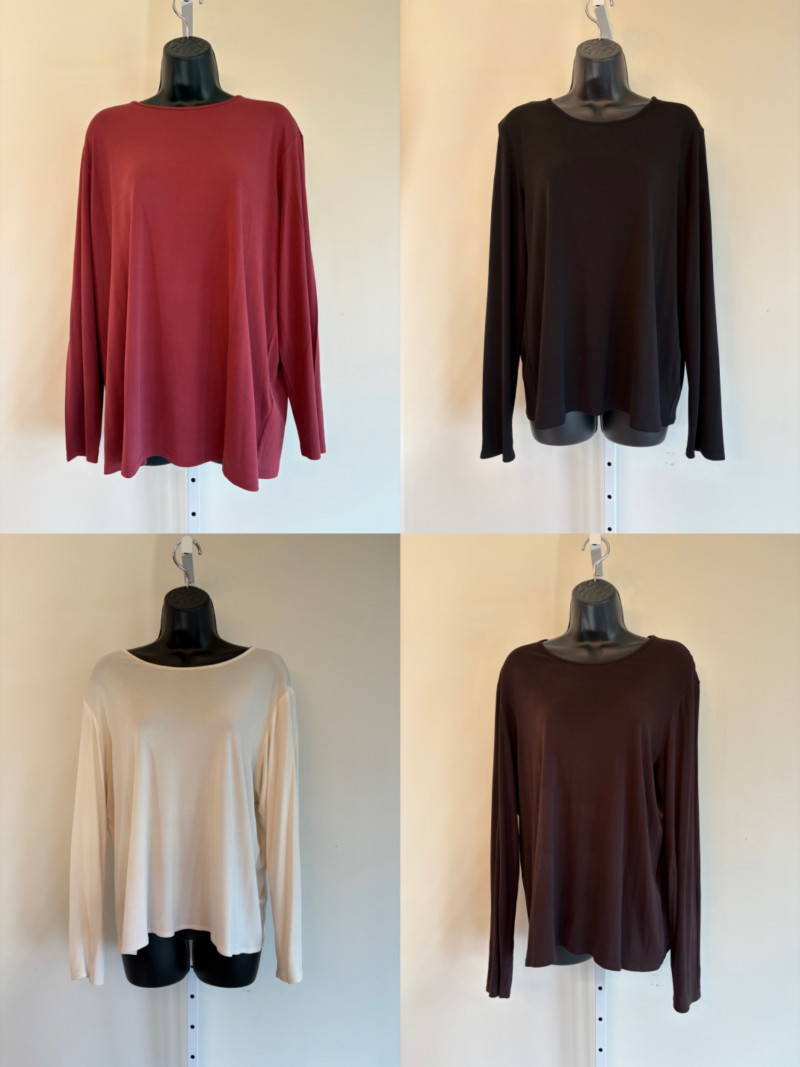 4 gorgeous silk long-sleeve shirts from Eileen Fisher. All are identical in style, are 100% silk, measure between 22.5"- 23" pit to pit, and measure approx. 23" from back neckline to bottom hem. Colors are a brownish-red, black, chocolate brown, and creamy white. Chocolate brown and black shirts have size tags that say XL, while the brownish-red and creamy white shirts have size tags that say 1X. Note that fabric tag is missing from white shirt and brown shirt has some odd markings on the back - see last photo. We've included the brown shirt since if may wash out and even if not, the back of the shirt may be under a jacket most of the fall/winter so it is still useful.