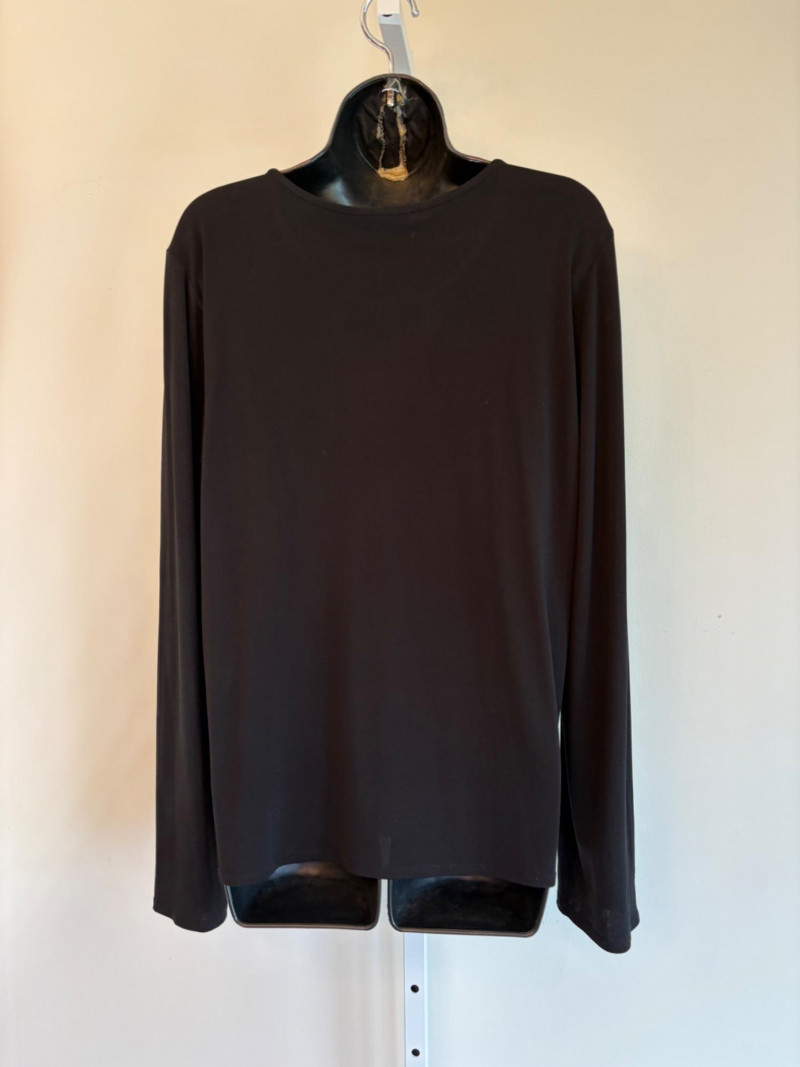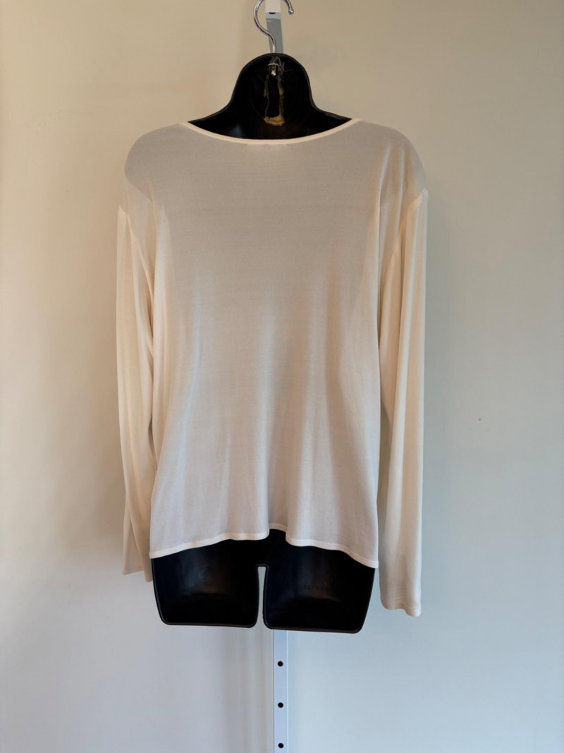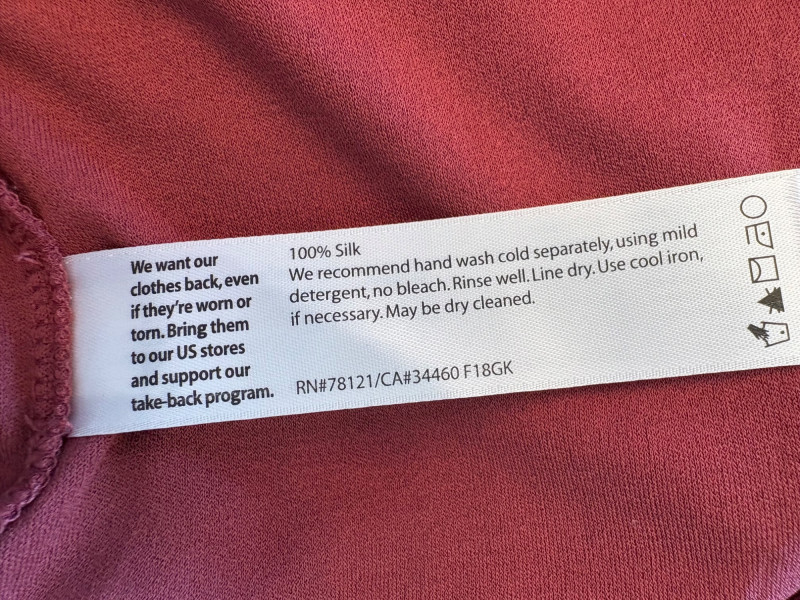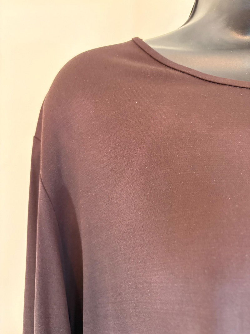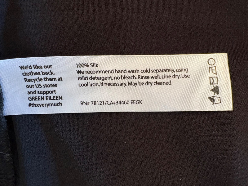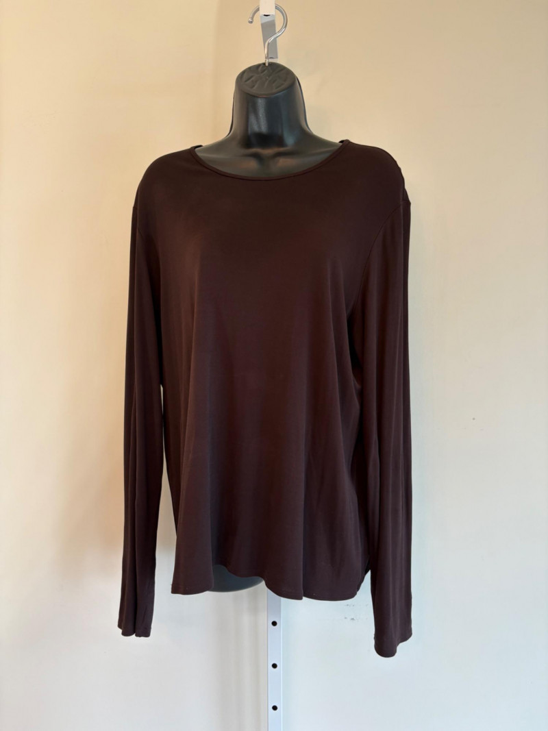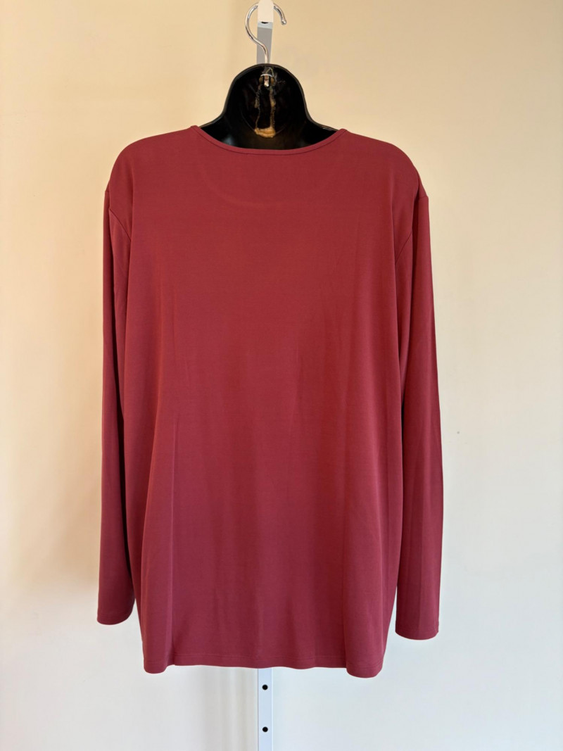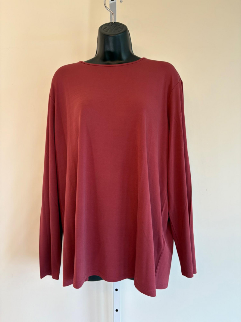 4 gorgeous silk long-sleeve shirts from Eileen Fisher. All are identical in style, are 100% silk, measure between 22.5"- 23" pit to pit, and measure approx. 23" from back neckline to bottom hem. Colors are a brownish-red, black, chocolate brown, and creamy white. Chocolate brown and black shirts have size tags that say XL, while the brownish-red and creamy white shirts have size tags that say 1X. Note that fabric tag is missing from white shirt and brown shirt has some odd markings on the back - see last photo. We've included the brown shirt since if may wash out and even if not, the back of the shirt may be under a jacket most of the fall/winter so it is still useful.