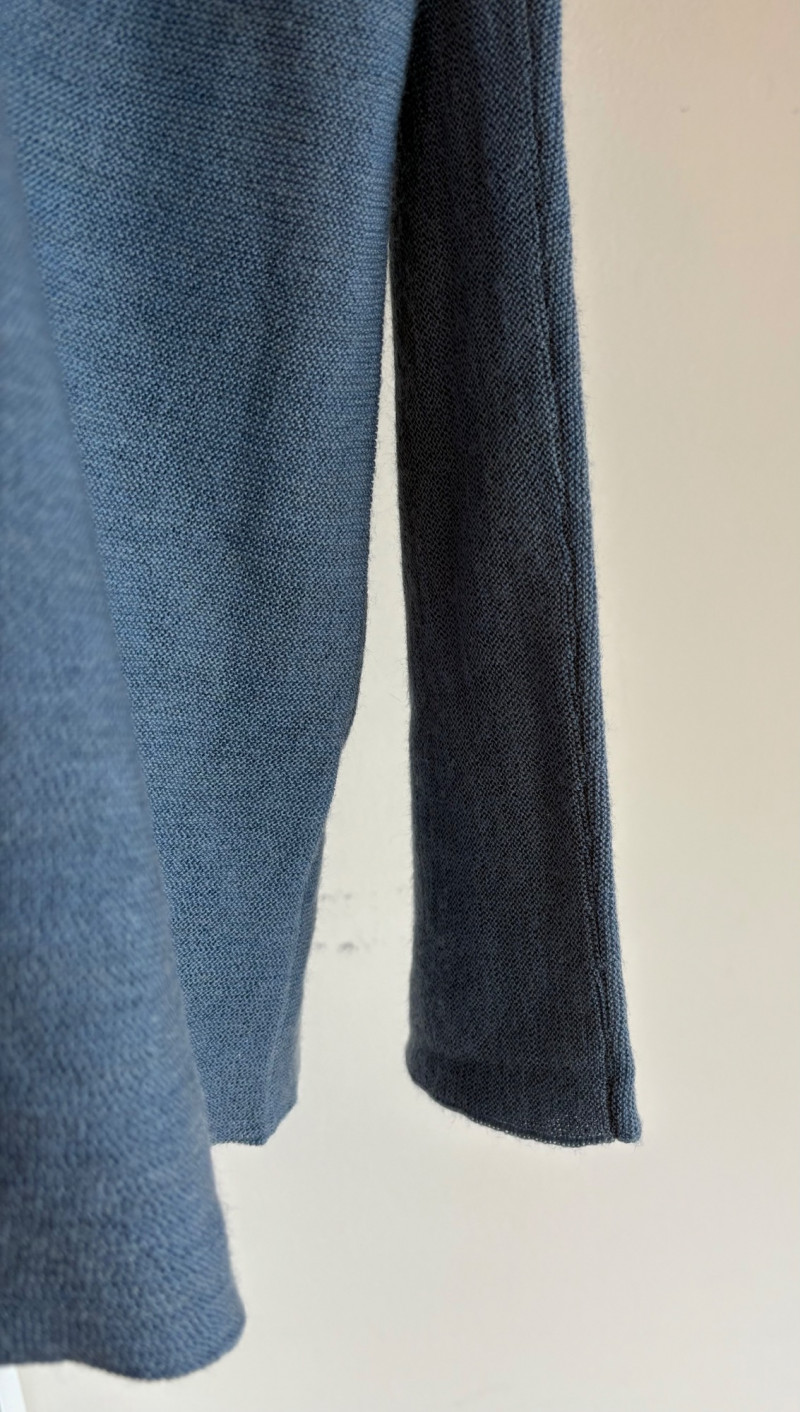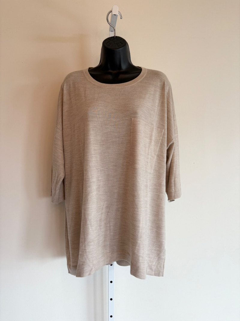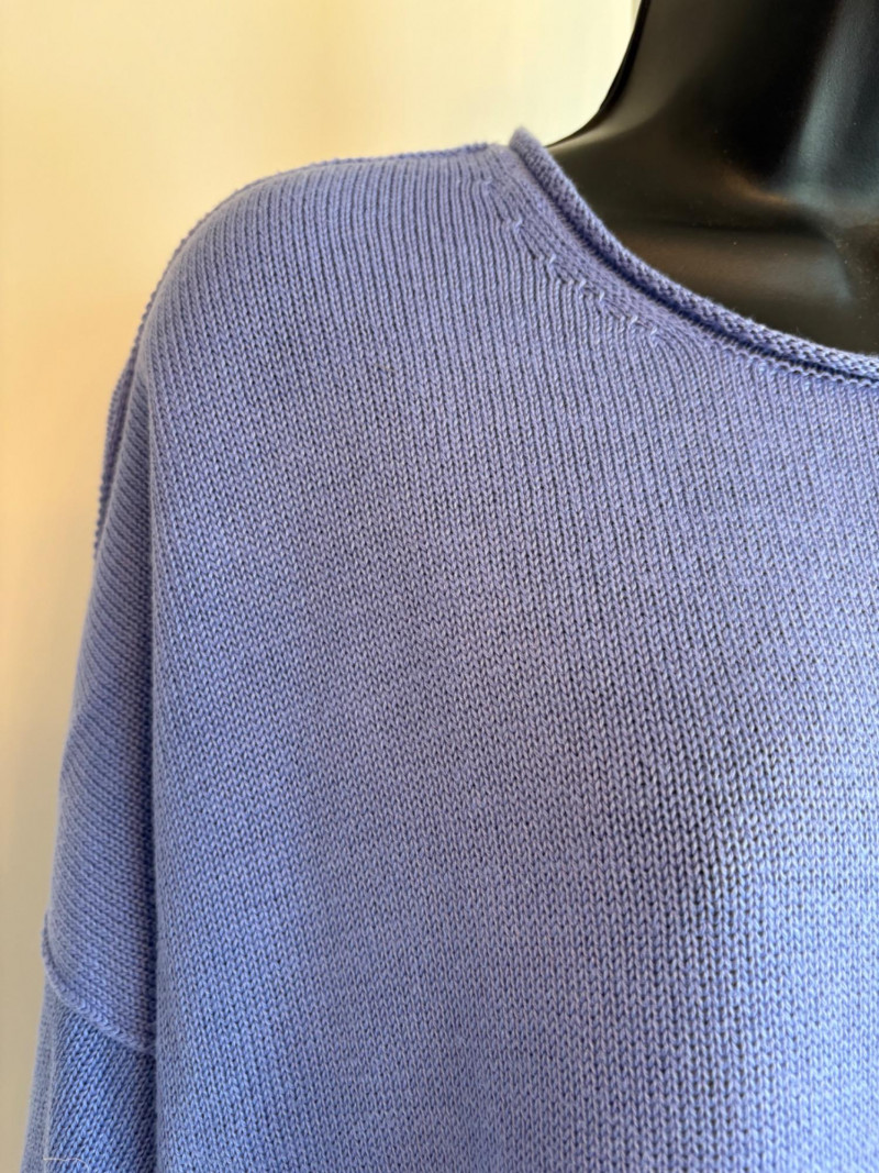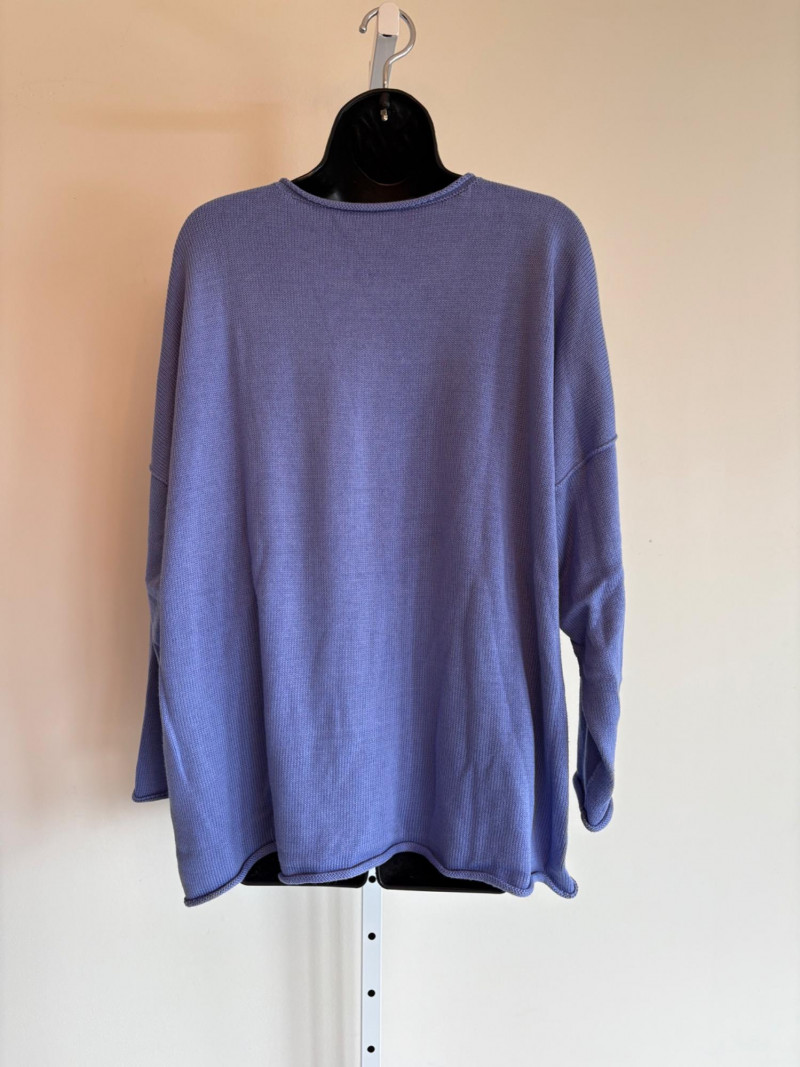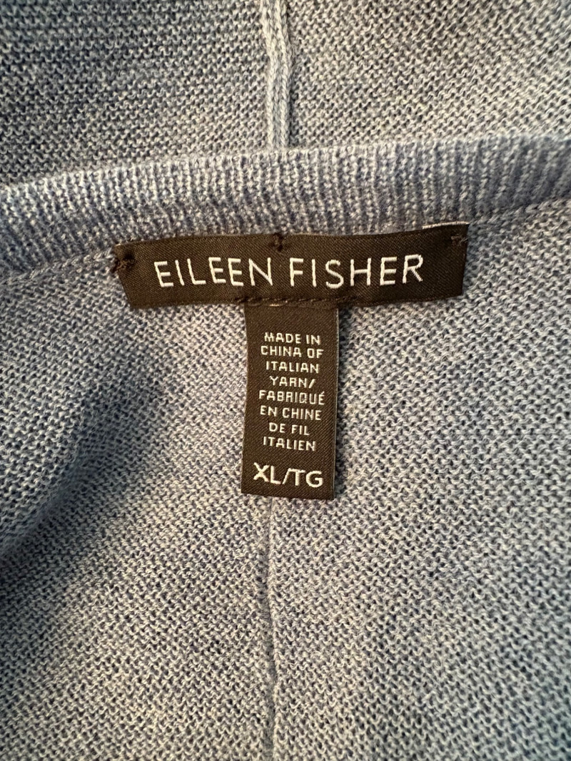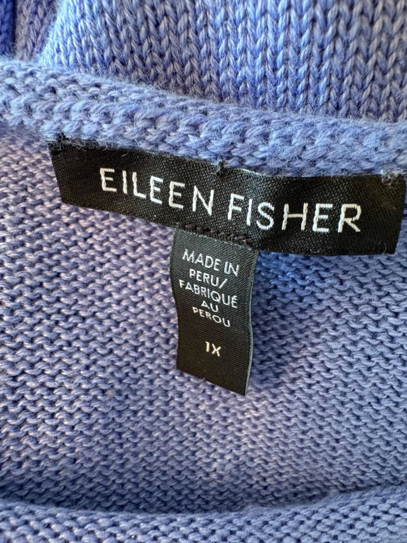 Trio of casual sweaters from Eileen Fisher. All measure 27" pit to pit. Blue lightweight sweater has round neckline, center front/back seaming, long sleeves, and ribbing at neckline. 100% merino wool. Size tag says XL. Super soft beige lightweight sweater has round neckline, short sleeves, ribbing at neck/arms/bottom hem, and a breast pocket. 100% merino wool. Size tag says XL. Amethyst purple sweater has crew neck, deconstructed seaming, dropped shoulder seams, long sleeves, and rolled neck/cuffs/lower hem. Cotton/Tencel blend. Size tag says 1X.