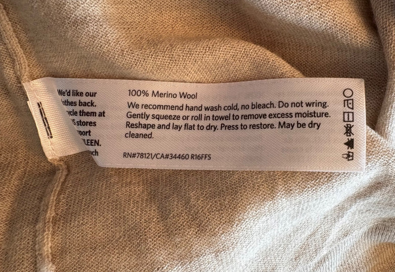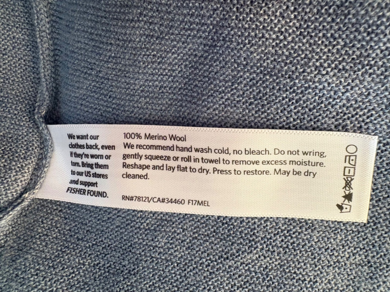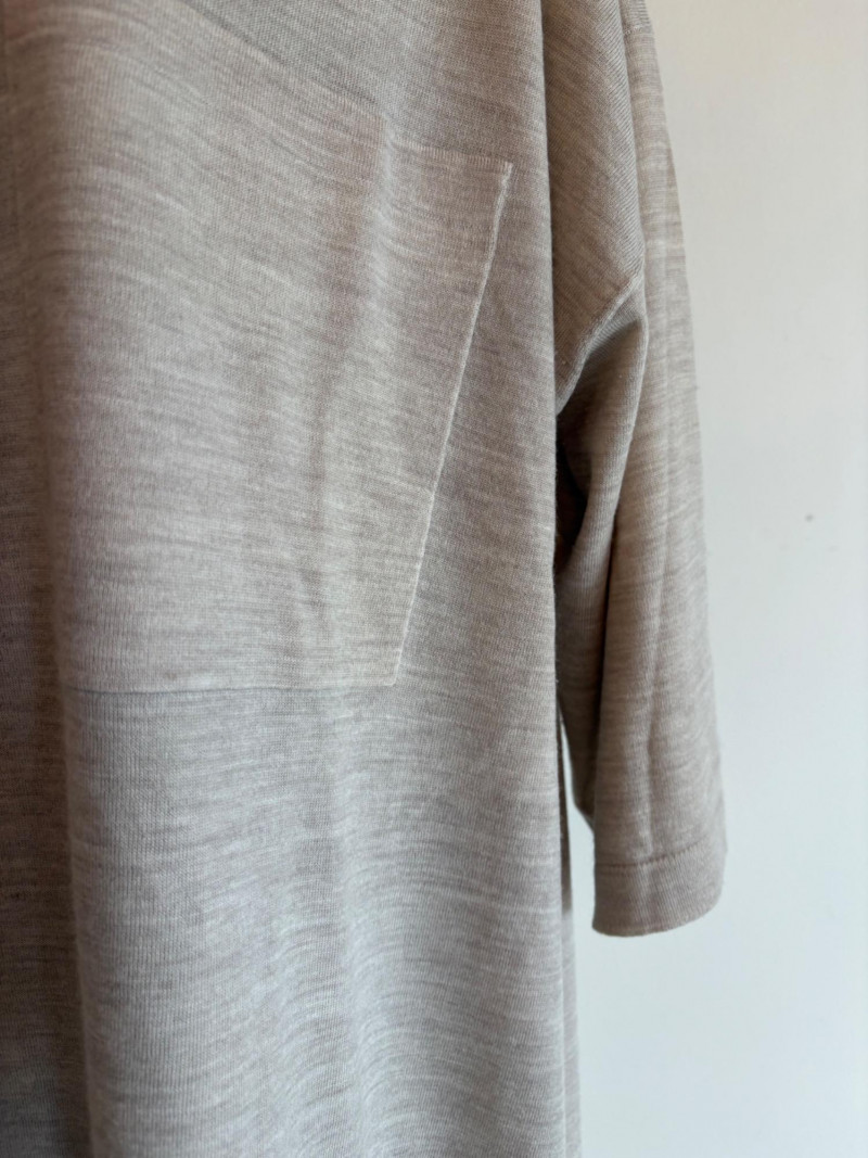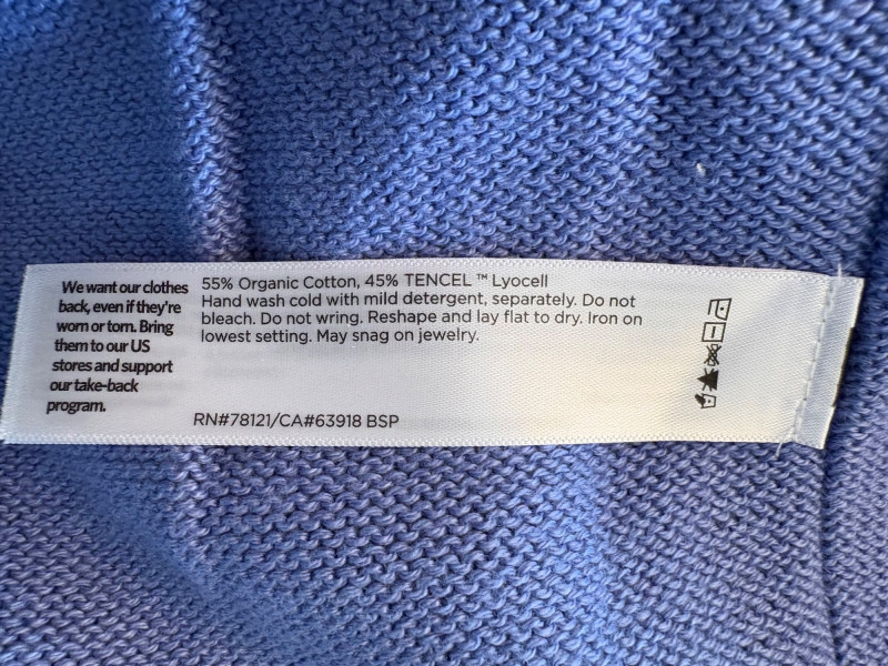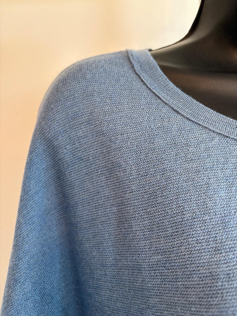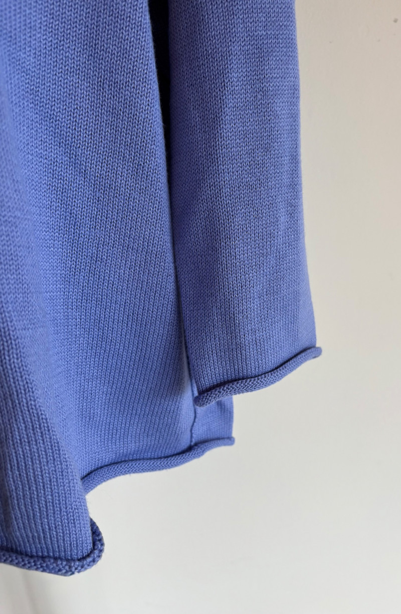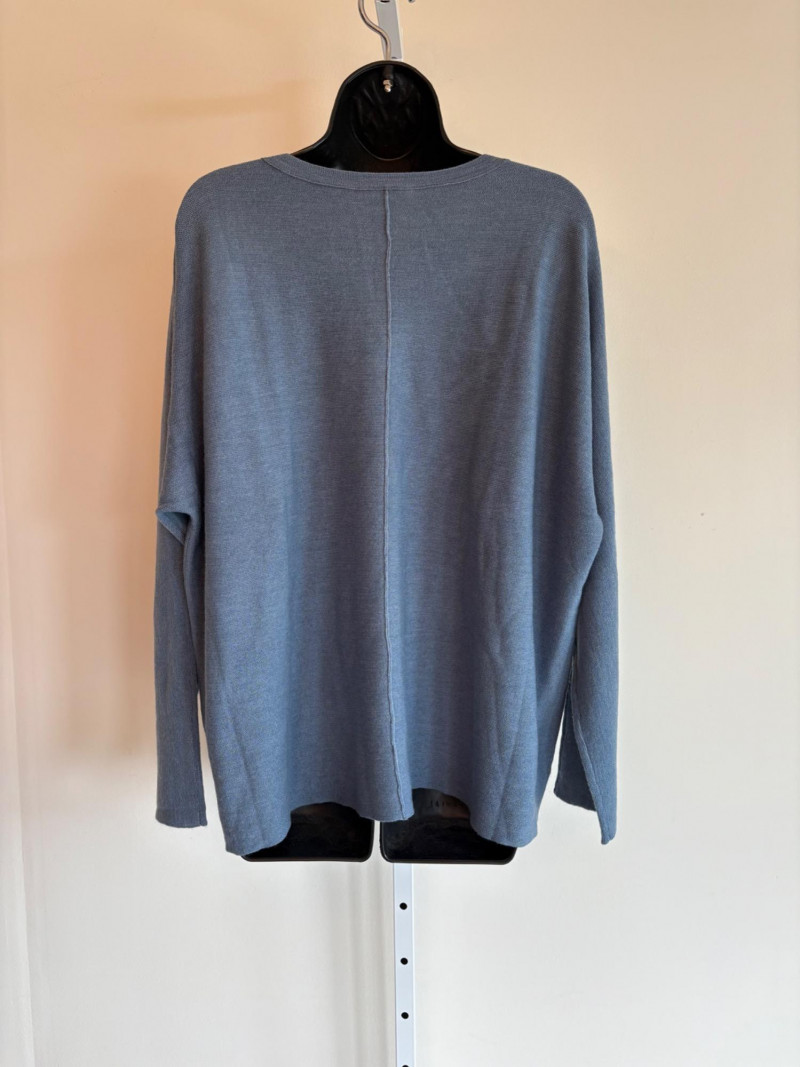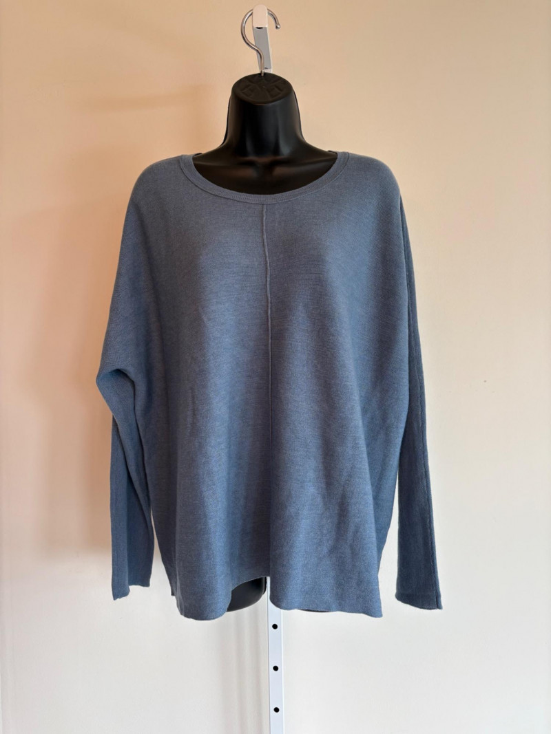 Trio of casual sweaters from Eileen Fisher. All measure 27" pit to pit. Blue lightweight sweater has round neckline, center front/back seaming, long sleeves, and ribbing at neckline. 100% merino wool. Size tag says XL. Super soft beige lightweight sweater has round neckline, short sleeves, ribbing at neck/arms/bottom hem, and a breast pocket. 100% merino wool. Size tag says XL. Amethyst purple sweater has crew neck, deconstructed seaming, dropped shoulder seams, long sleeves, and rolled neck/cuffs/lower hem. Cotton/Tencel blend. Size tag says 1X.