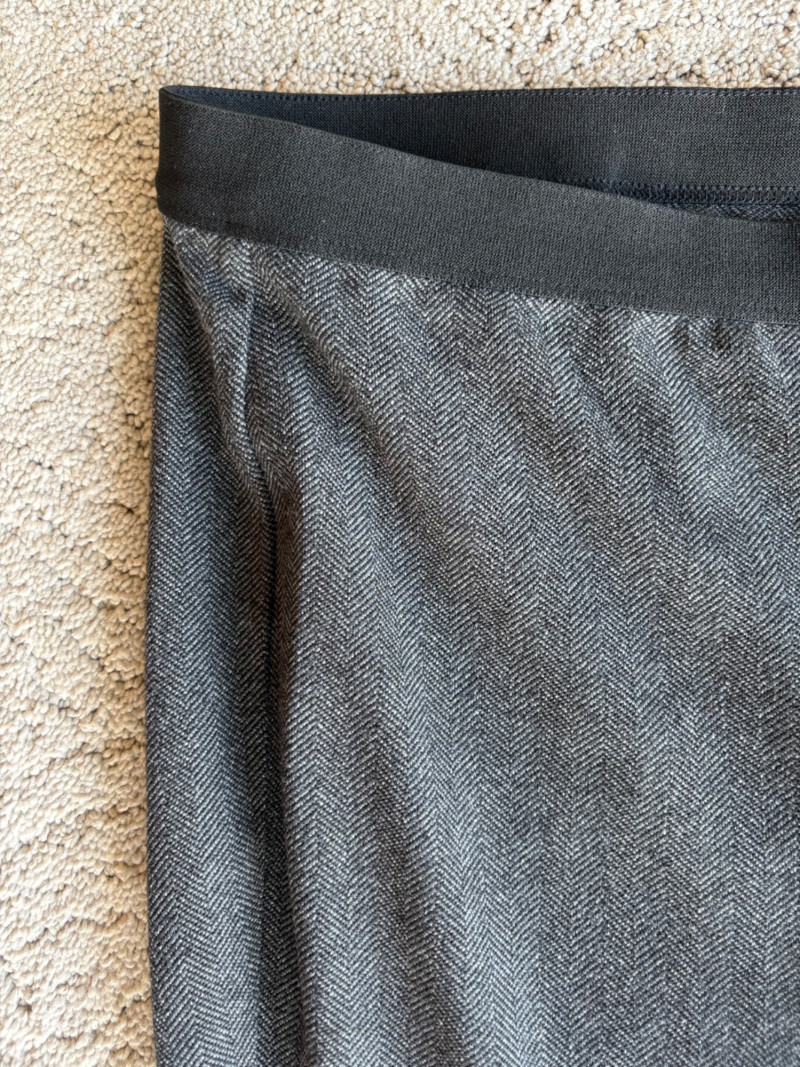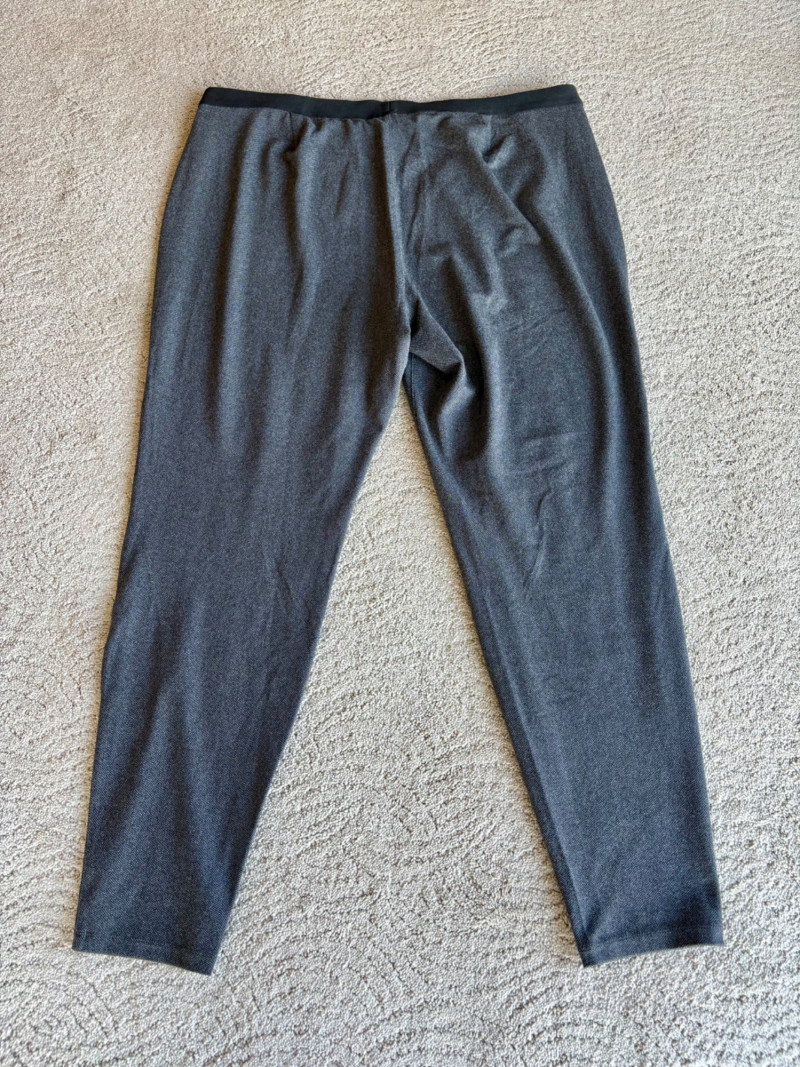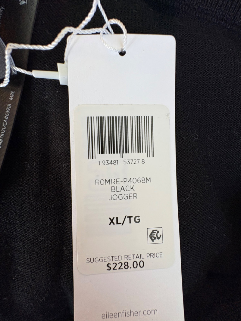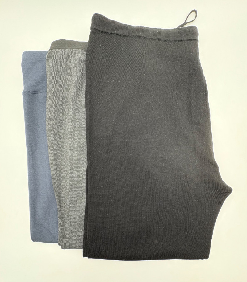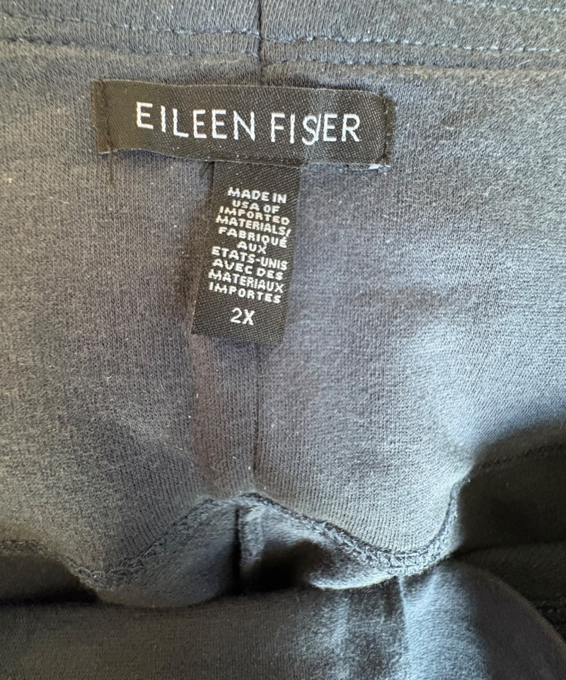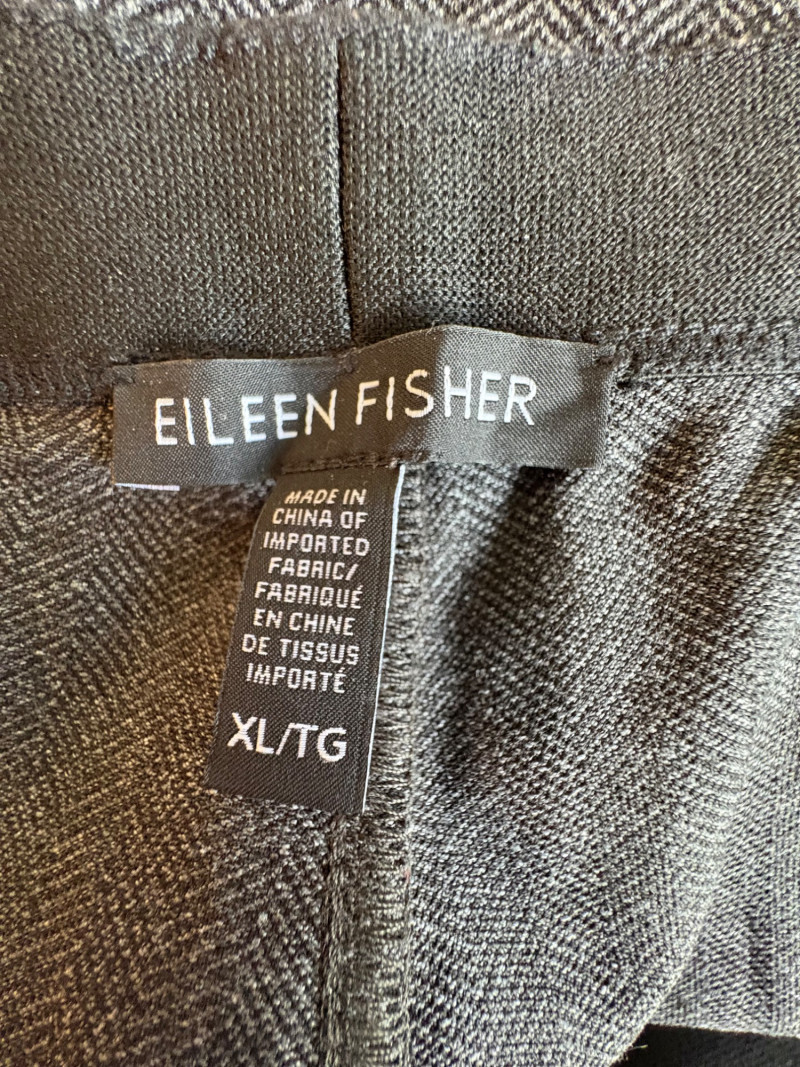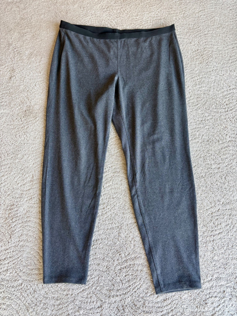 Trio of dark toned pants for fall days from Eileen Fisher. All measure 20" side to side at waist. Deep navy blue knitted pants have yoga type yoke/waistband and tapered legs - very close to a legging. Tencel Lyocell/organic cotton/spandex blend. Size tag says 2X. Gray and black herringbone pants are slim cut with no detail except black elastic waistband and back darts along with tapered leg. Perfect for under a flowing top when a slim bottom is needed. Polyester/recycled polyester/spandex blend. Size tag says XL. Black sweater-weave pants have elasticated ribbed waistband with drawstring, in-seam side pockets, and ribbed hem. Legs are fairly straight. New with tag. 100% fine merino wool. Size tag says XL.