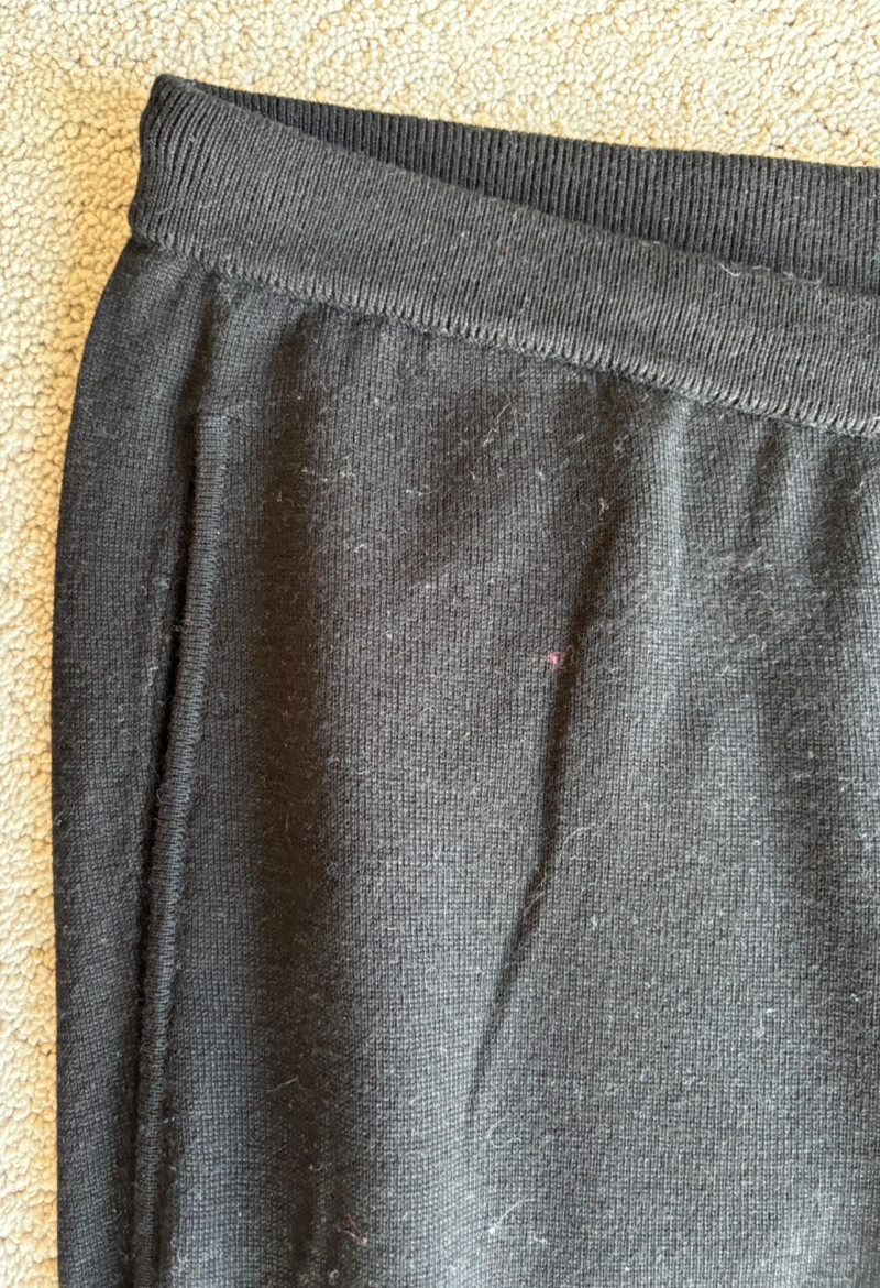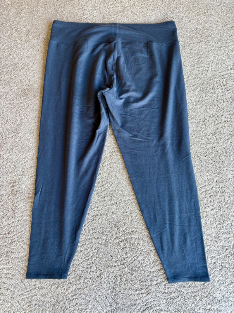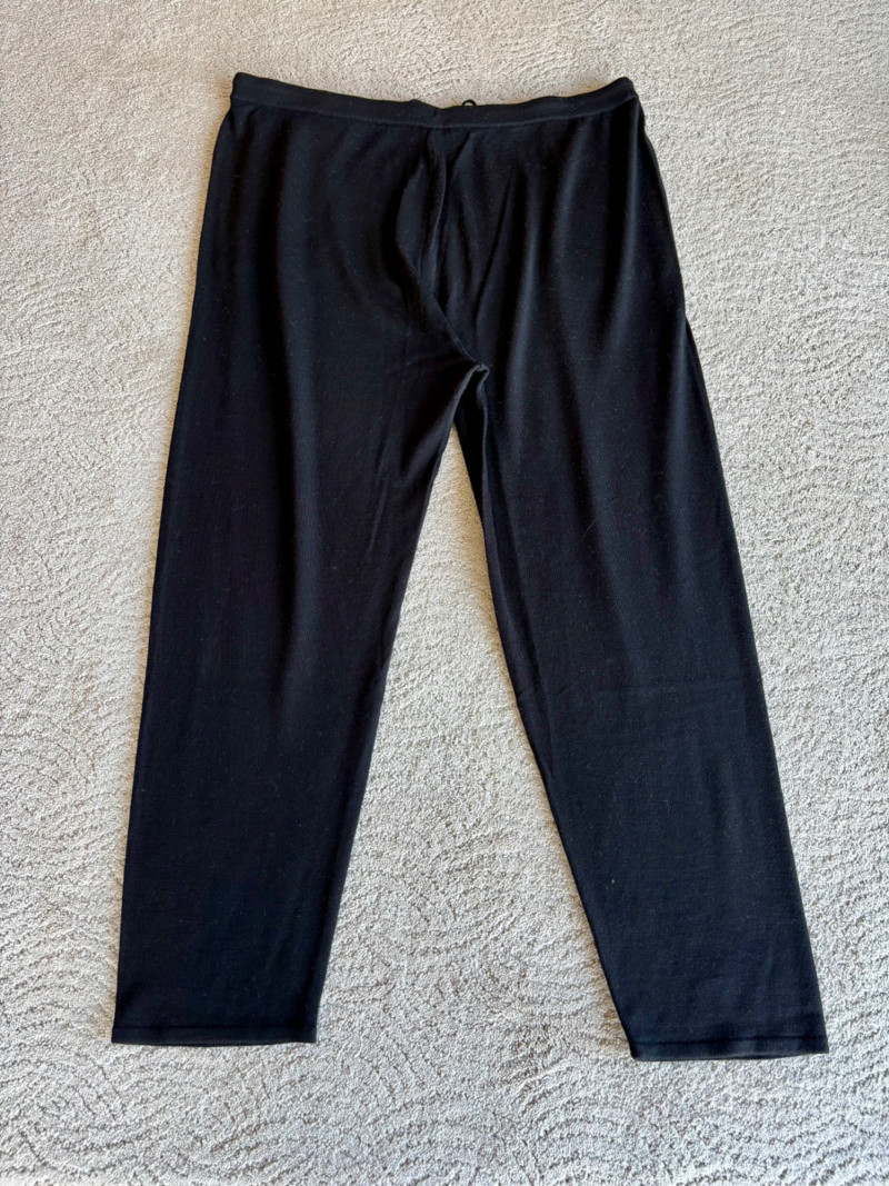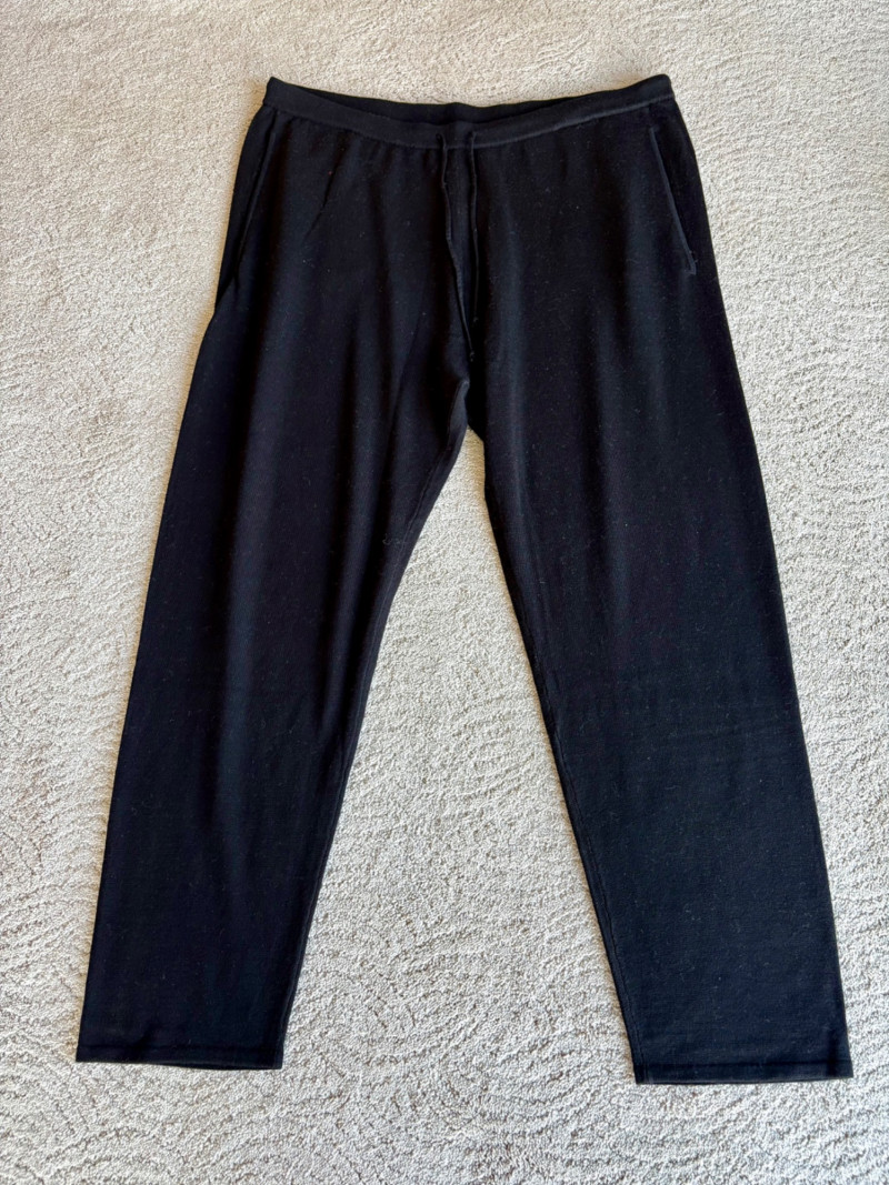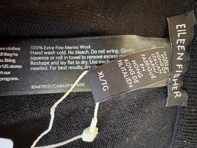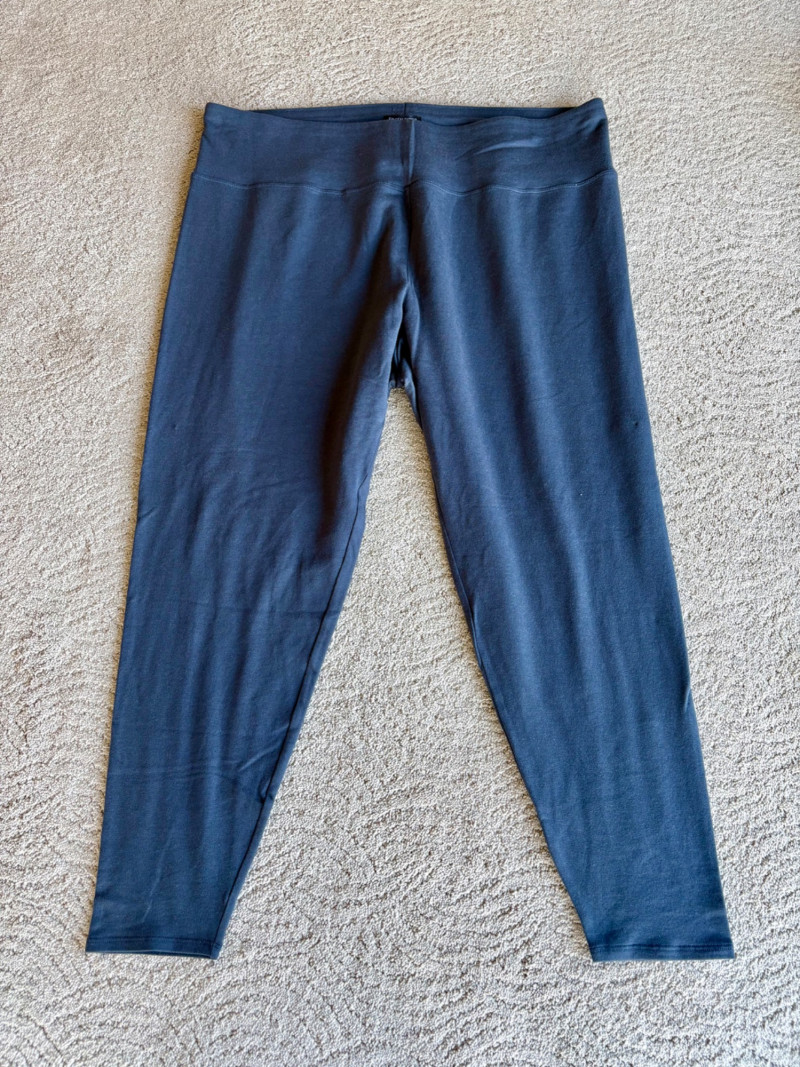Trio of dark toned pants for fall days from Eileen Fisher. All measure 20" side to side at waist. Deep navy blue knitted pants have yoga type yoke/waistband and tapered legs - very close to a legging. Tencel Lyocell/organic cotton/spandex blend. Size tag says 2X. Gray and black herringbone pants are slim cut with no detail except black elastic waistband and back darts along with tapered leg. Perfect for under a flowing top when a slim bottom is needed. Polyester/recycled polyester/spandex blend. Size tag says XL. Black sweater-weave pants have elasticated ribbed waistband with drawstring, in-seam side pockets, and ribbed hem. Legs are fairly straight. New with tag. 100% fine merino wool. Size tag says XL.