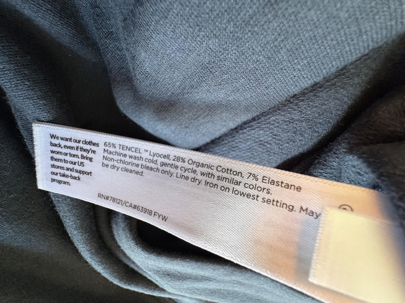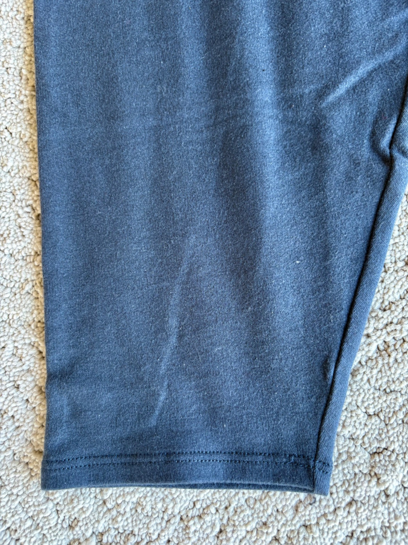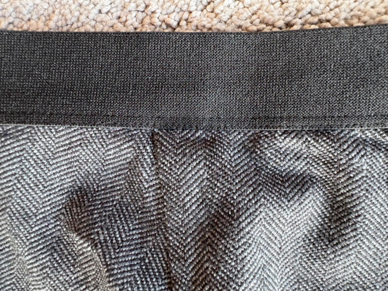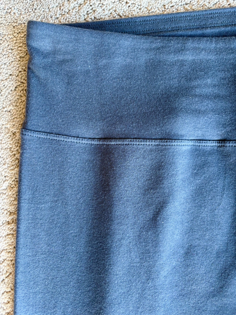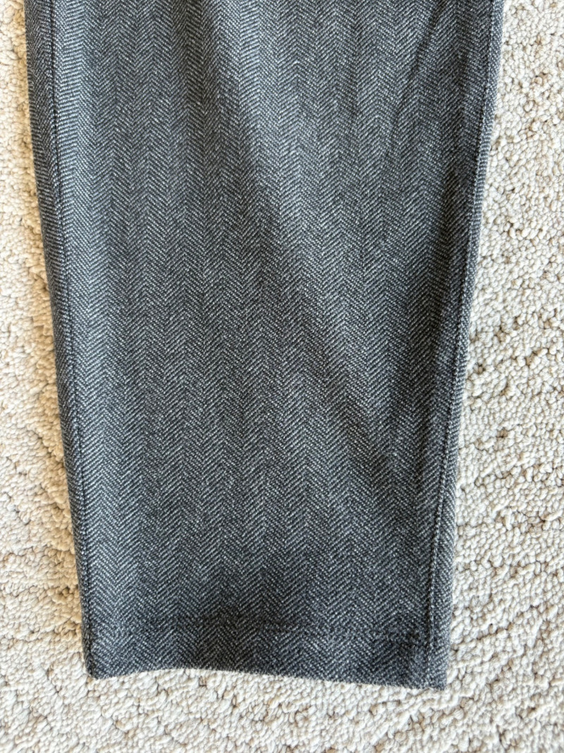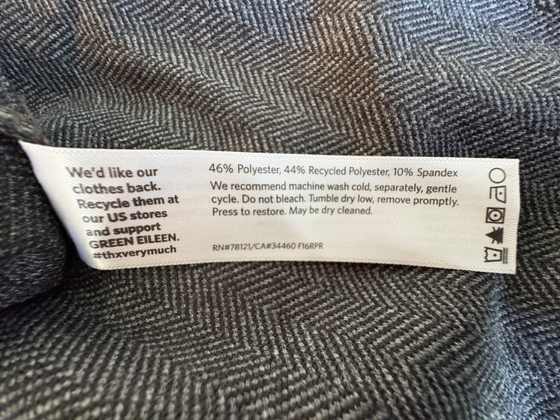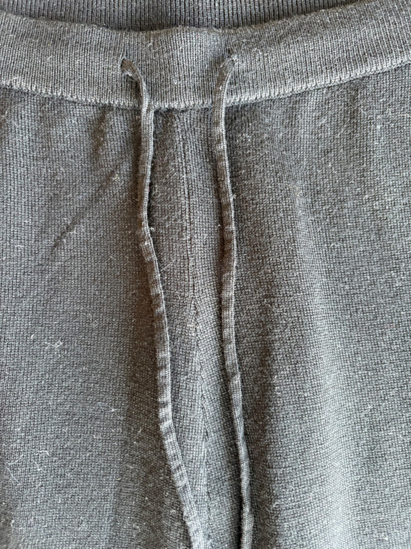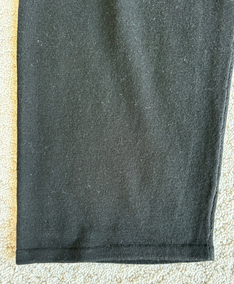 Trio of dark toned pants for fall days from Eileen Fisher. All measure 20" side to side at waist. Deep navy blue knitted pants have yoga type yoke/waistband and tapered legs - very close to a legging. Tencel Lyocell/organic cotton/spandex blend. Size tag says 2X. Gray and black herringbone pants are slim cut with no detail except black elastic waistband and back darts along with tapered leg. Perfect for under a flowing top when a slim bottom is needed. Polyester/recycled polyester/spandex blend. Size tag says XL. Black sweater-weave pants have elasticated ribbed waistband with drawstring, in-seam side pockets, and ribbed hem. Legs are fairly straight. New with tag. 100% fine merino wool. Size tag says XL.