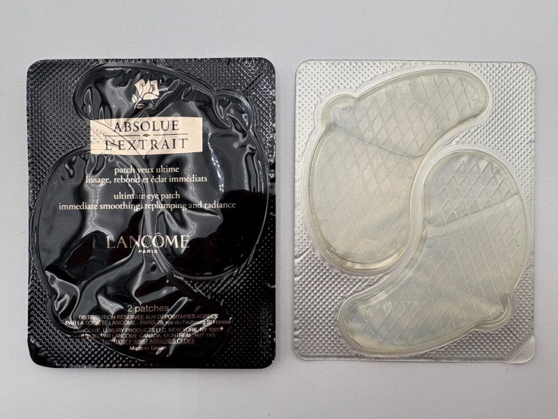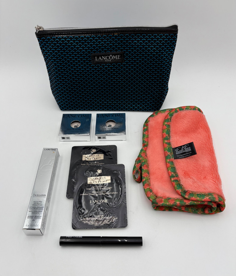Lancome make-up products + other items. All appear to be new to the best of our determination. - 2 pairs Lancome Absolue L'Extrait Eye Patches - Lancome Oscillation Mascara - 2 Lancome Color Design Sensational Effects Eye Shadow compacts - Color #101 Daylight (matte) - MAC Prep + Prime Lip Primer - Fresh Face Make-up Remover towel in orange Lancome bag in blue & black (also new)