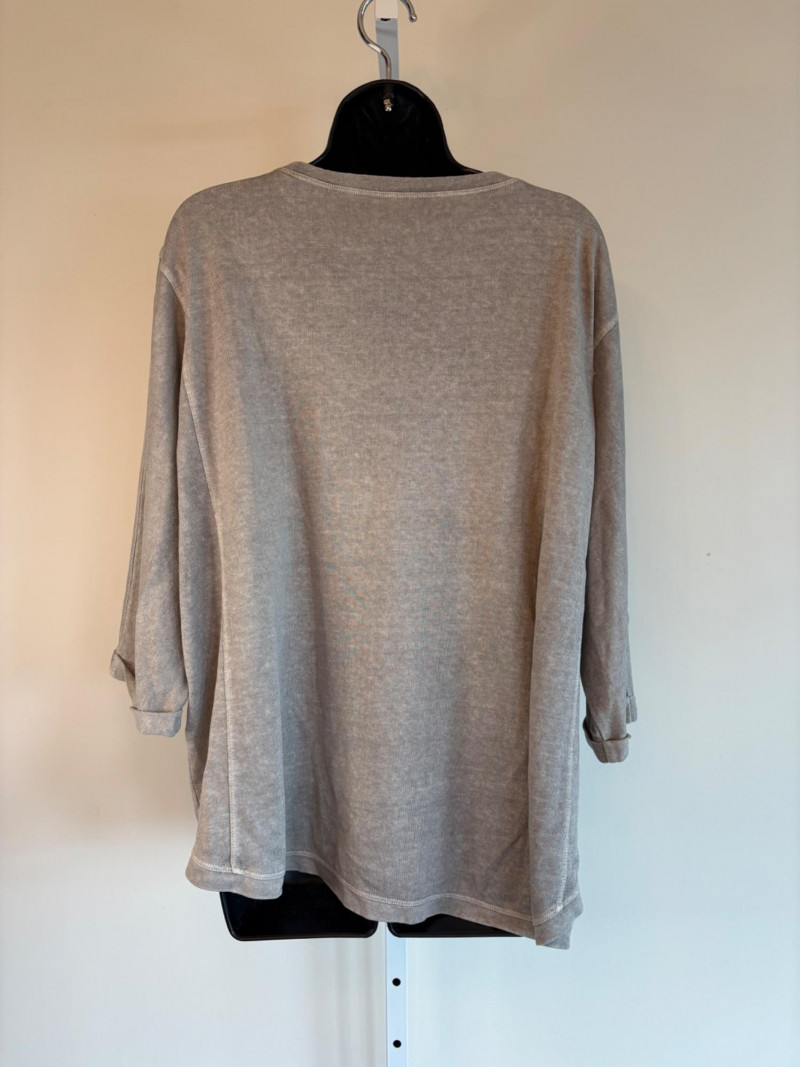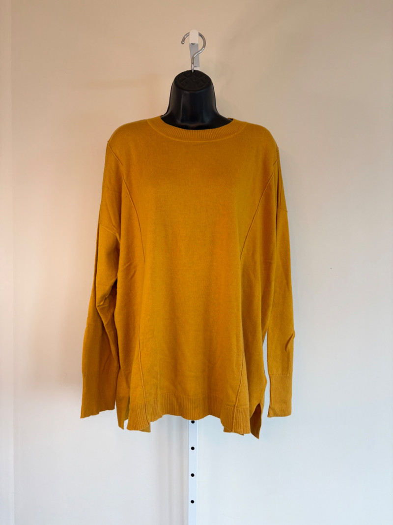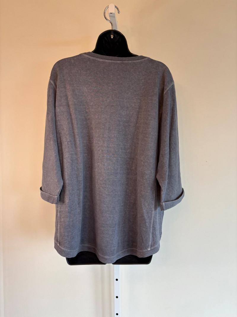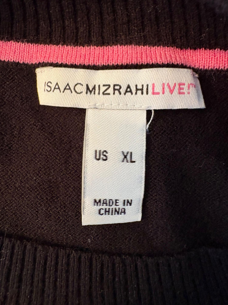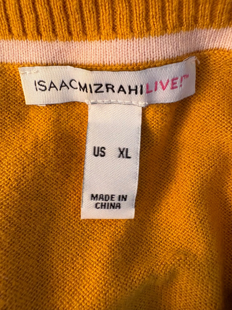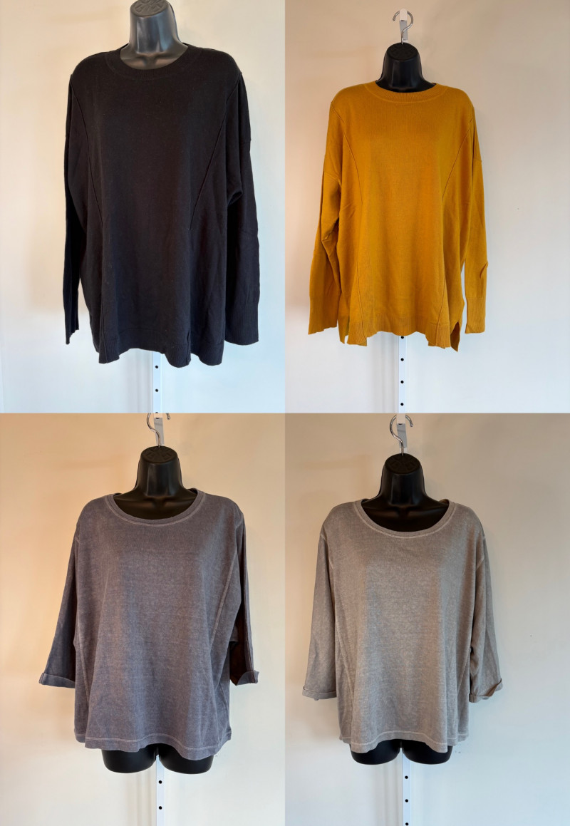 Pair of comfortable Poetry heavy t-shirts (almost light sweatshirts) along with two lightweight sweaters from Isaac Mizrahi. Identical black and gold sweaters from Isaac Mizrahi measure 26.5" pit to pit with long sleeves and princess/side seaming down front and back. Bottom split hem. Both are cotton/rayon/nylon blend. Both size tags are XL. Both Poetry t-shirts measure 27" pit to pit with the back hem longer than front. Sleeves have rolled cuffs and there are bands at the neckline and lower hem along with side/sleeve piecing. Both shirts in hemp/cotton blend. Both size tags are 16.