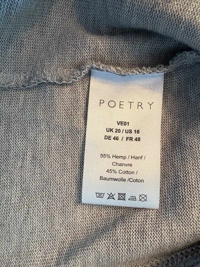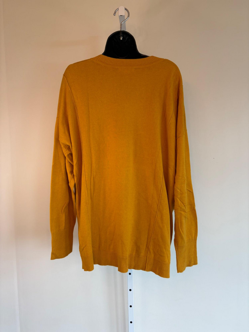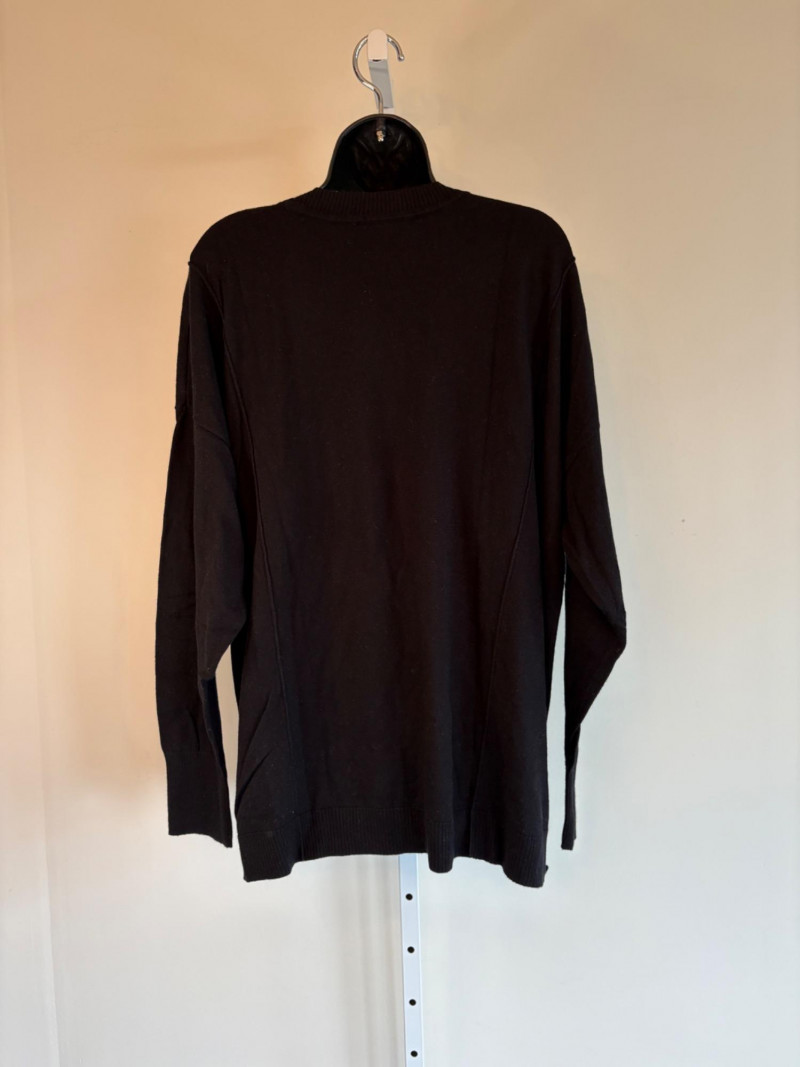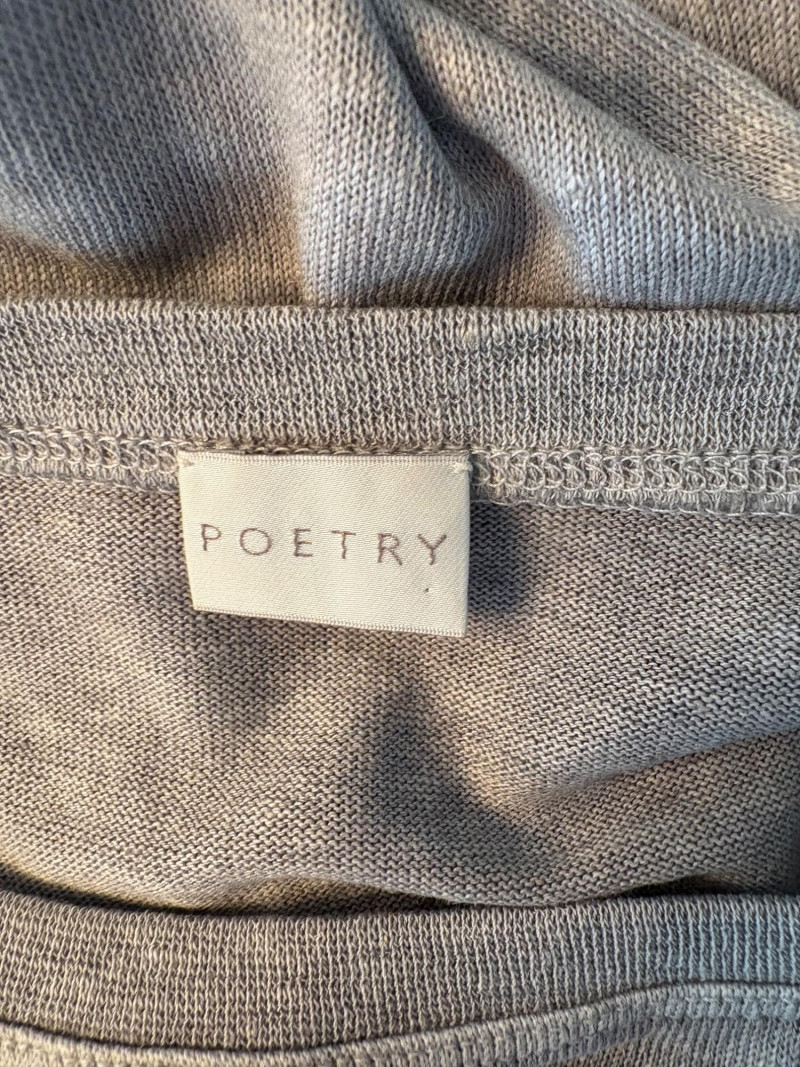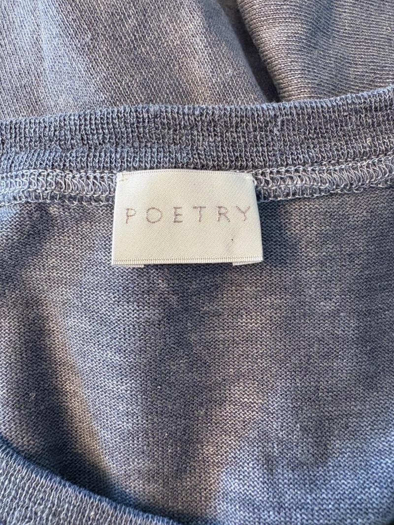 Pair of comfortable Poetry heavy t-shirts (almost light sweatshirts) along with two lightweight sweaters from Isaac Mizrahi. Identical black and gold sweaters from Isaac Mizrahi measure 26.5" pit to pit with long sleeves and princess/side seaming down front and back. Bottom split hem. Both are cotton/rayon/nylon blend. Both size tags are XL. Both Poetry t-shirts measure 27" pit to pit with the back hem longer than front. Sleeves have rolled cuffs and there are bands at the neckline and lower hem along with side/sleeve piecing. Both shirts in hemp/cotton blend. Both size tags are 16.