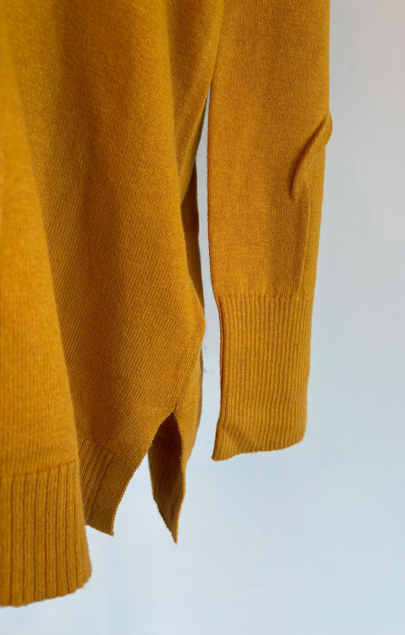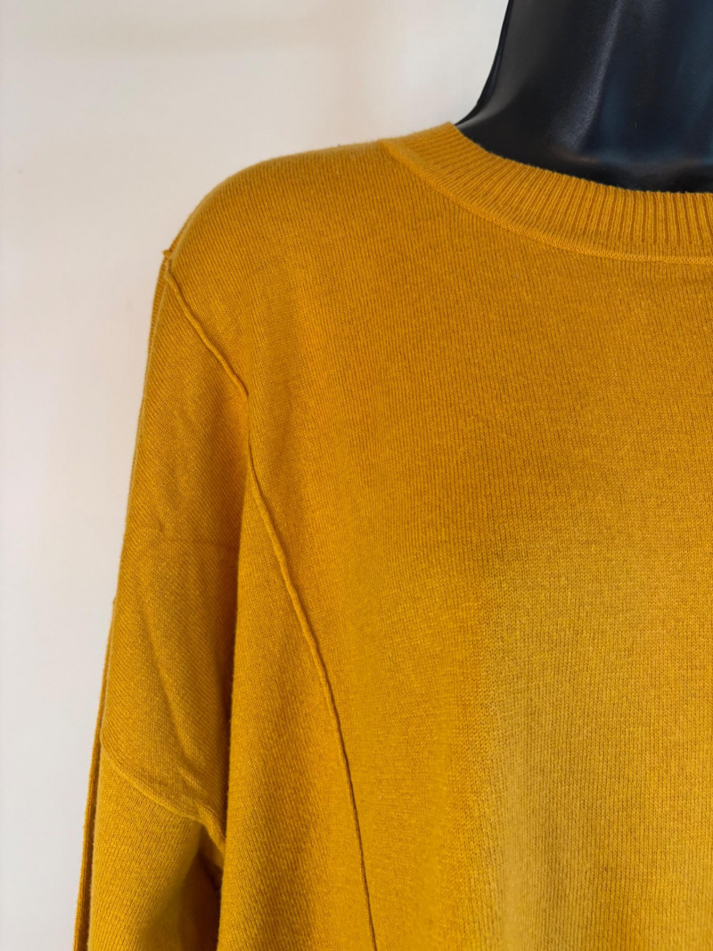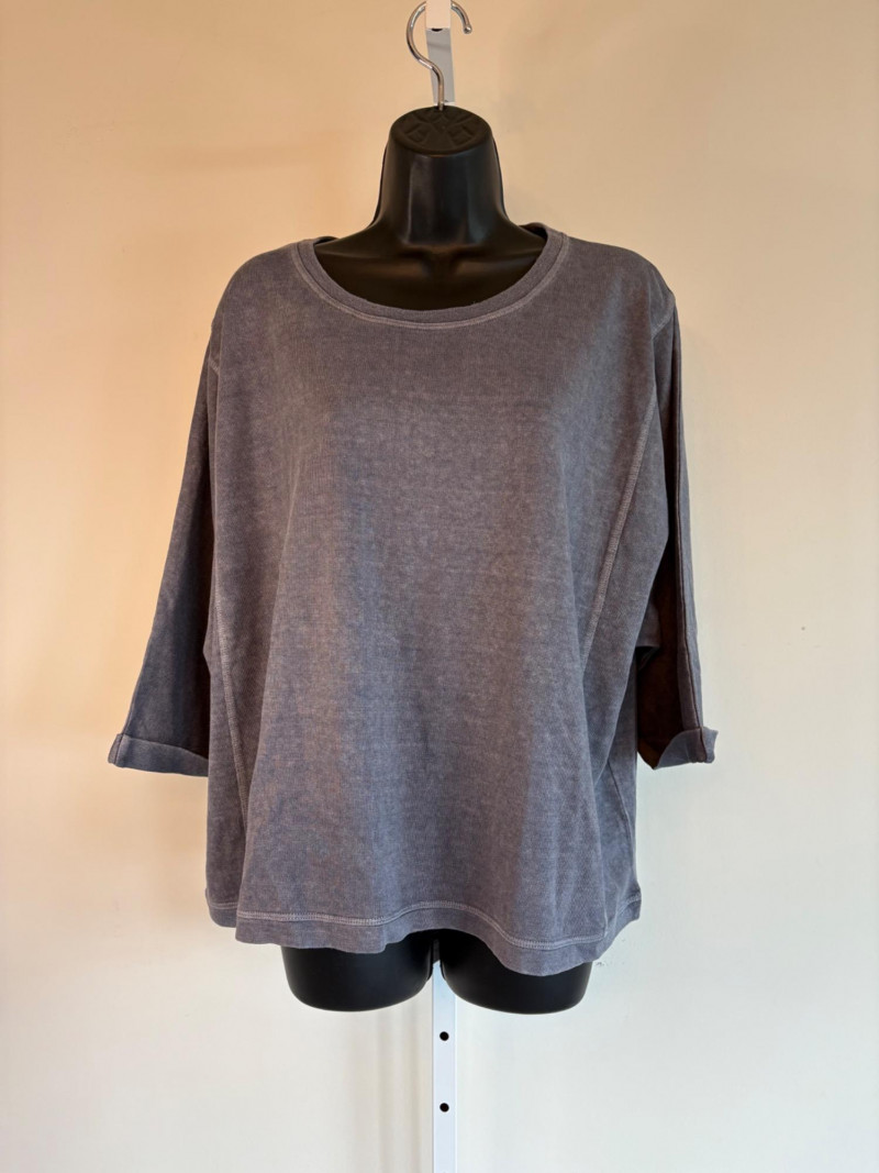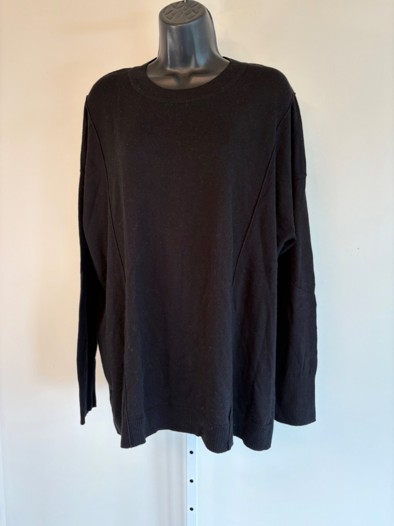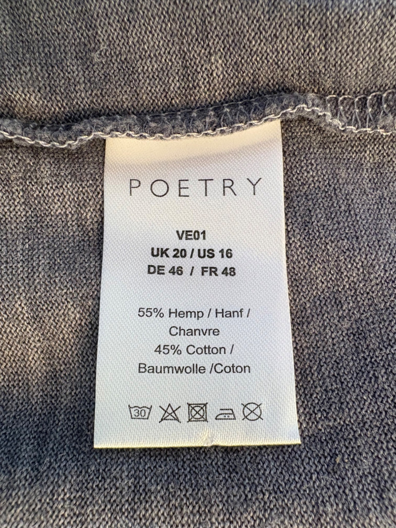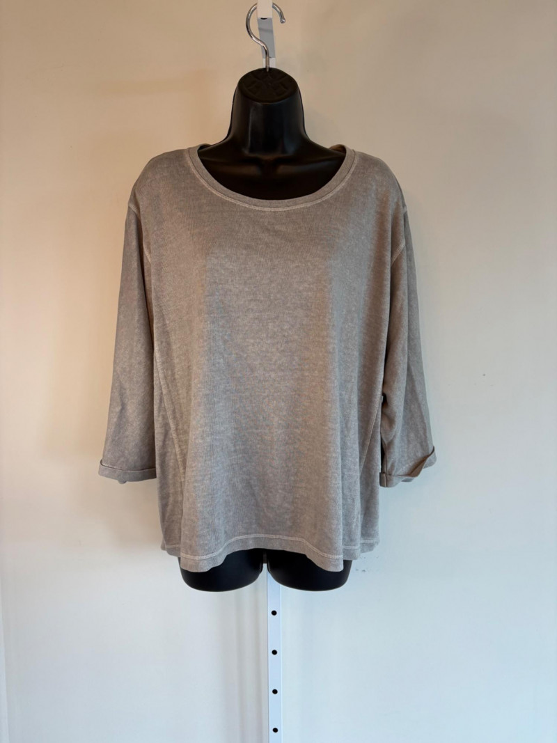 Pair of comfortable Poetry heavy t-shirts (almost light sweatshirts) along with two lightweight sweaters from Isaac Mizrahi. Identical black and gold sweaters from Isaac Mizrahi measure 26.5" pit to pit with long sleeves and princess/side seaming down front and back. Bottom split hem. Both are cotton/rayon/nylon blend. Both size tags are XL. Both Poetry t-shirts measure 27" pit to pit with the back hem longer than front. Sleeves have rolled cuffs and there are bands at the neckline and lower hem along with side/sleeve piecing. Both shirts in hemp/cotton blend. Both size tags are 16.