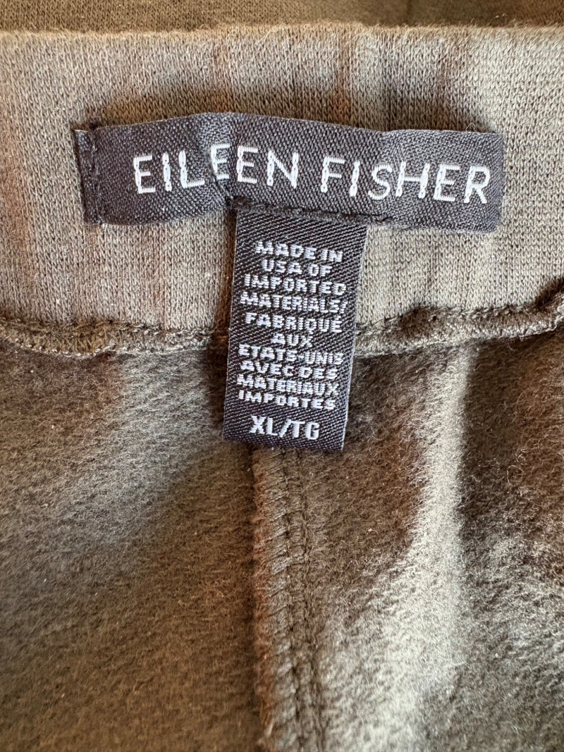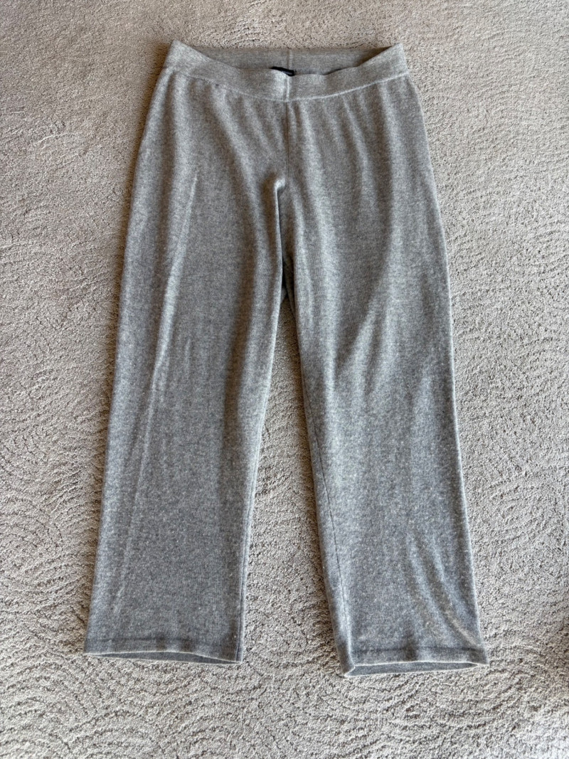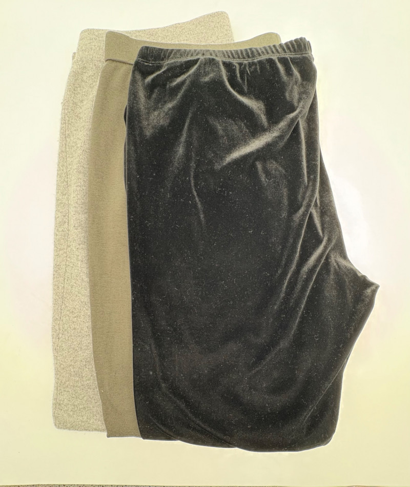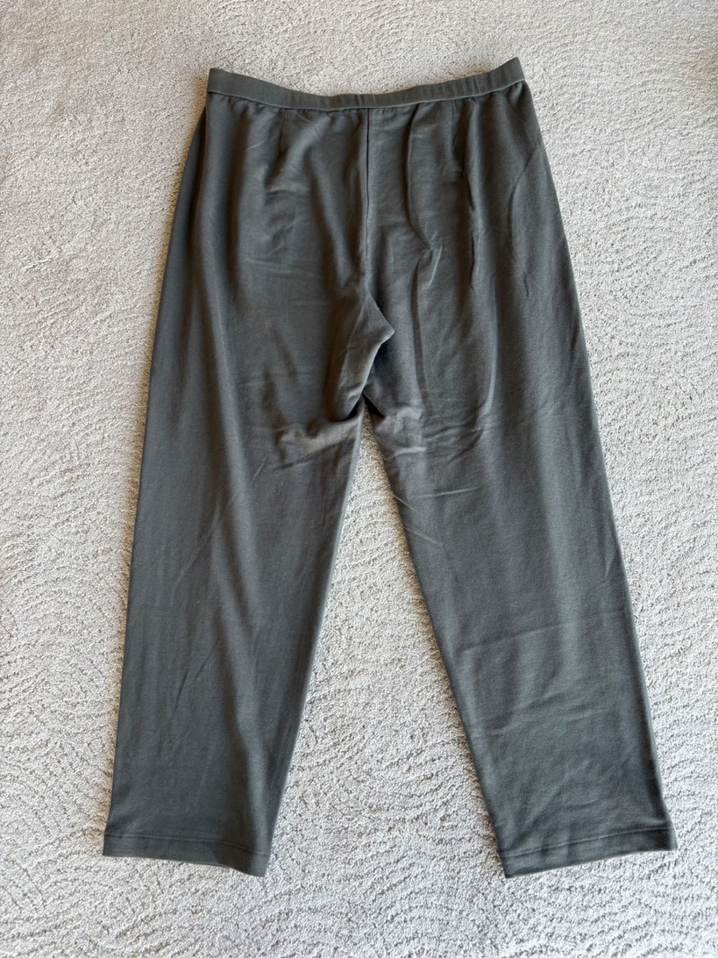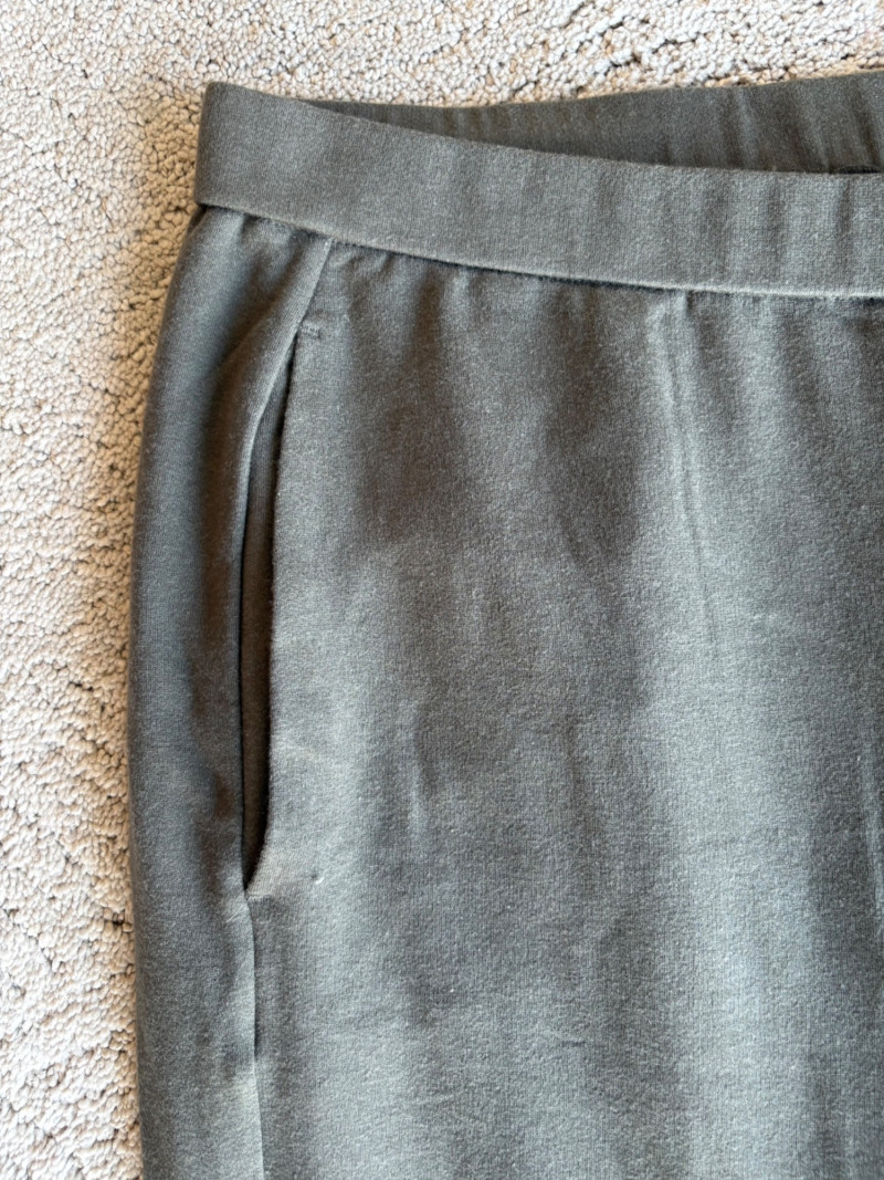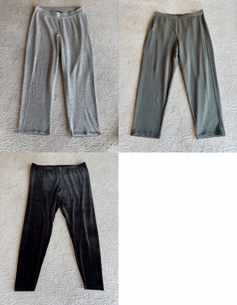 3 pairs of knit pants from Eileen Fisher, Sutton Studio, & J. Jill. All three measure 18" side to side at waist. Grey sweater knit pants from Sutton Studio have wide flat ribbed elastic waistband and straight legs. 100% cashmere. Size tag says 1X. Note that there is pilling around the lower leg - we are guessing the client wore these tucked into boots. Nothing a quick date with your sweater shaver couldn't remedy quickly - see last photo for most egregious example. Olive drab smooth knit pants from Eileen Fisher have elasticated flat waist, in-seam pockets, and back darts with a straight leg. Tencel Lyocell/organic cotton/spandex blend. Size tag says XL. Black stretch knit velvet pants from Eileen Fisher have narrow elasticated waistband and tapered legs; perfect for under a flowing tunic for a slimmer look. Polyester/spandex blend. Size tag says XL