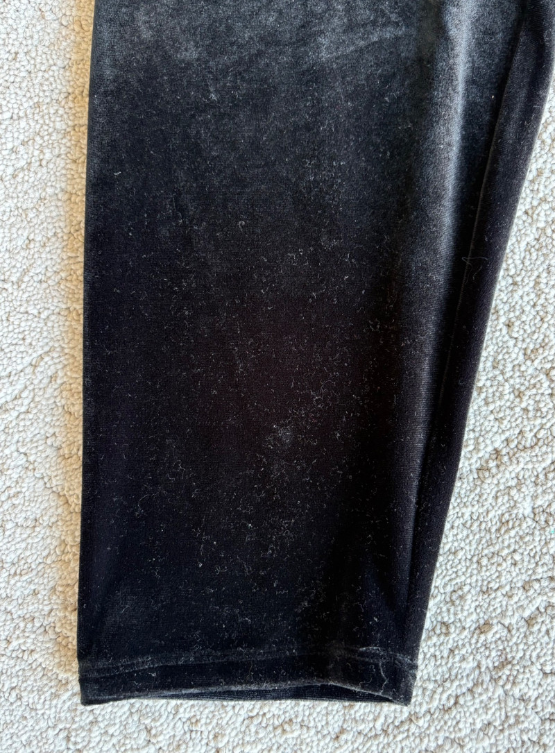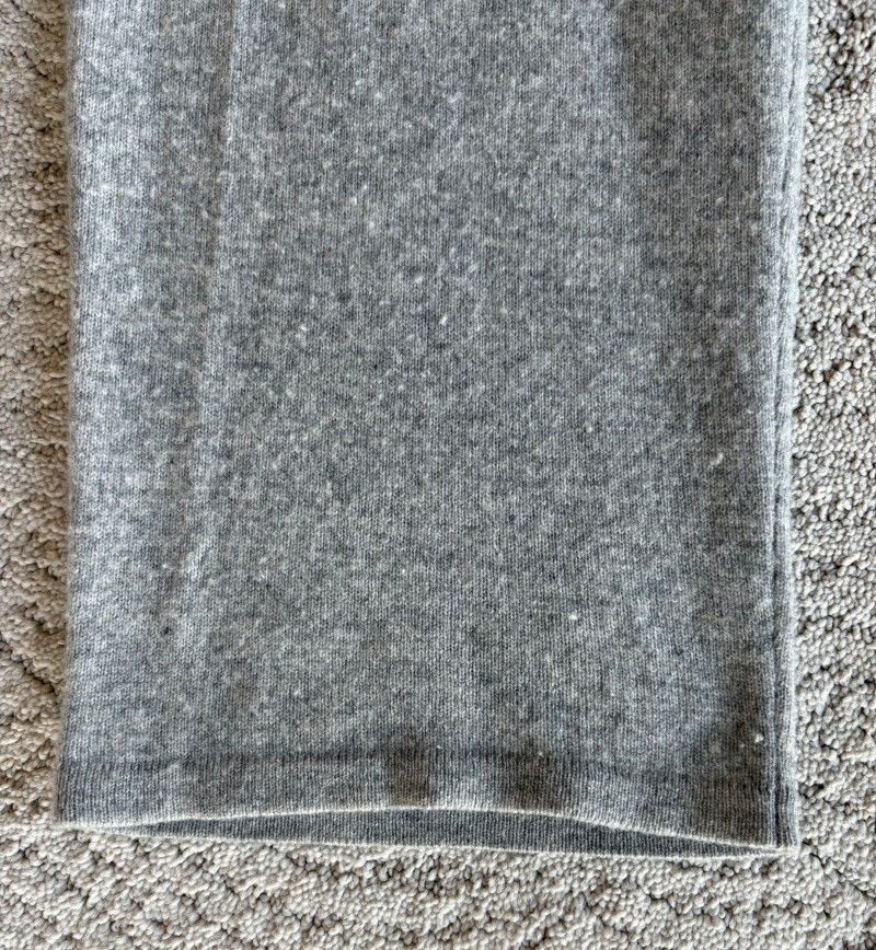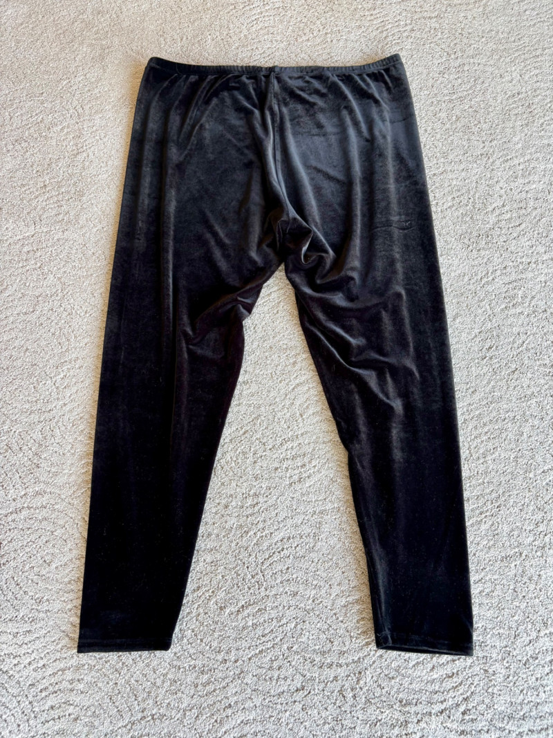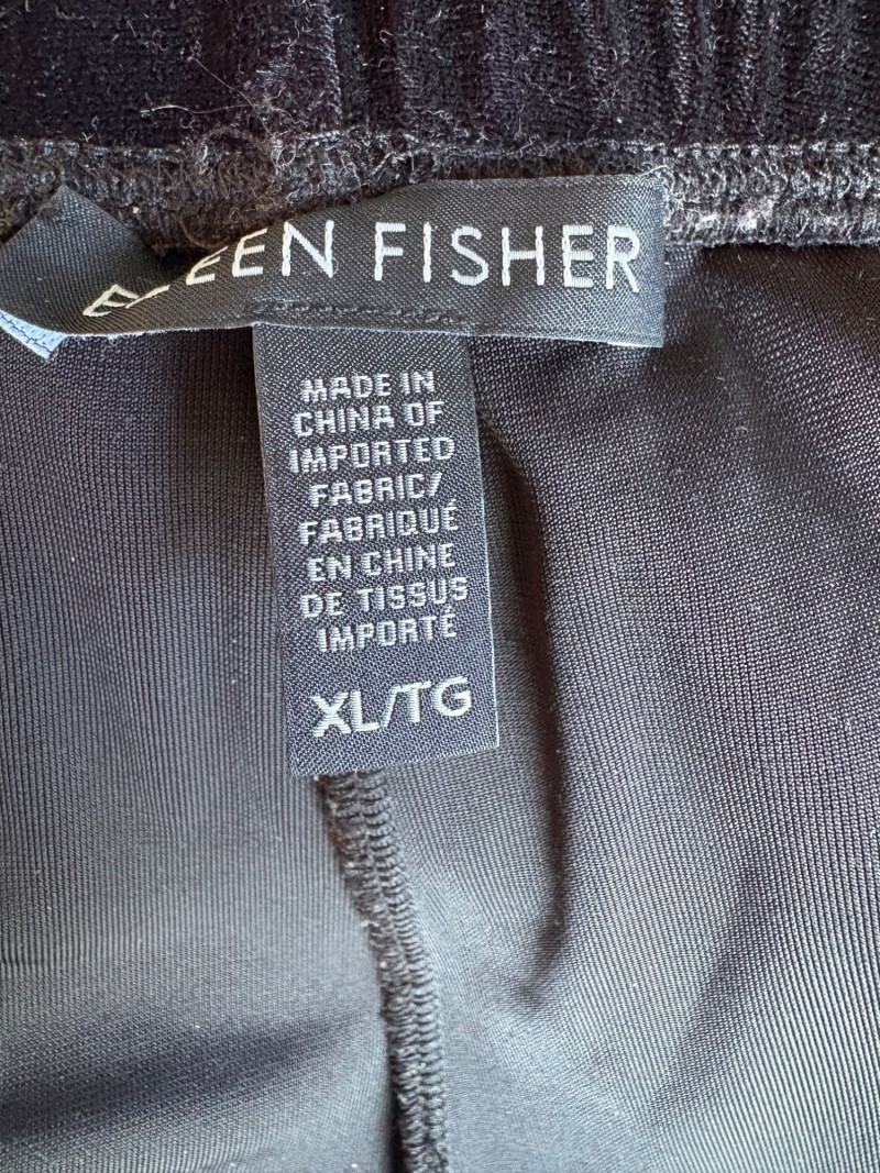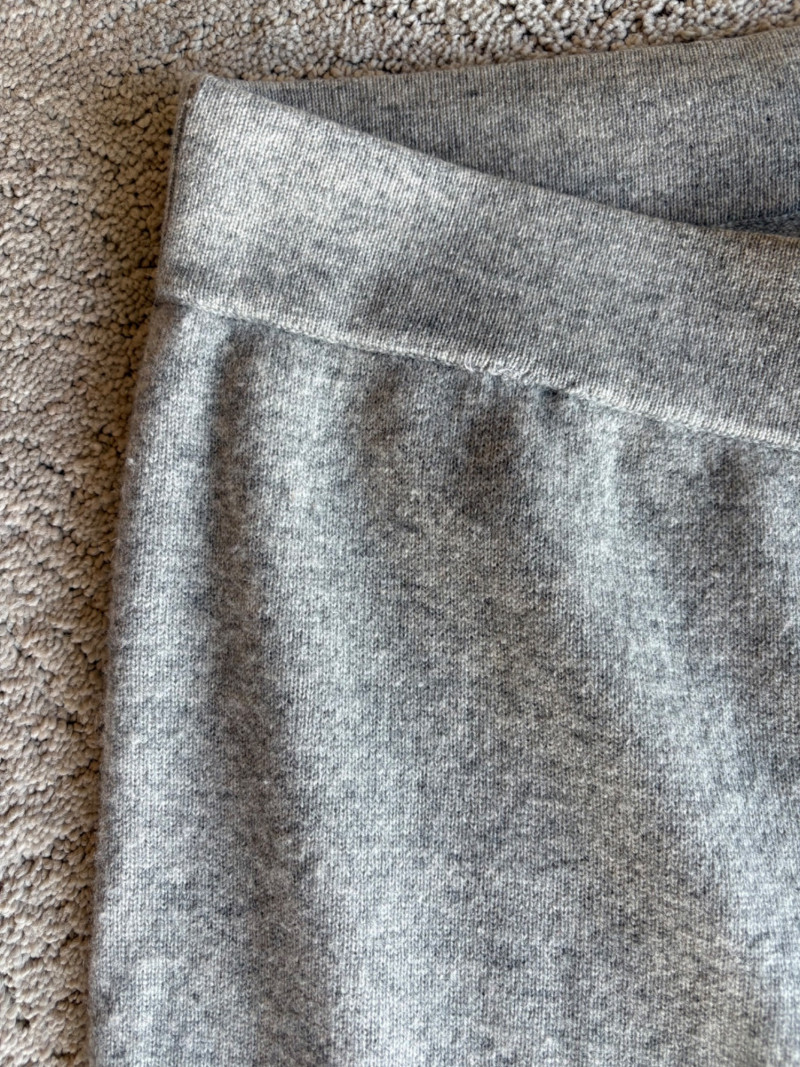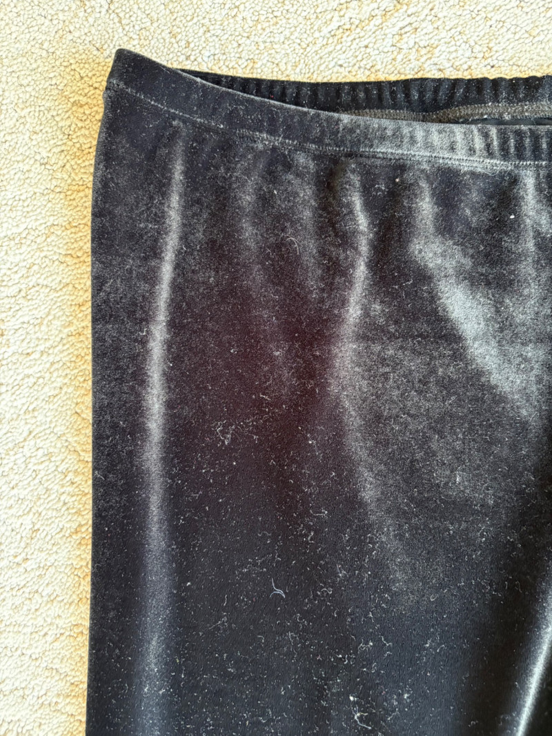 3 pairs of knit pants from Eileen Fisher, Sutton Studio, & J. Jill. All three measure 18" side to side at waist. Grey sweater knit pants from Sutton Studio have wide flat ribbed elastic waistband and straight legs. 100% cashmere. Size tag says 1X. Note that there is pilling around the lower leg - we are guessing the client wore these tucked into boots. Nothing a quick date with your sweater shaver couldn't remedy quickly - see last photo for most egregious example. Olive drab smooth knit pants from Eileen Fisher have elasticated flat waist, in-seam pockets, and back darts with a straight leg. Tencel Lyocell/organic cotton/spandex blend. Size tag says XL. Black stretch knit velvet pants from Eileen Fisher have narrow elasticated waistband and tapered legs; perfect for under a flowing tunic for a slimmer look. Polyester/spandex blend. Size tag says XL
