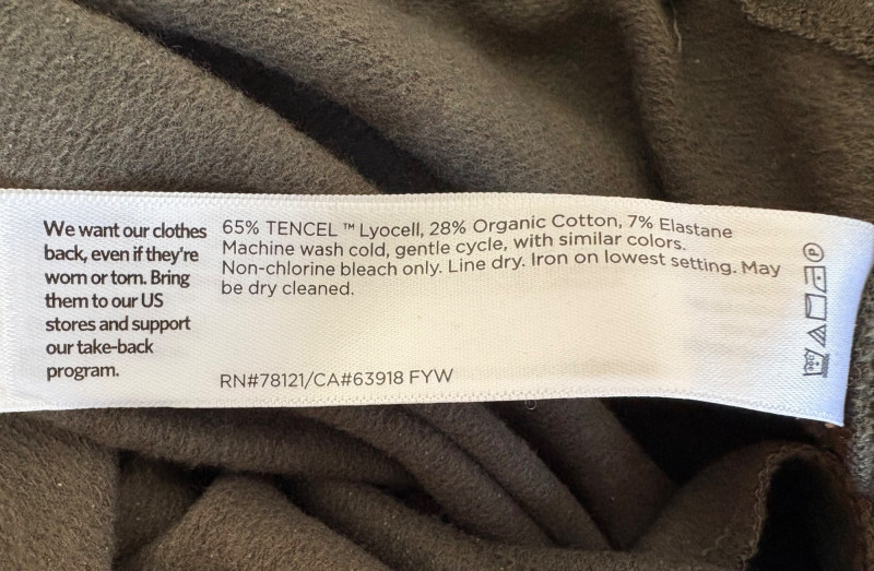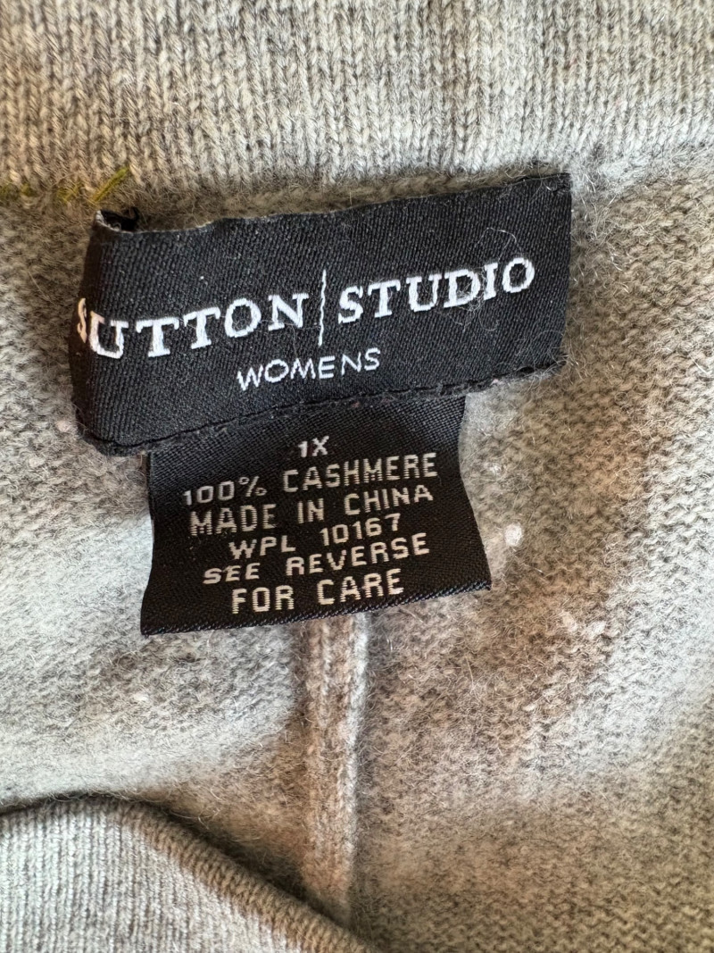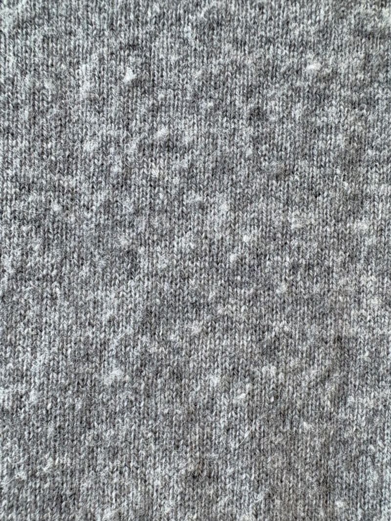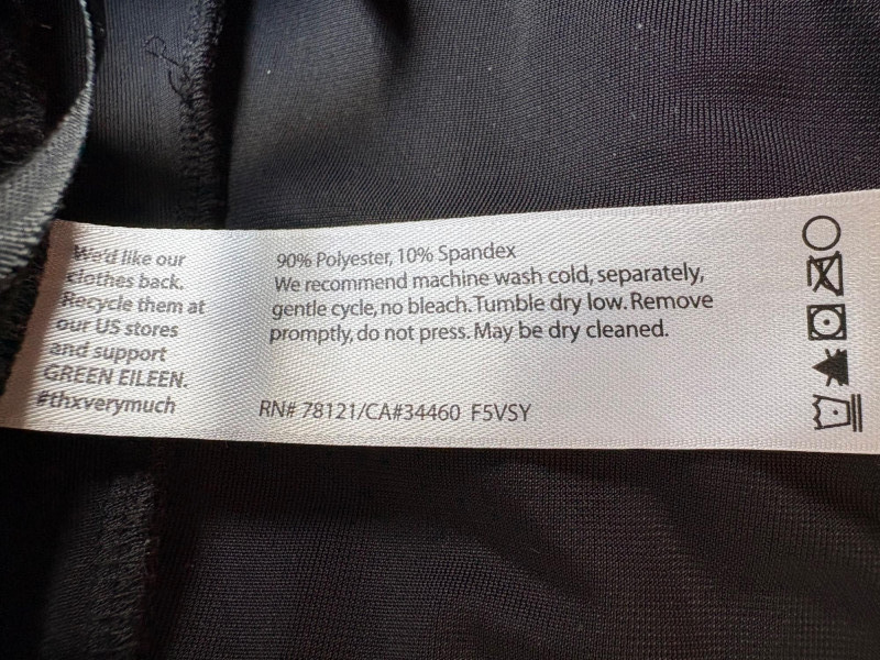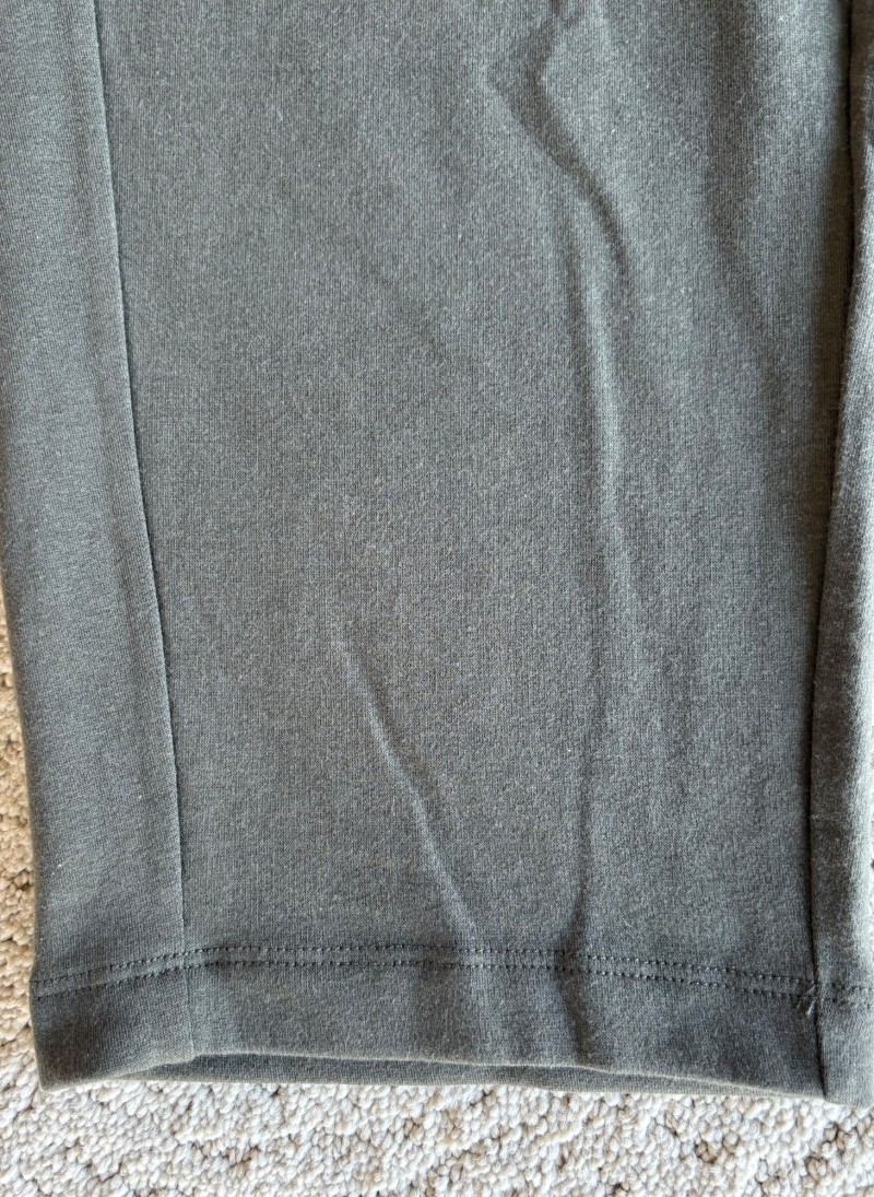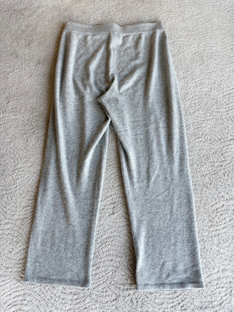 3 pairs of knit pants from Eileen Fisher, Sutton Studio, & J. Jill. All three measure 18" side to side at waist. Grey sweater knit pants from Sutton Studio have wide flat ribbed elastic waistband and straight legs. 100% cashmere. Size tag says 1X. Note that there is pilling around the lower leg - we are guessing the client wore these tucked into boots. Nothing a quick date with your sweater shaver couldn't remedy quickly - see last photo for most egregious example. Olive drab smooth knit pants from Eileen Fisher have elasticated flat waist, in-seam pockets, and back darts with a straight leg. Tencel Lyocell/organic cotton/spandex blend. Size tag says XL. Black stretch knit velvet pants from Eileen Fisher have narrow elasticated waistband and tapered legs; perfect for under a flowing tunic for a slimmer look. Polyester/spandex blend. Size tag says XL