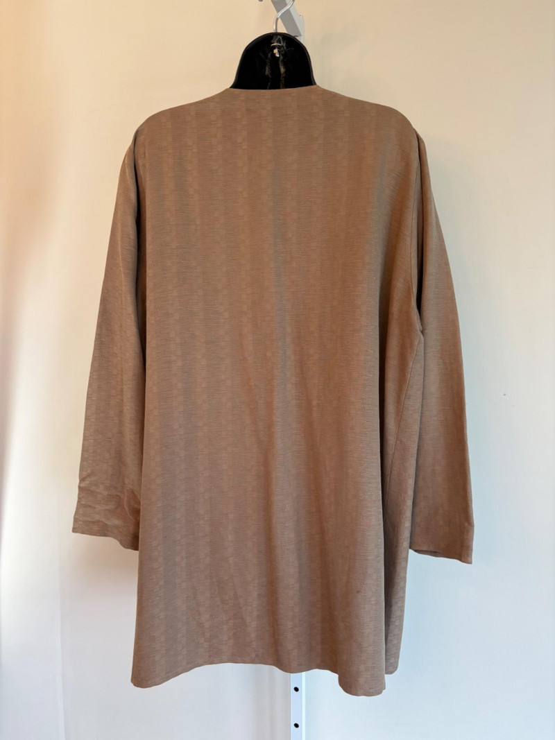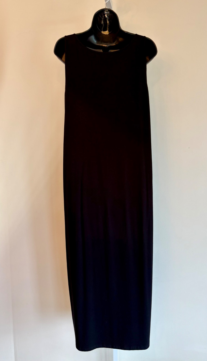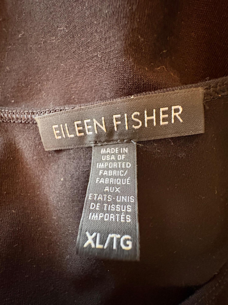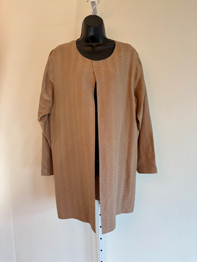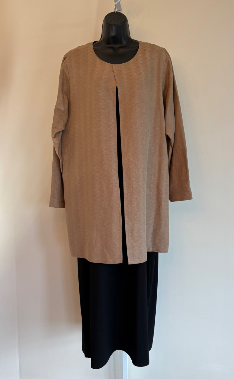 Classic duo from Eileen Fisher with scarf from Garnet Hill. Full-length black sleeveless dress is one of those basics everyone should have to dress up or down. This one has has round neckline, straight cut, and a lot of body/heft in the stretch knit. Viscose/spandex blend. Measures 21" pit to pit and 50" from shoulder to bottom hem. Size tag says XL. Collarless taupe jacket has round neckline, open front, textured weave, and self-faced front panels along with a magnetic closure at the collar. Fabric tag is missing. Measures 21" pit to pit and 33" from back neckline to bottom hem. Size tag says 2X and while it is generous, it doesn't seem to be quite this big... Paired with soft floral scarf from Garnet Hill in coordinating colors. Measures approximately 50" x 54". Modal/cashmere blend.