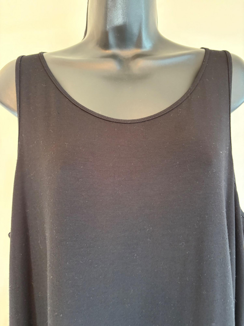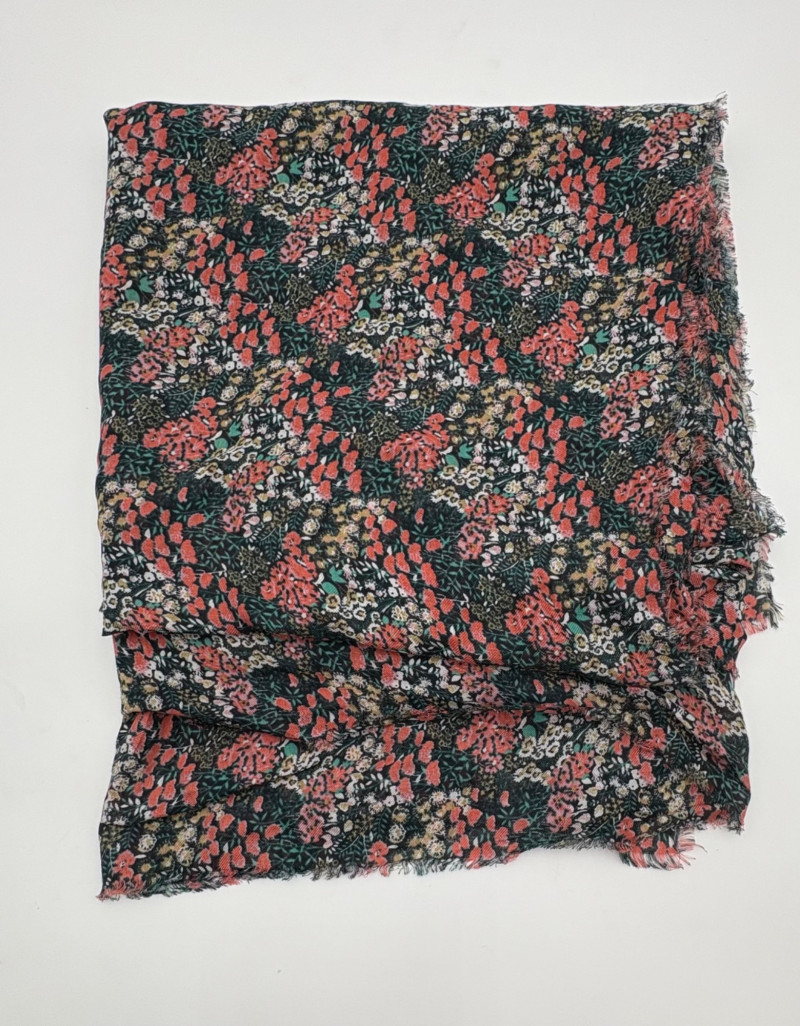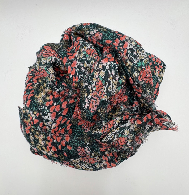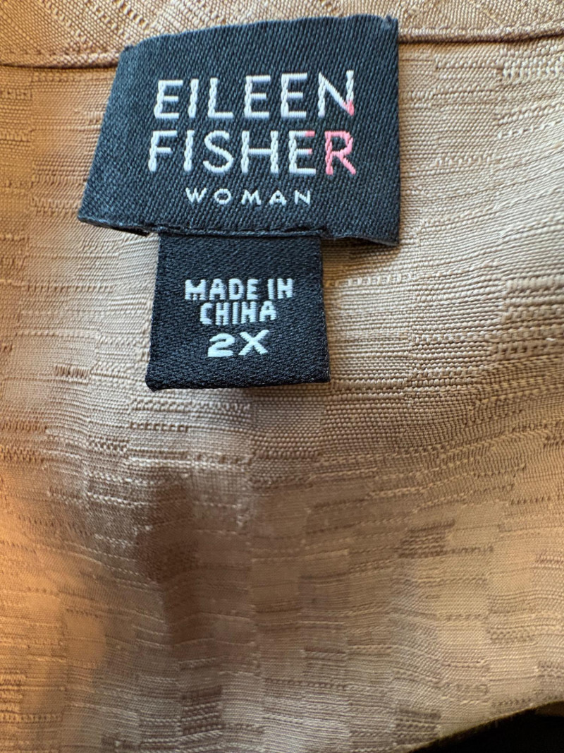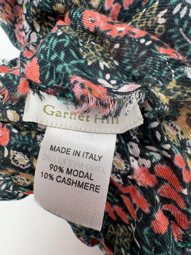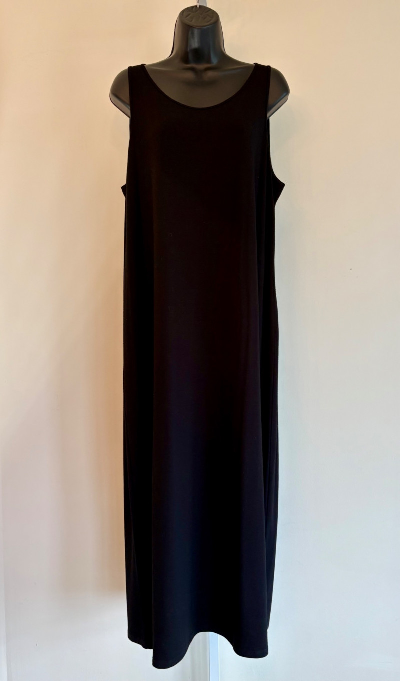 Classic duo from Eileen Fisher with scarf from Garnet Hill. Full-length black sleeveless dress is one of those basics everyone should have to dress up or down. This one has has round neckline, straight cut, and a lot of body/heft in the stretch knit. Viscose/spandex blend. Measures 21" pit to pit and 50" from shoulder to bottom hem. Size tag says XL. Collarless taupe jacket has round neckline, open front, textured weave, and self-faced front panels along with a magnetic closure at the collar. Fabric tag is missing. Measures 21" pit to pit and 33" from back neckline to bottom hem. Size tag says 2X and while it is generous, it doesn't seem to be quite this big... Paired with soft floral scarf from Garnet Hill in coordinating colors. Measures approximately 50" x 54". Modal/cashmere blend.