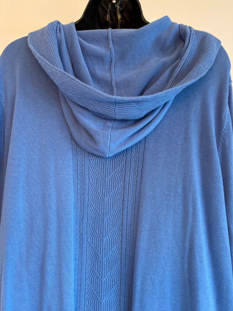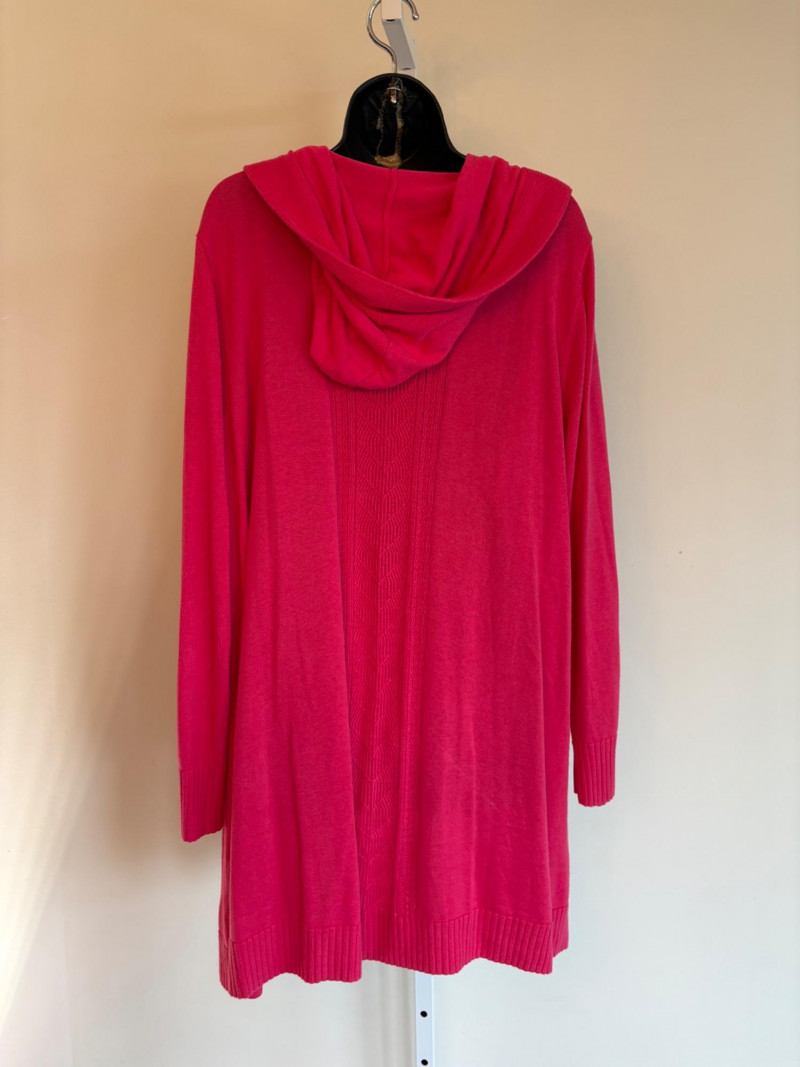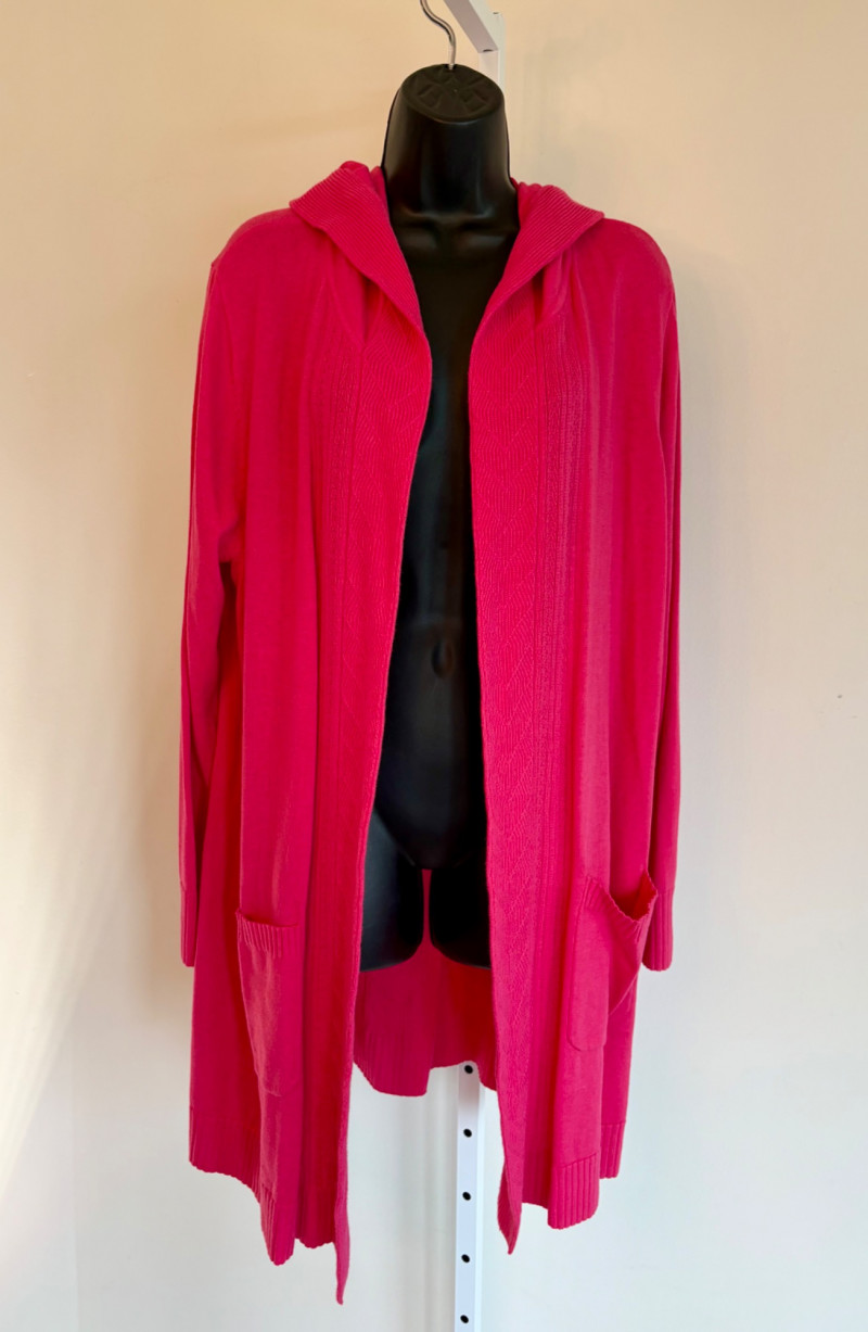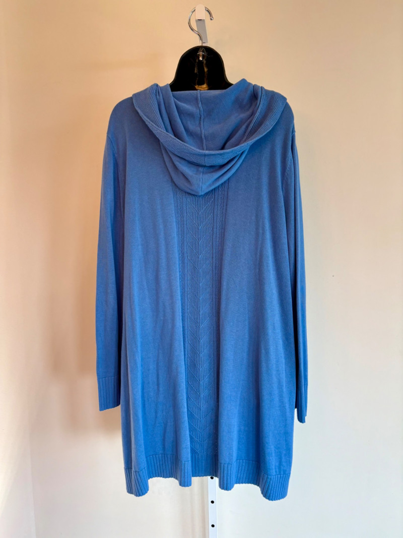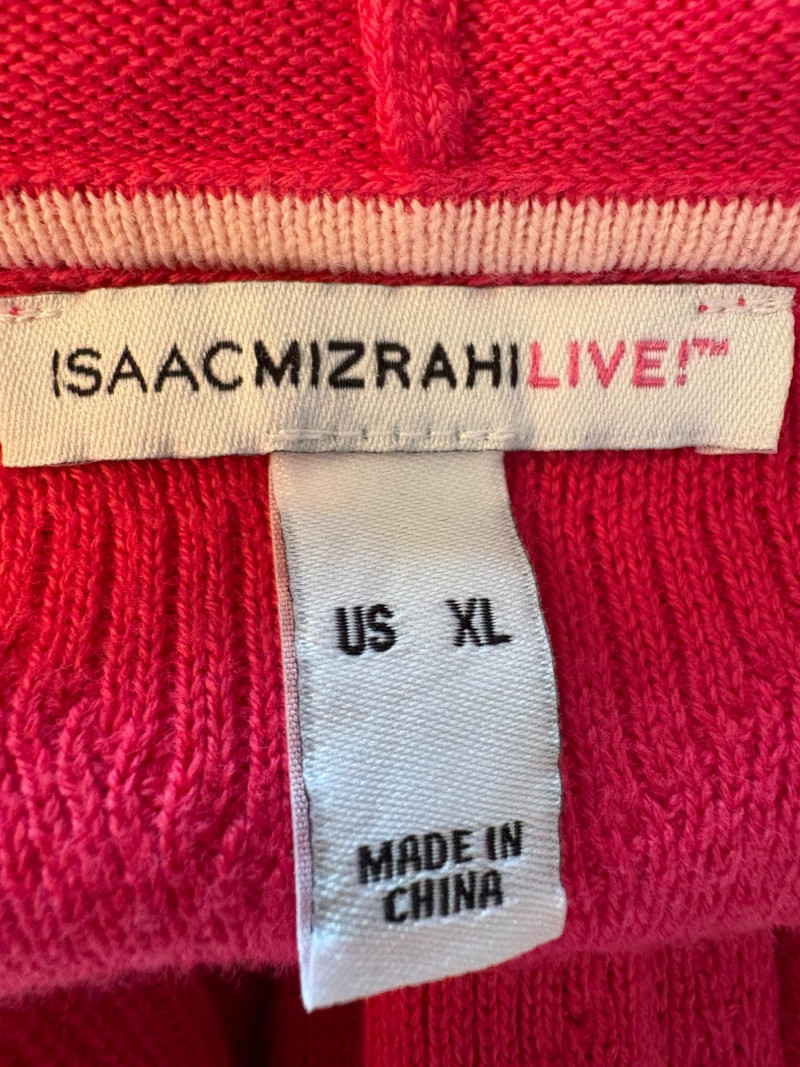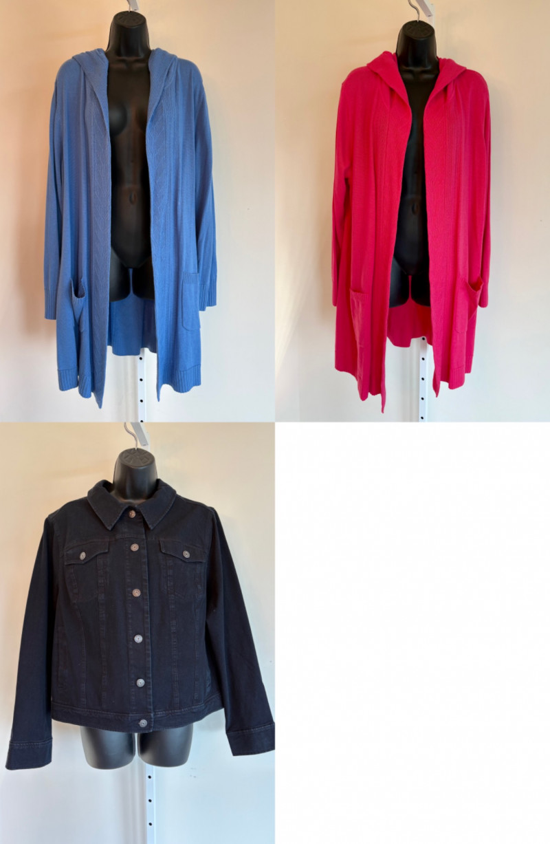 Three casual outerwear pieces from Isaac Mizrahi. All measure 22" pit to pit. 2 identical long sweaters in blue and pink. Both have open front, hood, front patch pockets, and split hem with decorative ribbing around the cuffs, bottom hem, and pocket tops. Additional decorative cable-like patterning runs down the front facing and the center back. Cotton/rayon blend is smooth and soft. Size tags say XL. Black stretch jeans jacket has classic styling with button front & cuffs, breast pockets, welted slash front pockets, and yoke. Cotton/polyester/spandex blend. Size tag says 18W.