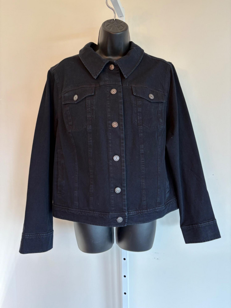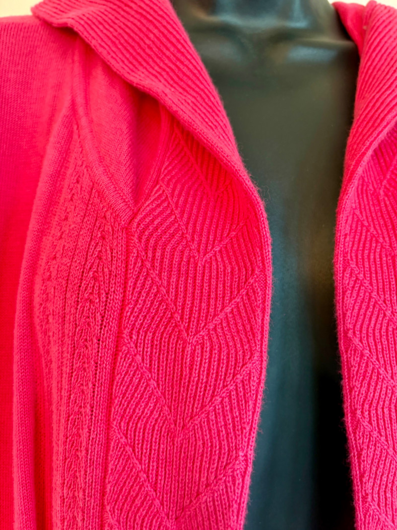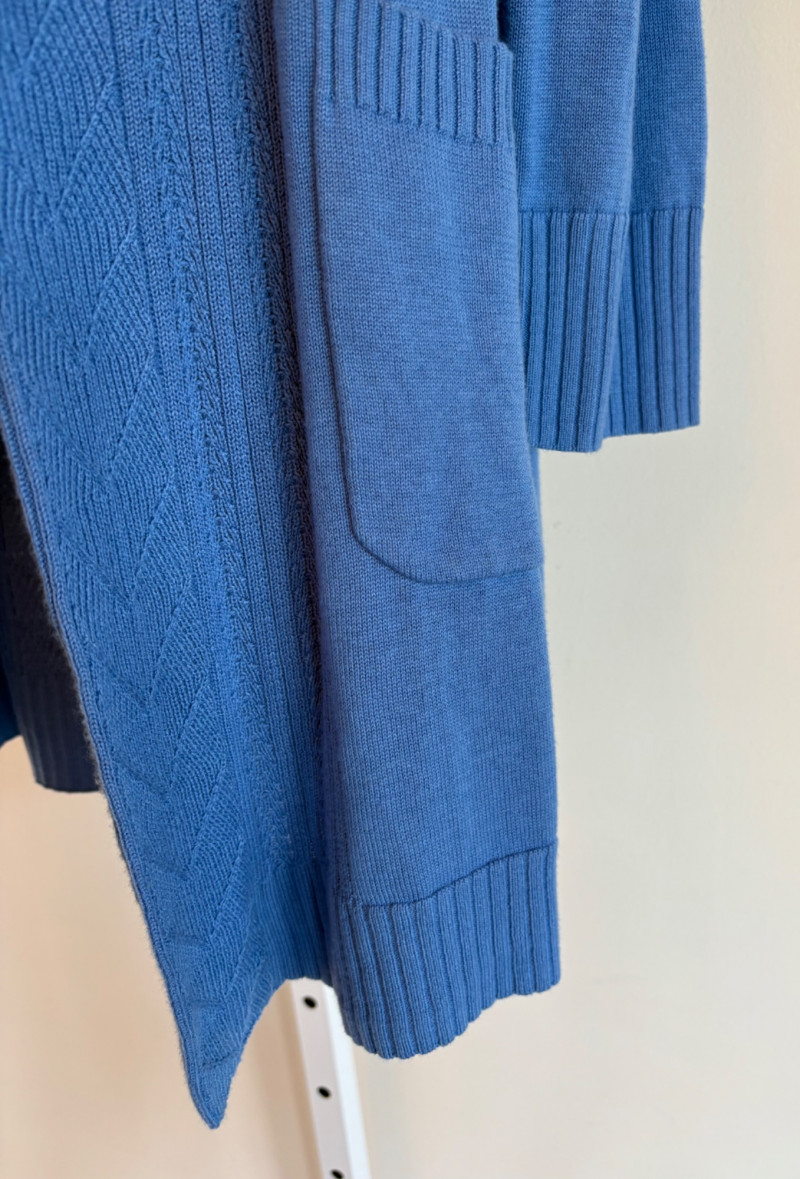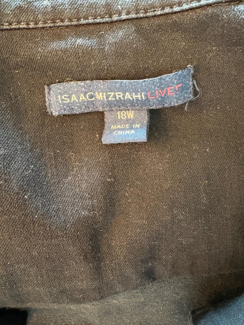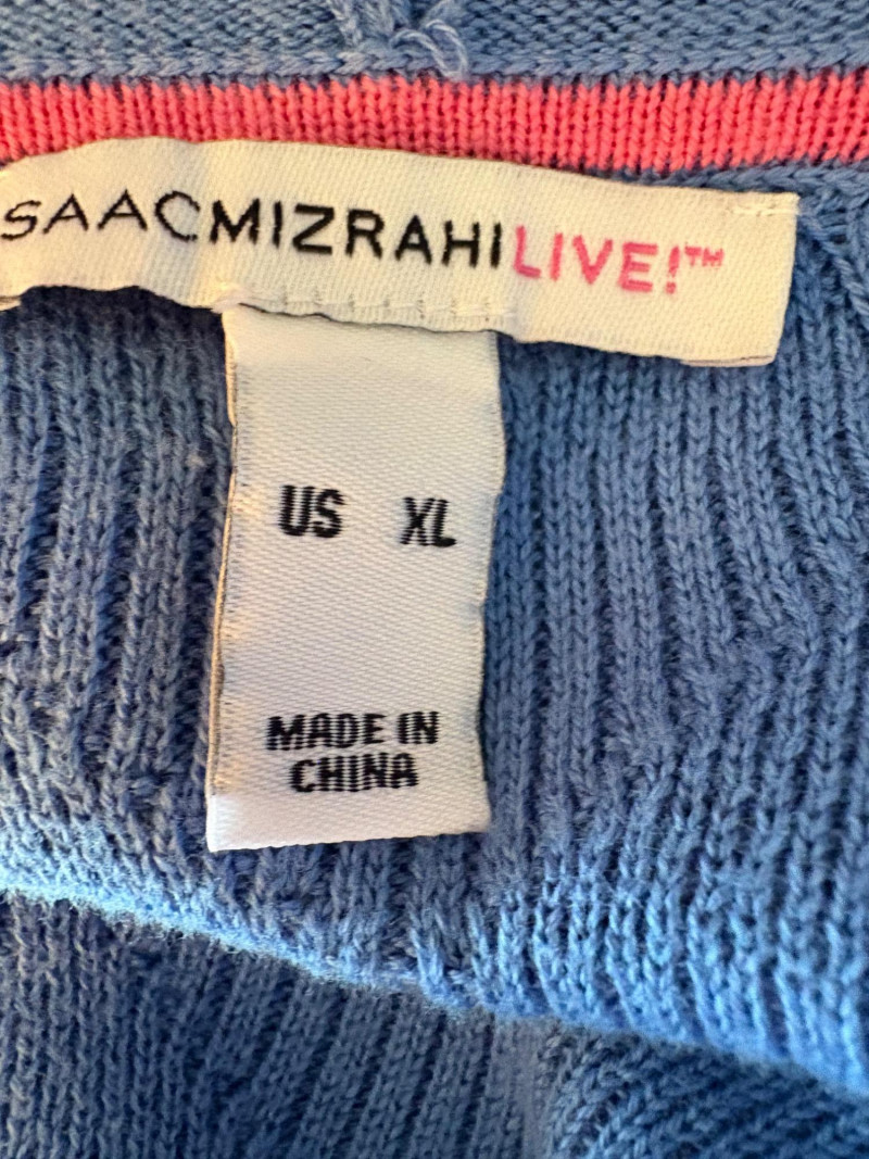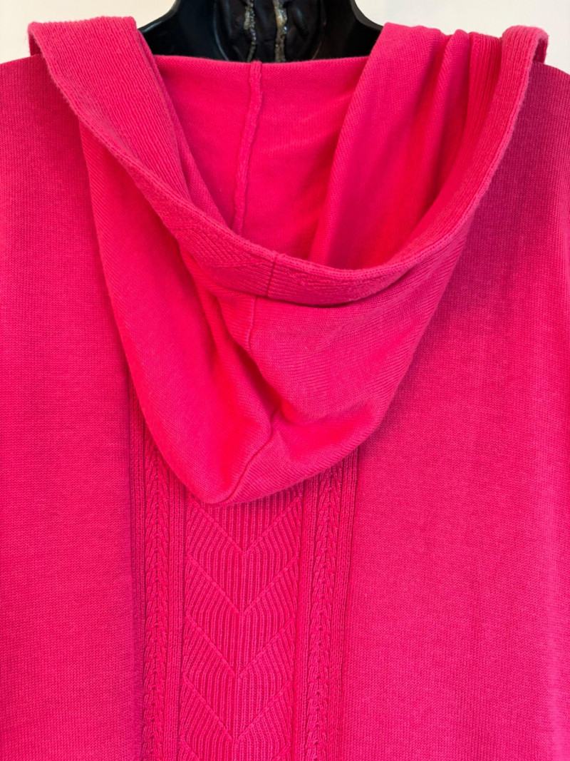 Three casual outerwear pieces from Isaac Mizrahi. All measure 22" pit to pit. 2 identical long sweaters in blue and pink. Both have open front, hood, front patch pockets, and split hem with decorative ribbing around the cuffs, bottom hem, and pocket tops. Additional decorative cable-like patterning runs down the front facing and the center back. Cotton/rayon blend is smooth and soft. Size tags say XL. Black stretch jeans jacket has classic styling with button front & cuffs, breast pockets, welted slash front pockets, and yoke. Cotton/polyester/spandex blend. Size tag says 18W.
