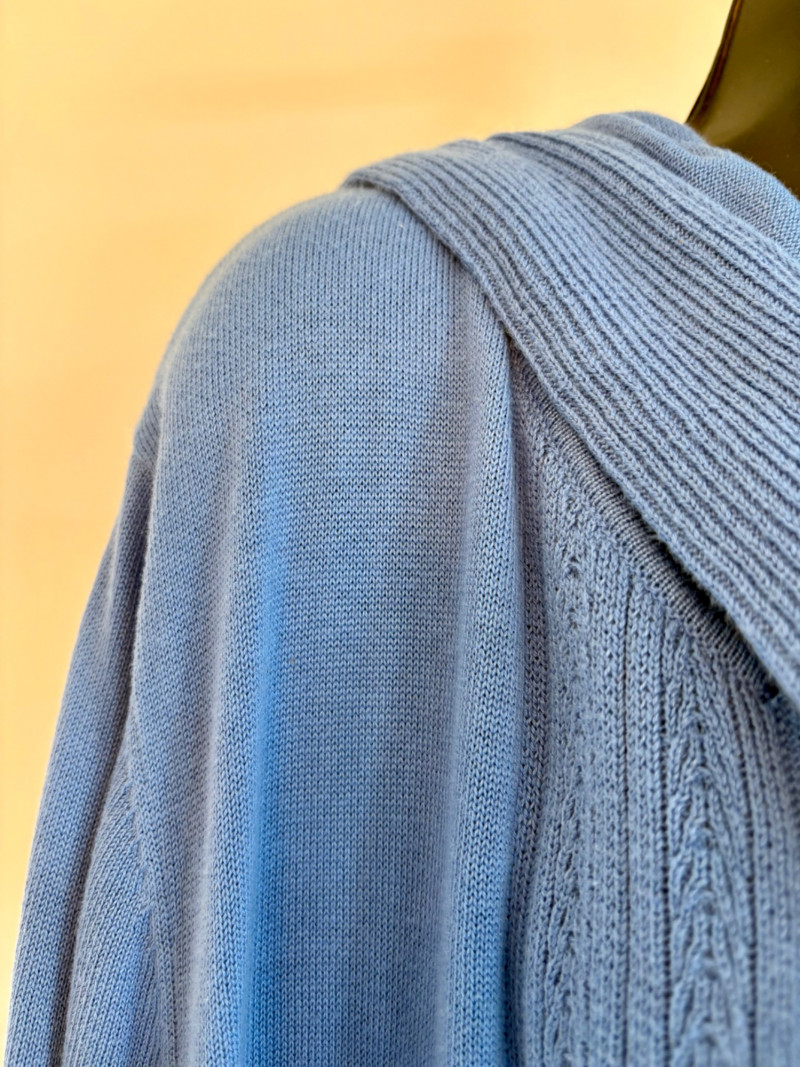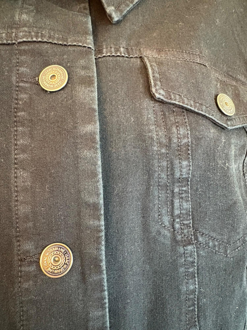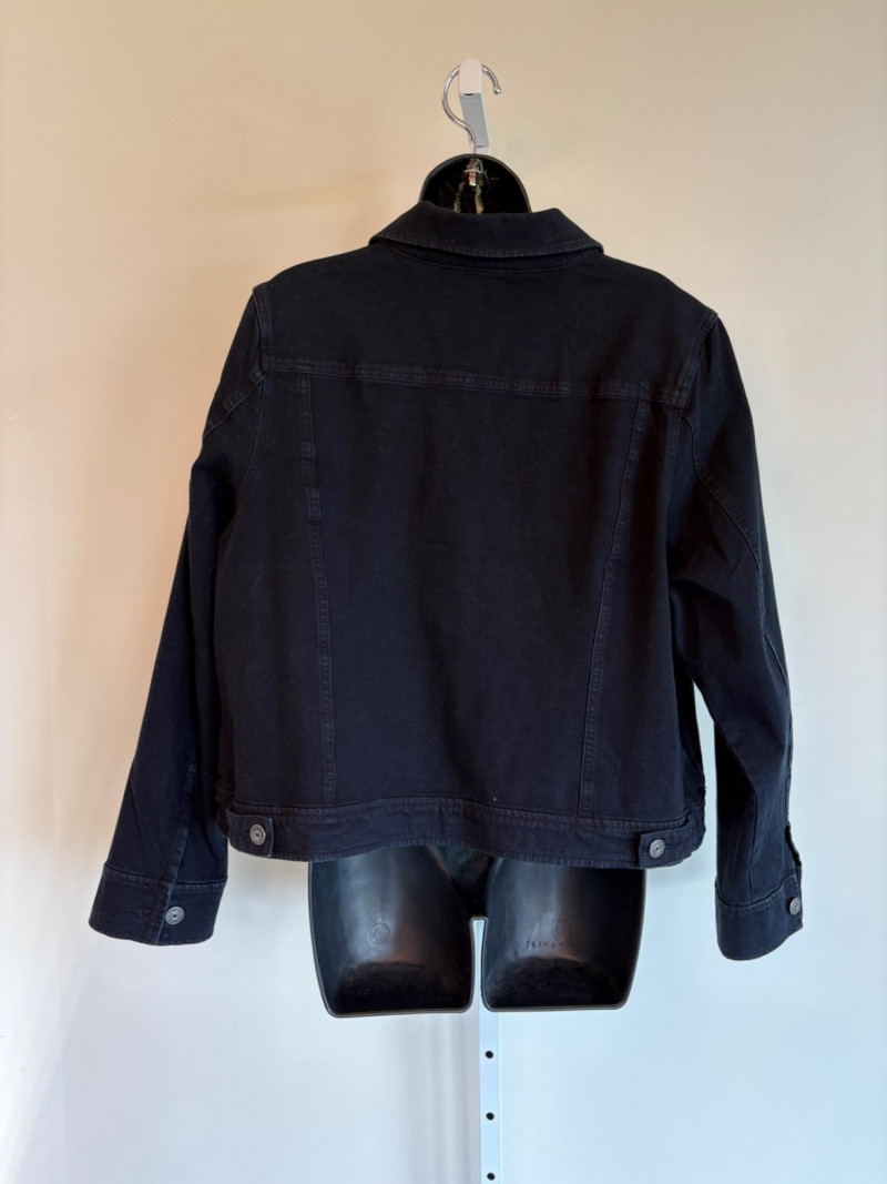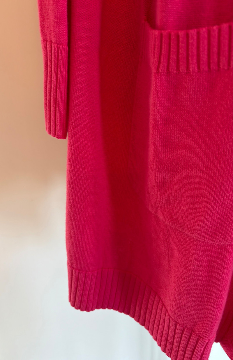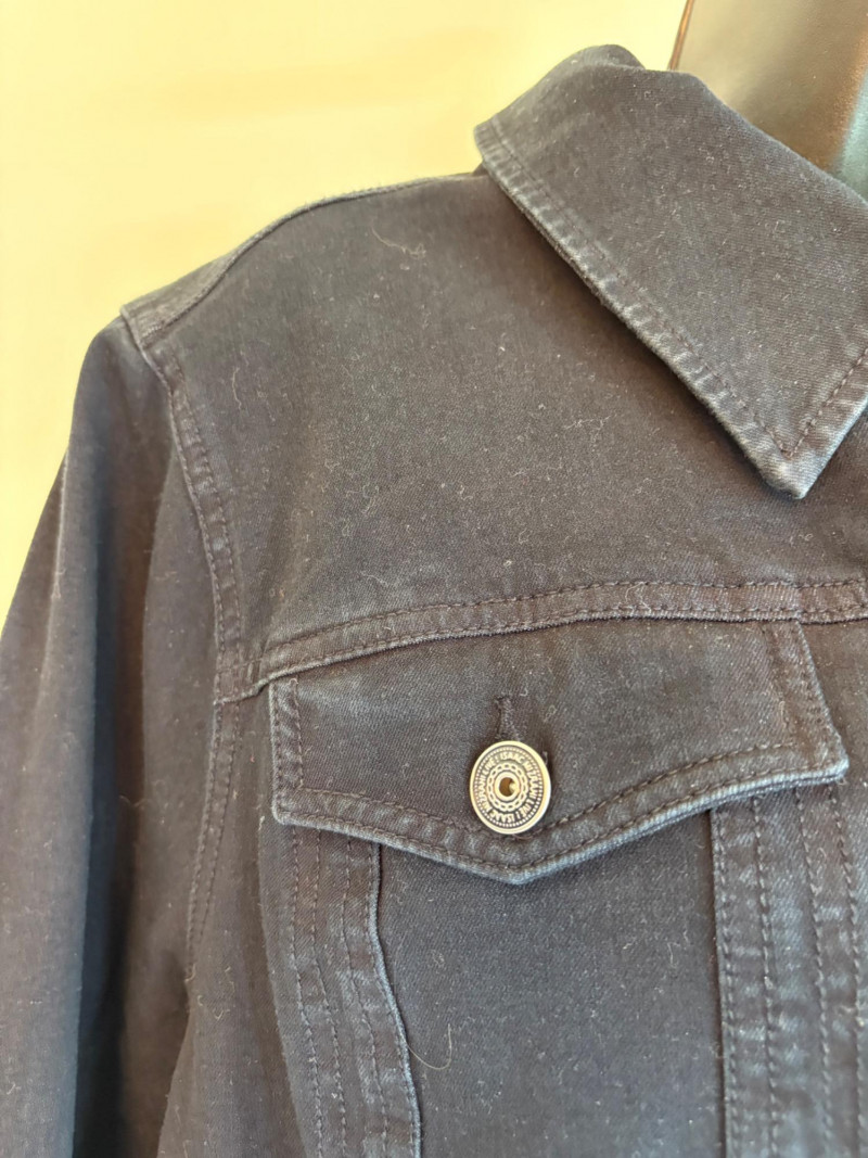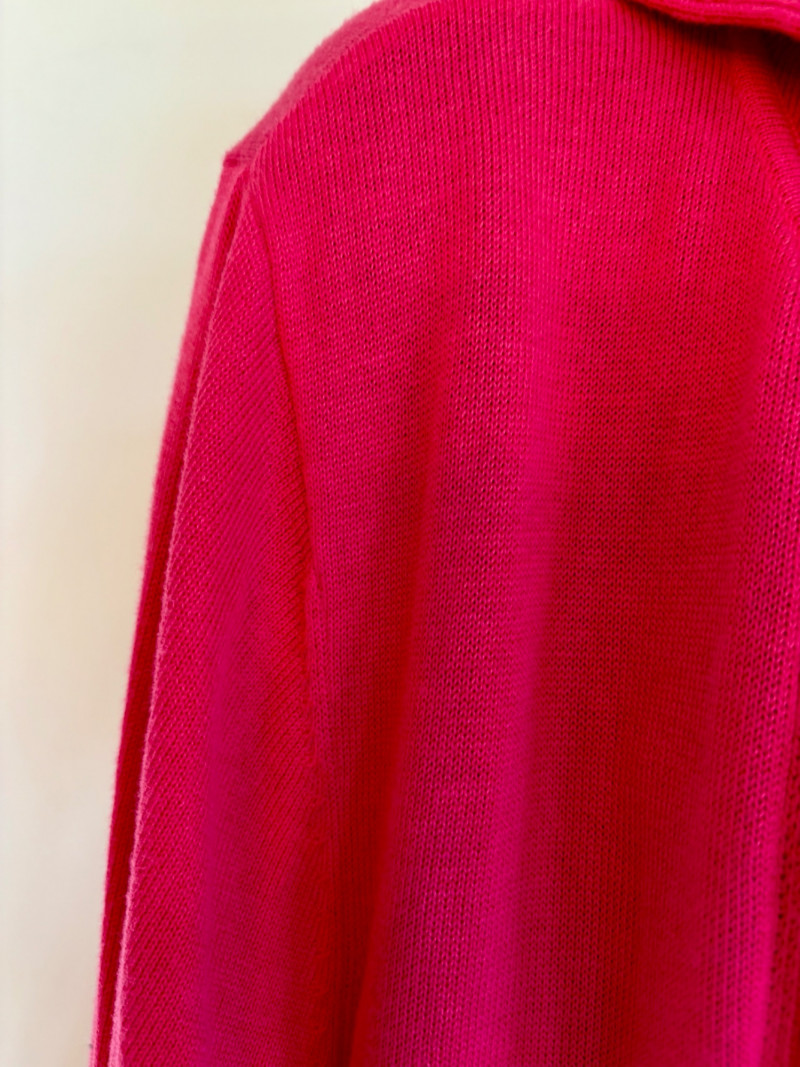 Three casual outerwear pieces from Isaac Mizrahi. All measure 22" pit to pit. 2 identical long sweaters in blue and pink. Both have open front, hood, front patch pockets, and split hem with decorative ribbing around the cuffs, bottom hem, and pocket tops. Additional decorative cable-like patterning runs down the front facing and the center back. Cotton/rayon blend is smooth and soft. Size tags say XL. Black stretch jeans jacket has classic styling with button front & cuffs, breast pockets, welted slash front pockets, and yoke. Cotton/polyester/spandex blend. Size tag says 18W.