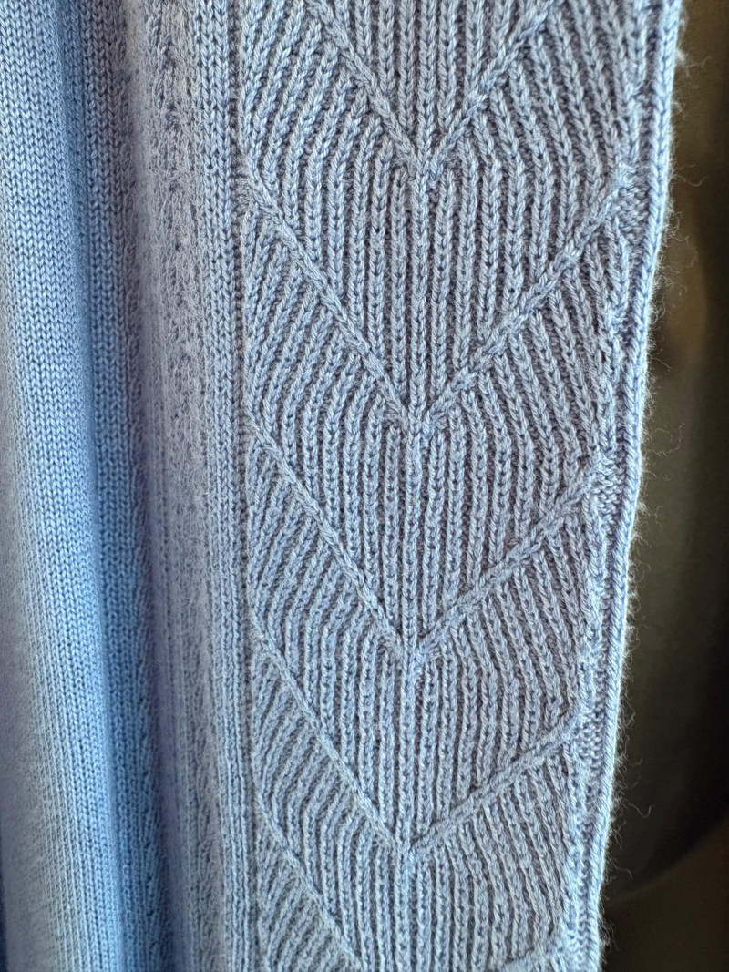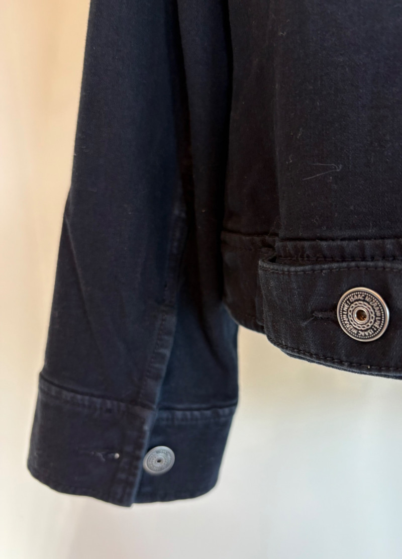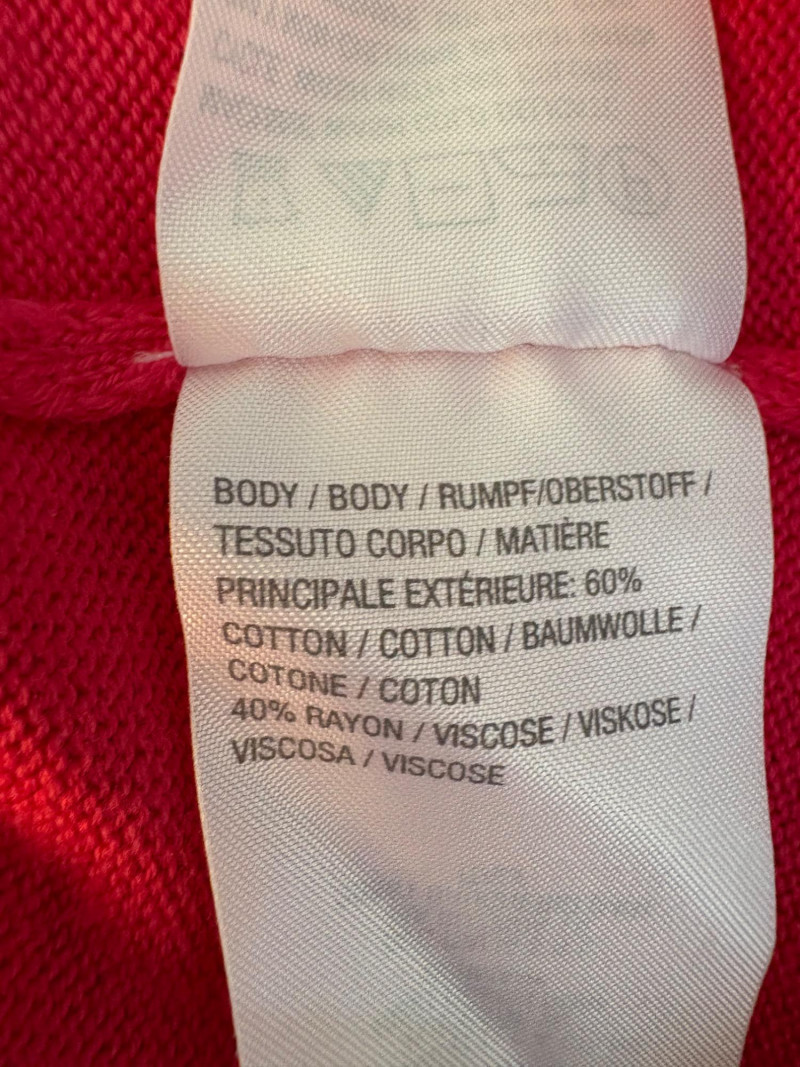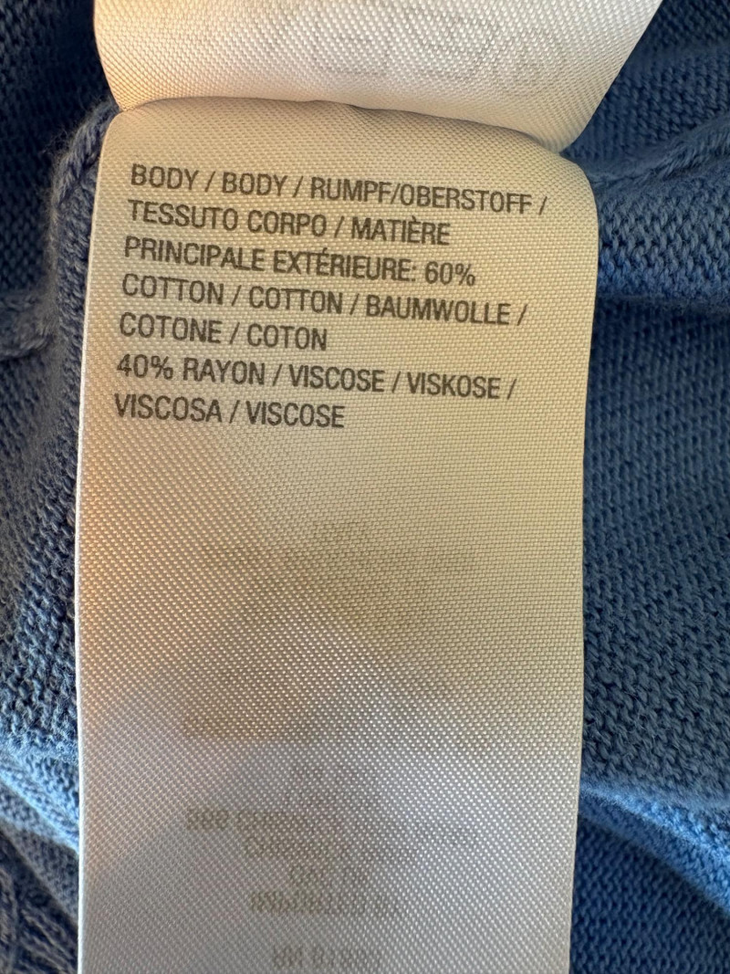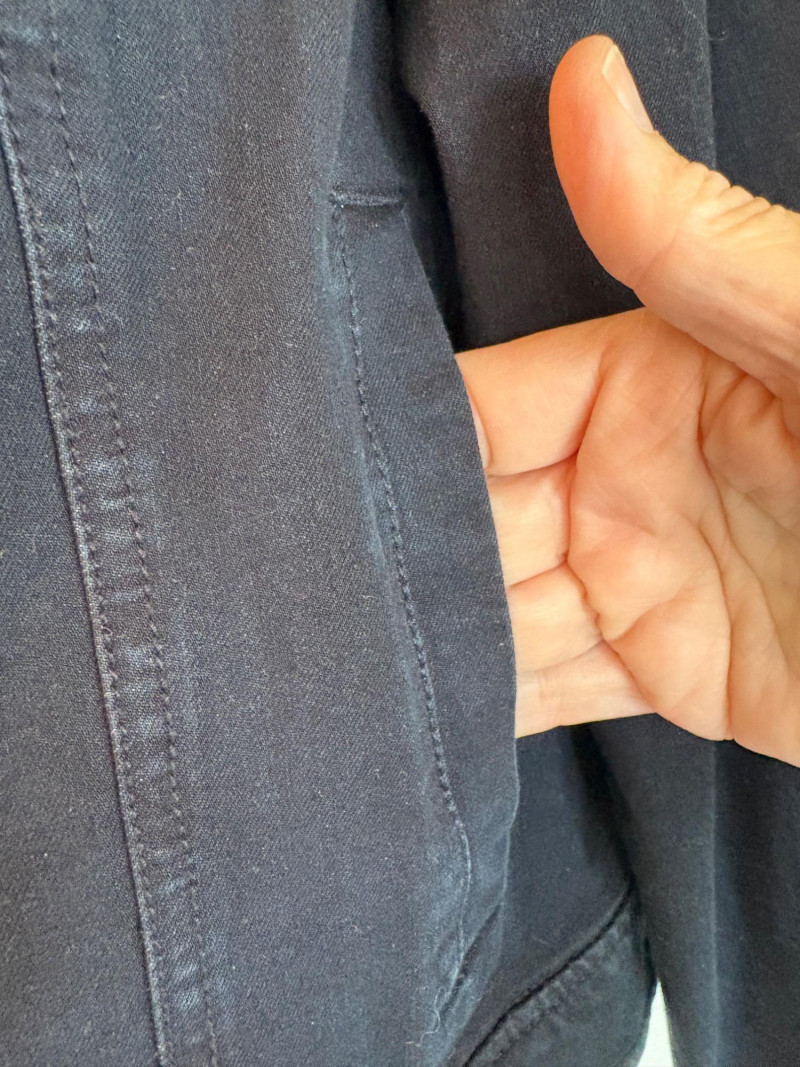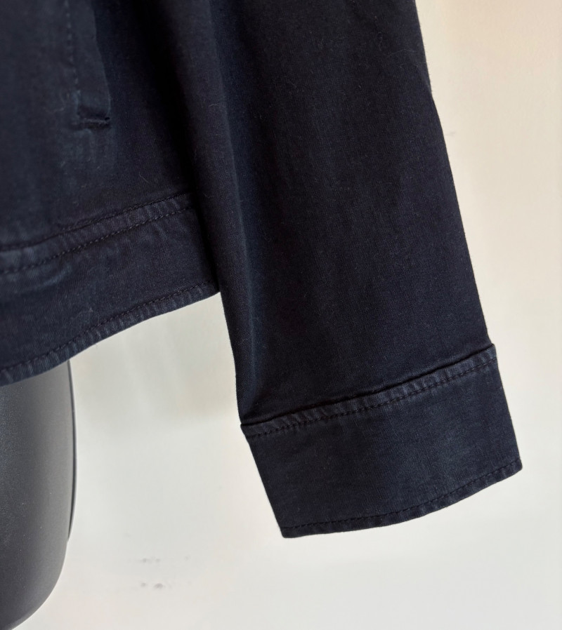 Three casual outerwear pieces from Isaac Mizrahi. All measure 22" pit to pit. 2 identical long sweaters in blue and pink. Both have open front, hood, front patch pockets, and split hem with decorative ribbing around the cuffs, bottom hem, and pocket tops. Additional decorative cable-like patterning runs down the front facing and the center back. Cotton/rayon blend is smooth and soft. Size tags say XL. Black stretch jeans jacket has classic styling with button front & cuffs, breast pockets, welted slash front pockets, and yoke. Cotton/polyester/spandex blend. Size tag says 18W.