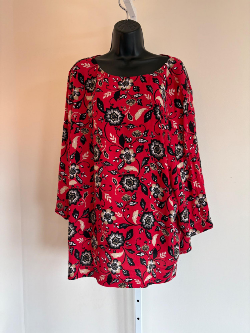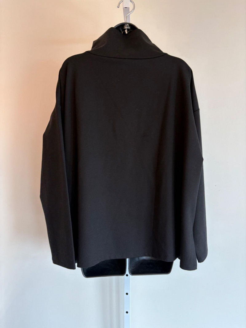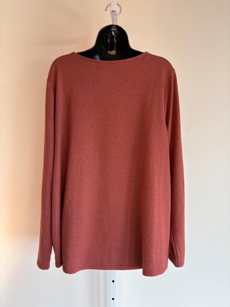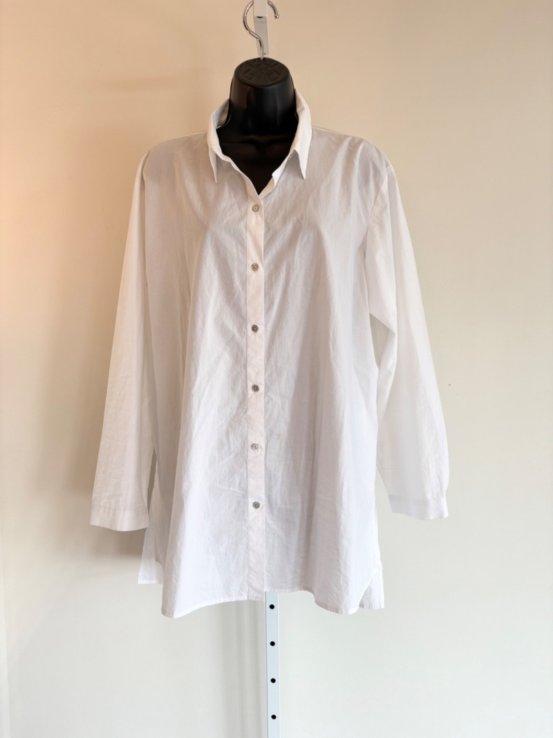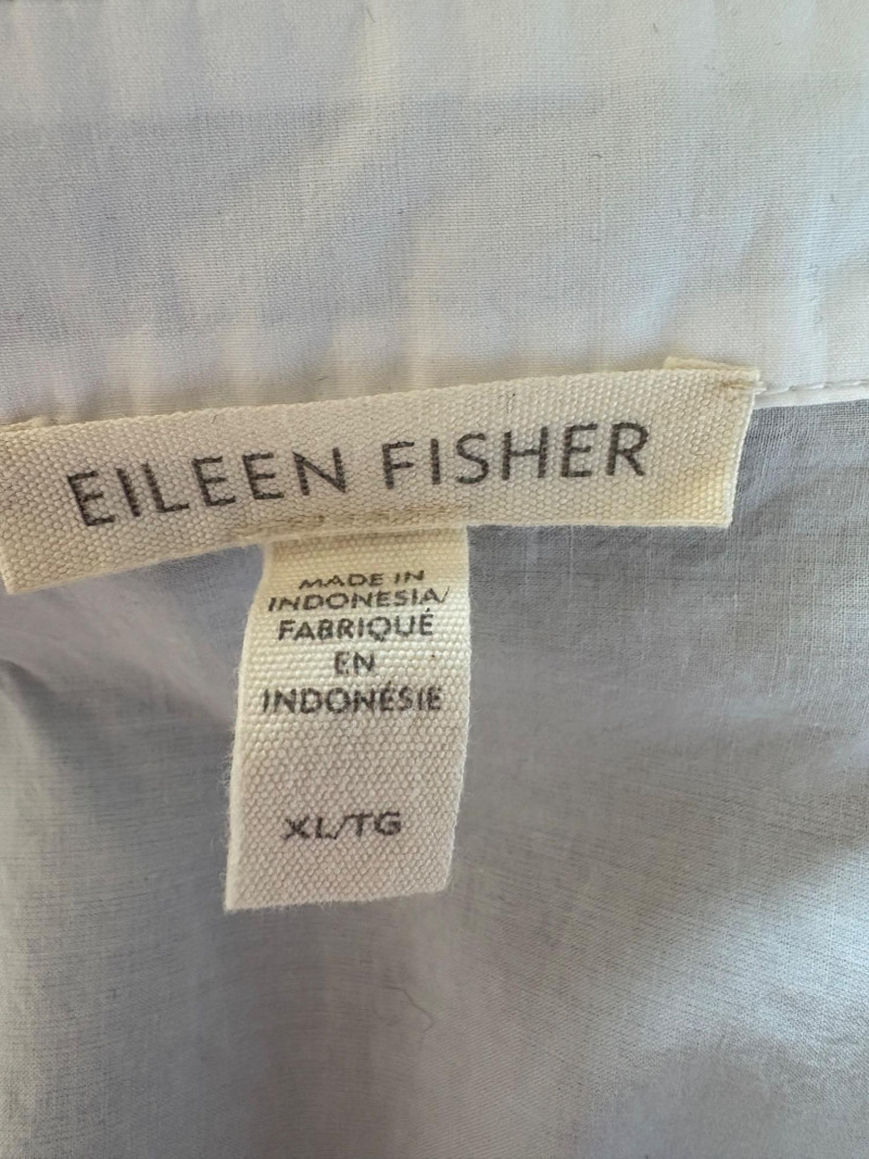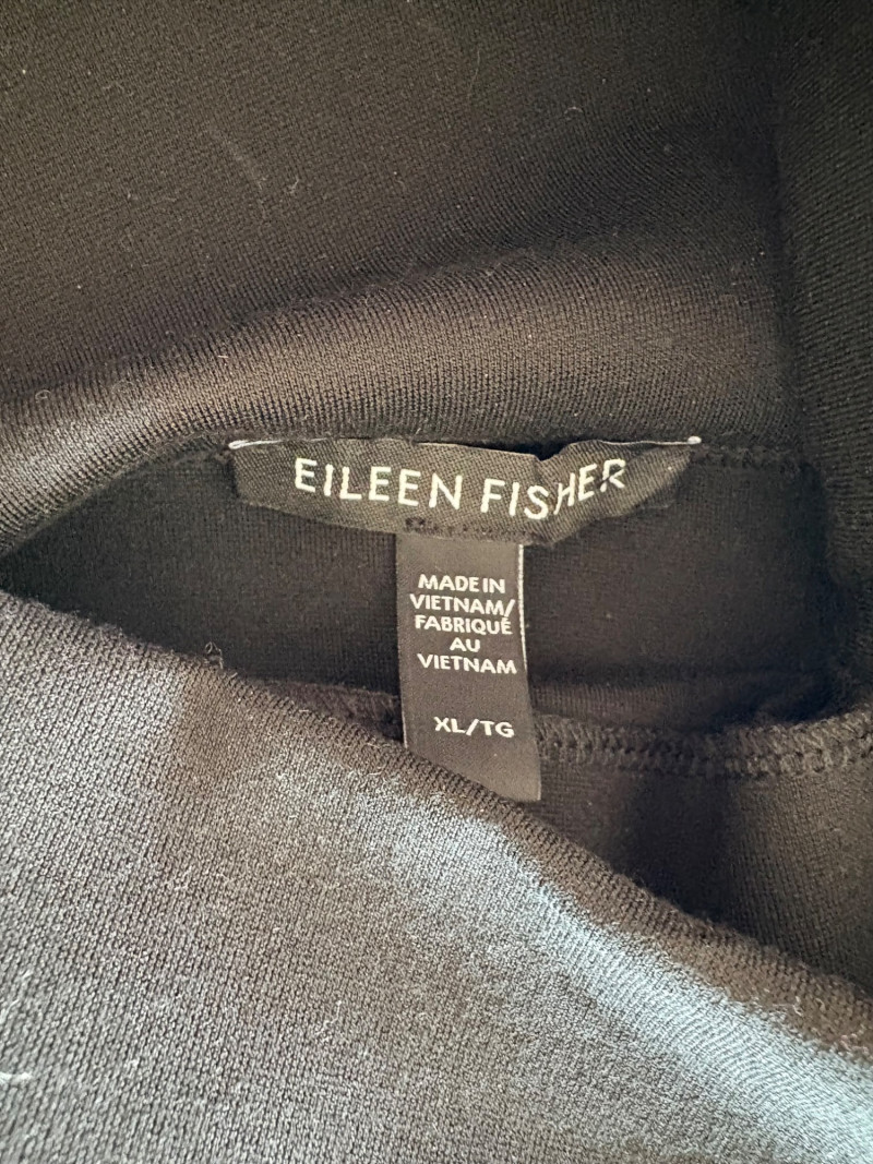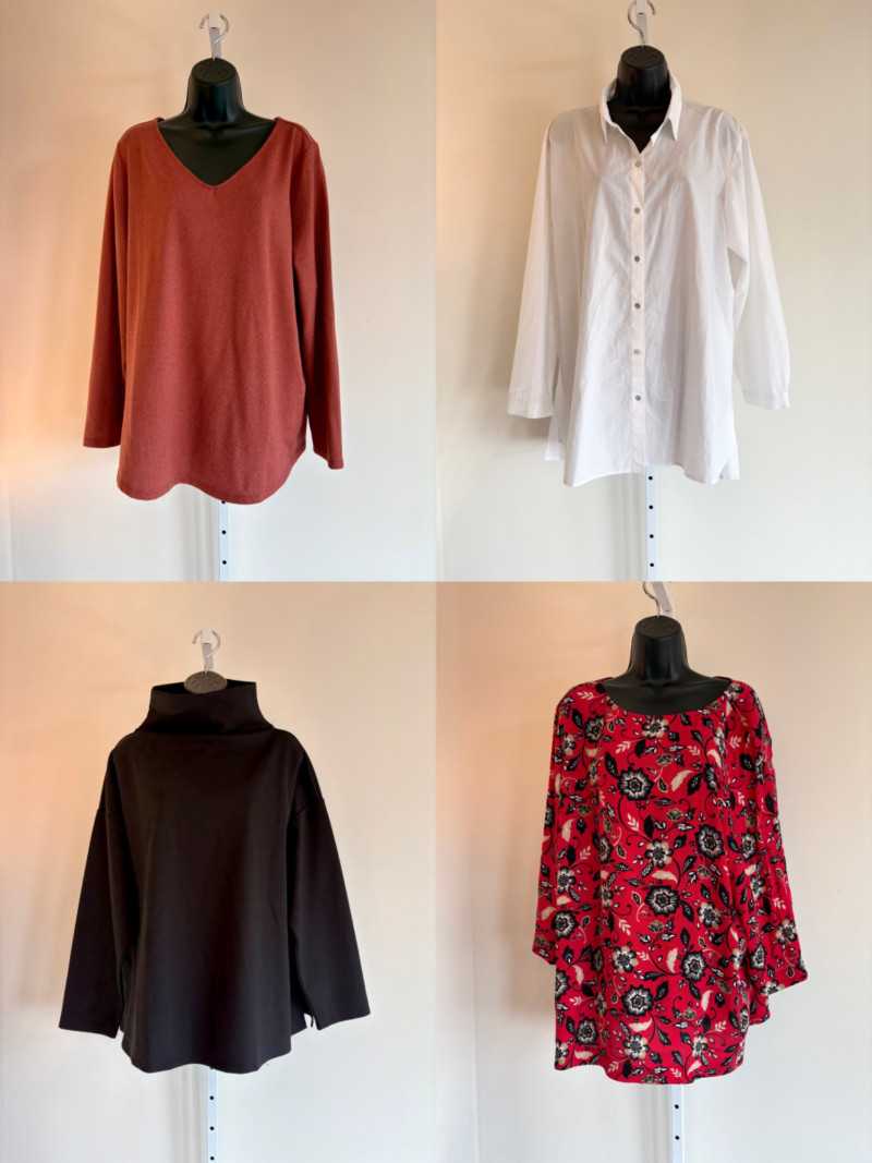 4 tops for Fall. All measure between 25" - 25.5" pit to pit. Orange-brown heavy knit shirt from Belle has long sleeves and V-neck. Polyester/spandex blend. Size tag says XL. Black ponte funnel neck top from Eileen Fisher has dropped shoulder seams, split hem, and long sleeves. Tencel Lyocell/nylon/elastane blend. Size tag says XL. Classically styled white "big shirt" in poplin from Eileen Fisher has button front closure, button cuffs, back yoke with pleat, and split hem with back lower than front. 100% organic cotton. Size tag says XL. Note there is a small discoloration on the left front near the buttons - see last photo - may launder out with stain remover. Bright floral patterned shirt from J. Jill has 3/4 sleeves, curved neckline with back button closure, and split hem. 100% viscose. Size tag says XL.