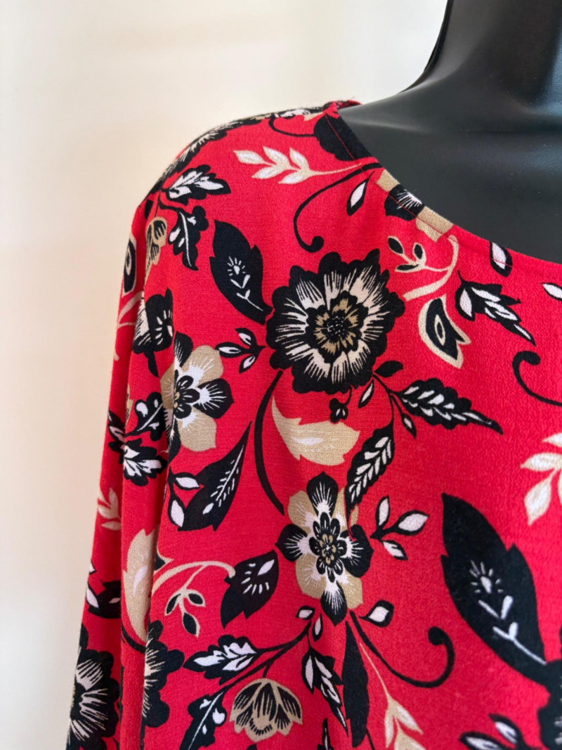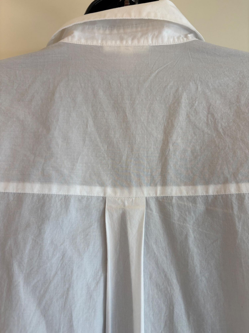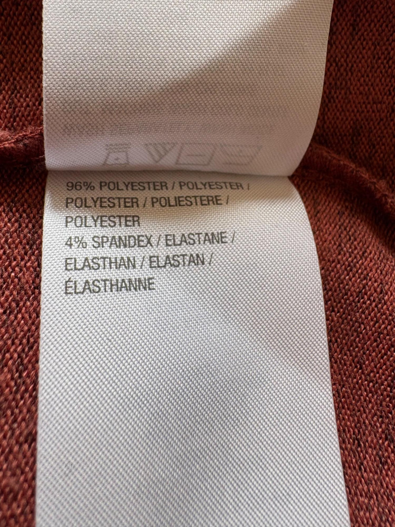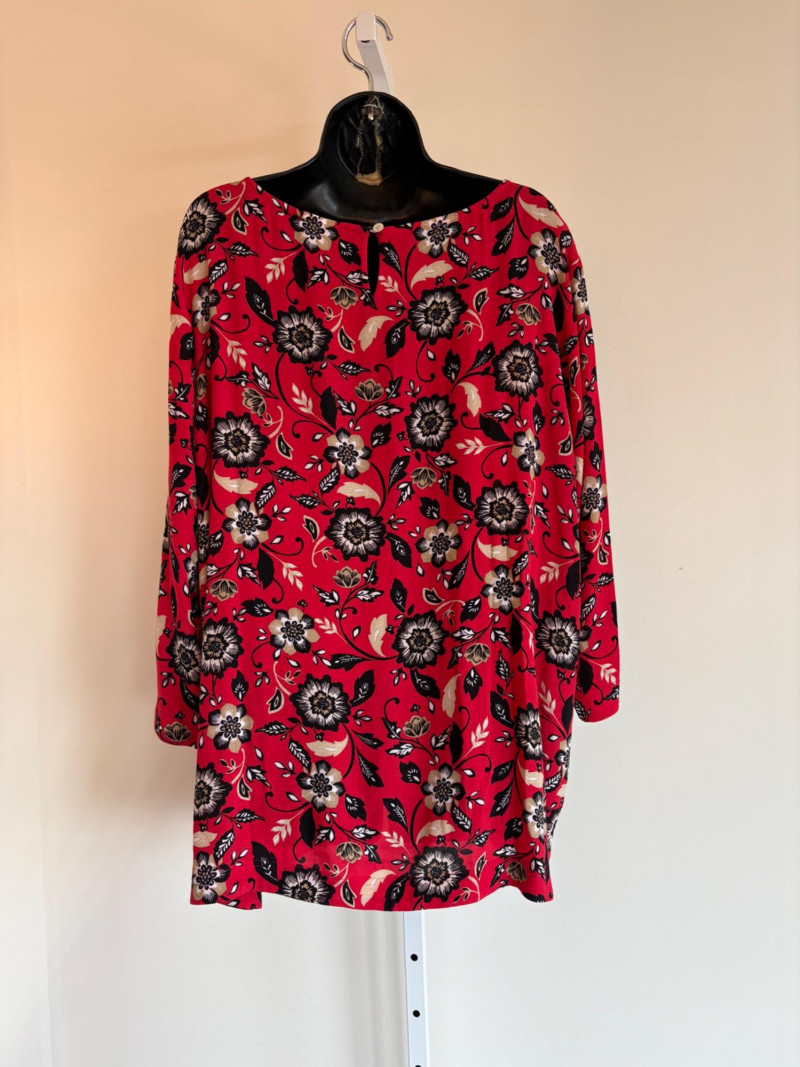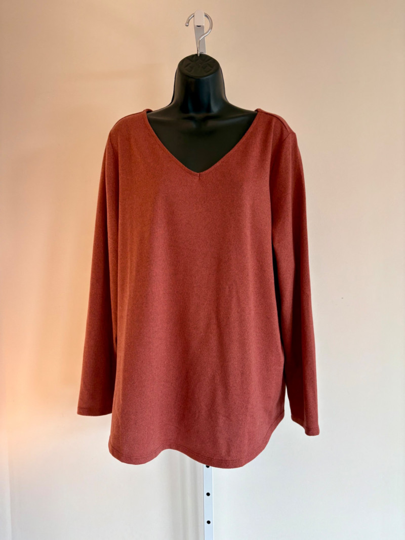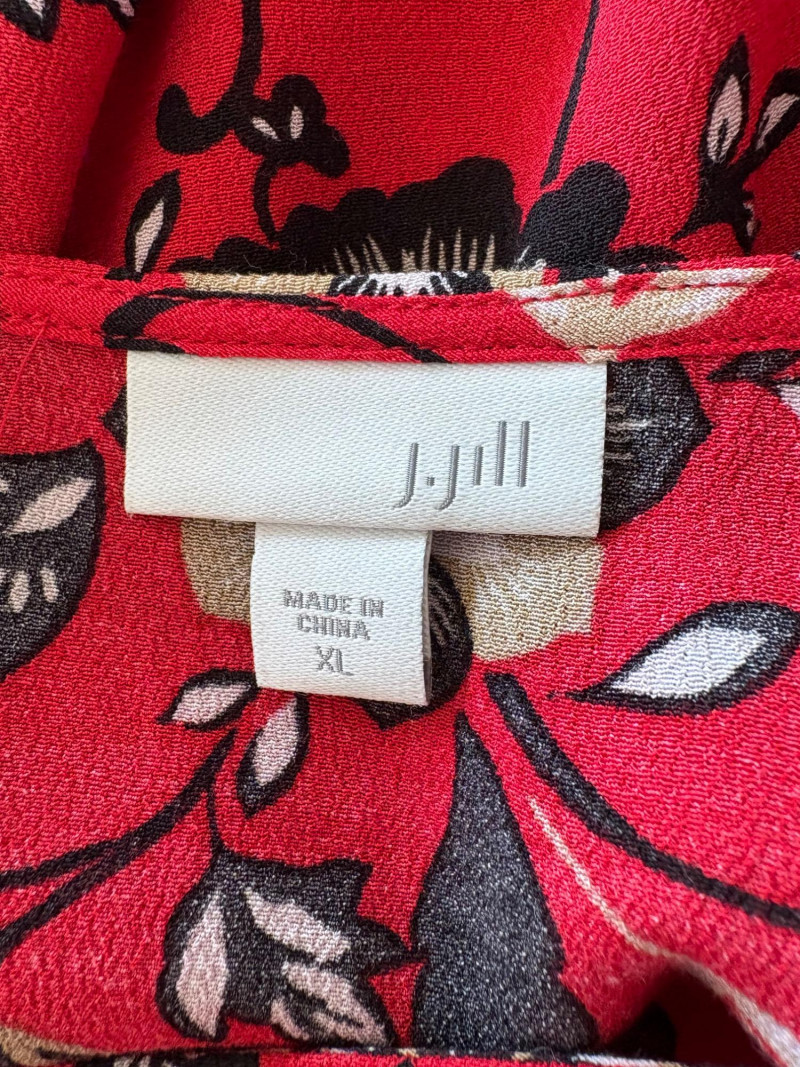 4 tops for Fall. All measure between 25" - 25.5" pit to pit. Orange-brown heavy knit shirt from Belle has long sleeves and V-neck. Polyester/spandex blend. Size tag says XL. Black ponte funnel neck top from Eileen Fisher has dropped shoulder seams, split hem, and long sleeves. Tencel Lyocell/nylon/elastane blend. Size tag says XL. Classically styled white "big shirt" in poplin from Eileen Fisher has button front closure, button cuffs, back yoke with pleat, and split hem with back lower than front. 100% organic cotton. Size tag says XL. Note there is a small discoloration on the left front near the buttons - see last photo - may launder out with stain remover. Bright floral patterned shirt from J. Jill has 3/4 sleeves, curved neckline with back button closure, and split hem. 100% viscose. Size tag says XL.
