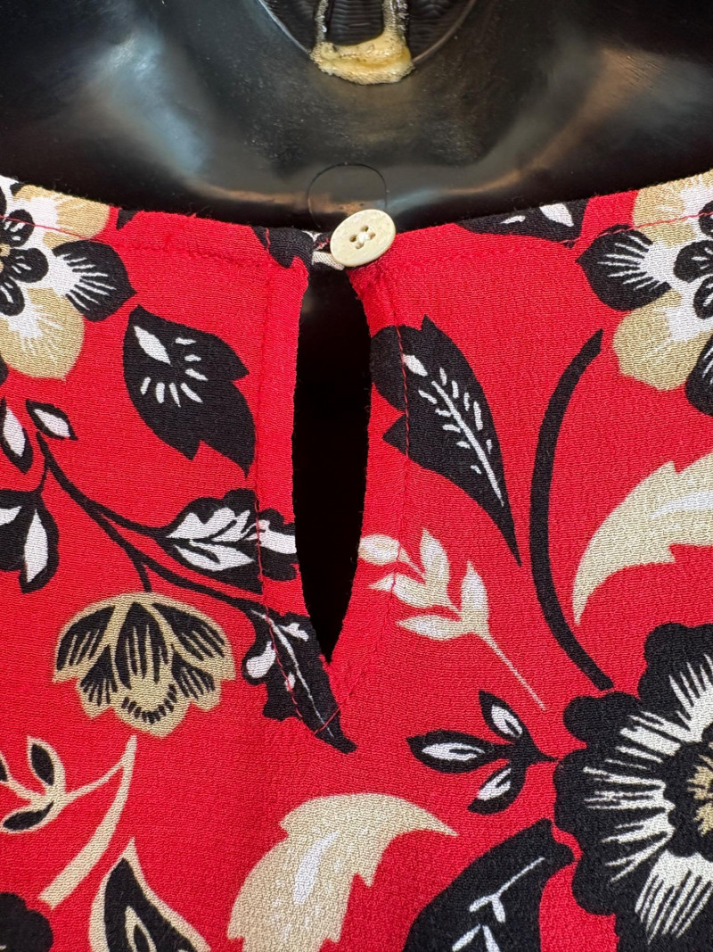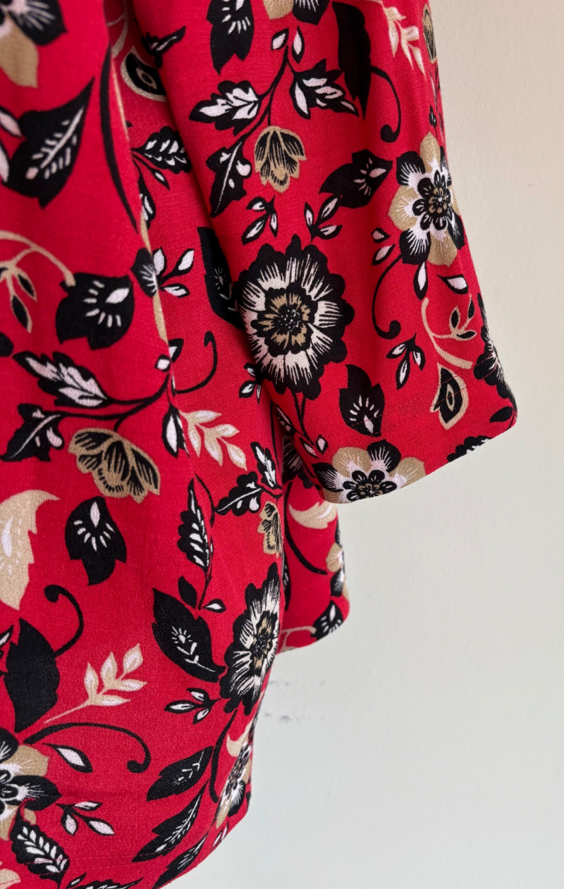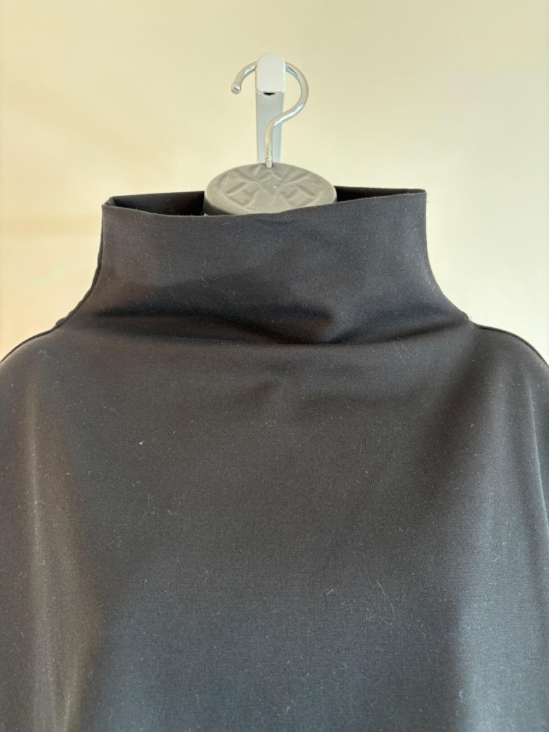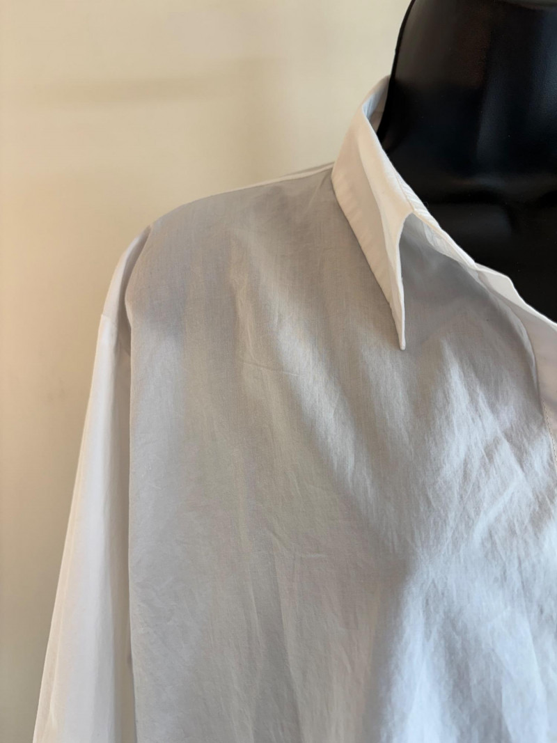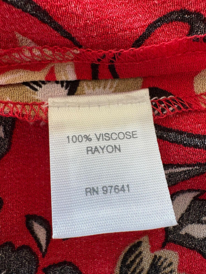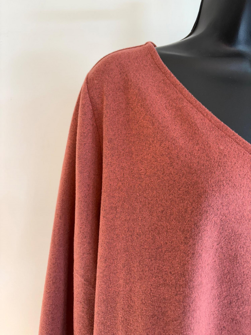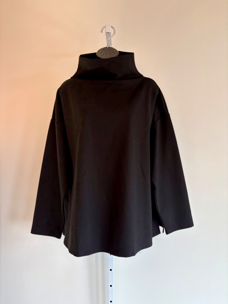 4 tops for Fall. All measure between 25" - 25.5" pit to pit. Orange-brown heavy knit shirt from Belle has long sleeves and V-neck. Polyester/spandex blend. Size tag says XL. Black ponte funnel neck top from Eileen Fisher has dropped shoulder seams, split hem, and long sleeves. Tencel Lyocell/nylon/elastane blend. Size tag says XL. Classically styled white "big shirt" in poplin from Eileen Fisher has button front closure, button cuffs, back yoke with pleat, and split hem with back lower than front. 100% organic cotton. Size tag says XL. Note there is a small discoloration on the left front near the buttons - see last photo - may launder out with stain remover. Bright floral patterned shirt from J. Jill has 3/4 sleeves, curved neckline with back button closure, and split hem. 100% viscose. Size tag says XL.