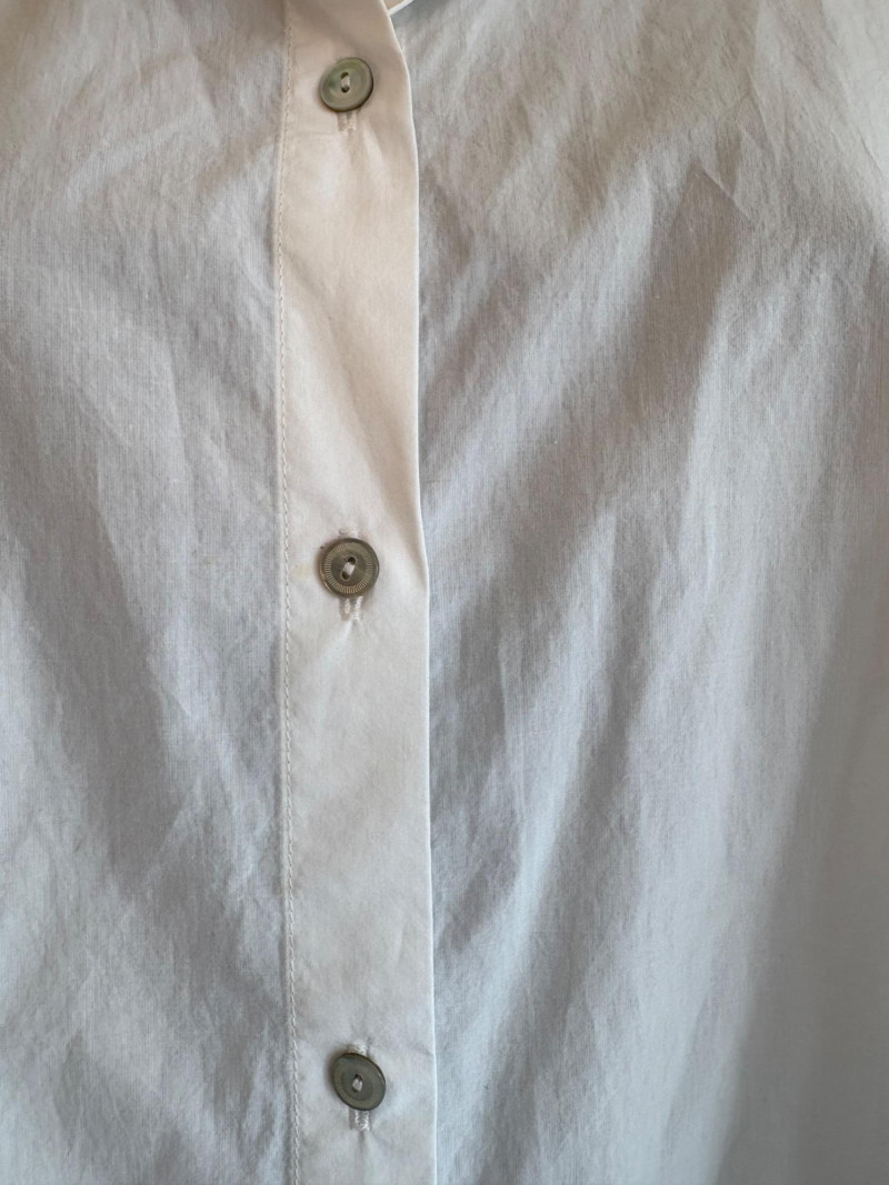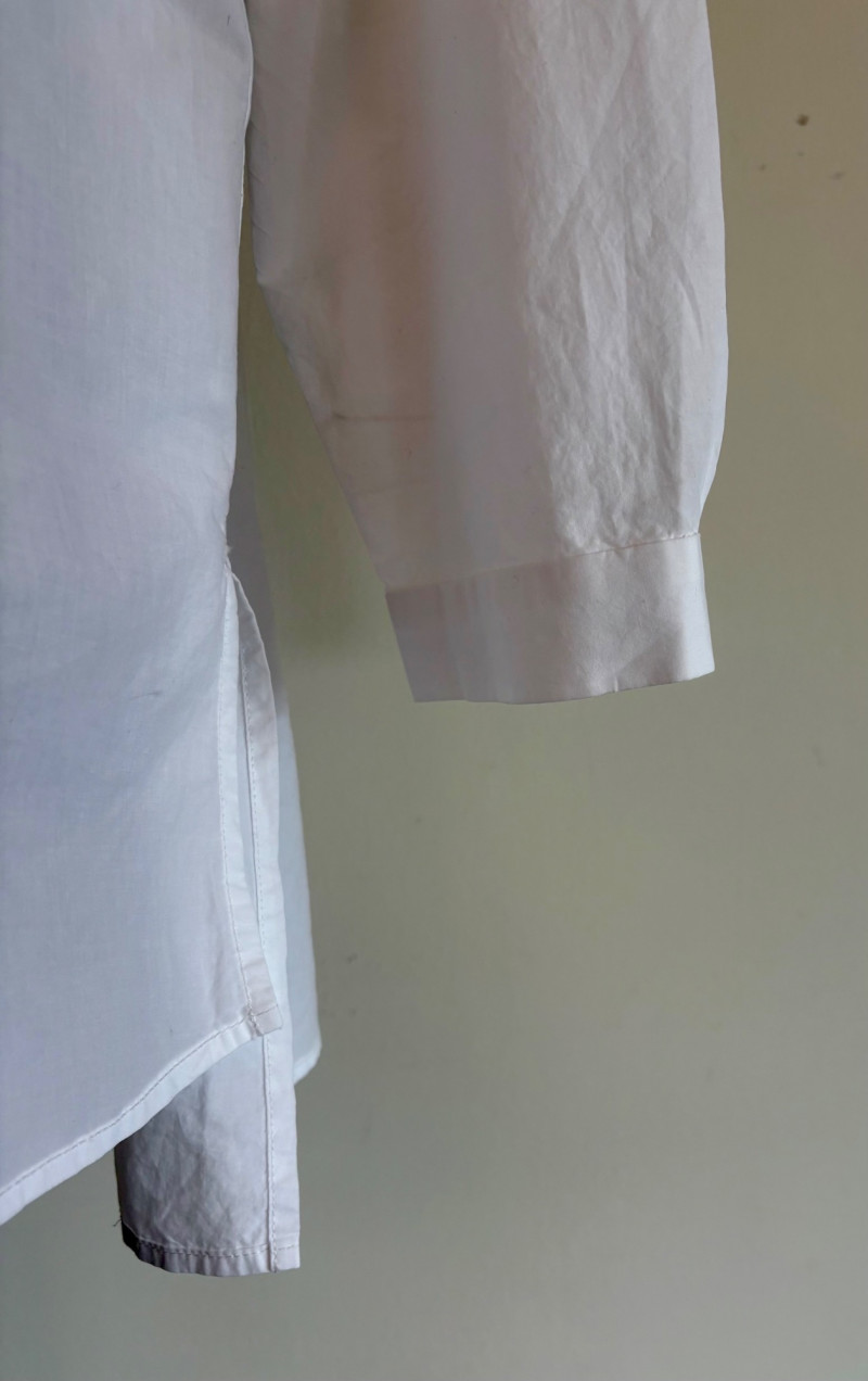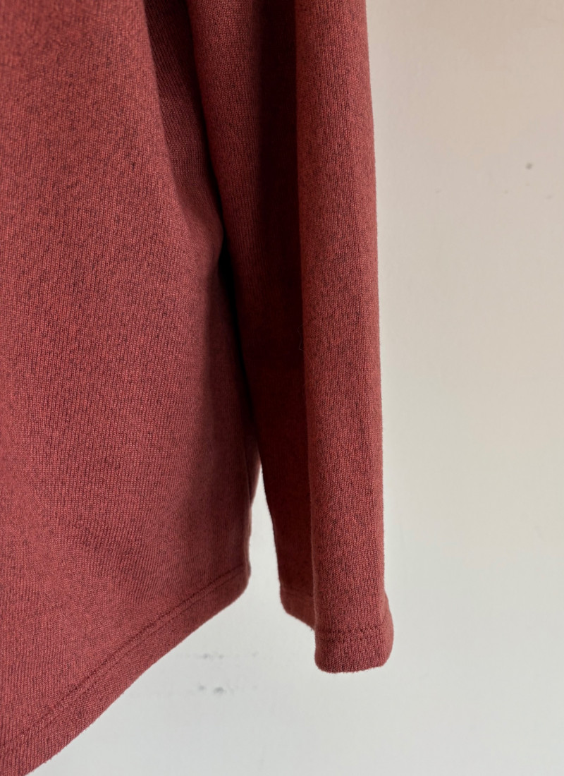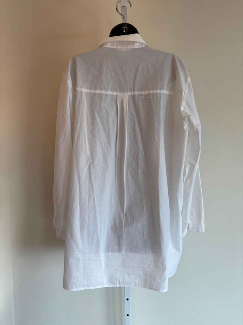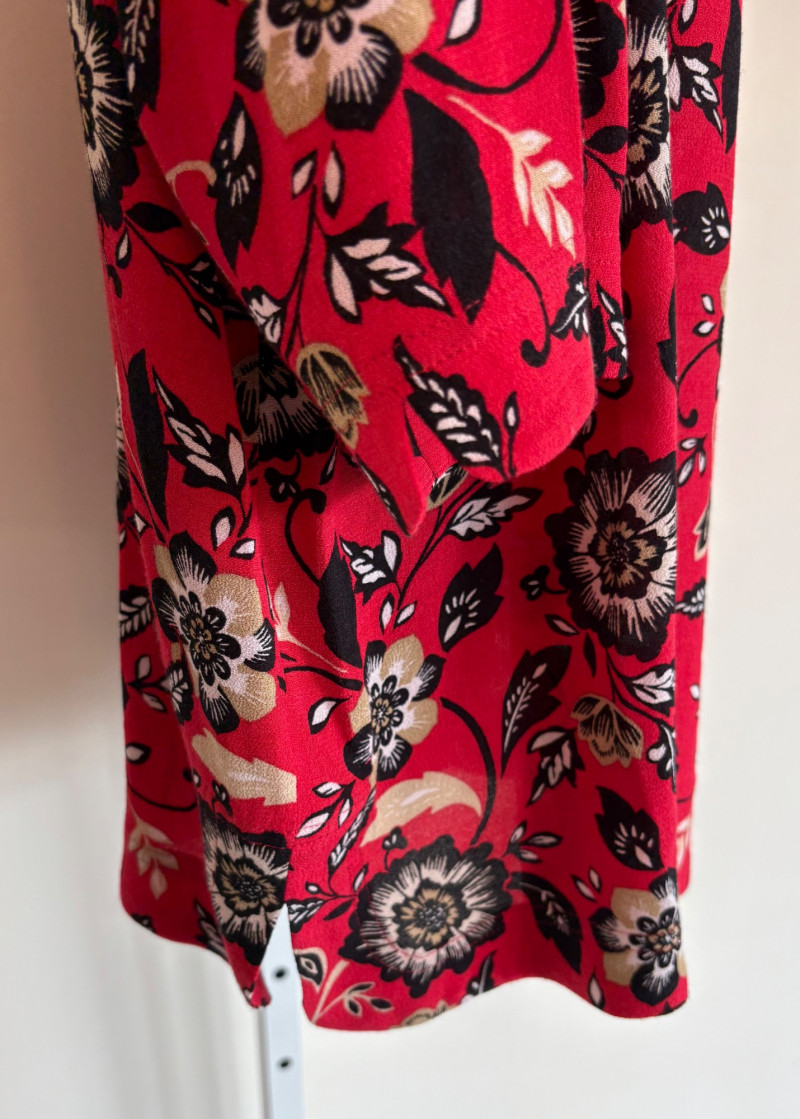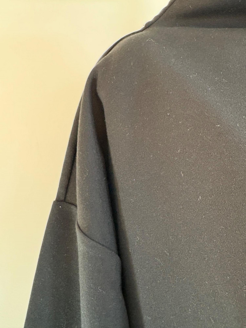 4 tops for Fall. All measure between 25" - 25.5" pit to pit. Orange-brown heavy knit shirt from Belle has long sleeves and V-neck. Polyester/spandex blend. Size tag says XL. Black ponte funnel neck top from Eileen Fisher has dropped shoulder seams, split hem, and long sleeves. Tencel Lyocell/nylon/elastane blend. Size tag says XL. Classically styled white "big shirt" in poplin from Eileen Fisher has button front closure, button cuffs, back yoke with pleat, and split hem with back lower than front. 100% organic cotton. Size tag says XL. Note there is a small discoloration on the left front near the buttons - see last photo - may launder out with stain remover. Bright floral patterned shirt from J. Jill has 3/4 sleeves, curved neckline with back button closure, and split hem. 100% viscose. Size tag says XL.