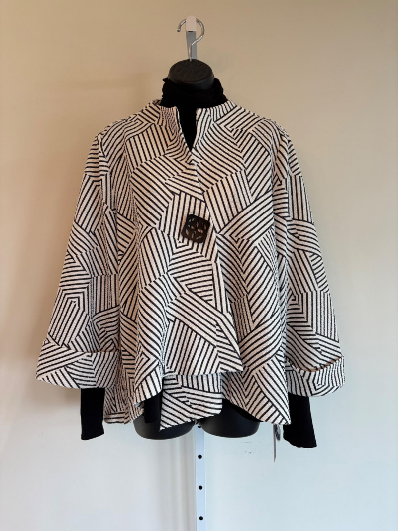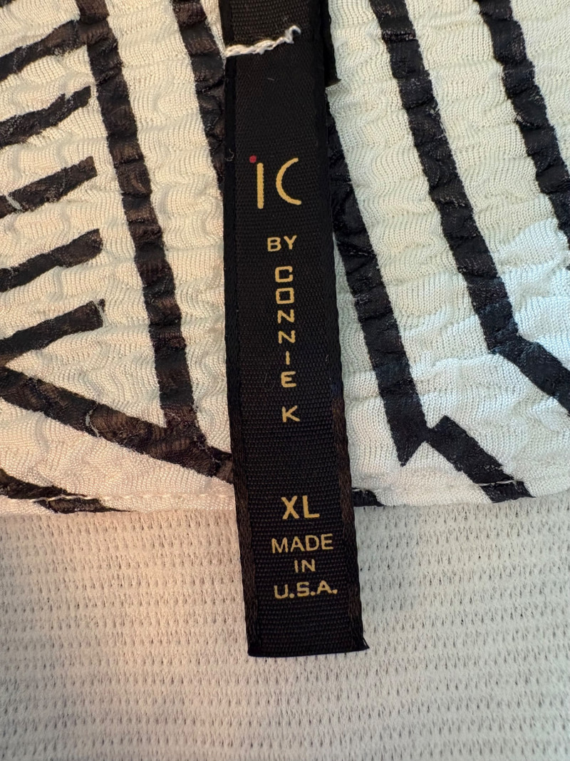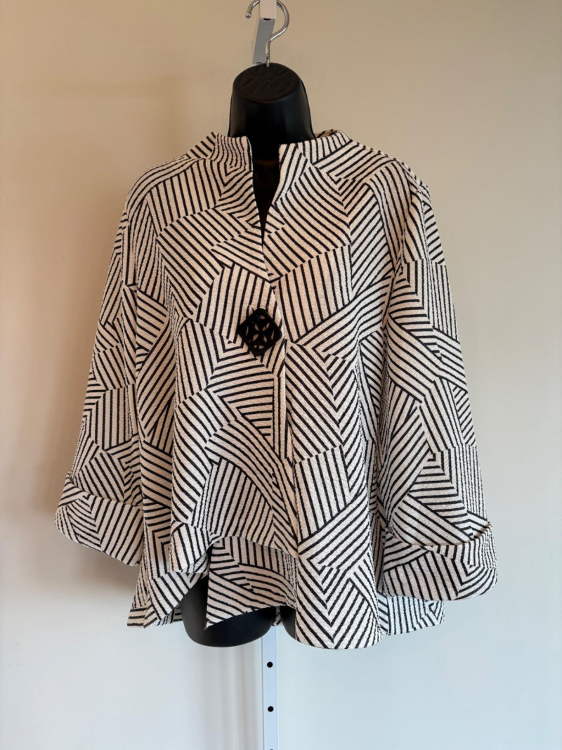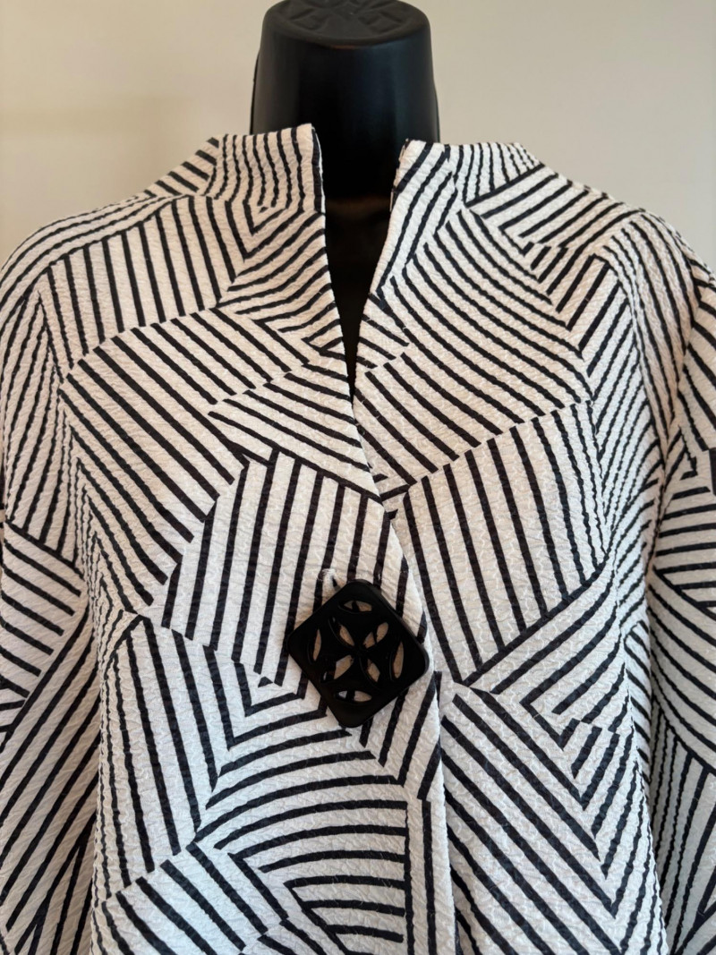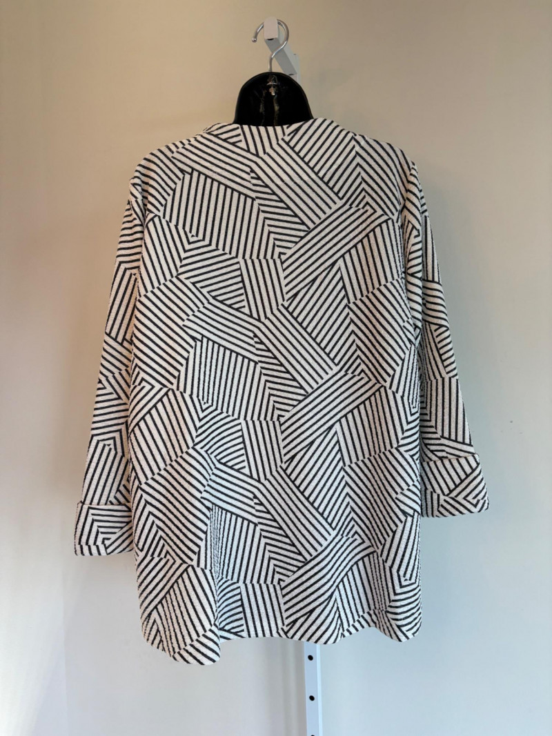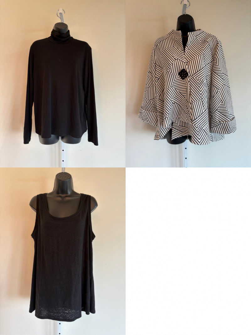 Two black tops from Eileen Fisher that pair beautifully with an IC Connie blazer. Black super thin long-sleeved turtleneck from Eileen Fisher is 100% silk. Measures 23" pit to pit. Size tag says XL. Black curved neck shell from Eileen Fisher is 100% organic cotton. Measures 22.5" pit to pit. Size tag says 1X. Black & white geometric jacket from IC Connie has modified funnel neck, single button front closure, roll cuff sleeves, flared cut, and an asymmetrical hem. New with tag. Polyester/spandex blend. Size tag says XL.