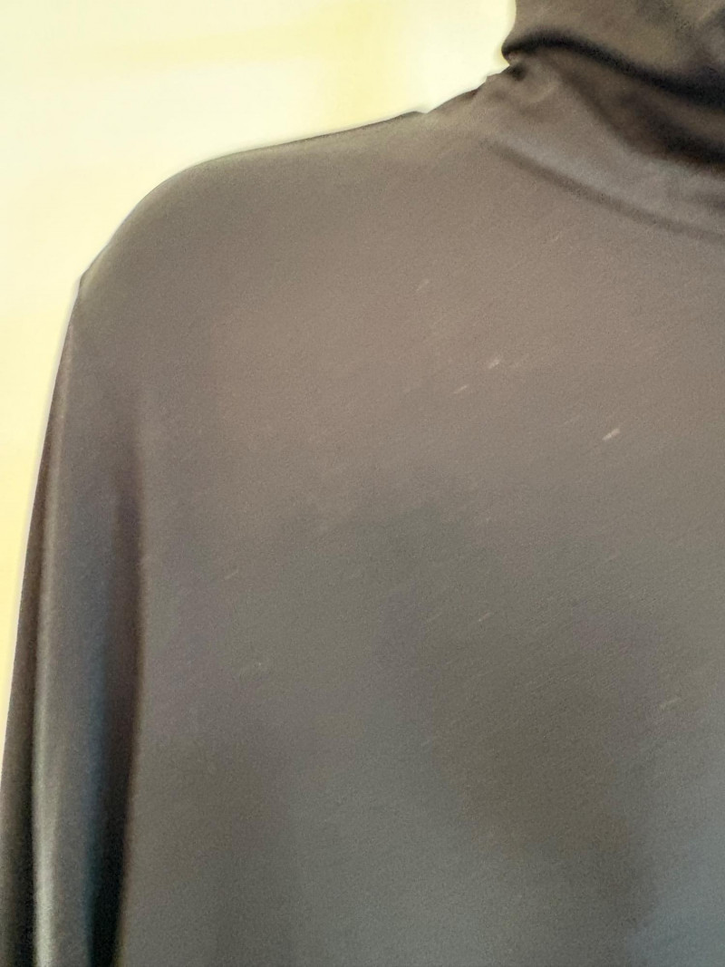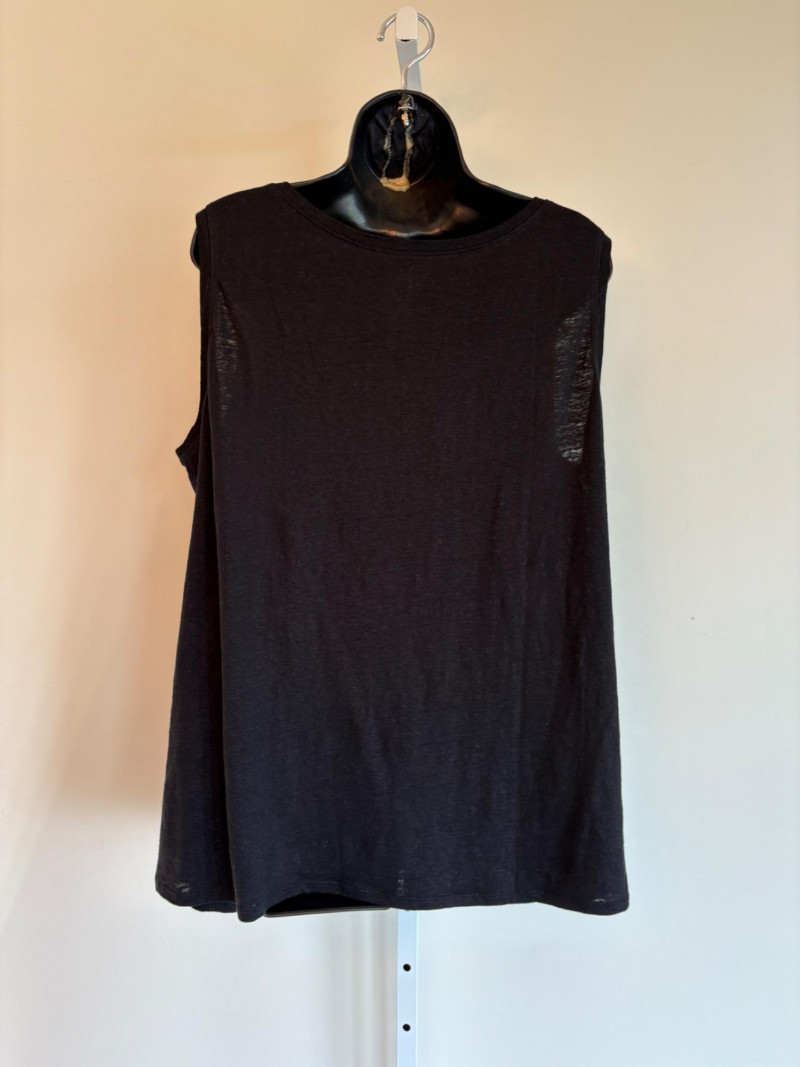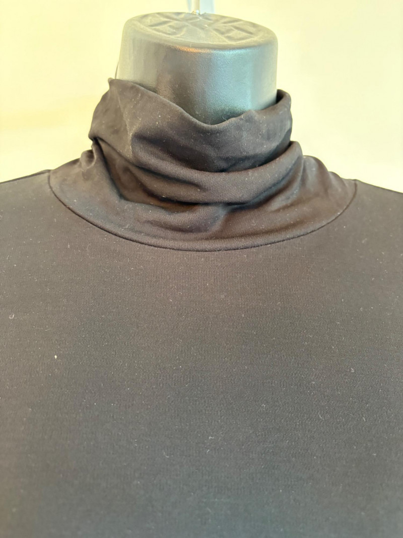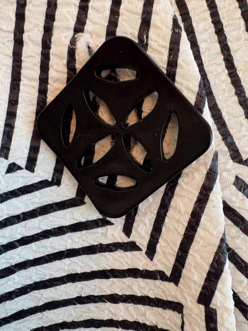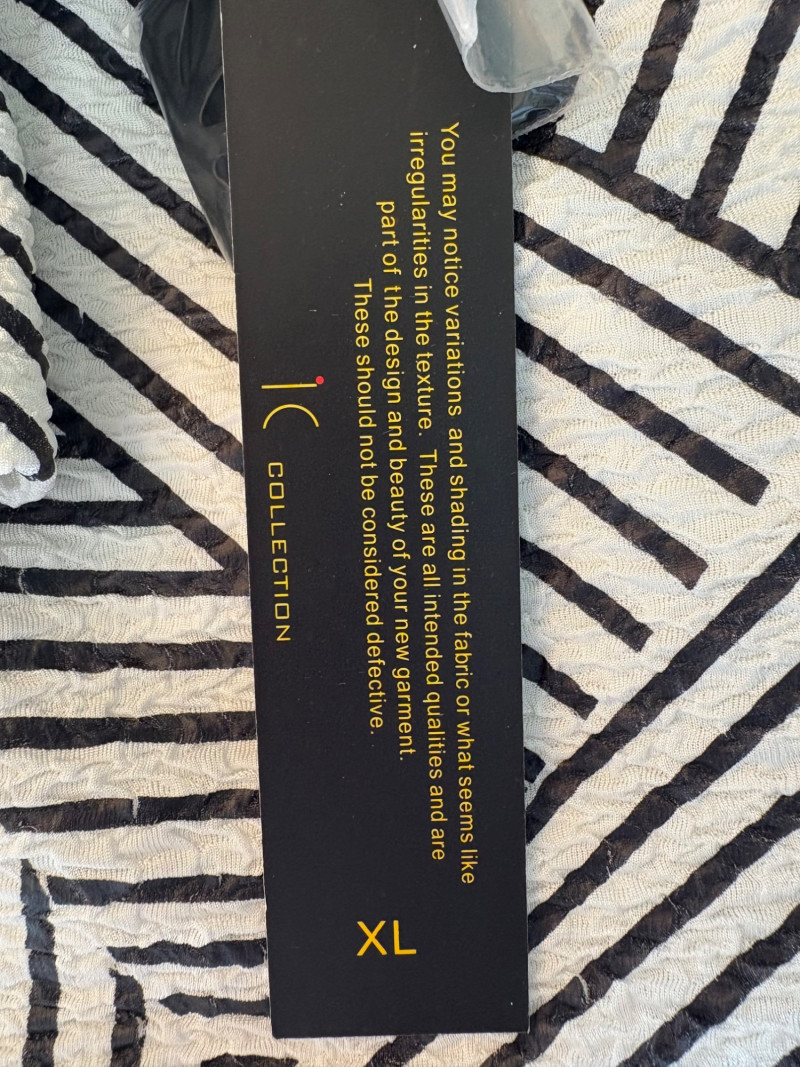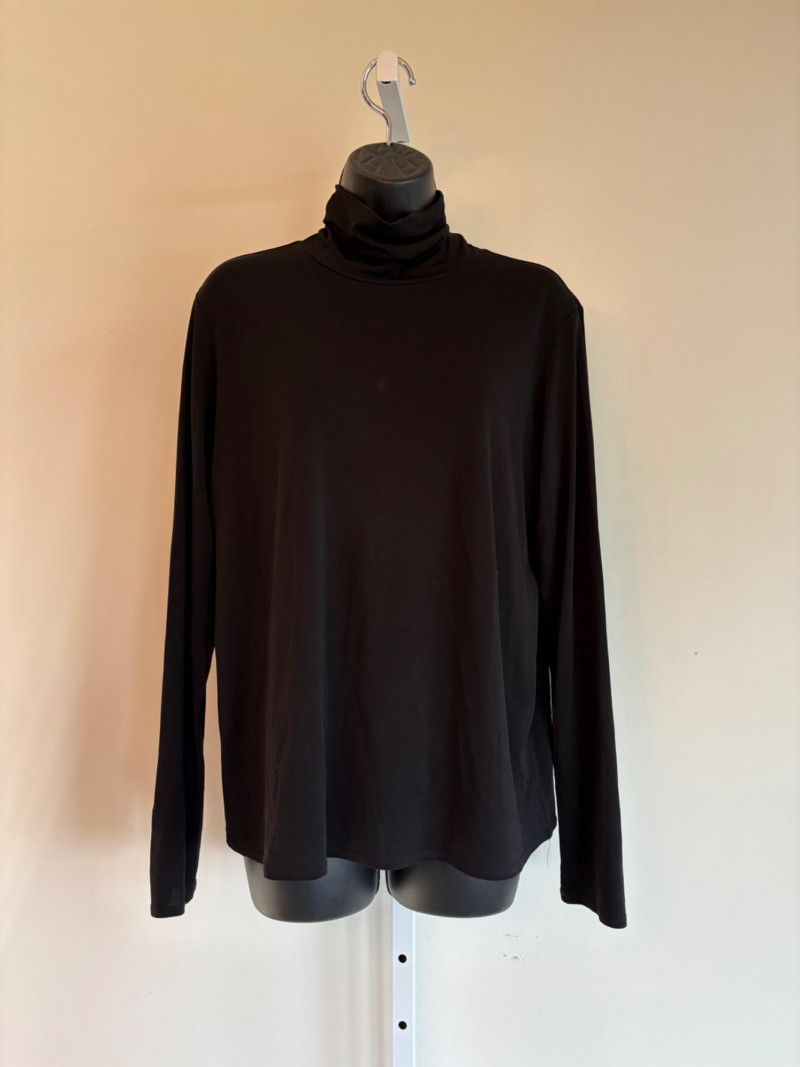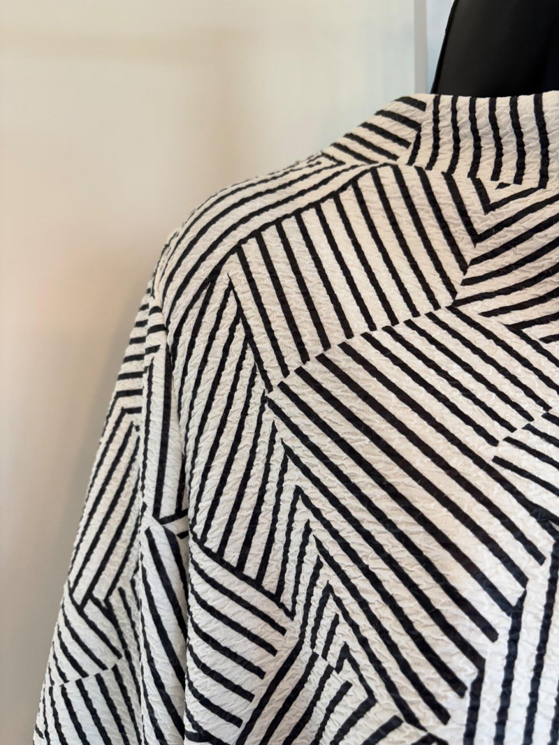 Two black tops from Eileen Fisher that pair beautifully with an IC Connie blazer. Black super thin long-sleeved turtleneck from Eileen Fisher is 100% silk. Measures 23" pit to pit. Size tag says XL. Black curved neck shell from Eileen Fisher is 100% organic cotton. Measures 22.5" pit to pit. Size tag says 1X. Black & white geometric jacket from IC Connie has modified funnel neck, single button front closure, roll cuff sleeves, flared cut, and an asymmetrical hem. New with tag. Polyester/spandex blend. Size tag says XL.
