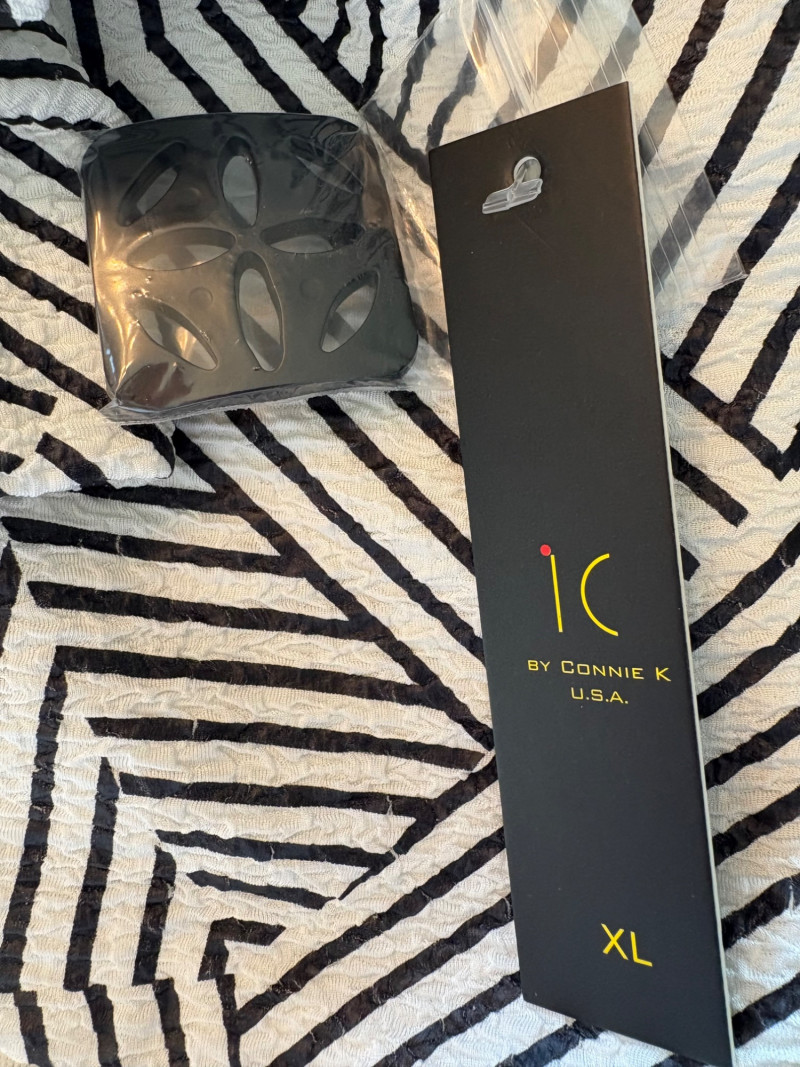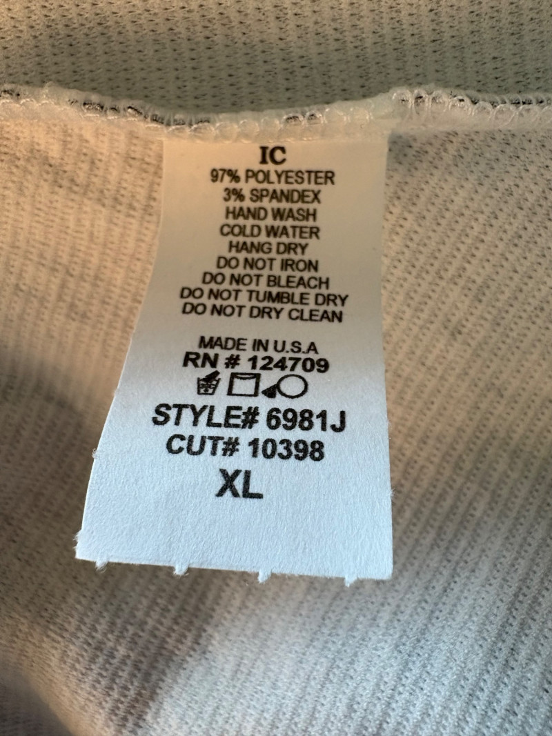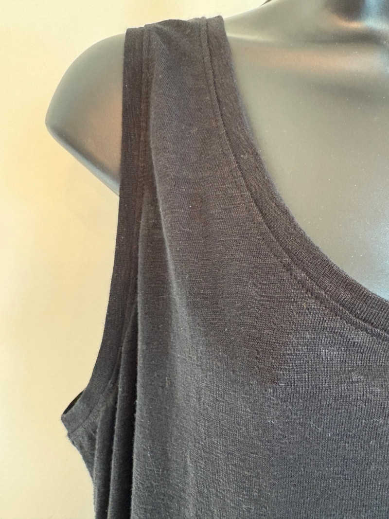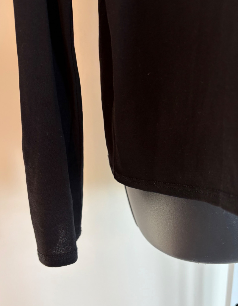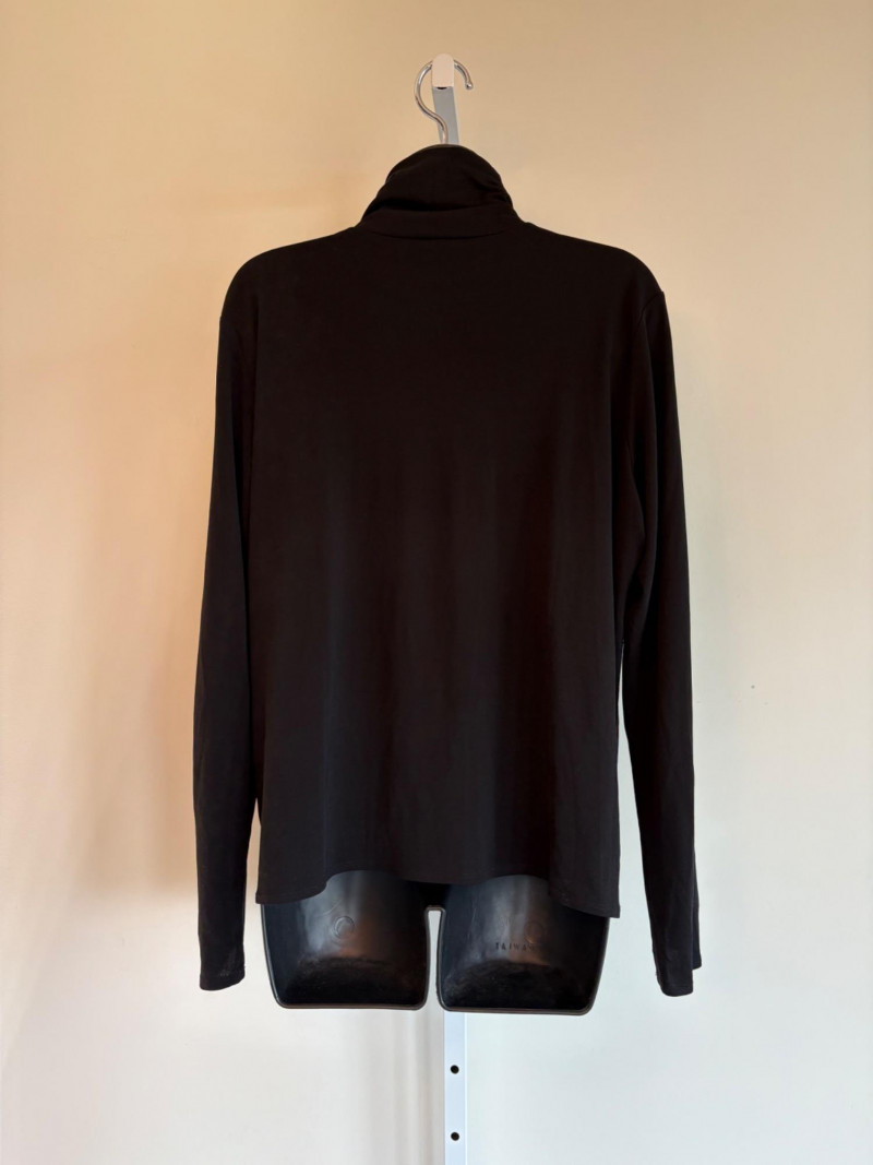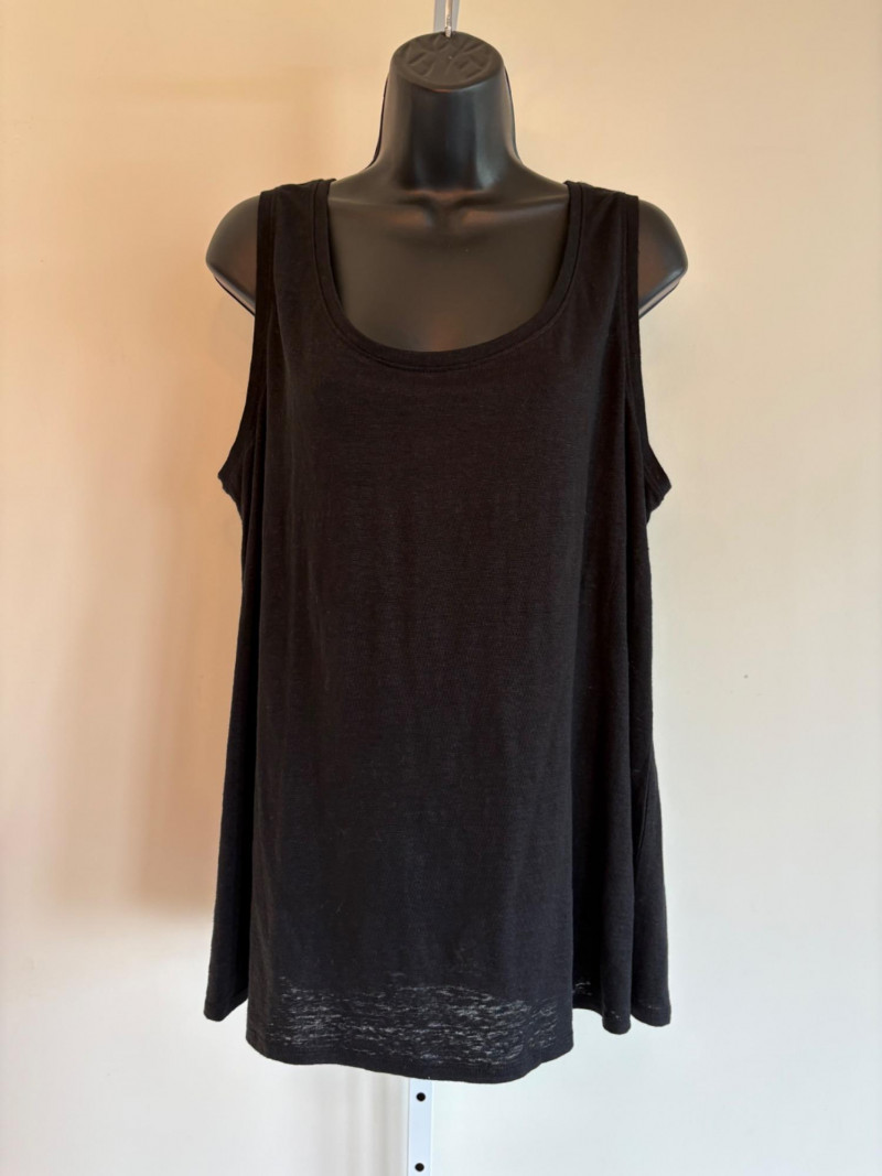 Two black tops from Eileen Fisher that pair beautifully with an IC Connie blazer. Black super thin long-sleeved turtleneck from Eileen Fisher is 100% silk. Measures 23" pit to pit. Size tag says XL. Black curved neck shell from Eileen Fisher is 100% organic cotton. Measures 22.5" pit to pit. Size tag says 1X. Black & white geometric jacket from IC Connie has modified funnel neck, single button front closure, roll cuff sleeves, flared cut, and an asymmetrical hem. New with tag. Polyester/spandex blend. Size tag says XL.