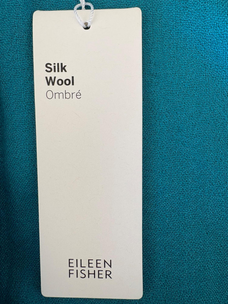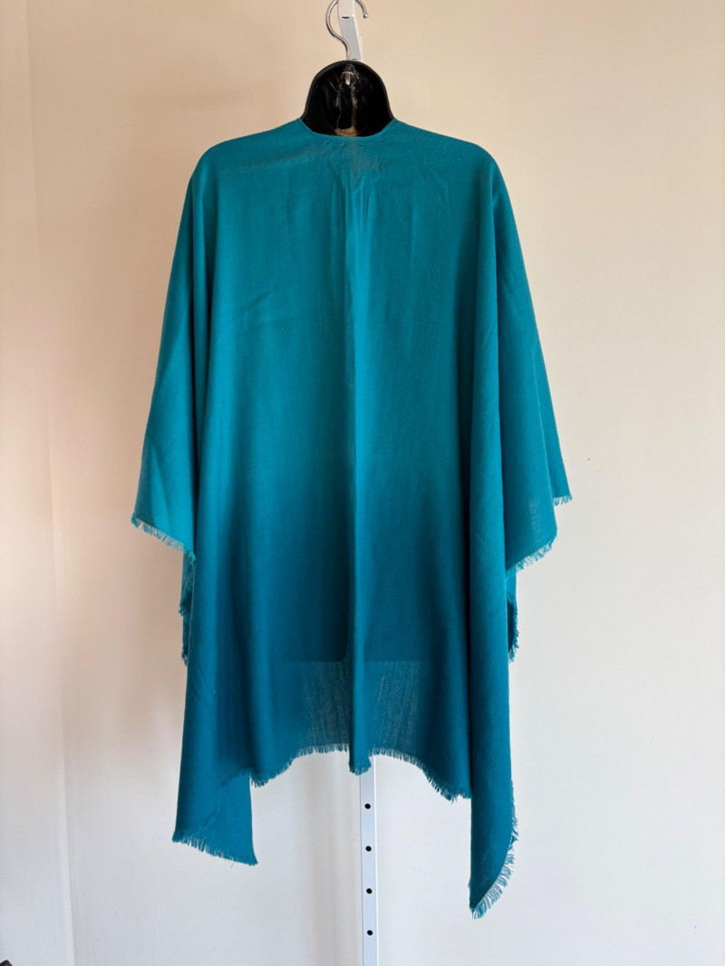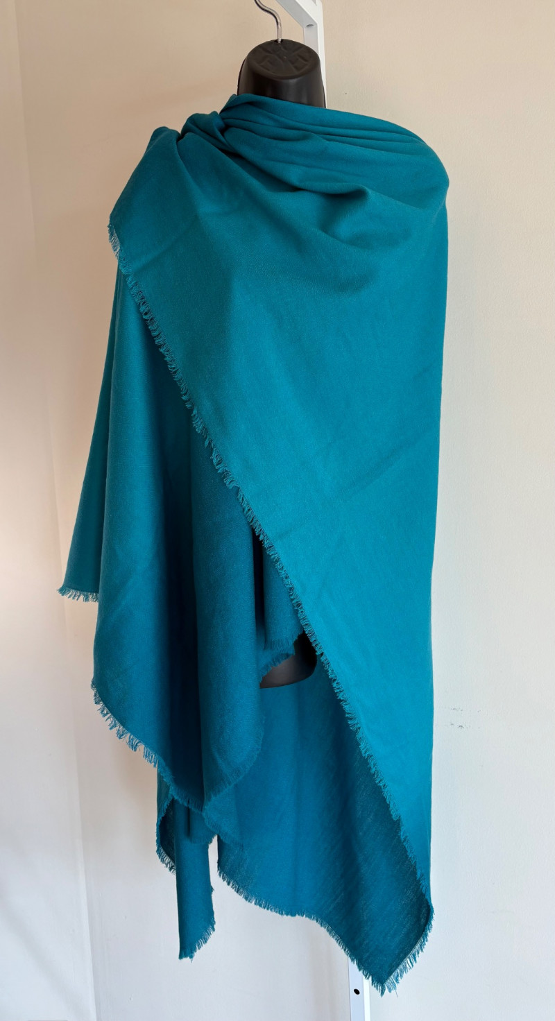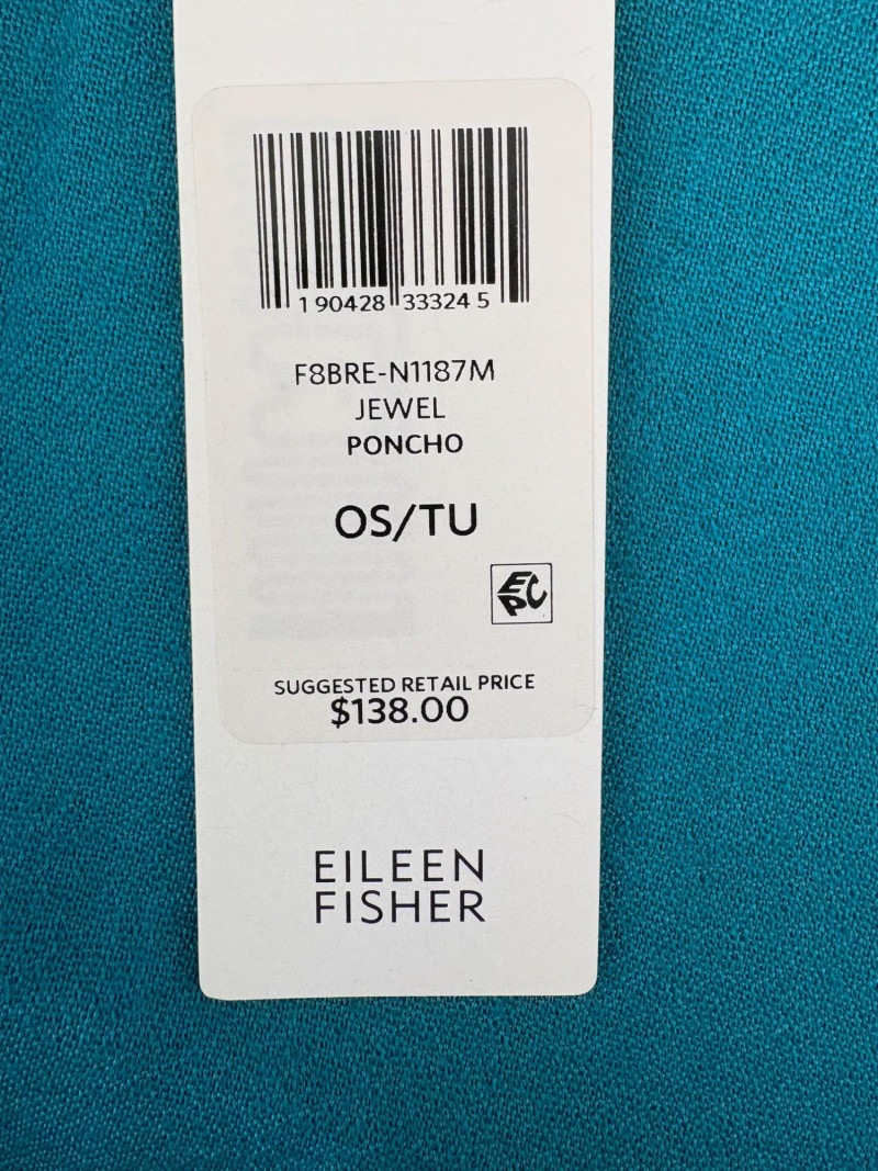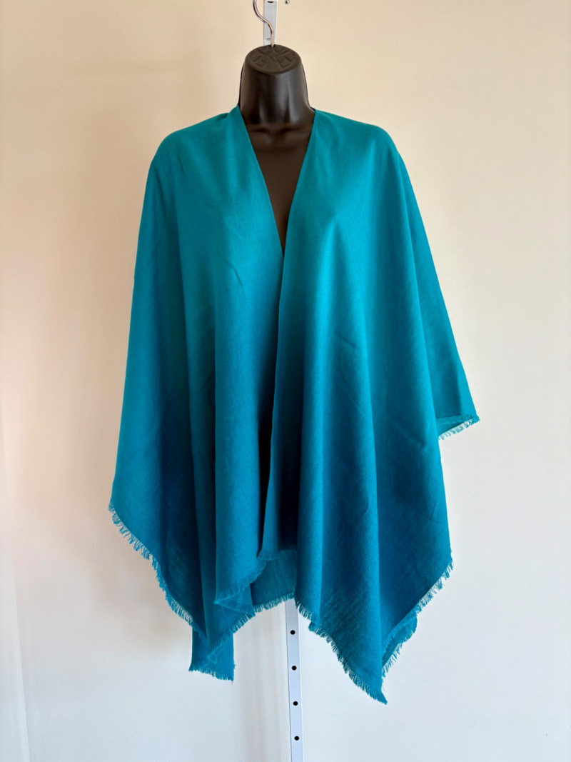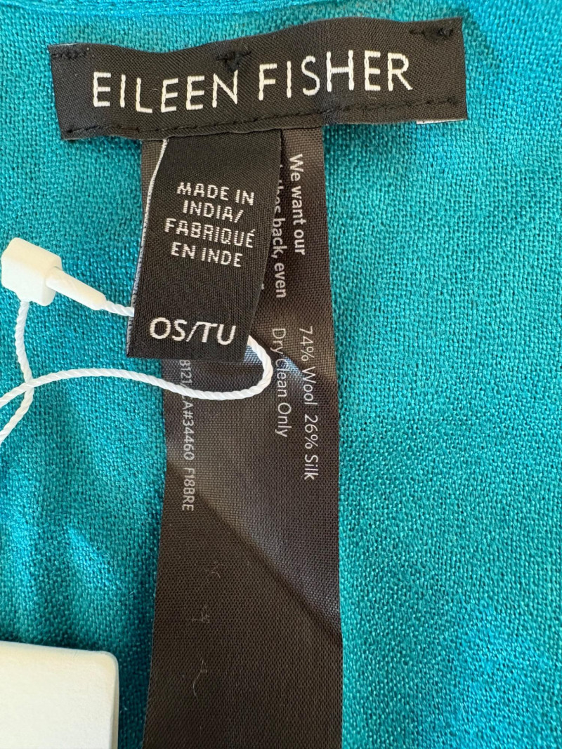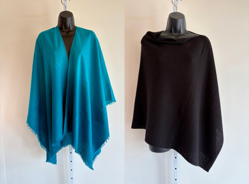 Pair of warm wraps in saturated hues from Eileen Fisher. Black wrap is a folded rectangle with asymmetric head opening that causes the front and back to fall to a point. Fabric tag is missing but it feels like a wool/silk blend. Measures 50" (25" from shoulder to hem) x 31" across. Size tag says One Size. Teal wrap is a modified rectangle with head opening, open front, and fringe on all four sides, New with tag. Wool/silk blend. Measures 60" (30" from shoulder to hem) x 50" across. Size tag says One Size..