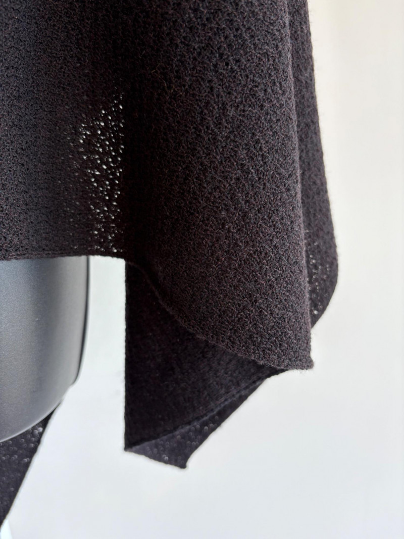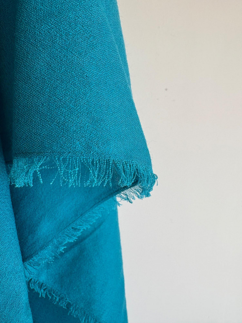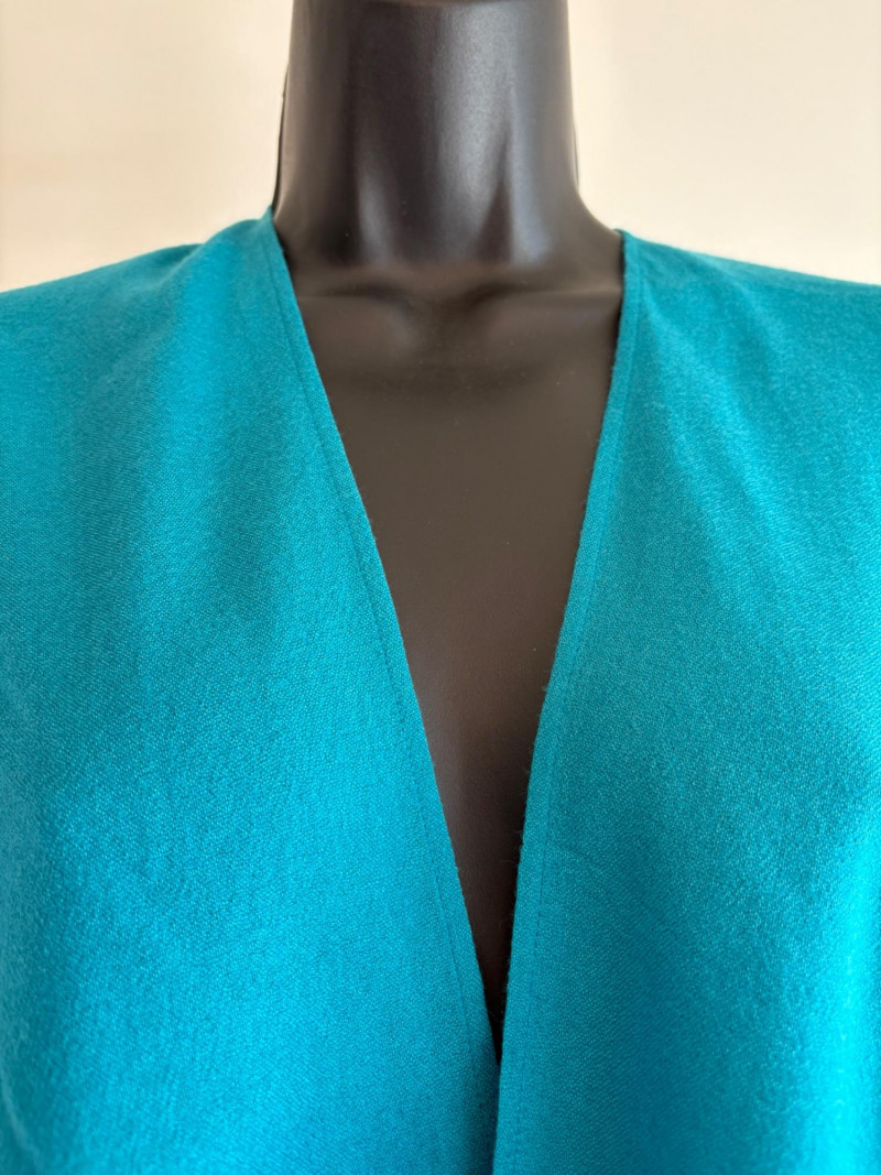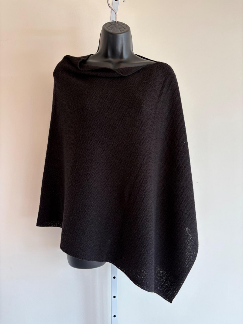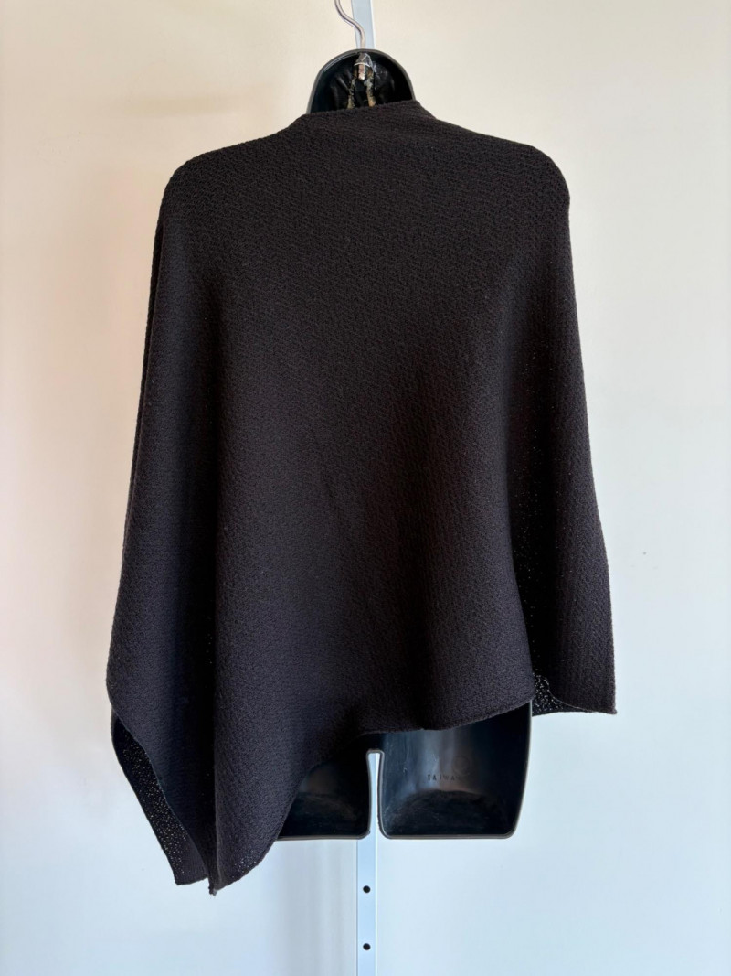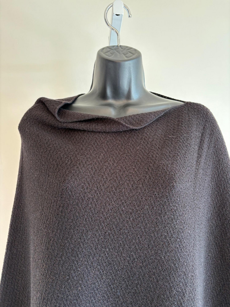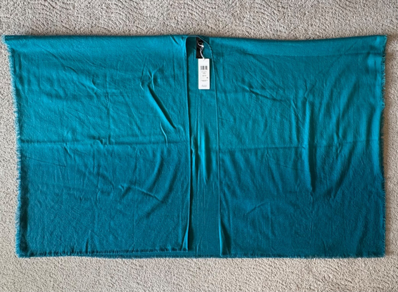 Pair of warm wraps in saturated hues from Eileen Fisher. Black wrap is a folded rectangle with asymmetric head opening that causes the front and back to fall to a point. Fabric tag is missing but it feels like a wool/silk blend. Measures 50" (25" from shoulder to hem) x 31" across. Size tag says One Size. Teal wrap is a modified rectangle with head opening, open front, and fringe on all four sides, New with tag. Wool/silk blend. Measures 60" (30" from shoulder to hem) x 50" across. Size tag says One Size..