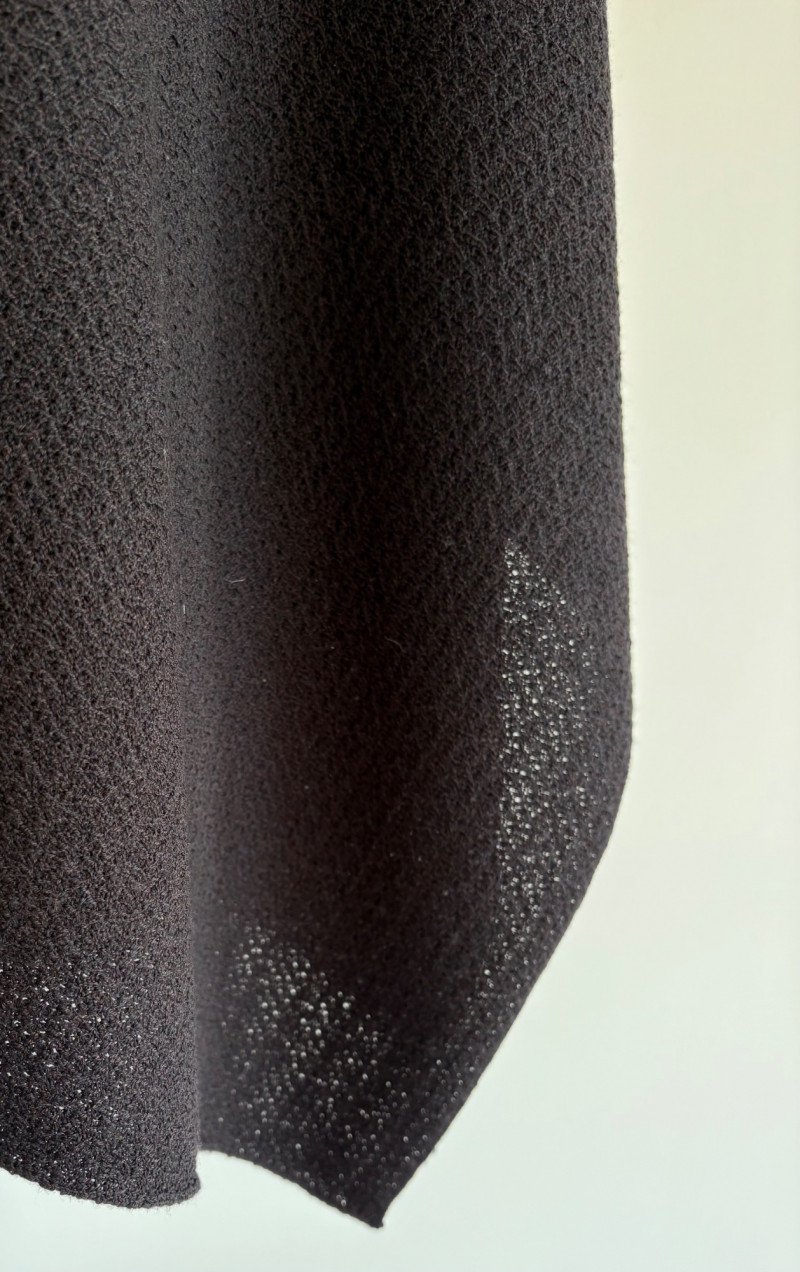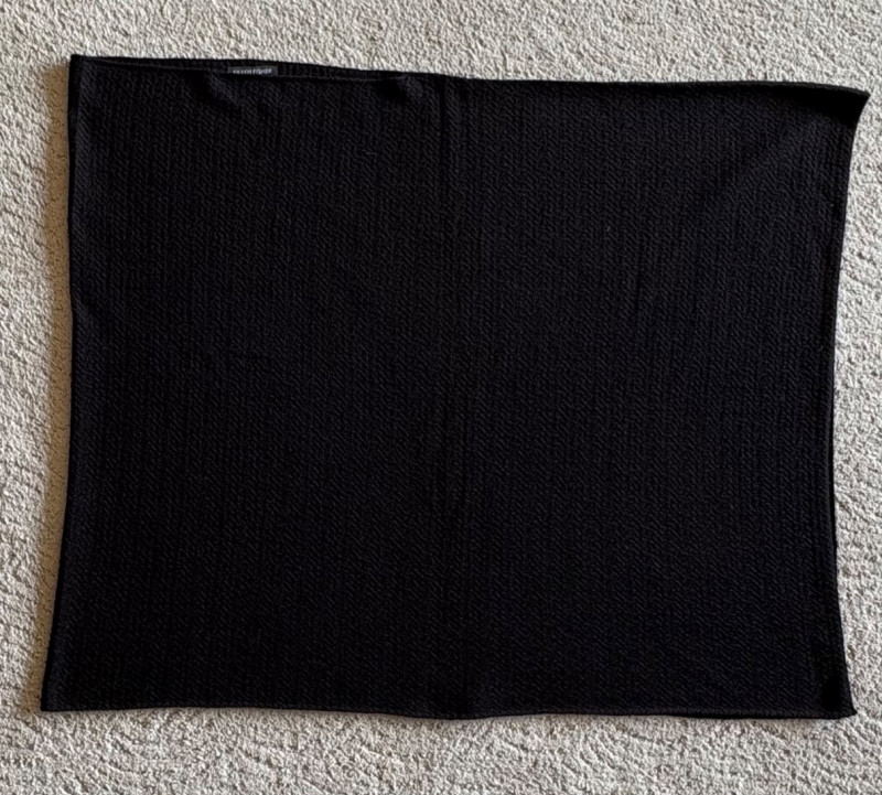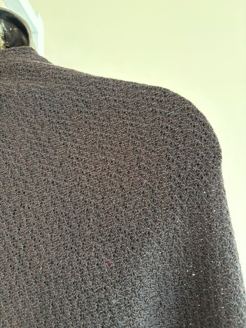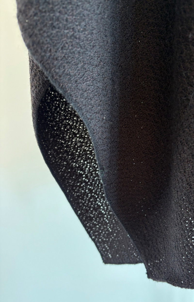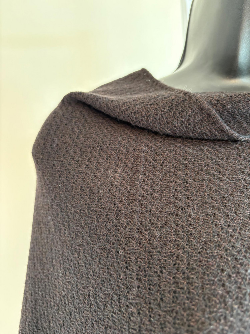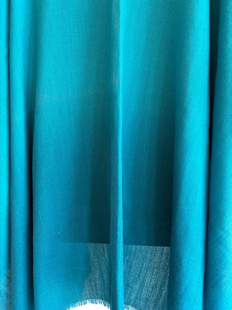 Pair of warm wraps in saturated hues from Eileen Fisher. Black wrap is a folded rectangle with asymmetric head opening that causes the front and back to fall to a point. Fabric tag is missing but it feels like a wool/silk blend. Measures 50" (25" from shoulder to hem) x 31" across. Size tag says One Size. Teal wrap is a modified rectangle with head opening, open front, and fringe on all four sides, New with tag. Wool/silk blend. Measures 60" (30" from shoulder to hem) x 50" across. Size tag says One Size..