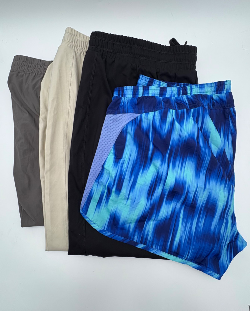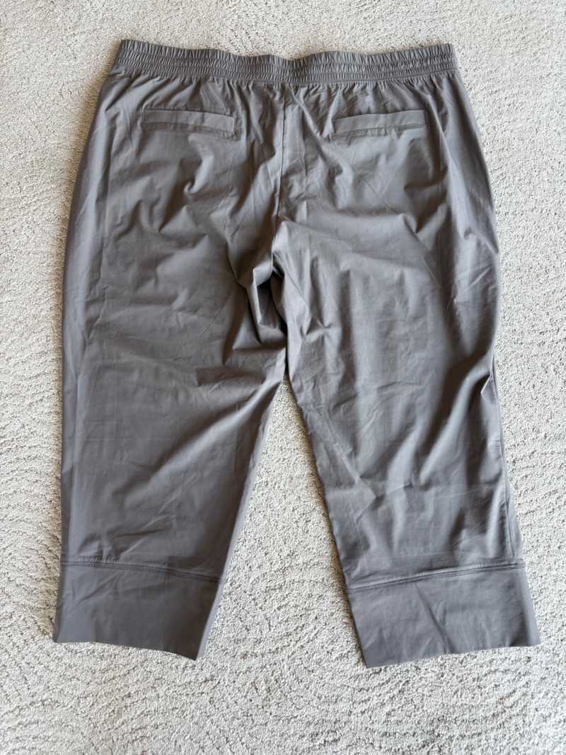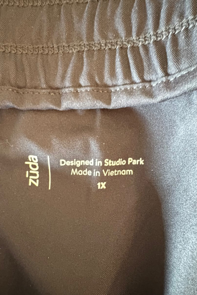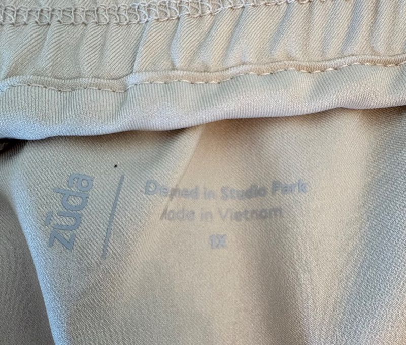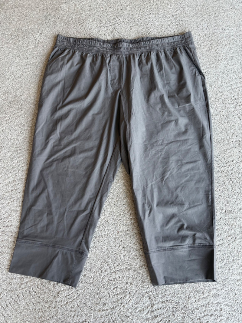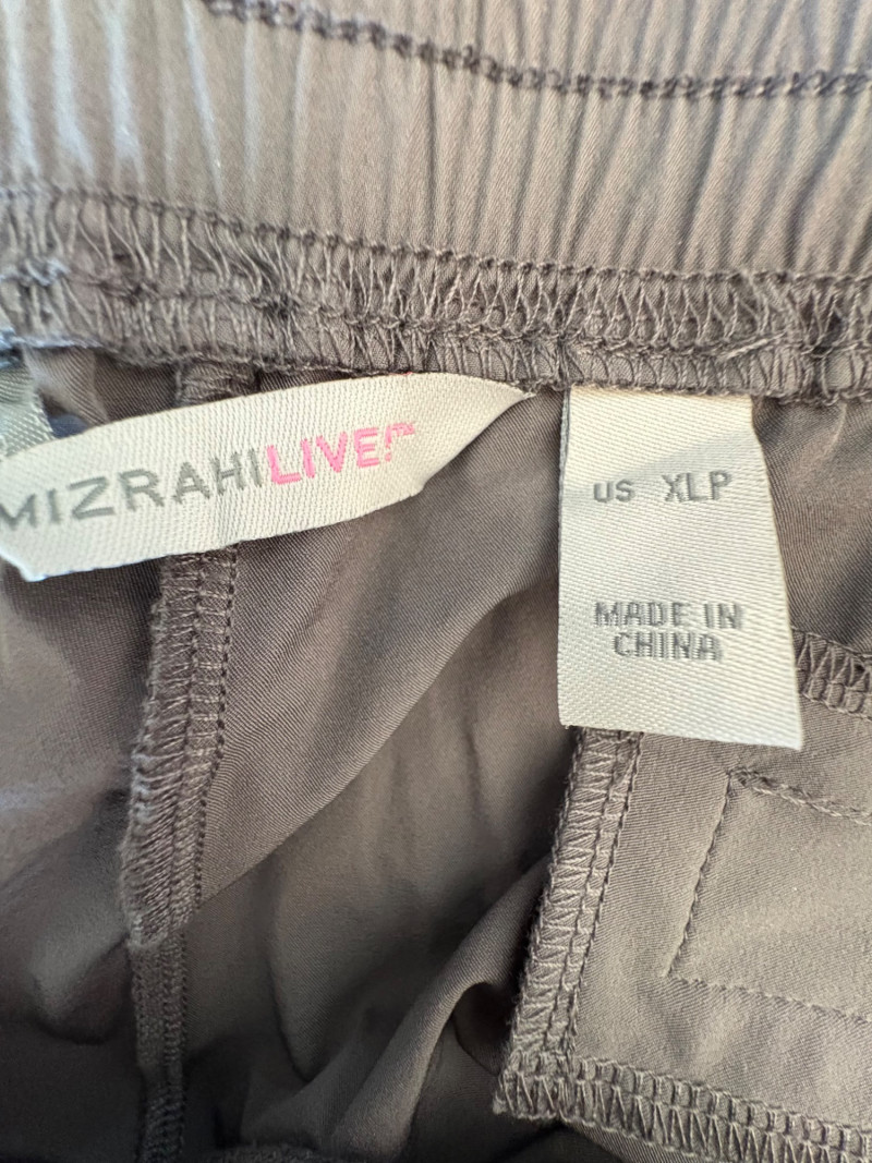 3 pairs of workout pants and 1 pair of shorts - all measure between 20" - 20.5" side to side at waist. Grey pants from Isaac Mizrahi are slightly cropped, have faux fly, elasticated waistband, set-in side pockets, back welt pockets, and wide banded hem. Nylon/spandex blend. Size tag says XLP. Cream pants from Zuda have elasticated waistband with drawstring, faux fly, front patch pockets with zip closure, and pieced inside knee areas. 100% polyester. Size tag says 1X/ Black pair from Zuda are identical to the cream pair except for color. Bright blue patterned shorts from Old Navy have interior panty, elasticated waist with drawstring, and mesh side insert. 100% polyester. Size tag says XL