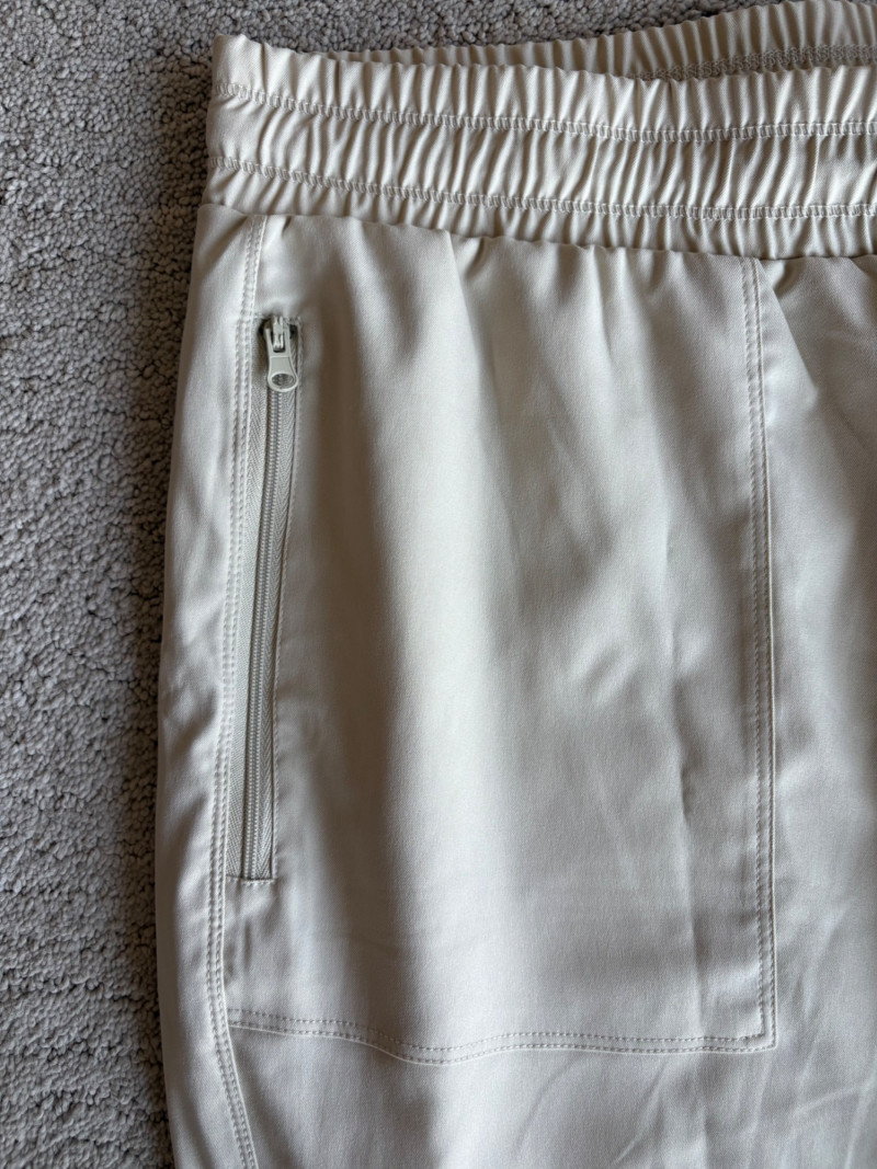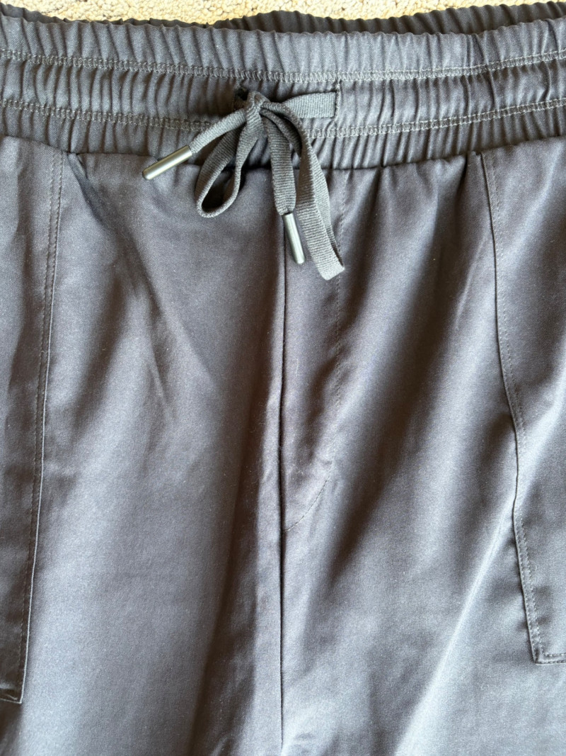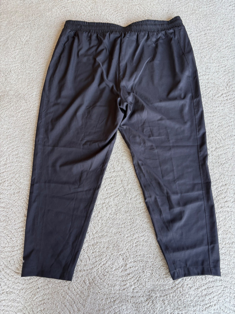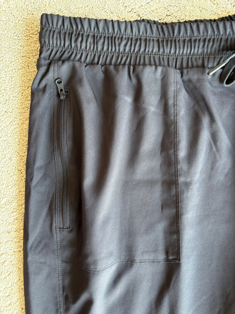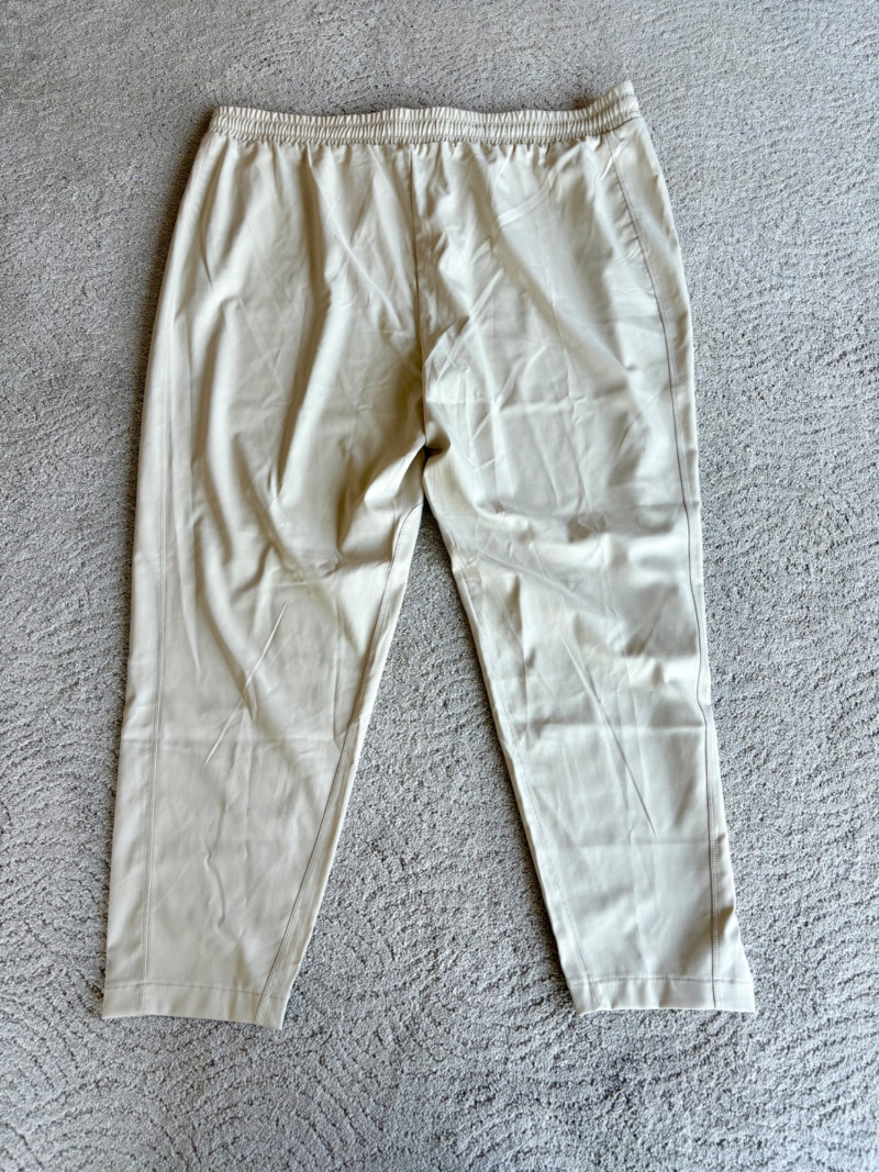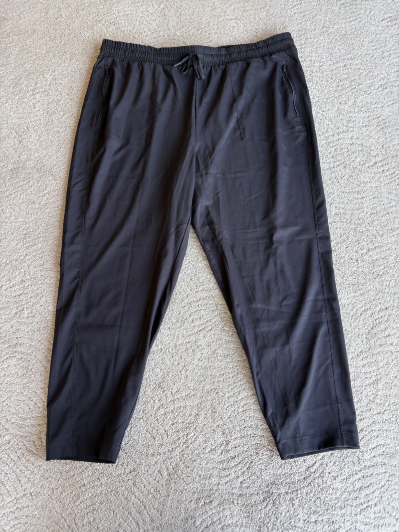3 pairs of workout pants and 1 pair of shorts - all measure between 20" - 20.5" side to side at waist. Grey pants from Isaac Mizrahi are slightly cropped, have faux fly, elasticated waistband, set-in side pockets, back welt pockets, and wide banded hem. Nylon/spandex blend. Size tag says XLP. Cream pants from Zuda have elasticated waistband with drawstring, faux fly, front patch pockets with zip closure, and pieced inside knee areas. 100% polyester. Size tag says 1X/ Black pair from Zuda are identical to the cream pair except for color. Bright blue patterned shorts from Old Navy have interior panty, elasticated waist with drawstring, and mesh side insert. 100% polyester. Size tag says XL