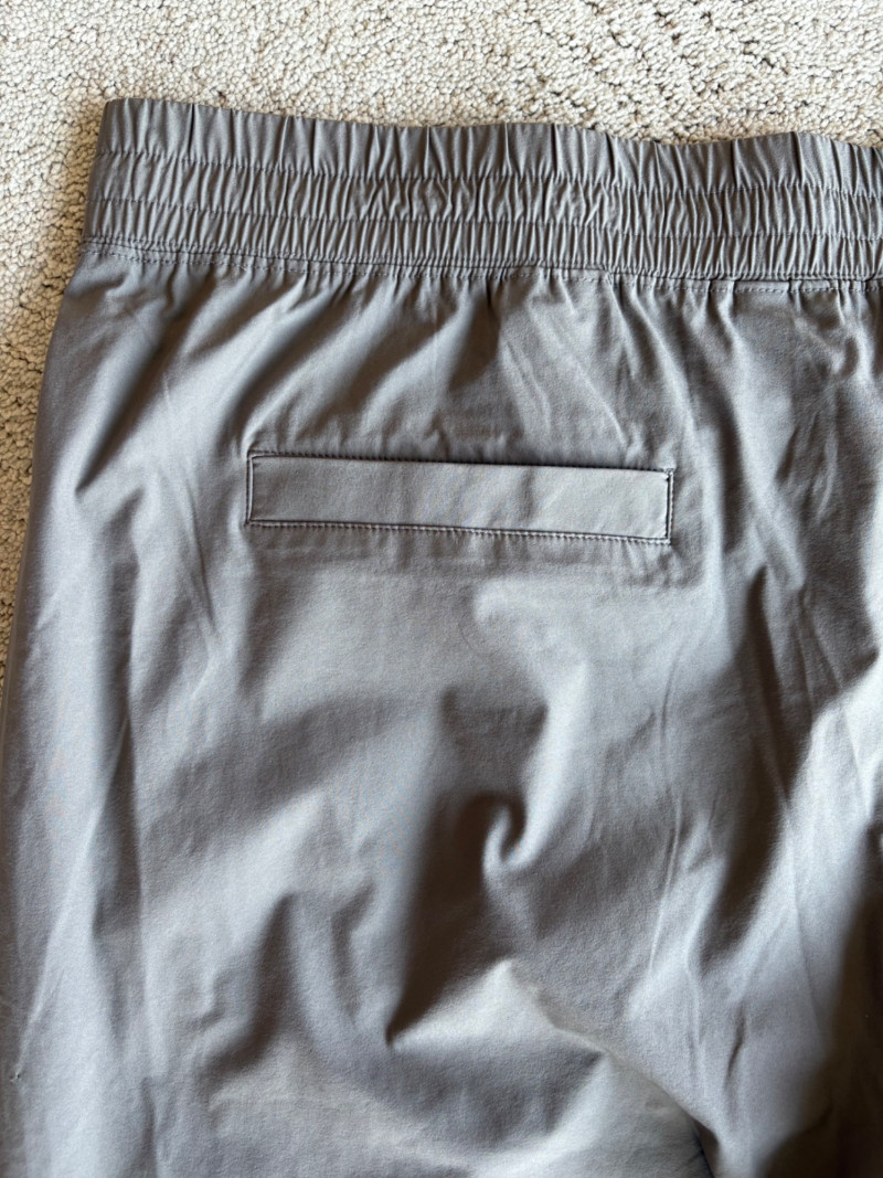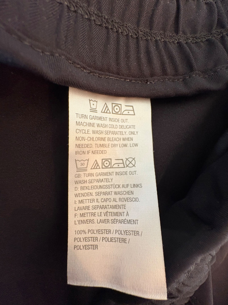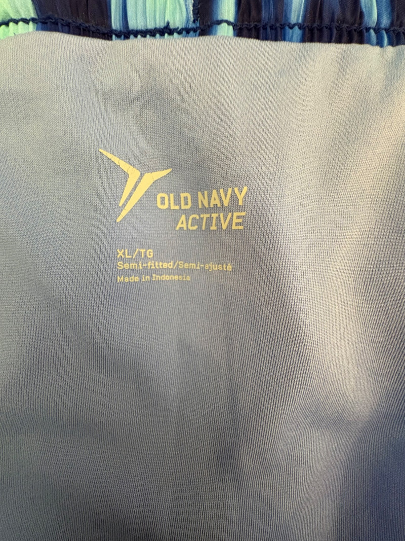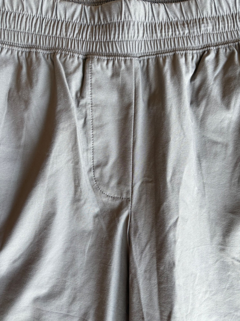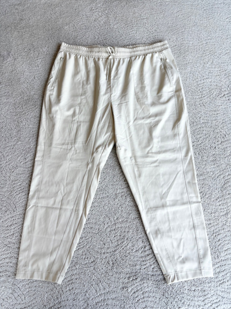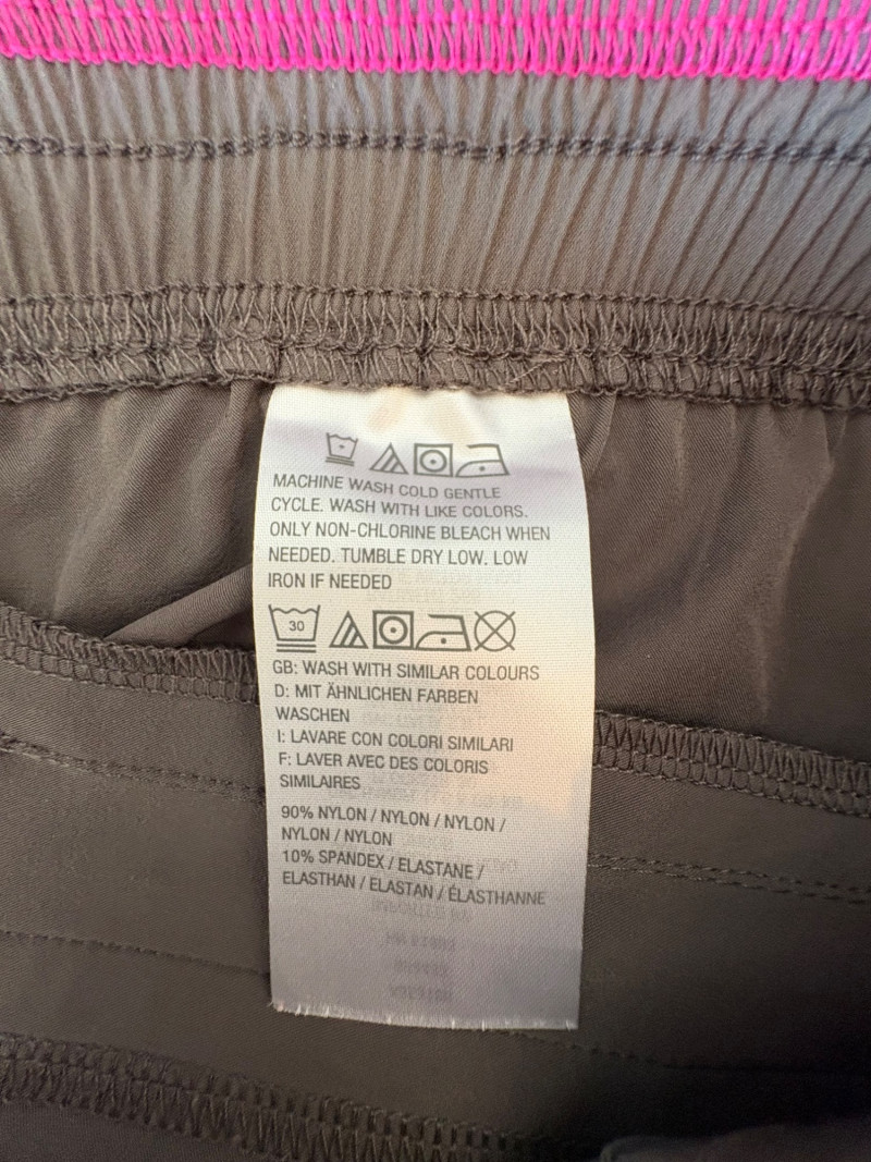 3 pairs of workout pants and 1 pair of shorts - all measure between 20" - 20.5" side to side at waist. Grey pants from Isaac Mizrahi are slightly cropped, have faux fly, elasticated waistband, set-in side pockets, back welt pockets, and wide banded hem. Nylon/spandex blend. Size tag says XLP. Cream pants from Zuda have elasticated waistband with drawstring, faux fly, front patch pockets with zip closure, and pieced inside knee areas. 100% polyester. Size tag says 1X/ Black pair from Zuda are identical to the cream pair except for color. Bright blue patterned shorts from Old Navy have interior panty, elasticated waist with drawstring, and mesh side insert. 100% polyester. Size tag says XL