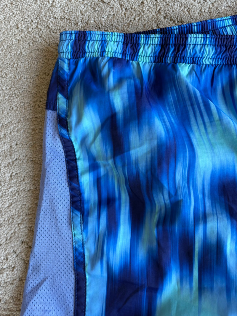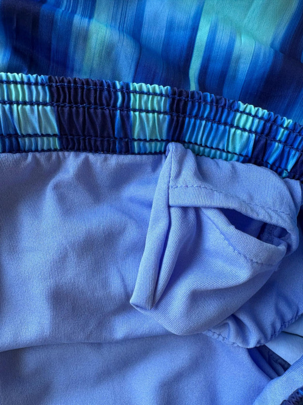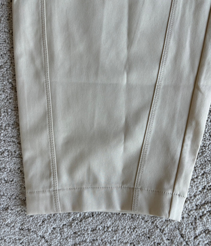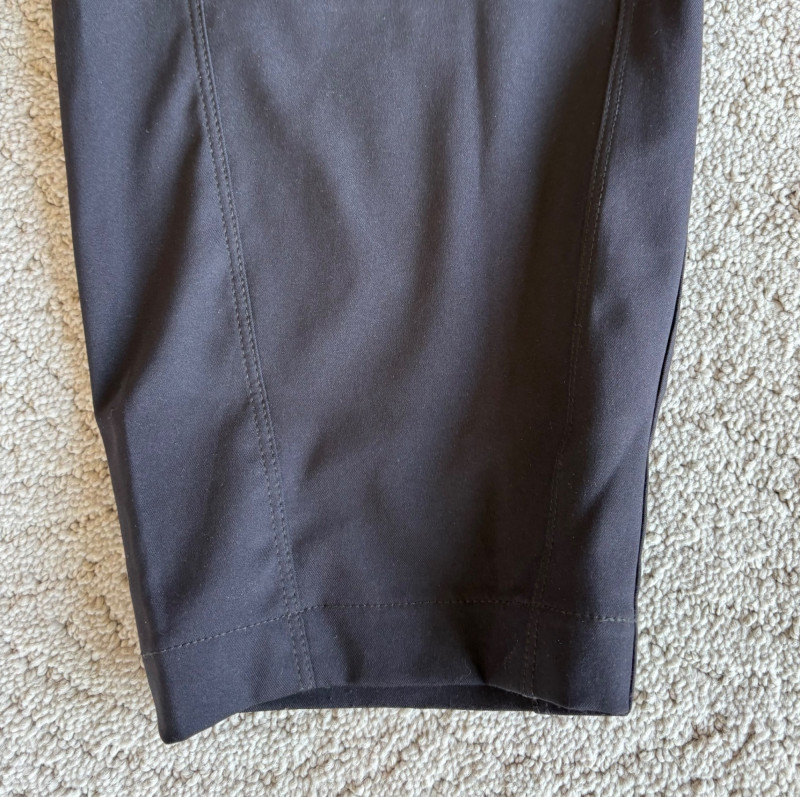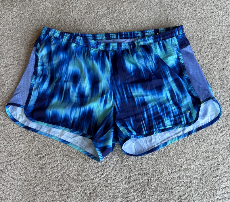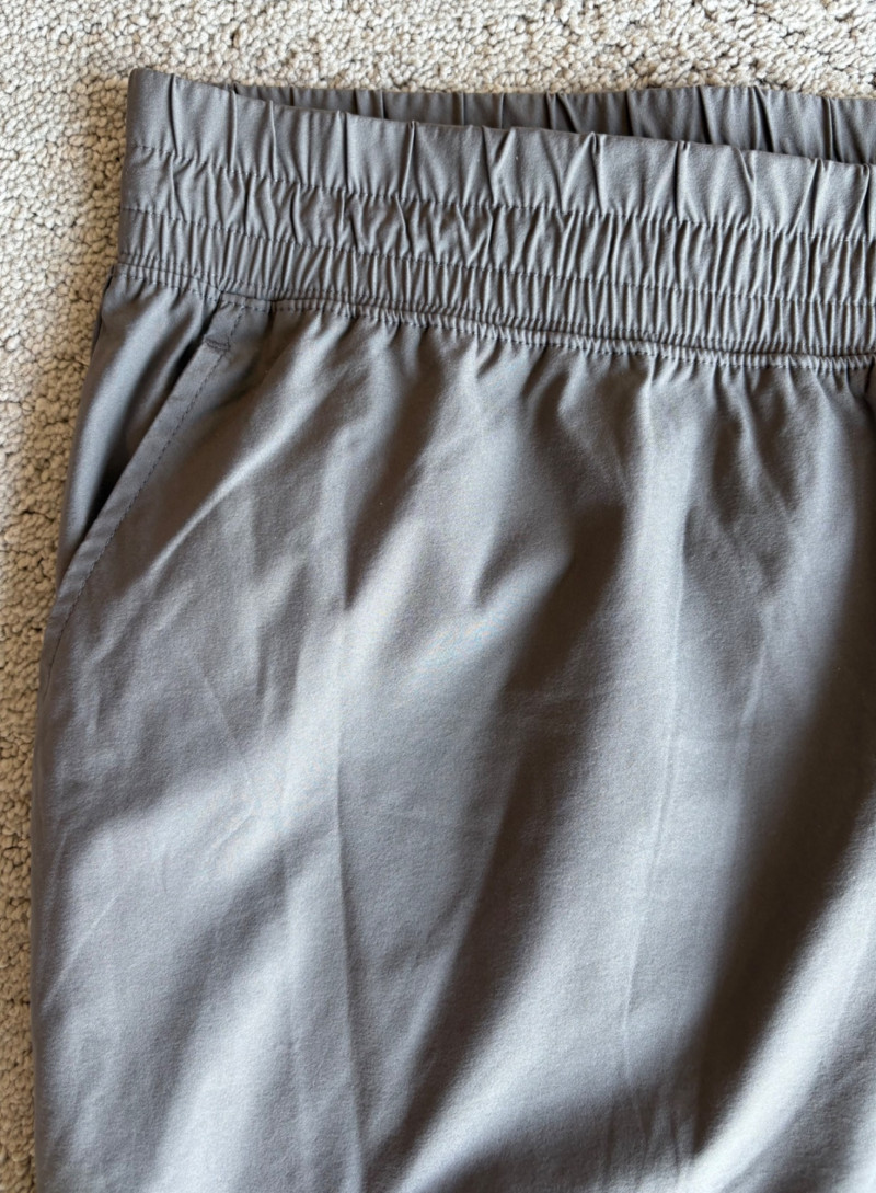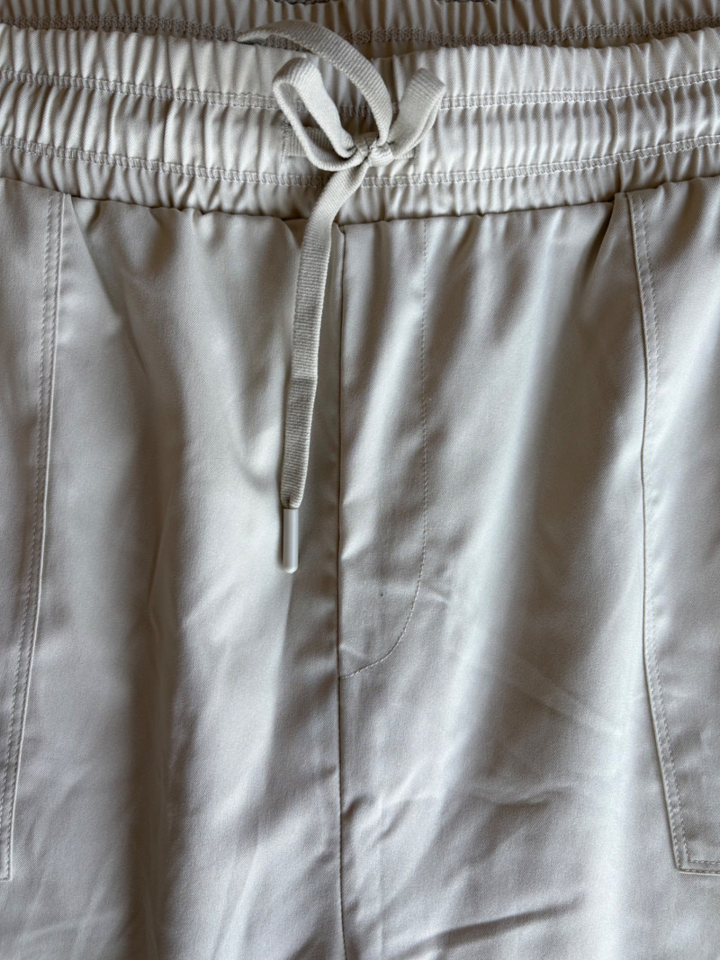 3 pairs of workout pants and 1 pair of shorts - all measure between 20" - 20.5" side to side at waist. Grey pants from Isaac Mizrahi are slightly cropped, have faux fly, elasticated waistband, set-in side pockets, back welt pockets, and wide banded hem. Nylon/spandex blend. Size tag says XLP. Cream pants from Zuda have elasticated waistband with drawstring, faux fly, front patch pockets with zip closure, and pieced inside knee areas. 100% polyester. Size tag says 1X/ Black pair from Zuda are identical to the cream pair except for color. Bright blue patterned shorts from Old Navy have interior panty, elasticated waist with drawstring, and mesh side insert. 100% polyester. Size tag says XL