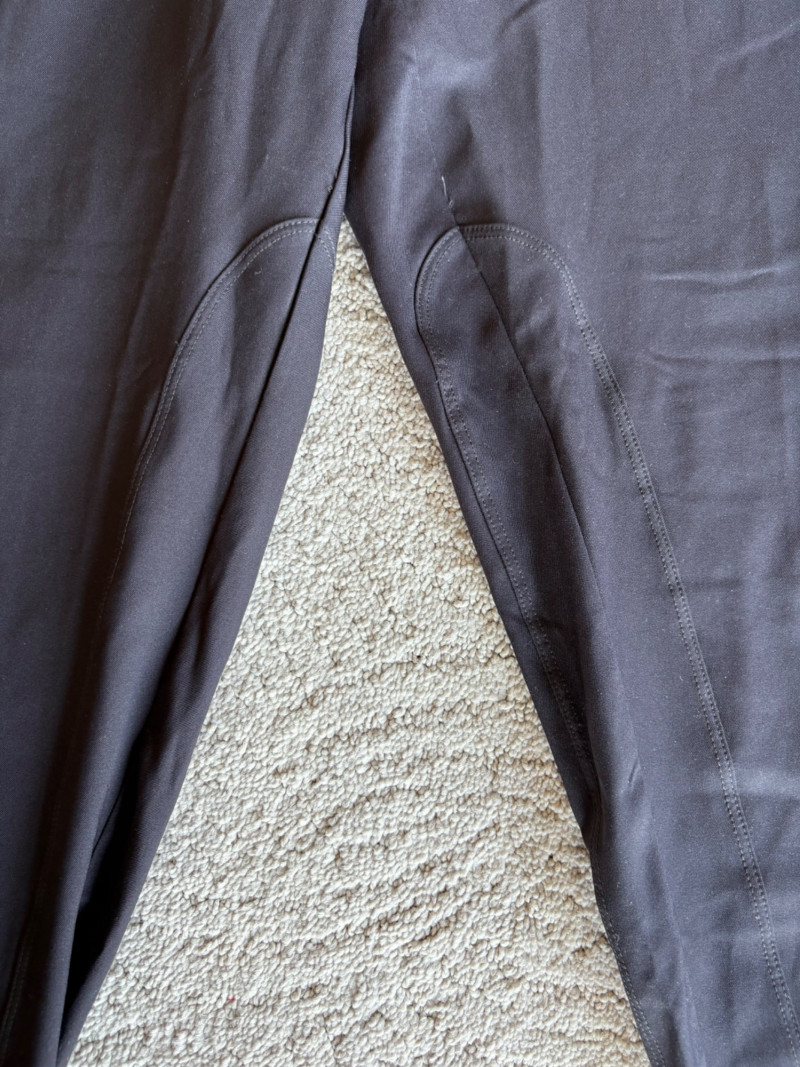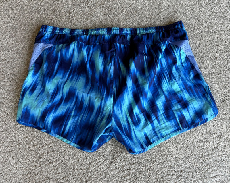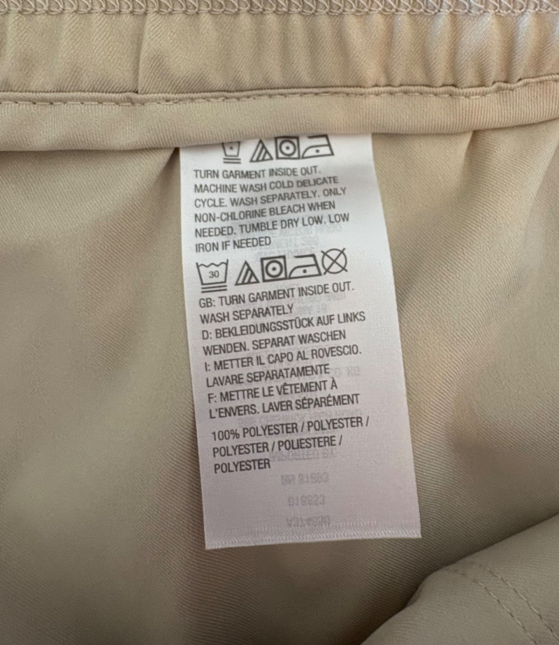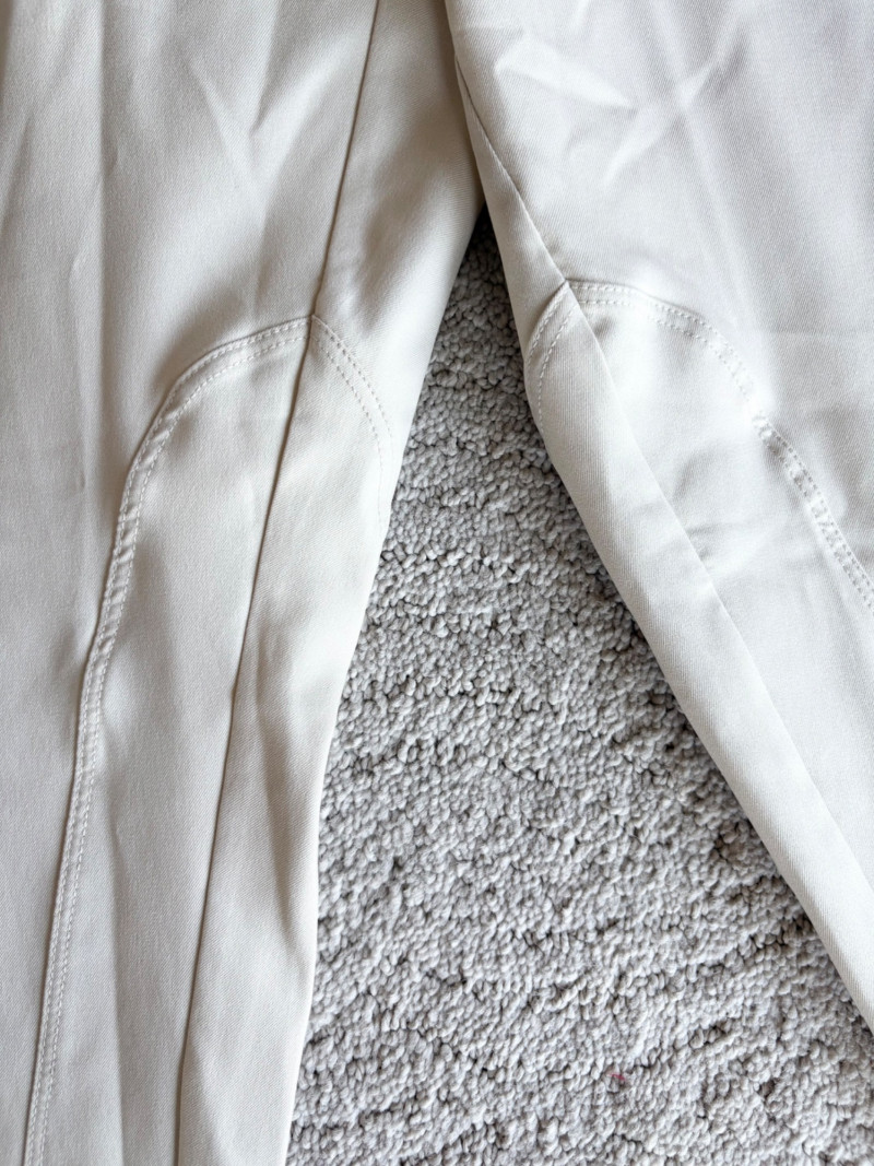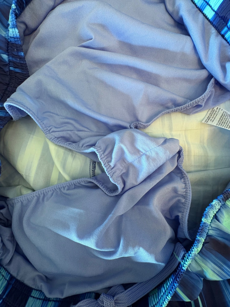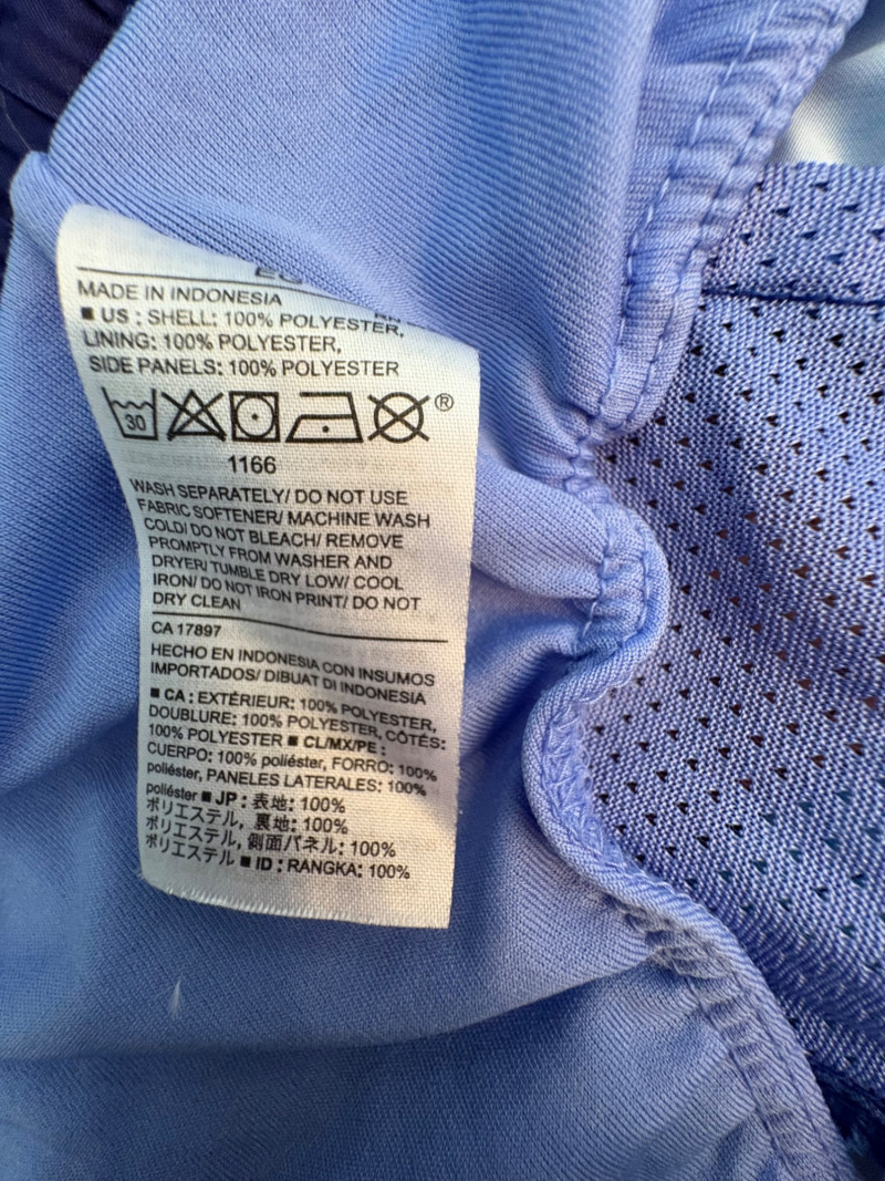 3 pairs of workout pants and 1 pair of shorts - all measure between 20" - 20.5" side to side at waist. Grey pants from Isaac Mizrahi are slightly cropped, have faux fly, elasticated waistband, set-in side pockets, back welt pockets, and wide banded hem. Nylon/spandex blend. Size tag says XLP. Cream pants from Zuda have elasticated waistband with drawstring, faux fly, front patch pockets with zip closure, and pieced inside knee areas. 100% polyester. Size tag says 1X/ Black pair from Zuda are identical to the cream pair except for color. Bright blue patterned shorts from Old Navy have interior panty, elasticated waist with drawstring, and mesh side insert. 100% polyester. Size tag says XL
