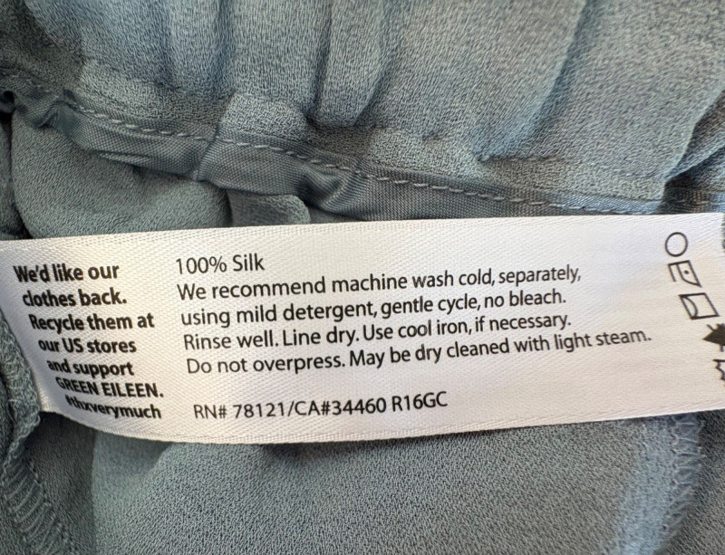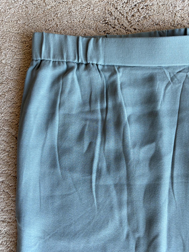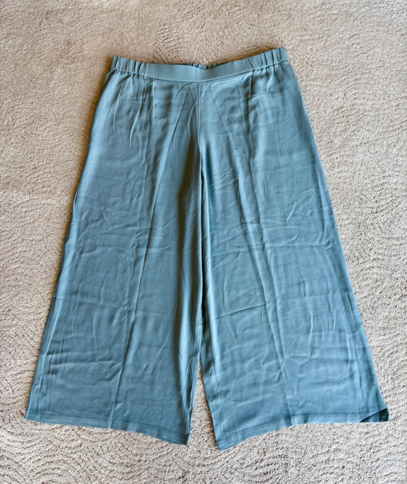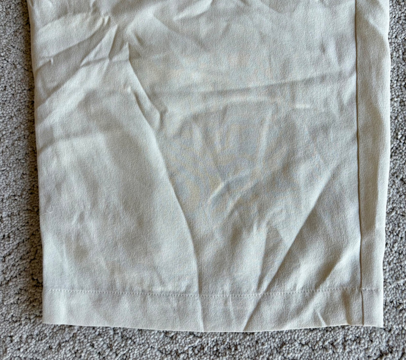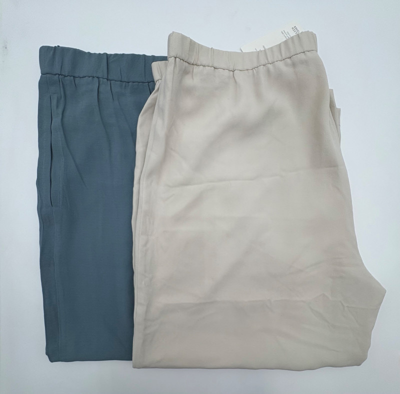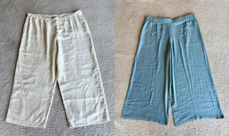 2 fabulous flowing pairs of silk pants from Eileen Fisher in cream and blue. Both measure 19.5" side to side at waist and have size tags that say XL. Cream pair has elasticated waistband, straight legs, and are fully lined. New with tag. 100% silk Georgette. Blue pair have elasticated waistband with flat panel in front, in-seam pockets, and wide flowing legs. 100% silk. Please note - when steamed and hung, these are GORGEOUS pants; laying them on the ground seems almost disrespectful, but in the interest of honesty, we didn't want to cinch them in at the waist on our size 4 mannequin. As larger gals ourselves, we hate that "tuck & hide" so many folks do with our size clothing - we want to see the fullness of the leg & waist!