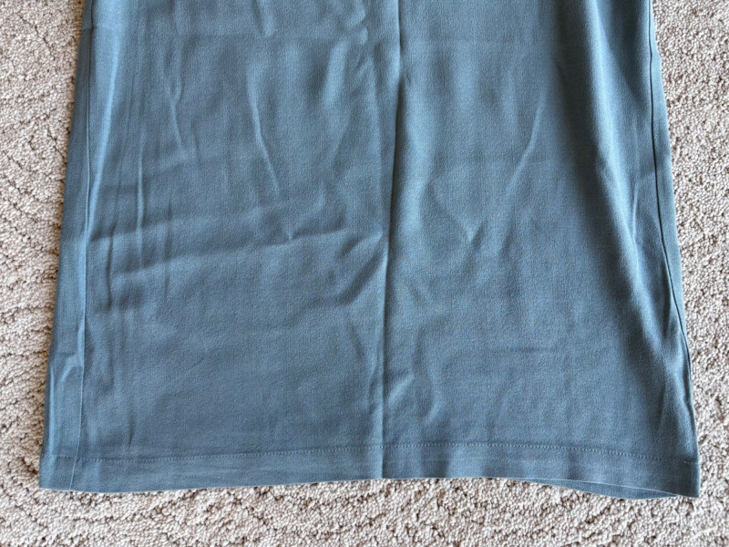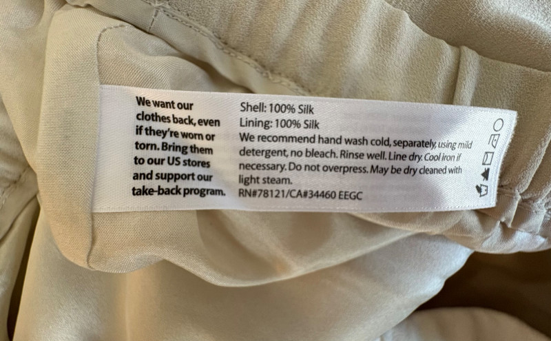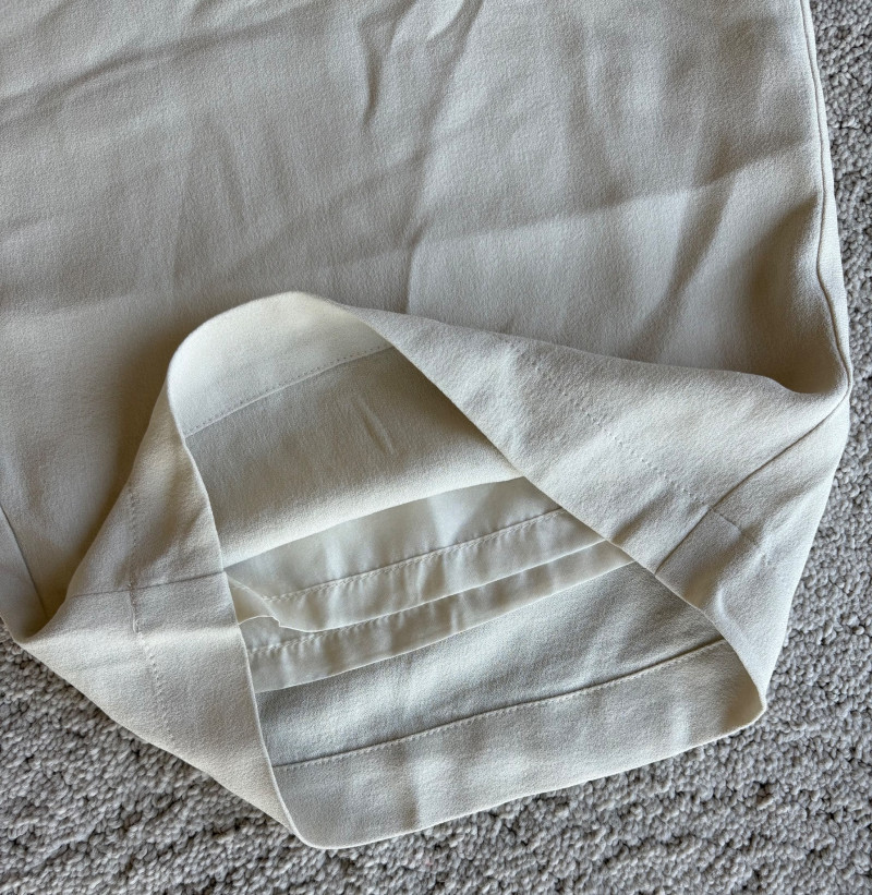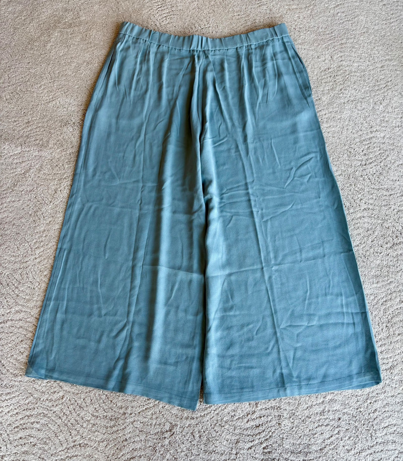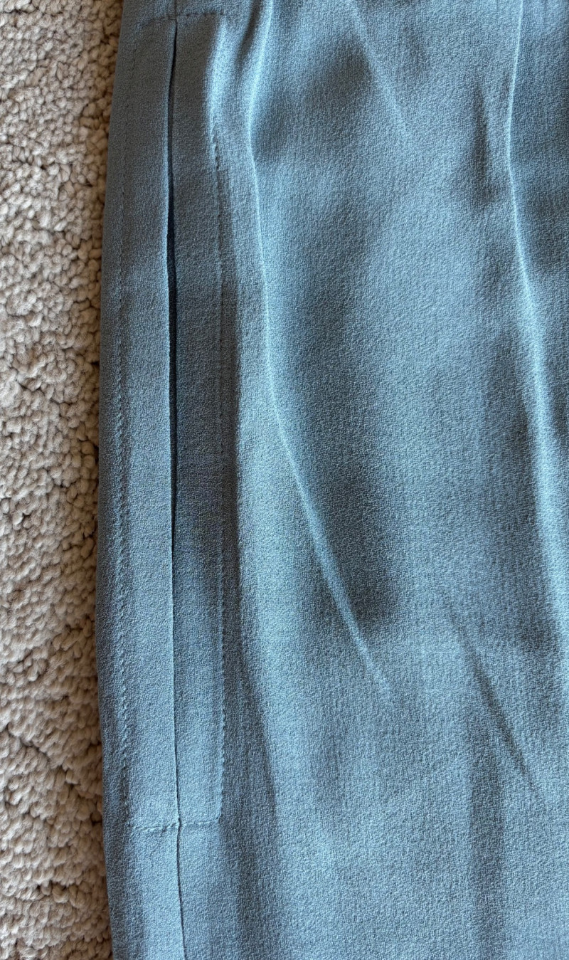 2 fabulous flowing pairs of silk pants from Eileen Fisher in cream and blue. Both measure 19.5" side to side at waist and have size tags that say XL. Cream pair has elasticated waistband, straight legs, and are fully lined. New with tag. 100% silk Georgette. Blue pair have elasticated waistband with flat panel in front, in-seam pockets, and wide flowing legs. 100% silk. Please note - when steamed and hung, these are GORGEOUS pants; laying them on the ground seems almost disrespectful, but in the interest of honesty, we didn't want to cinch them in at the waist on our size 4 mannequin. As larger gals ourselves, we hate that "tuck & hide" so many folks do with our size clothing - we want to see the fullness of the leg & waist!