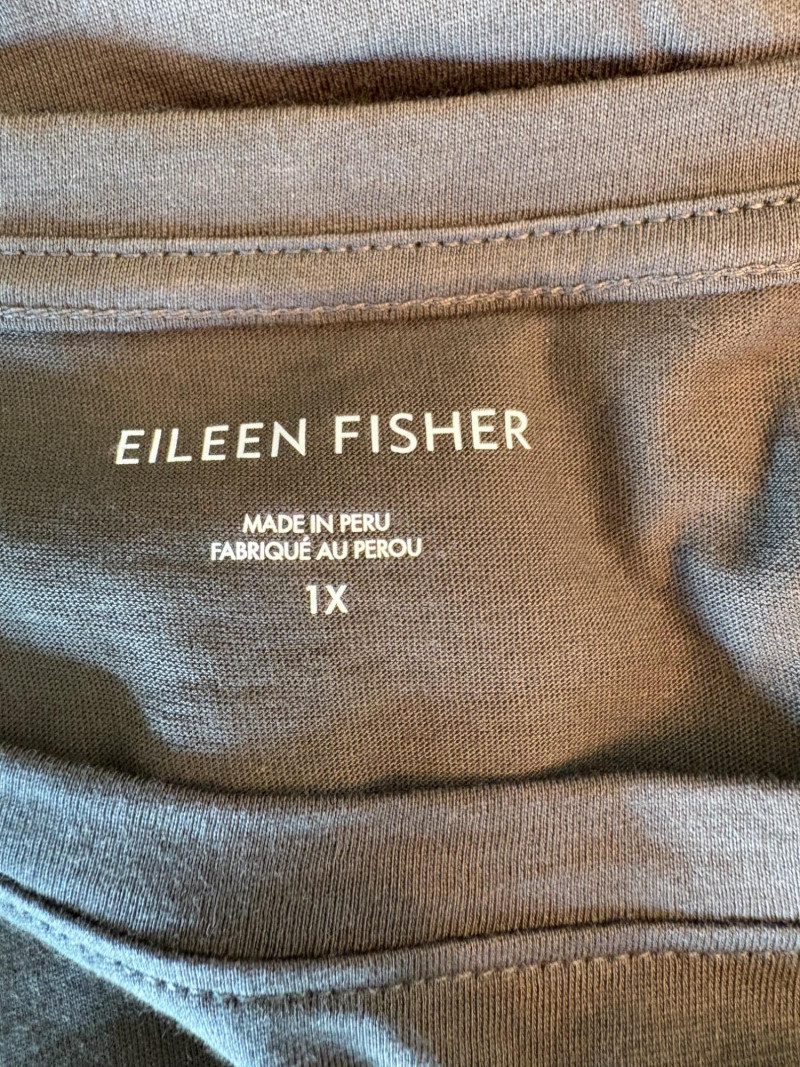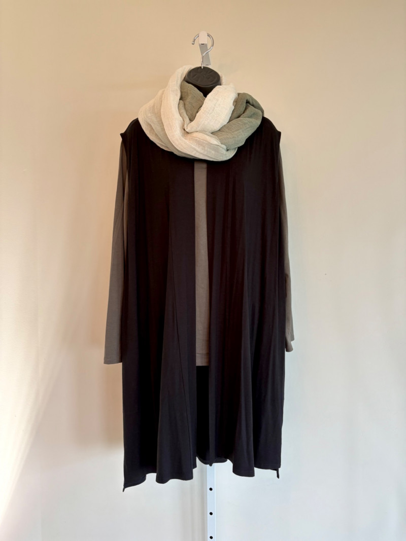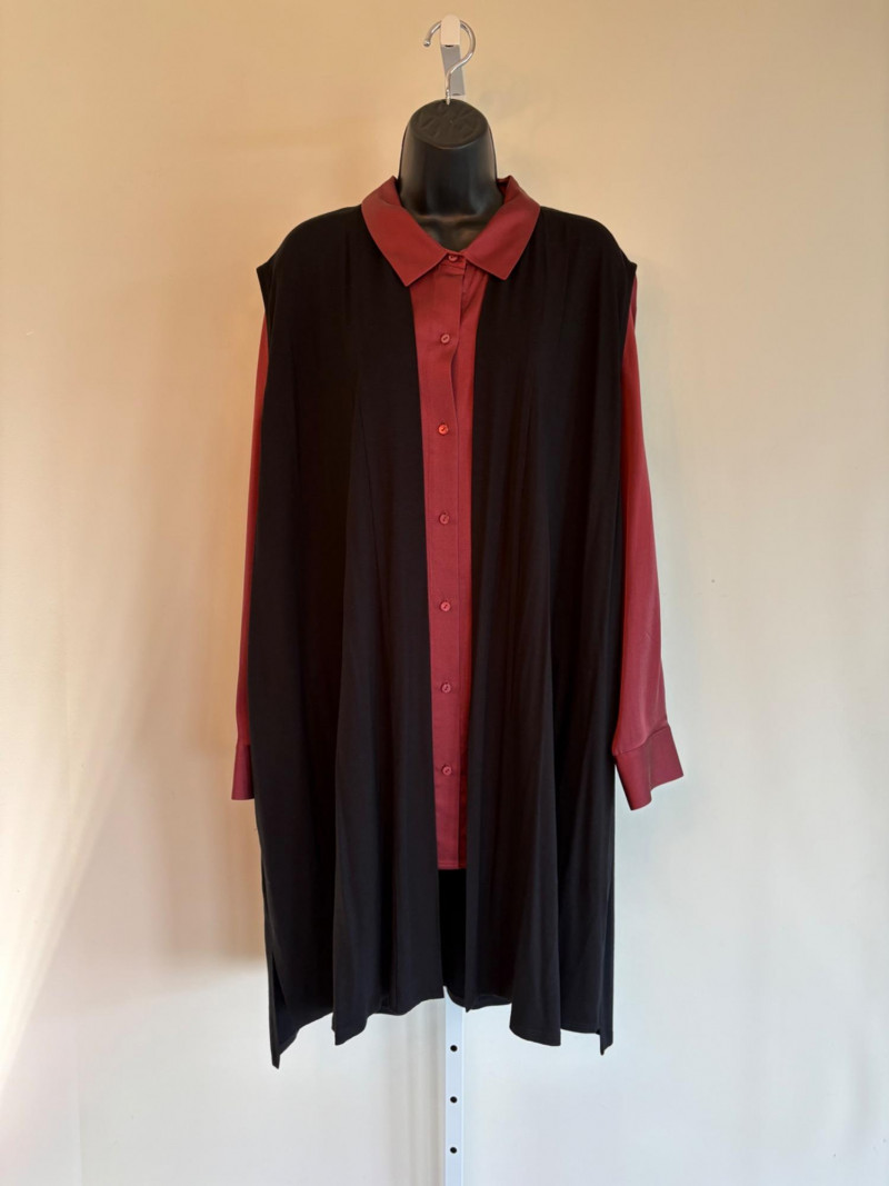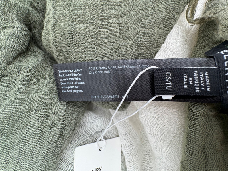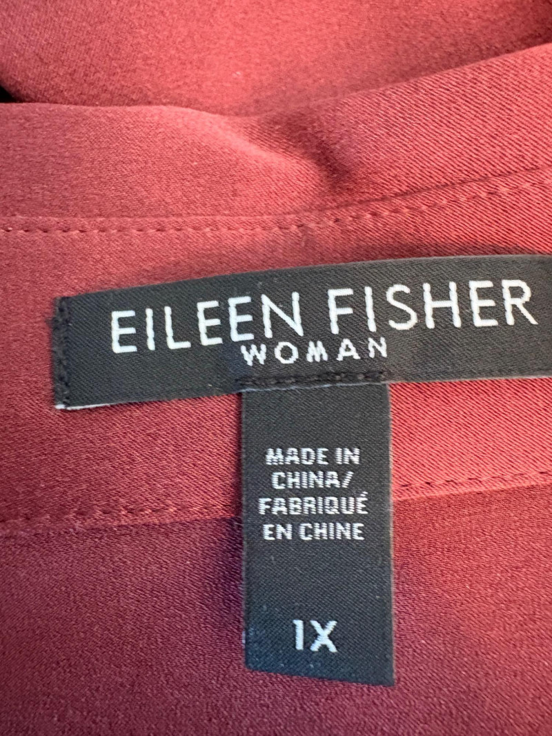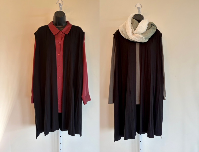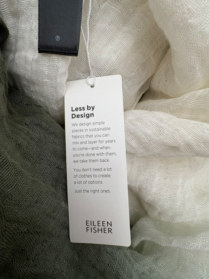Great contrast in these 4 items form Eileen Fisher in texture, hue, and fabric. Long black knit vest has open front, in-seam pockets with black on black topstitching, modified shawl collar, and split hem. Viscose/spandex blend with great hang. Measures 24" pit to pit and 38" from back neckline to hem. Size tag says XL. Burgundy crepe de chine blouse has long sleeves with button cuffs, 7 button front closure, bust darts, and curved shirt hem. Silk/spandex blend. Measures 24.5" pit to pit and 28.5" from back neckline to hem. Size tag says 1X. Please note that when doing photos, we noticed a dark spot on the back left shoulder that may come out when laundered - see last photo. Green soft cotton long-sleeve t-shirt offers a more casual look with the same vest. 100% organic cotton knit. Measures 25" pit to pit. Size tag says 1X. Paired with green ombre scarf that runs from cream to deep green in a linen/cotton blend. Measures approx. 28" x 68". New with tag.