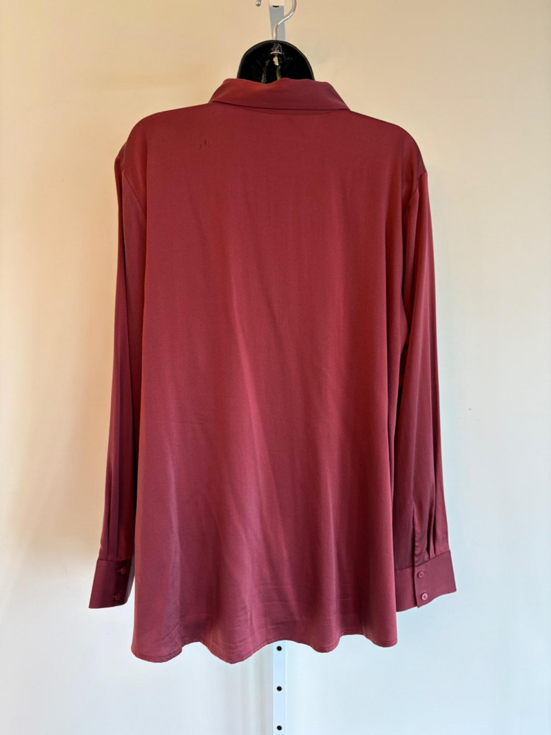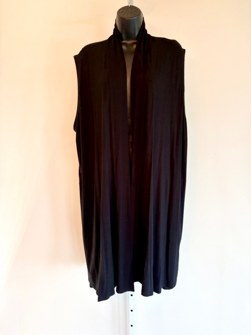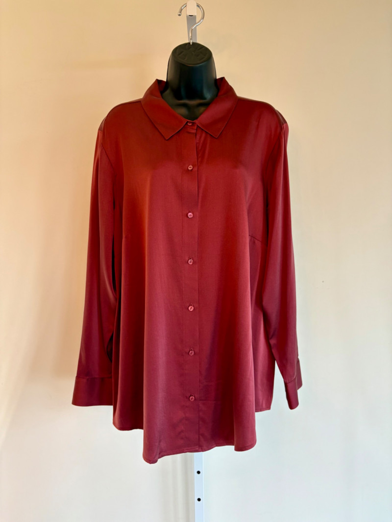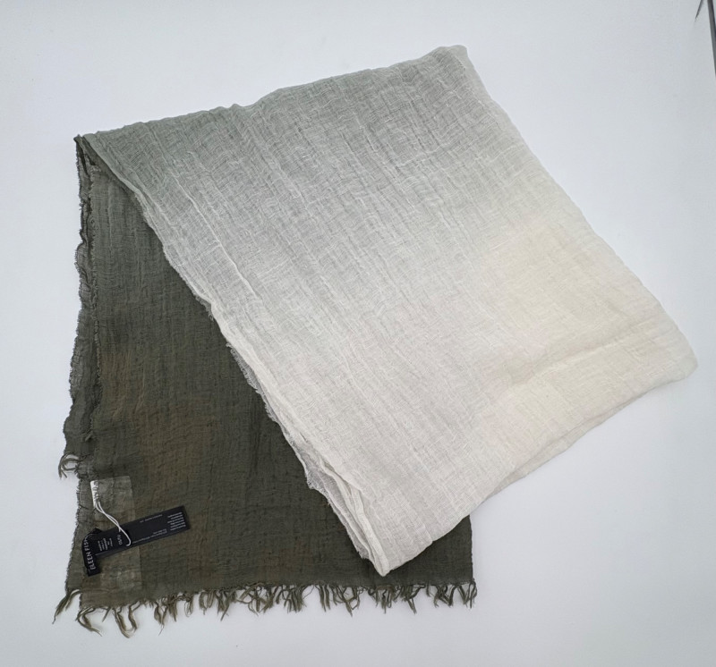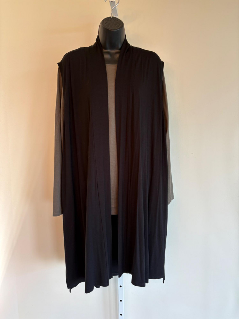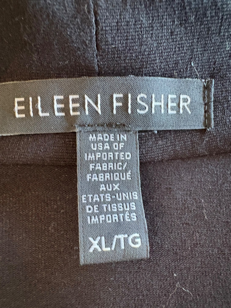 Great contrast in these 4 items form Eileen Fisher in texture, hue, and fabric. Long black knit vest has open front, in-seam pockets with black on black topstitching, modified shawl collar, and split hem. Viscose/spandex blend with great hang. Measures 24" pit to pit and 38" from back neckline to hem. Size tag says XL. Burgundy crepe de chine blouse has long sleeves with button cuffs, 7 button front closure, bust darts, and curved shirt hem. Silk/spandex blend. Measures 24.5" pit to pit and 28.5" from back neckline to hem. Size tag says 1X. Please note that when doing photos, we noticed a dark spot on the back left shoulder that may come out when laundered - see last photo. Green soft cotton long-sleeve t-shirt offers a more casual look with the same vest. 100% organic cotton knit. Measures 25" pit to pit. Size tag says 1X. Paired with green ombre scarf that runs from cream to deep green in a linen/cotton blend. Measures approx. 28" x 68". New with tag.