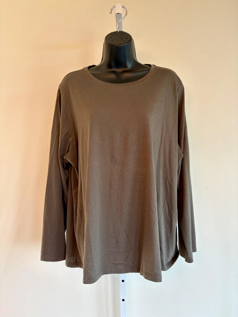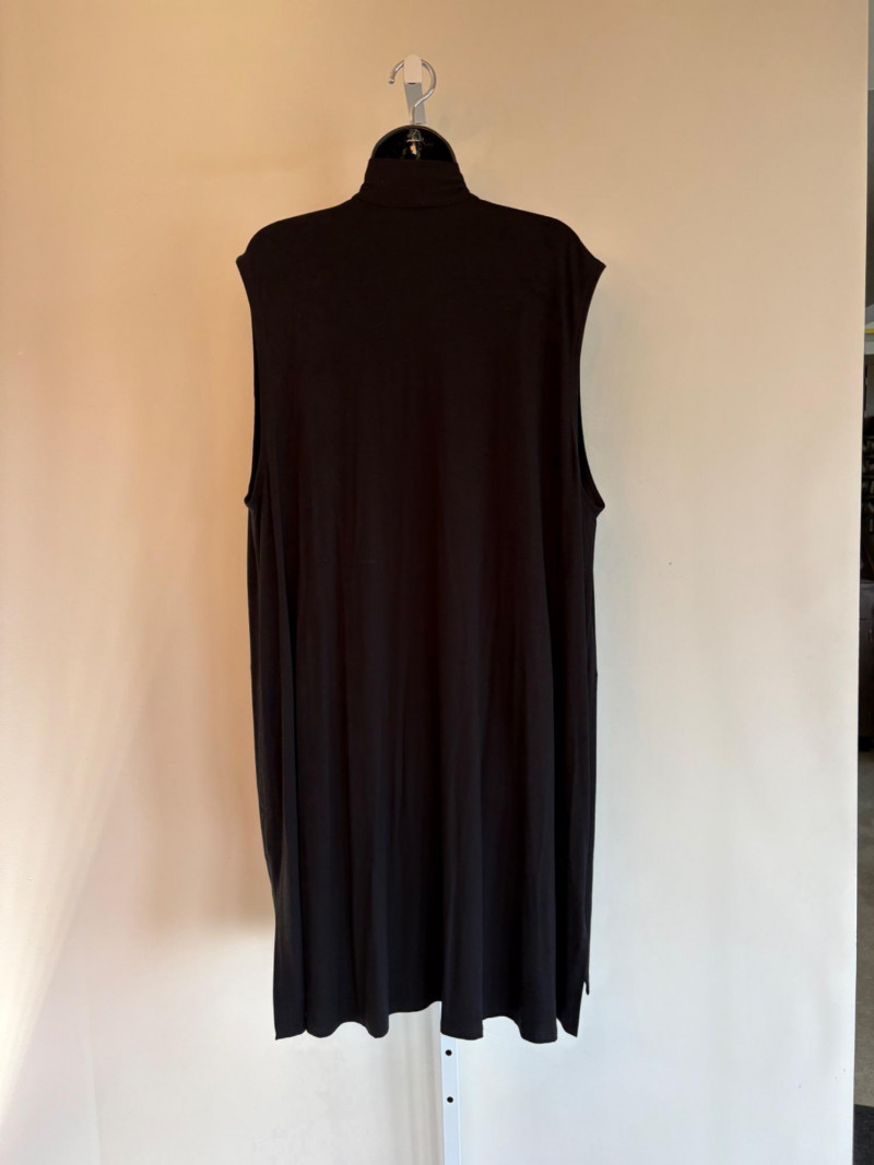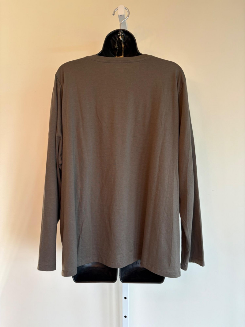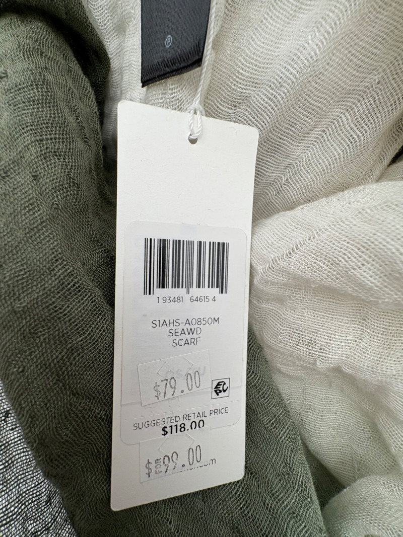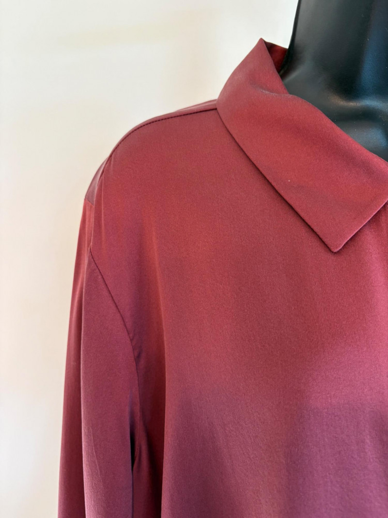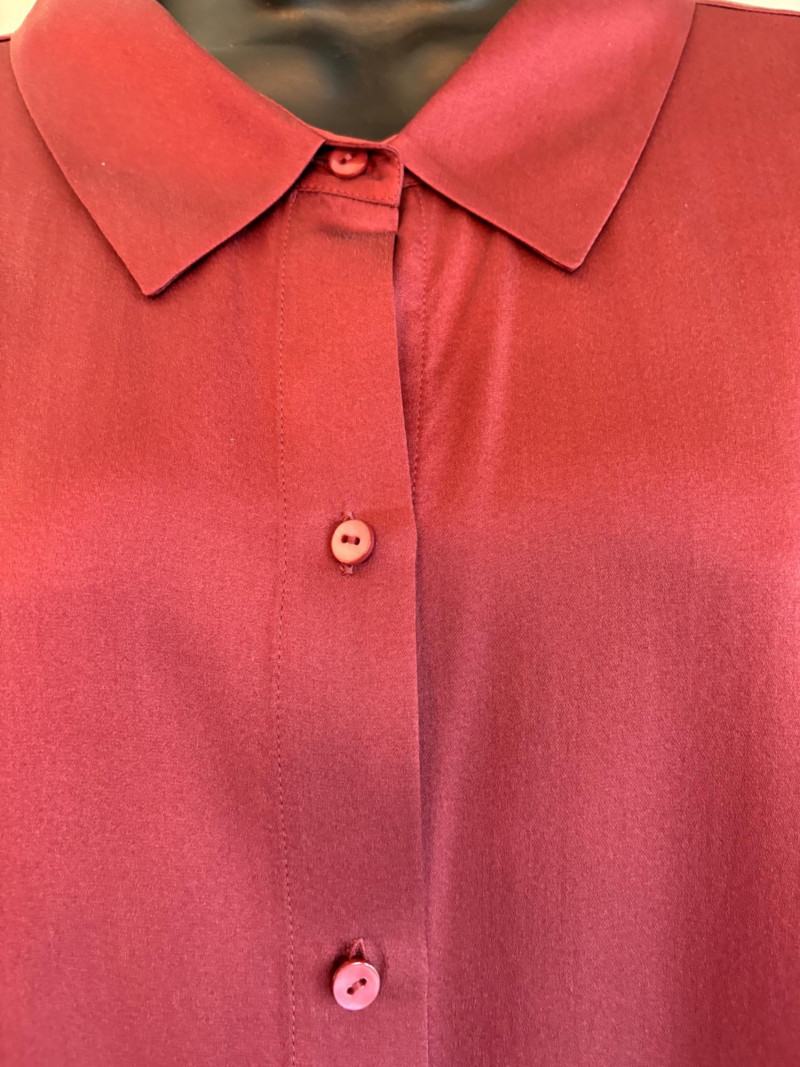 Great contrast in these 4 items form Eileen Fisher in texture, hue, and fabric. Long black knit vest has open front, in-seam pockets with black on black topstitching, modified shawl collar, and split hem. Viscose/spandex blend with great hang. Measures 24" pit to pit and 38" from back neckline to hem. Size tag says XL. Burgundy crepe de chine blouse has long sleeves with button cuffs, 7 button front closure, bust darts, and curved shirt hem. Silk/spandex blend. Measures 24.5" pit to pit and 28.5" from back neckline to hem. Size tag says 1X. Please note that when doing photos, we noticed a dark spot on the back left shoulder that may come out when laundered - see last photo. Green soft cotton long-sleeve t-shirt offers a more casual look with the same vest. 100% organic cotton knit. Measures 25" pit to pit. Size tag says 1X. Paired with green ombre scarf that runs from cream to deep green in a linen/cotton blend. Measures approx. 28" x 68". New with tag.
