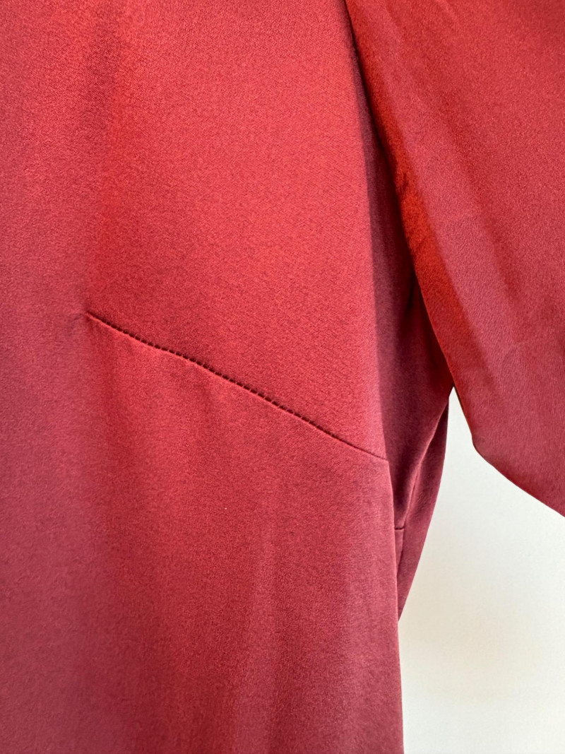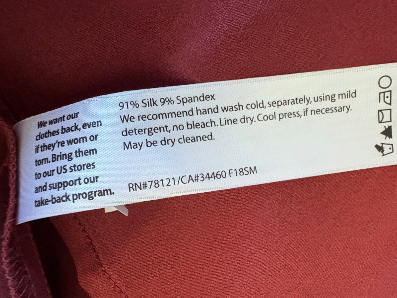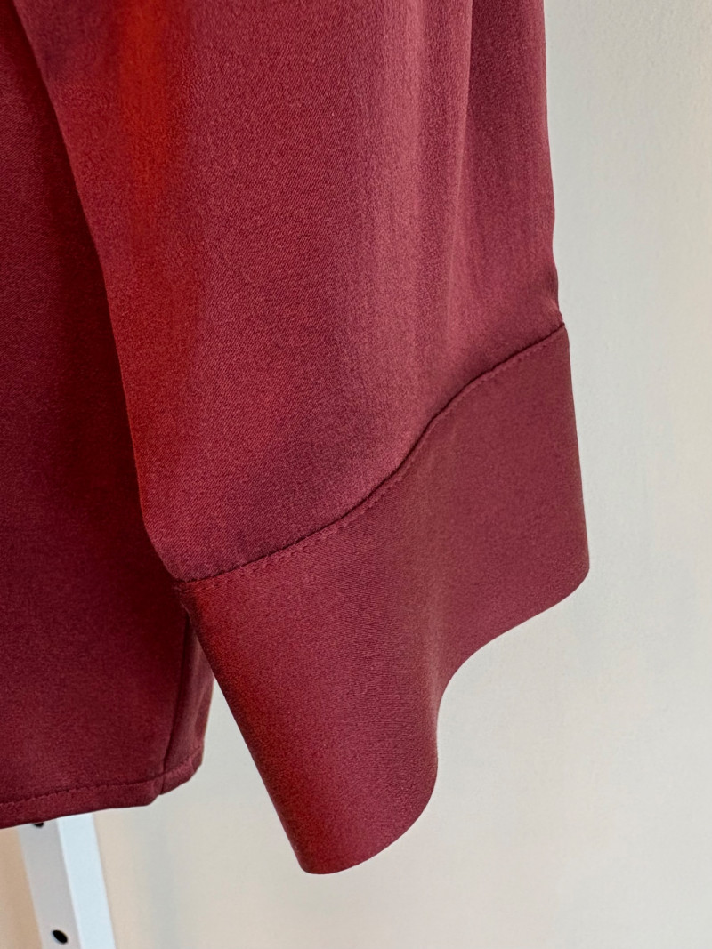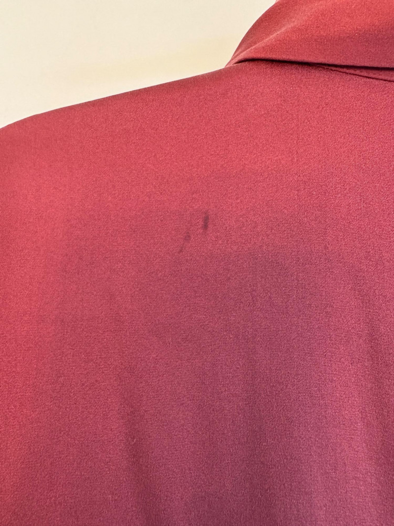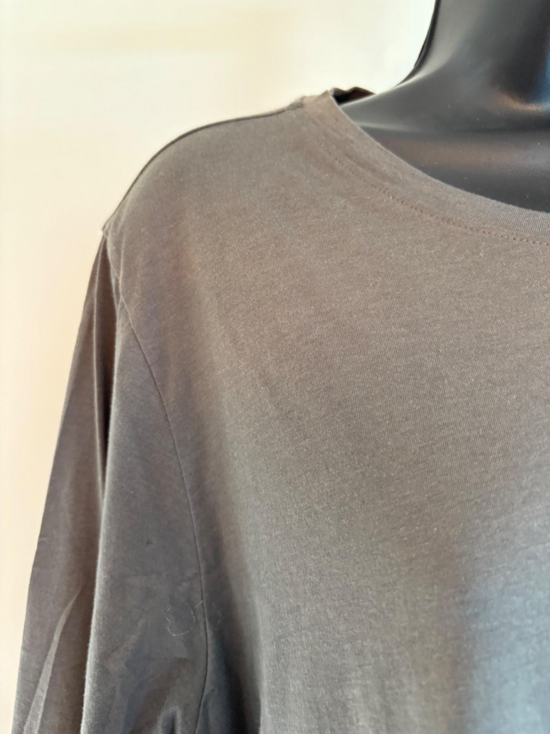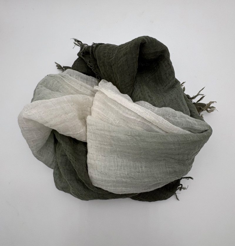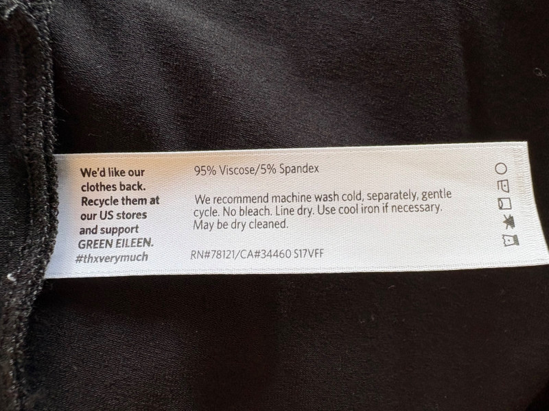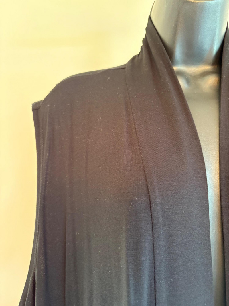 Great contrast in these 4 items form Eileen Fisher in texture, hue, and fabric. Long black knit vest has open front, in-seam pockets with black on black topstitching, modified shawl collar, and split hem. Viscose/spandex blend with great hang. Measures 24" pit to pit and 38" from back neckline to hem. Size tag says XL. Burgundy crepe de chine blouse has long sleeves with button cuffs, 7 button front closure, bust darts, and curved shirt hem. Silk/spandex blend. Measures 24.5" pit to pit and 28.5" from back neckline to hem. Size tag says 1X. Please note that when doing photos, we noticed a dark spot on the back left shoulder that may come out when laundered - see last photo. Green soft cotton long-sleeve t-shirt offers a more casual look with the same vest. 100% organic cotton knit. Measures 25" pit to pit. Size tag says 1X. Paired with green ombre scarf that runs from cream to deep green in a linen/cotton blend. Measures approx. 28" x 68". New with tag.