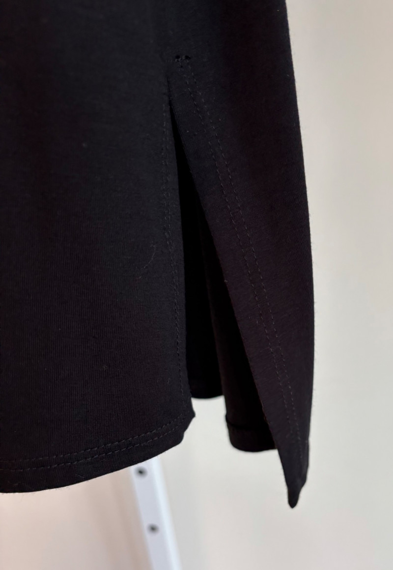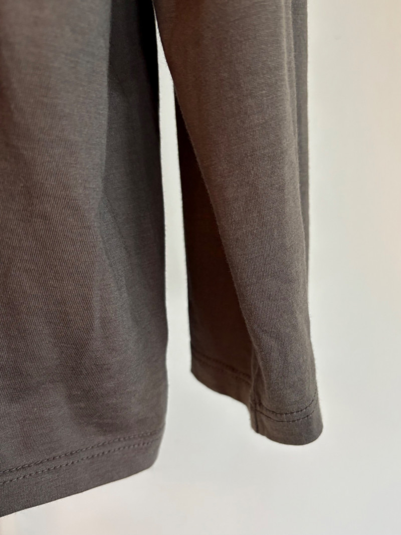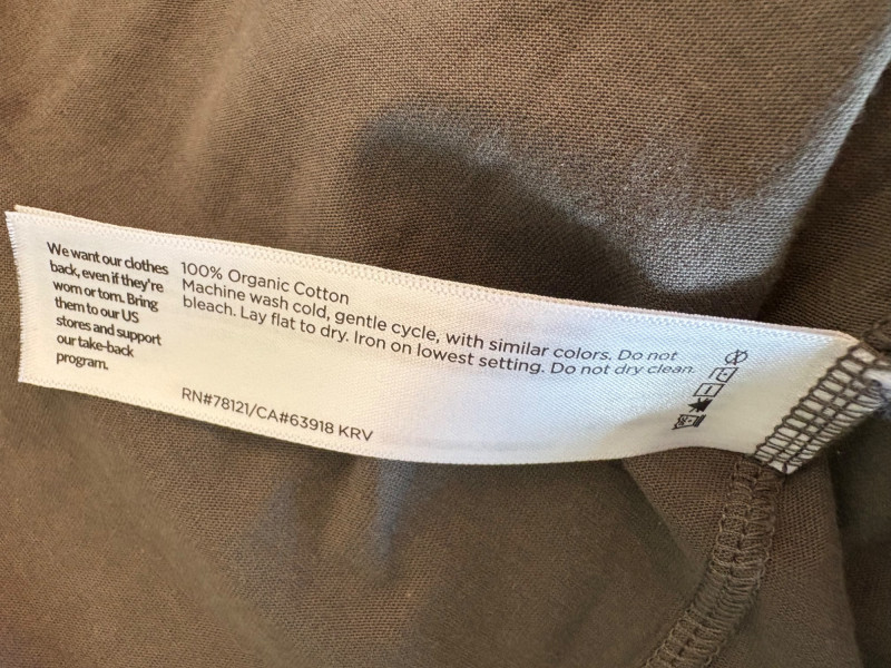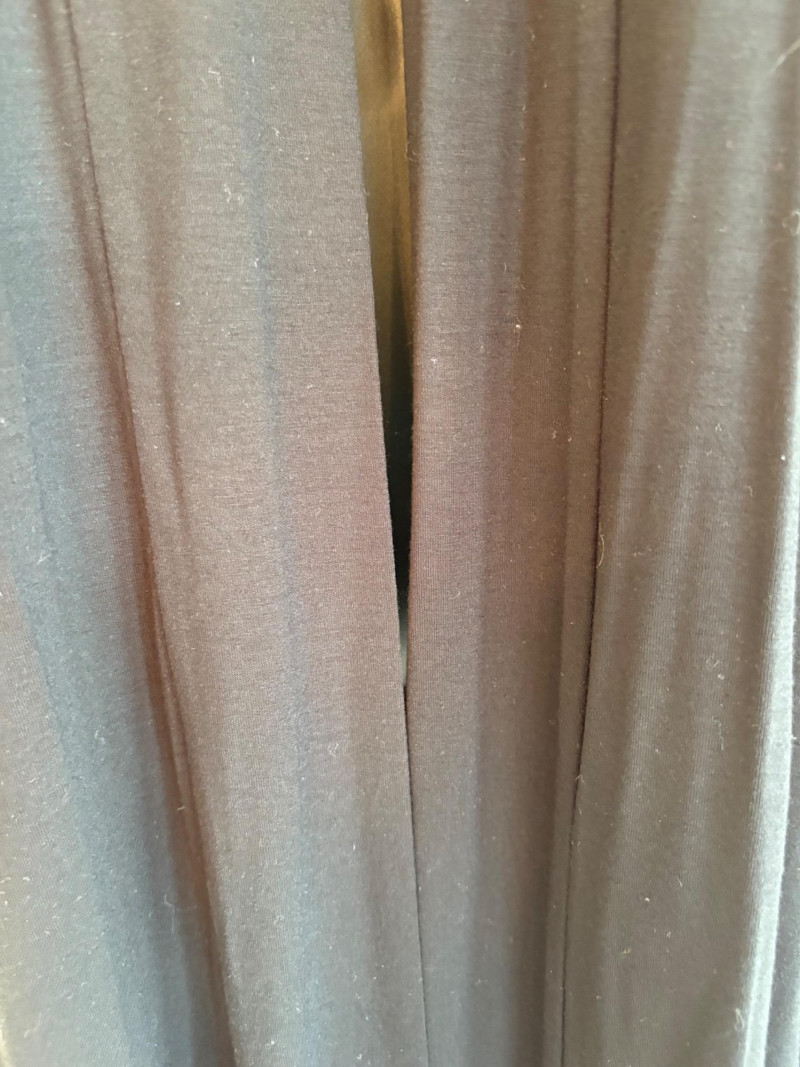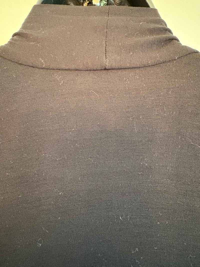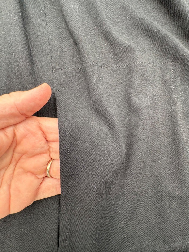 Great contrast in these 4 items form Eileen Fisher in texture, hue, and fabric. Long black knit vest has open front, in-seam pockets with black on black topstitching, modified shawl collar, and split hem. Viscose/spandex blend with great hang. Measures 24" pit to pit and 38" from back neckline to hem. Size tag says XL. Burgundy crepe de chine blouse has long sleeves with button cuffs, 7 button front closure, bust darts, and curved shirt hem. Silk/spandex blend. Measures 24.5" pit to pit and 28.5" from back neckline to hem. Size tag says 1X. Please note that when doing photos, we noticed a dark spot on the back left shoulder that may come out when laundered - see last photo. Green soft cotton long-sleeve t-shirt offers a more casual look with the same vest. 100% organic cotton knit. Measures 25" pit to pit. Size tag says 1X. Paired with green ombre scarf that runs from cream to deep green in a linen/cotton blend. Measures approx. 28" x 68". New with tag.