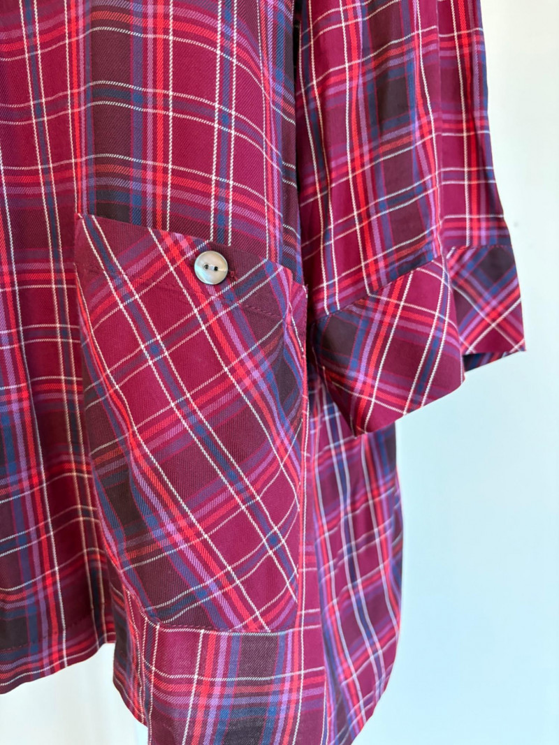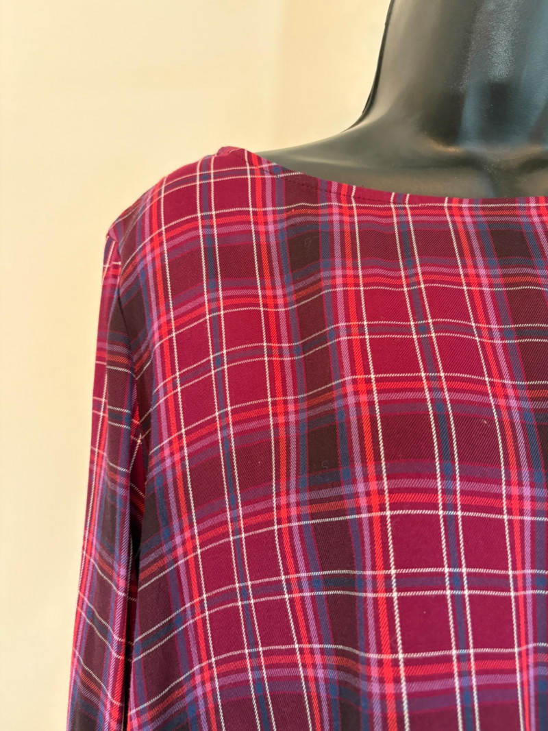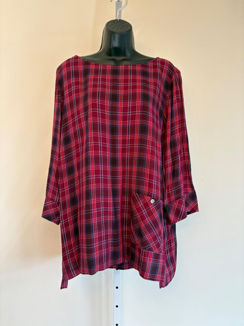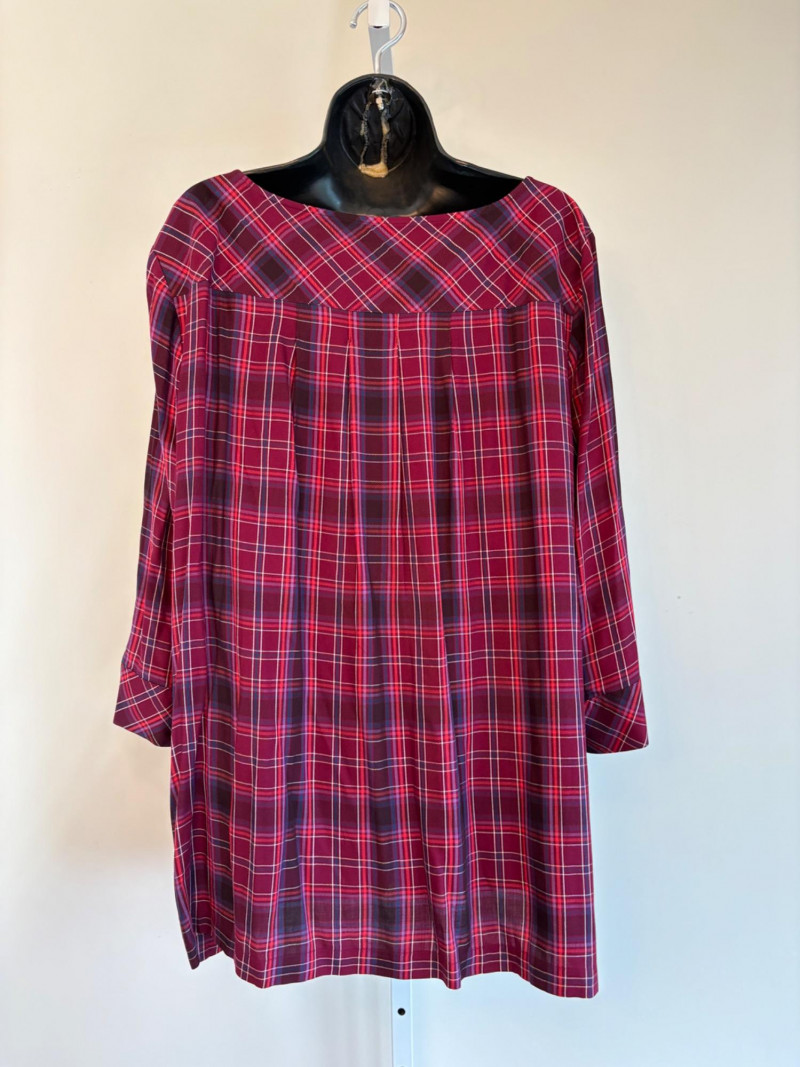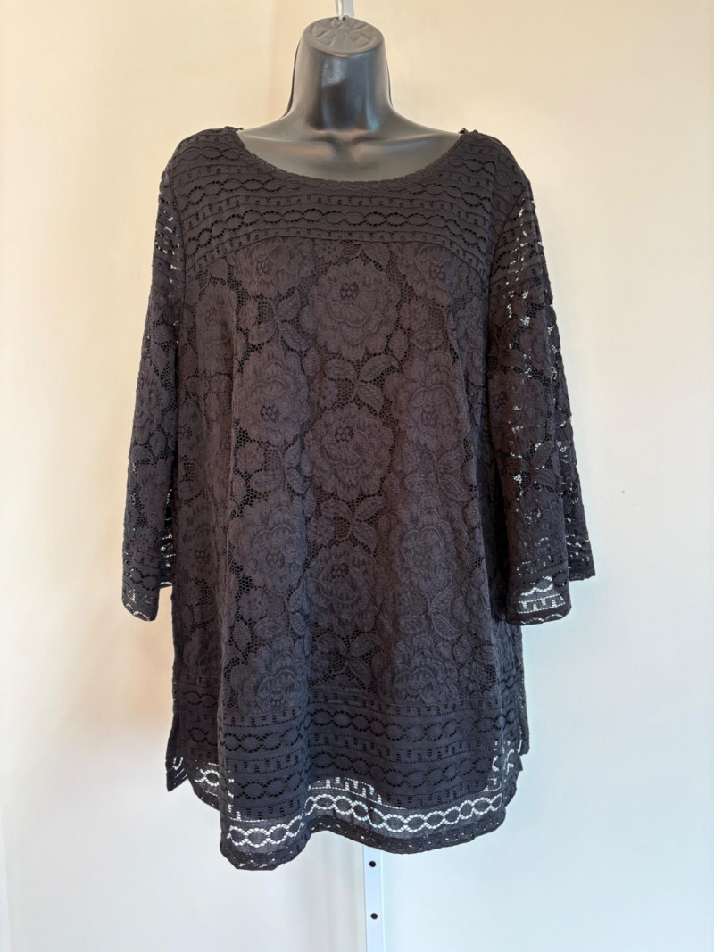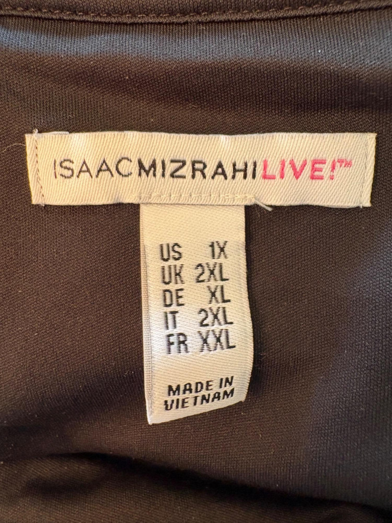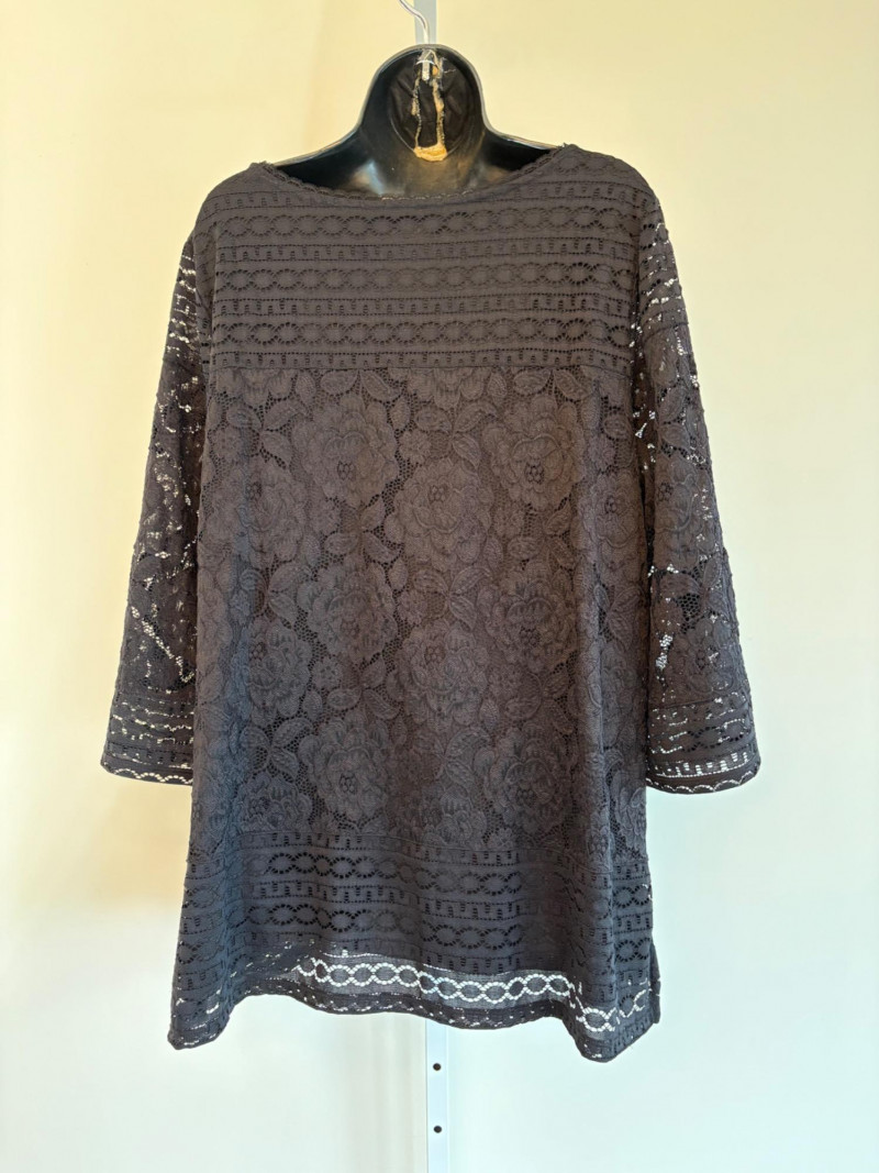 This is a real variety lot, but all pieces measure between 23" - 23.5" pit to pit. Black lace top from Isaac Mizrahi has 3/4 sleeves, yoke, solid stretch lining, and split hem. Nylon/spandex blend. Size tag says 1X. Intense blue top from Poetry is has long sleeves with button detailing, ribbed waistline, and criss-cross back. 100% linen. Size tag says says 18, but it looks a bit smaller to us. Note that we waffled on including this top - not only does the sizing appear to be off, but there are also several issues with small pulls in the fabric/loose threads - a sweater shaver might help but we aren't sure. We decided to put it in anyhow, but be warned that the quality here is definitely not up to the usual of the other items in this auction - see last 2 photos for most egregious examples. Soft smooth white knit shirt has collar, button front closure, back yoke with pleat, split hem with back lower than front, and long sleeves with button cuff. 100% organic cotton. Size tag says XL. Red plaid top from J. Jill has 3/4 banded sleeves, back yoke with pleats, and front left patch pocket along with a split hem that is lower in back than front. 100% rayon. Size tag says XL.