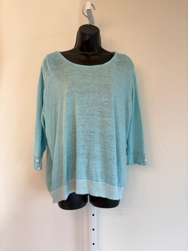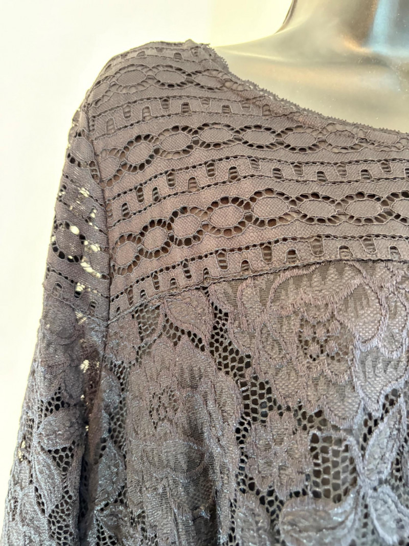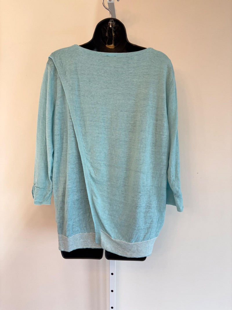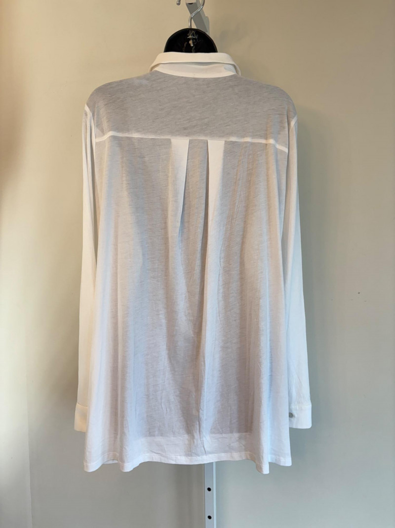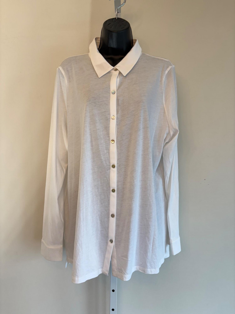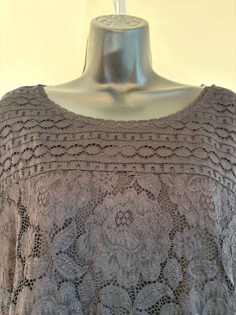 This is a real variety lot, but all pieces measure between 23" - 23.5" pit to pit. Black lace top from Isaac Mizrahi has 3/4 sleeves, yoke, solid stretch lining, and split hem. Nylon/spandex blend. Size tag says 1X. Intense blue top from Poetry is has long sleeves with button detailing, ribbed waistline, and criss-cross back. 100% linen. Size tag says says 18, but it looks a bit smaller to us. Note that we waffled on including this top - not only does the sizing appear to be off, but there are also several issues with small pulls in the fabric/loose threads - a sweater shaver might help but we aren't sure. We decided to put it in anyhow, but be warned that the quality here is definitely not up to the usual of the other items in this auction - see last 2 photos for most egregious examples. Soft smooth white knit shirt has collar, button front closure, back yoke with pleat, split hem with back lower than front, and long sleeves with button cuff. 100% organic cotton. Size tag says XL. Red plaid top from J. Jill has 3/4 banded sleeves, back yoke with pleats, and front left patch pocket along with a split hem that is lower in back than front. 100% rayon. Size tag says XL.