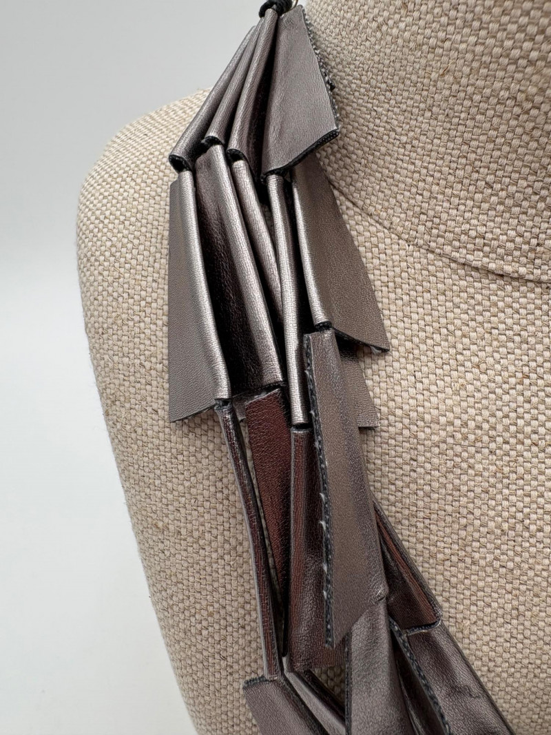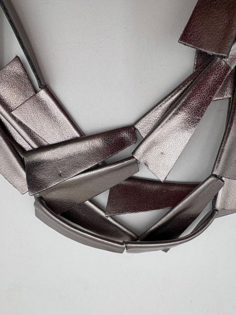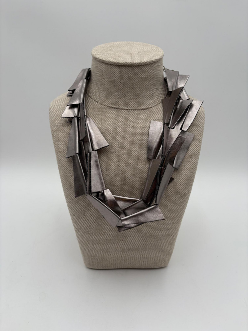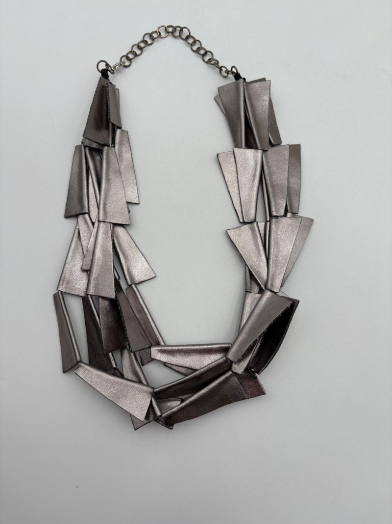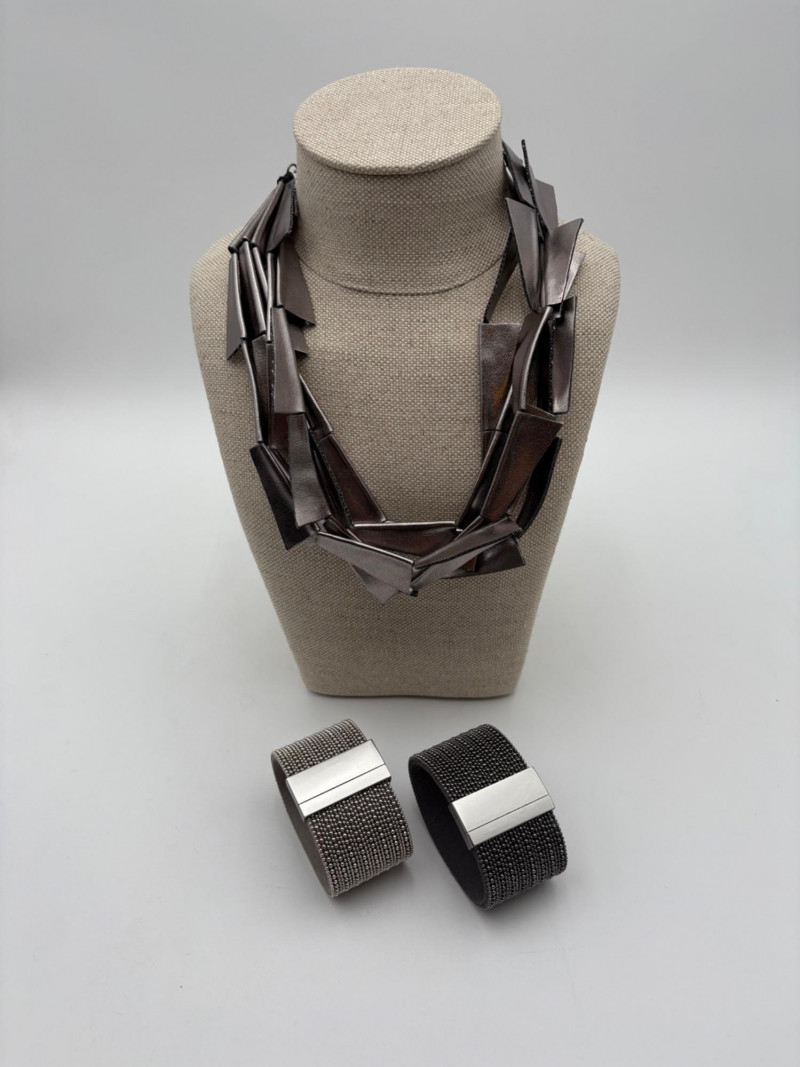 Terrific trio for all your lagenlook needs. Necklace is folded geometric shapes in iridescent silvery leather around a cord. Clamshell clasp closure - measures 22" total length. Manufacturer unknown. Pair of metallic cuffs in grey & black with smooth fabric backing against the wrist. Magnetic closure. Measure just under 7.5" in circumference when closed. Manufacturer unknown.